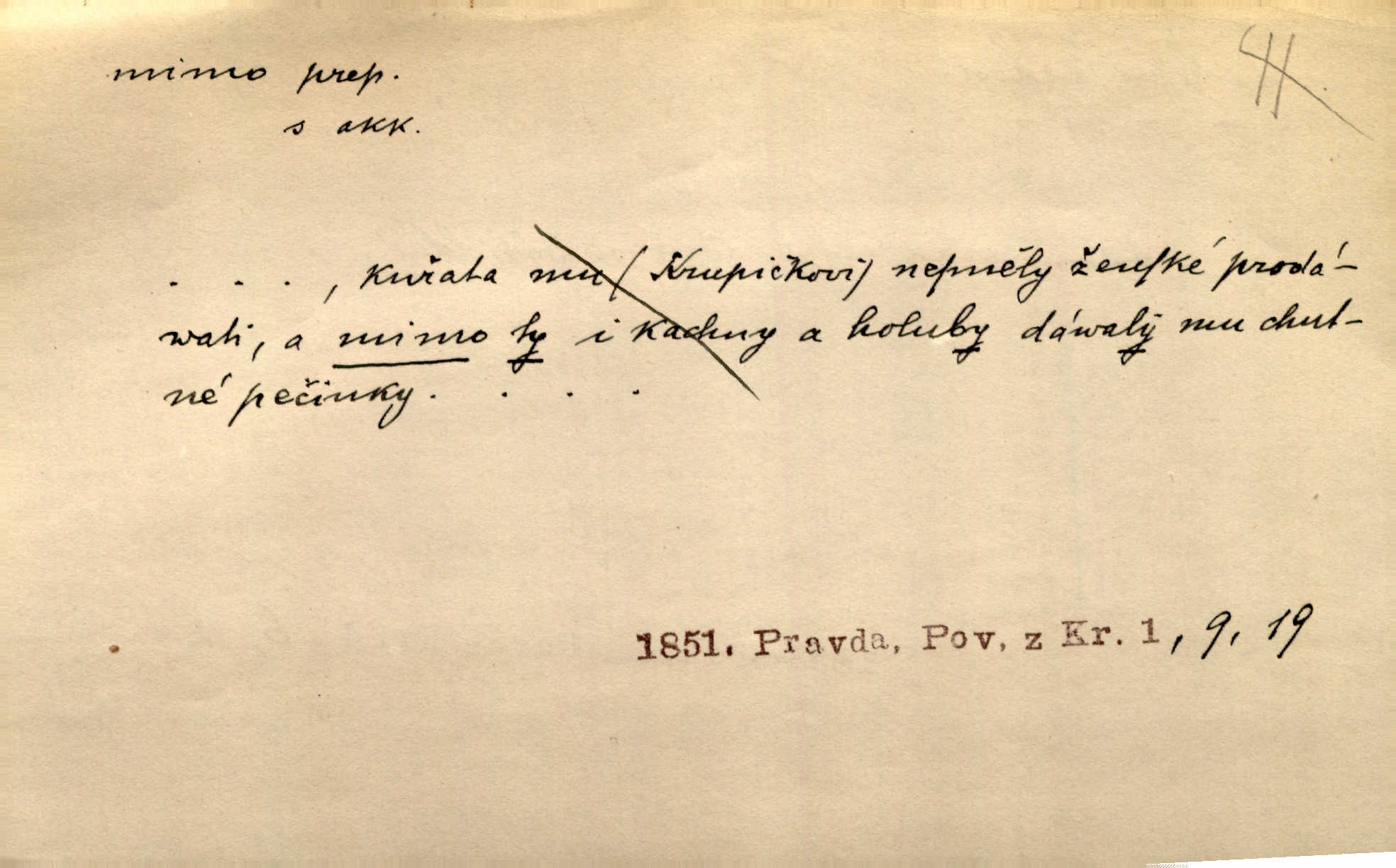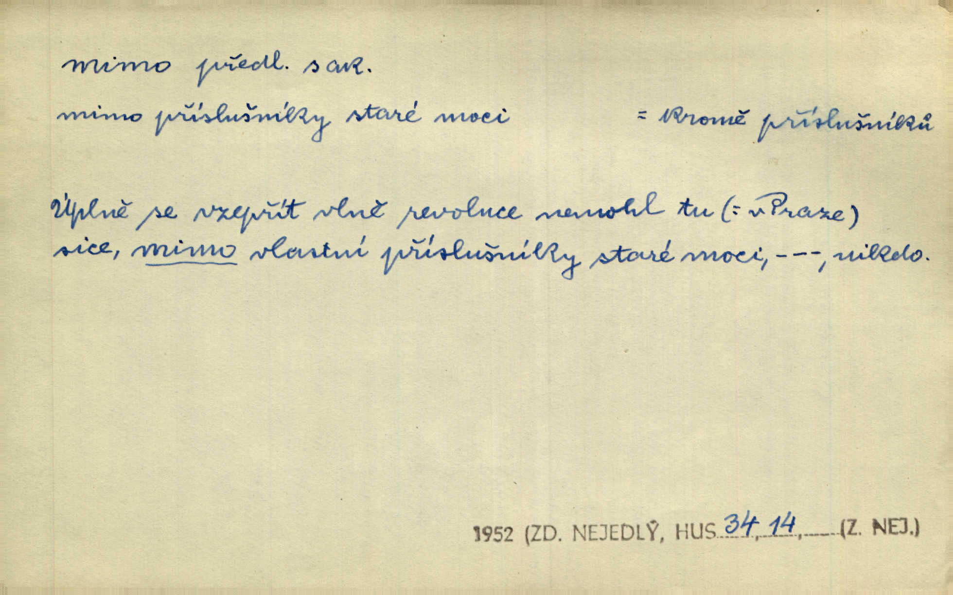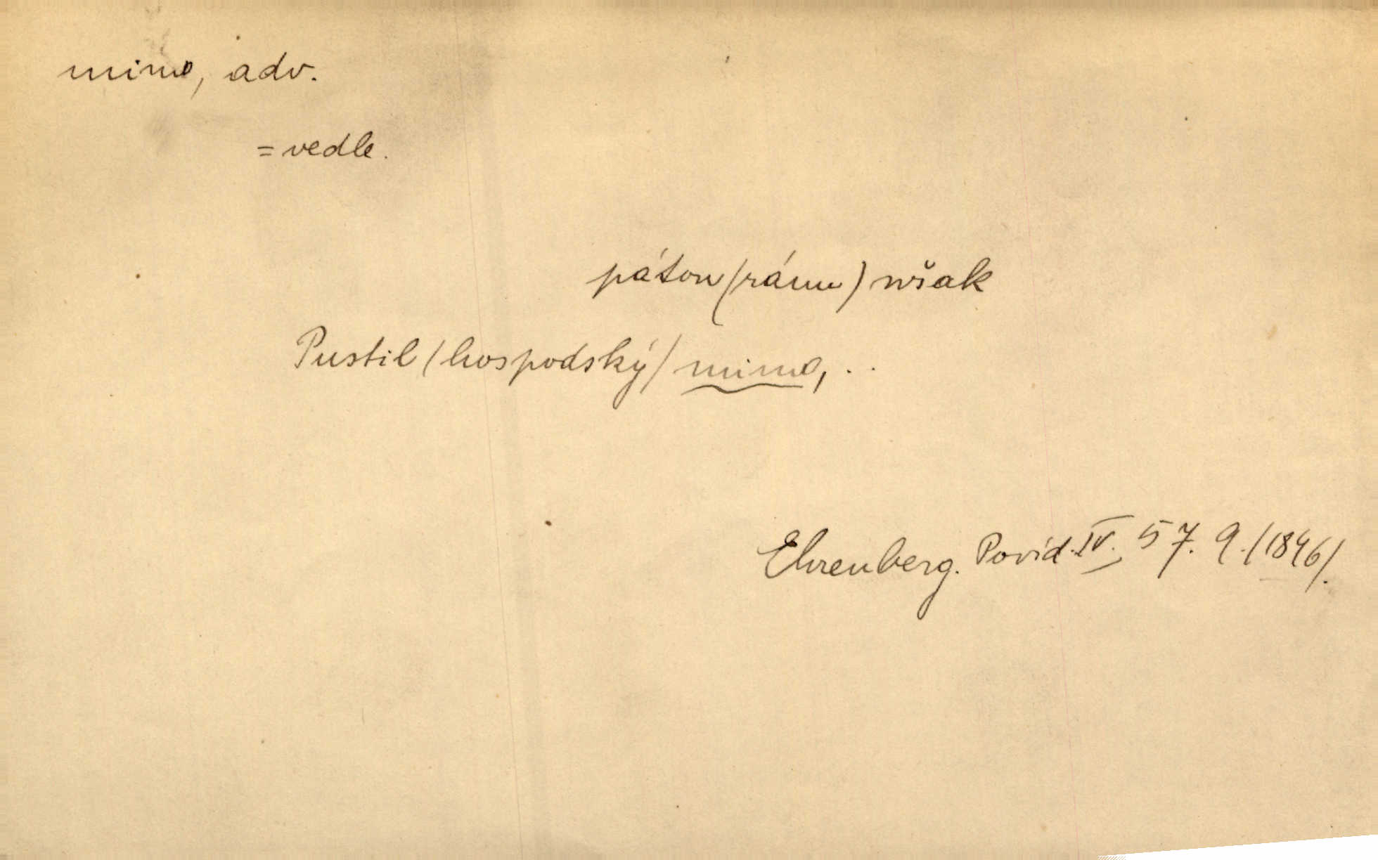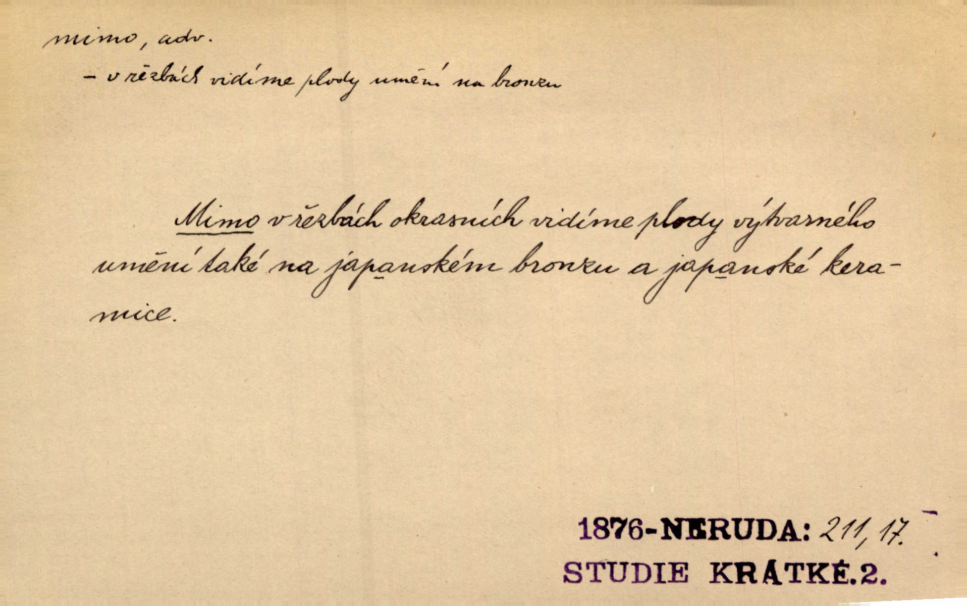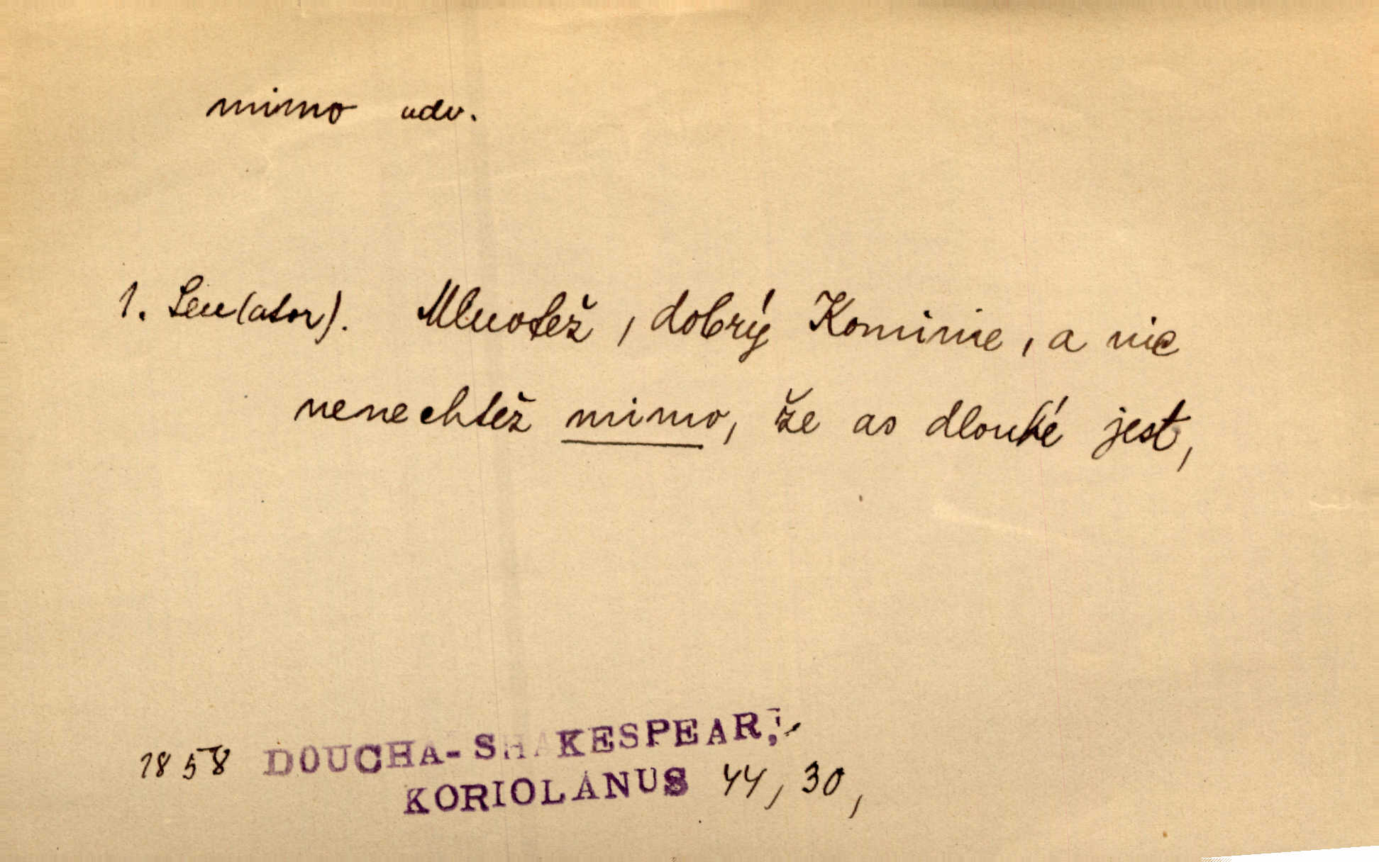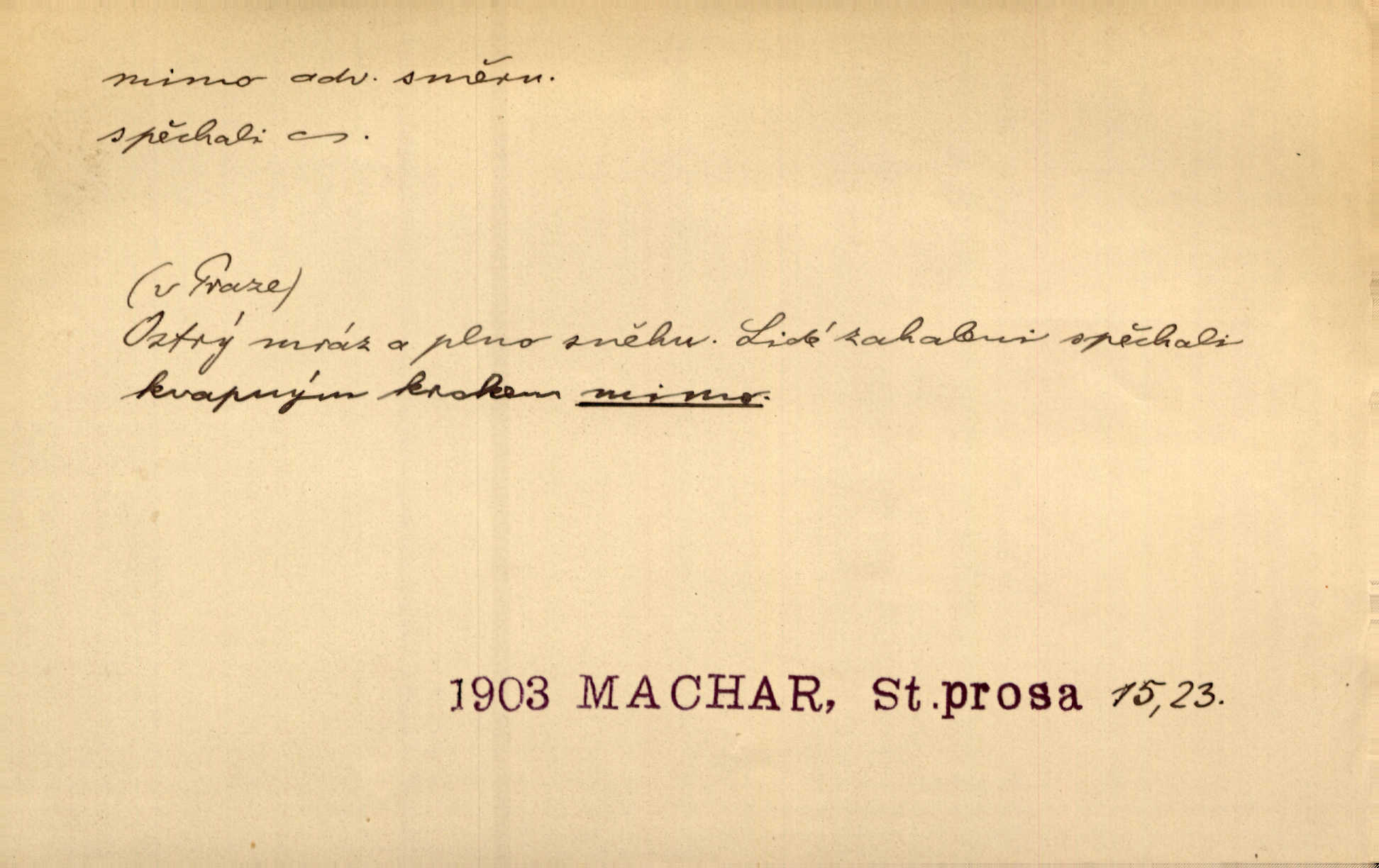 - mimo adv. stranou, vedle. Pátou [ránu] pustil [střelec] mimo. Ehrenb. Škoda každé rány, která jde mimo. Přísl. Když jsem se hnal přes prkno, skočil jsem mimo, do té louže. Jir. Usmál se lhostejně a hledě mimo poznamenal. Maria. On zvyklý počítati věcnými faktory; věci nehotové leží mu jaksi mimo. Šmil. D podle, kolem, okolo. Nechť, kdo mimo jdou, se pokřižují. Heyd. Lidé spěchali kvapným krokem mimo. Mach. D vyjma, kromě, leda. Mimo v řezbách okrasních vidíme plody výtvarného umění také na japonském bronzu. Ner. Žid mimo sobě a komoře královské stěží komu jinému býval za užitele. Win. Aniž si byl kdo, že nový host do světnice přibyl, povšimnul; mimo hospodský, který častěji se byl po dvéřích ohlížel. Tyl. D mimochodem. Úžasných věcí nám při tom [čtení Caesara] nabíjeli do hlavy: strategii, taktiku, ale všecko suše, bez map, obrazů, jen tak mimo jako vedlejší věc. Mach.