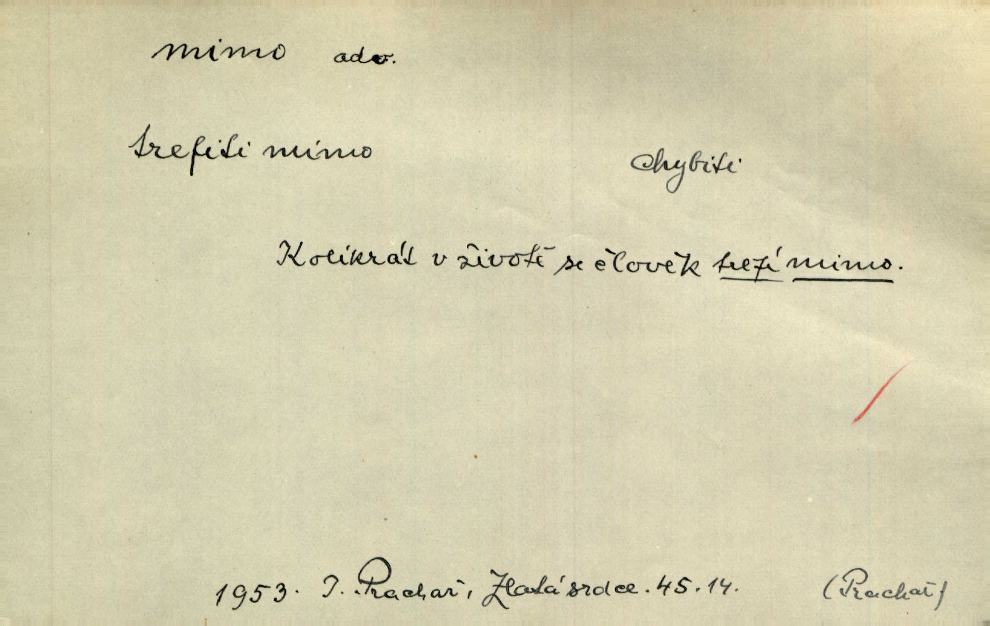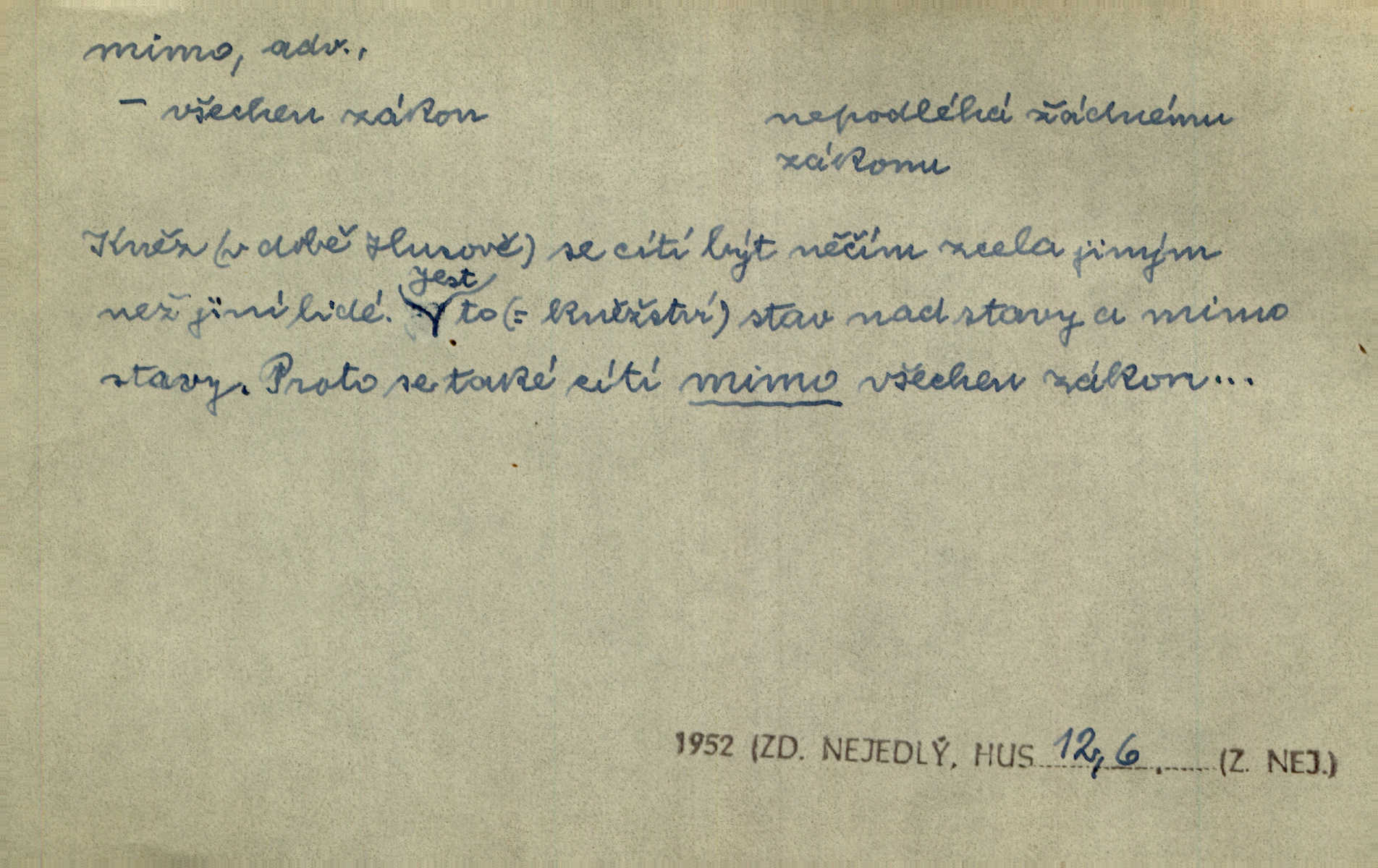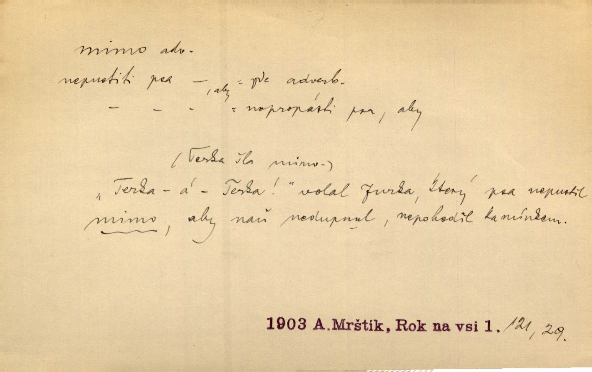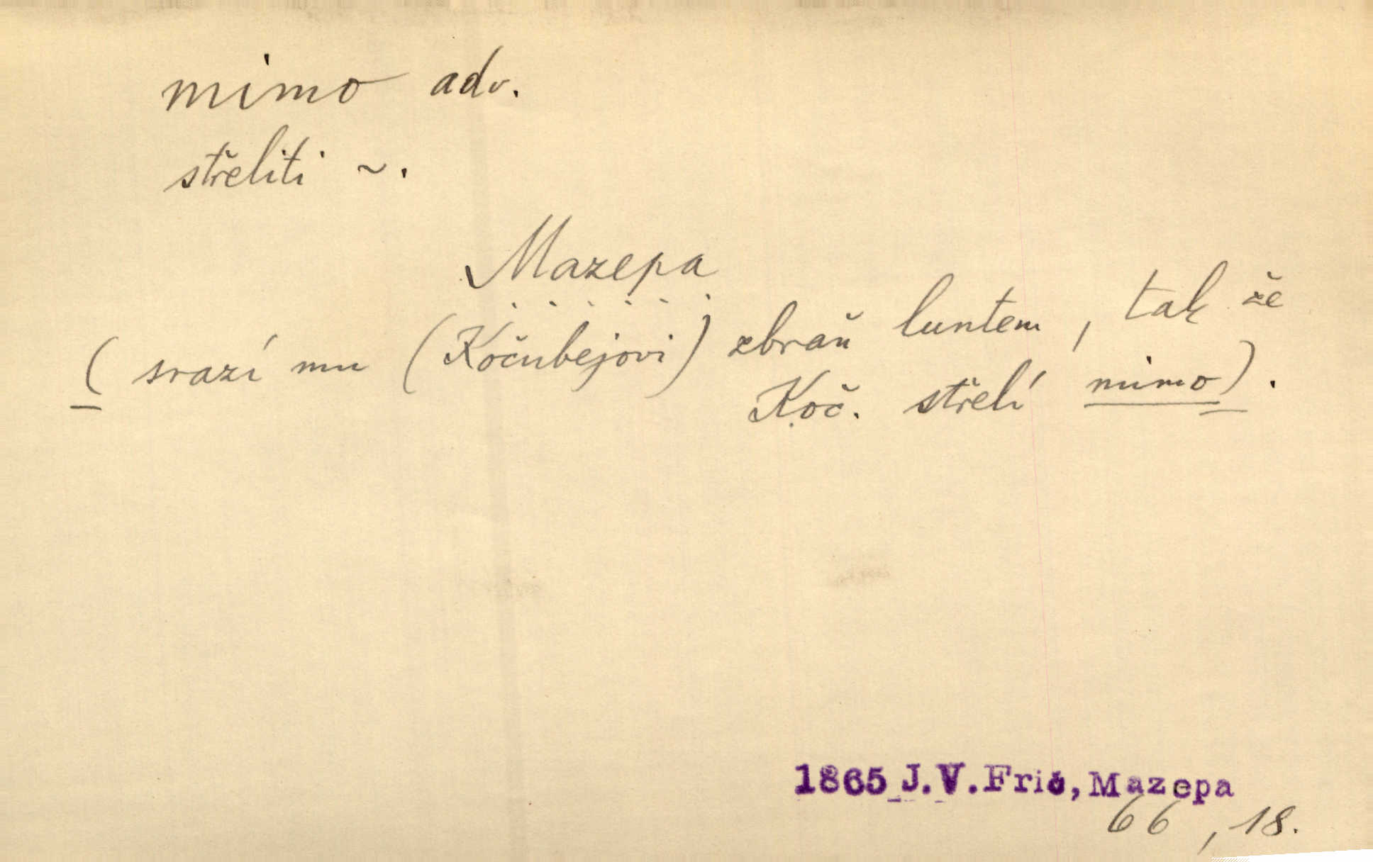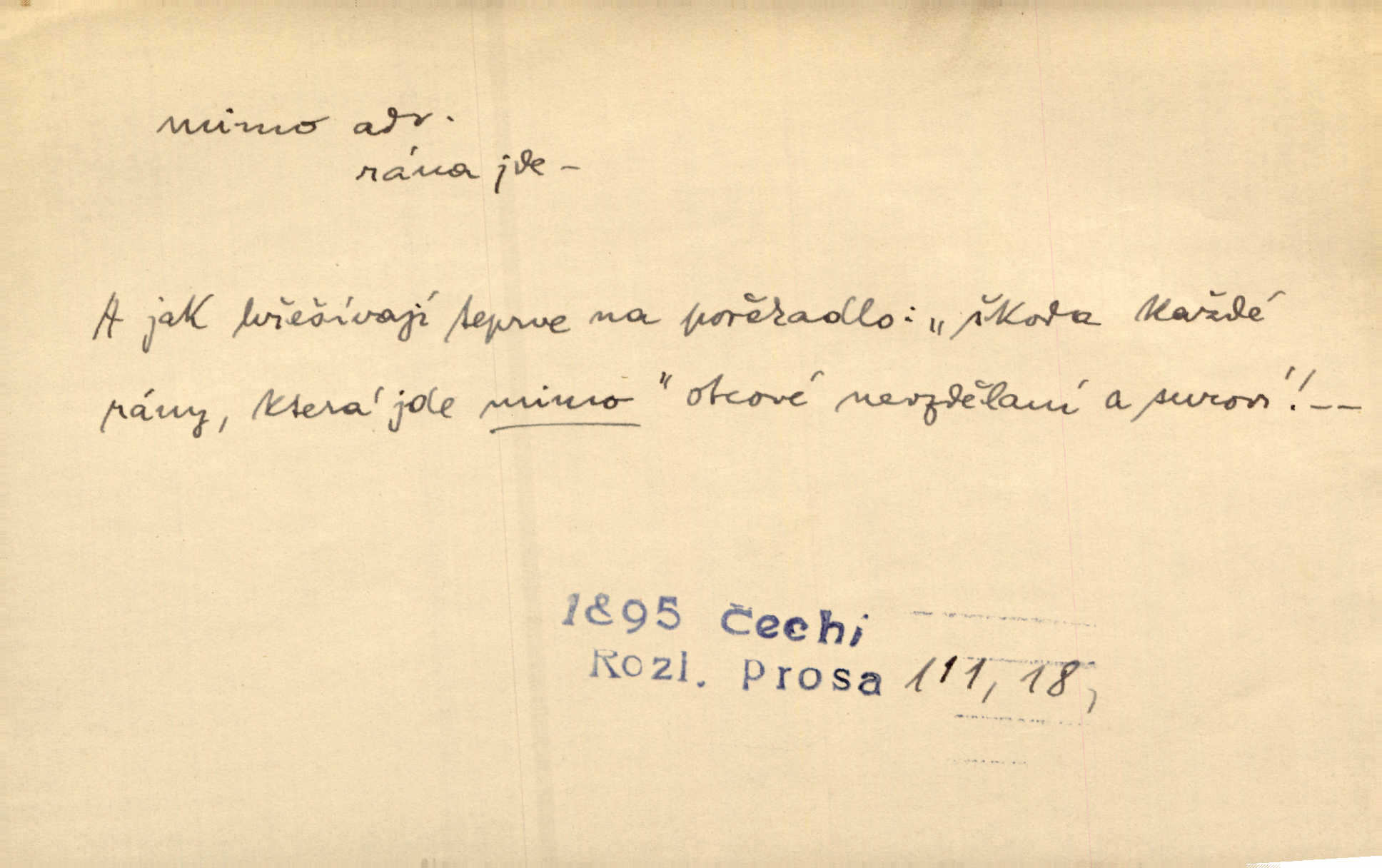 - mimo adv. stranou, vedle. Pátou [ránu] pustil [střelec] mimo. Ehrenb. Škoda každé rány, která jde mimo. Přísl. Když jsem se hnal přes prkno, skočil jsem mimo, do té louže. Jir. Usmál se lhostejně a hledě mimo poznamenal. Maria. On zvyklý počítati věcnými faktory; věci nehotové leží mu jaksi mimo. Šmil. D podle, kolem, okolo. Nechť, kdo mimo jdou, se pokřižují. Heyd. Lidé spěchali kvapným krokem mimo. Mach. D vyjma, kromě, leda. Mimo v řezbách okrasních vidíme plody výtvarného umění také na japonském bronzu. Ner. Žid mimo sobě a komoře královské stěží komu jinému býval za užitele. Win. Aniž si byl kdo, že nový host do světnice přibyl, povšimnul; mimo hospodský, který častěji se byl po dvéřích ohlížel. Tyl. D mimochodem. Úžasných věcí nám při tom [čtení Caesara] nabíjeli do hlavy: strategii, taktiku, ale všecko suše, bez map, obrazů, jen tak mimo jako vedlejší věc. Mach.