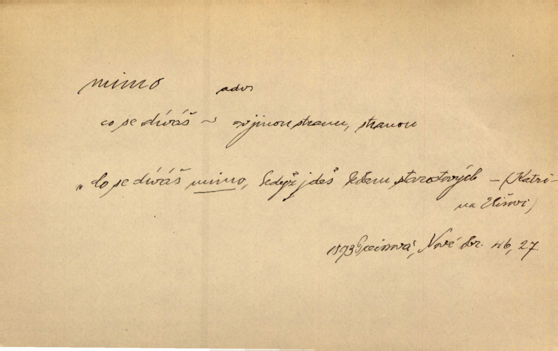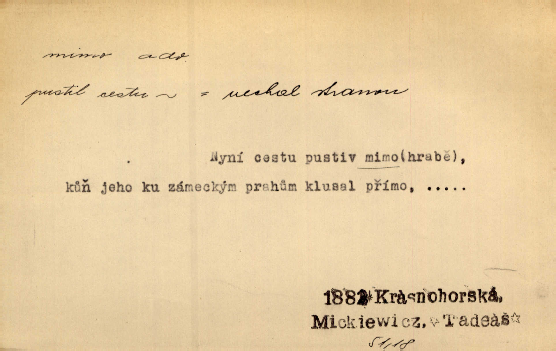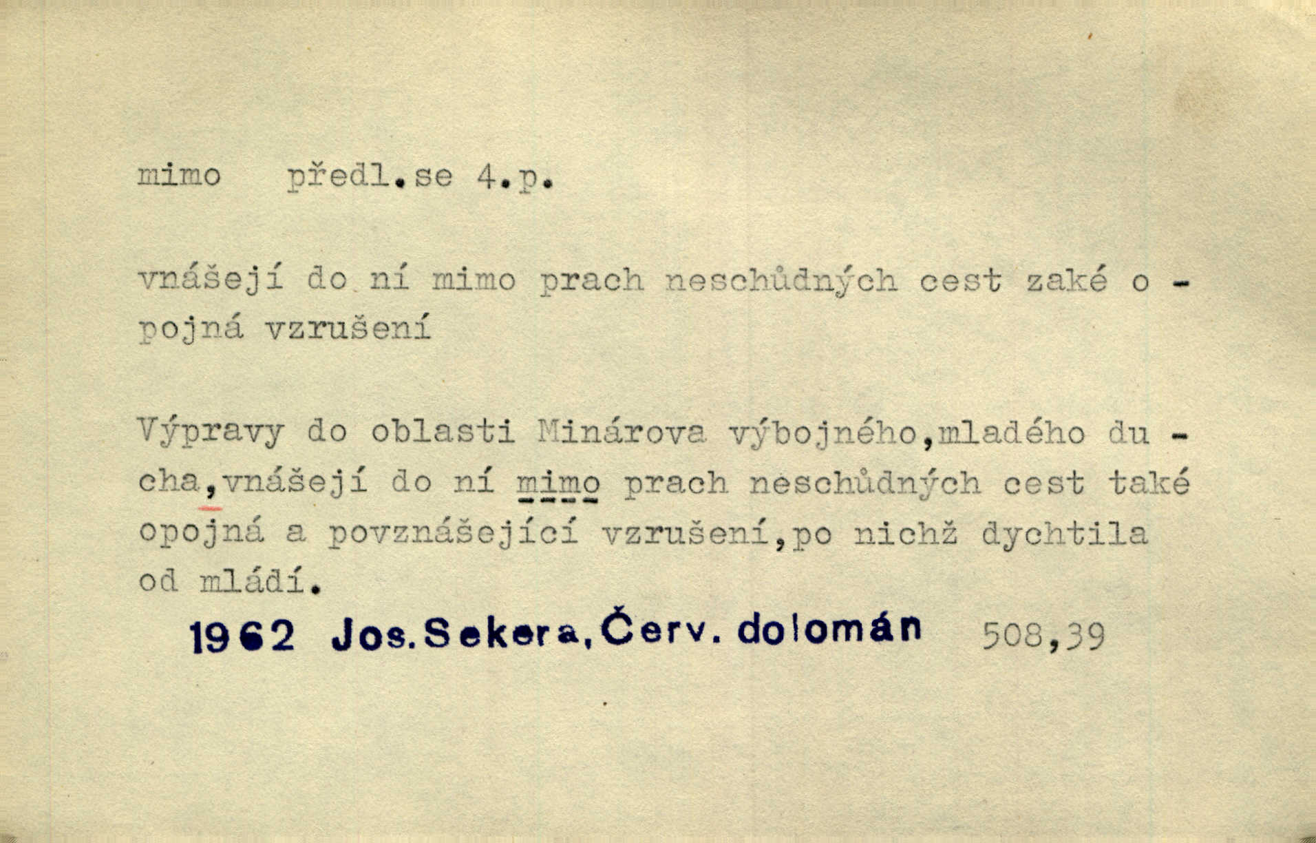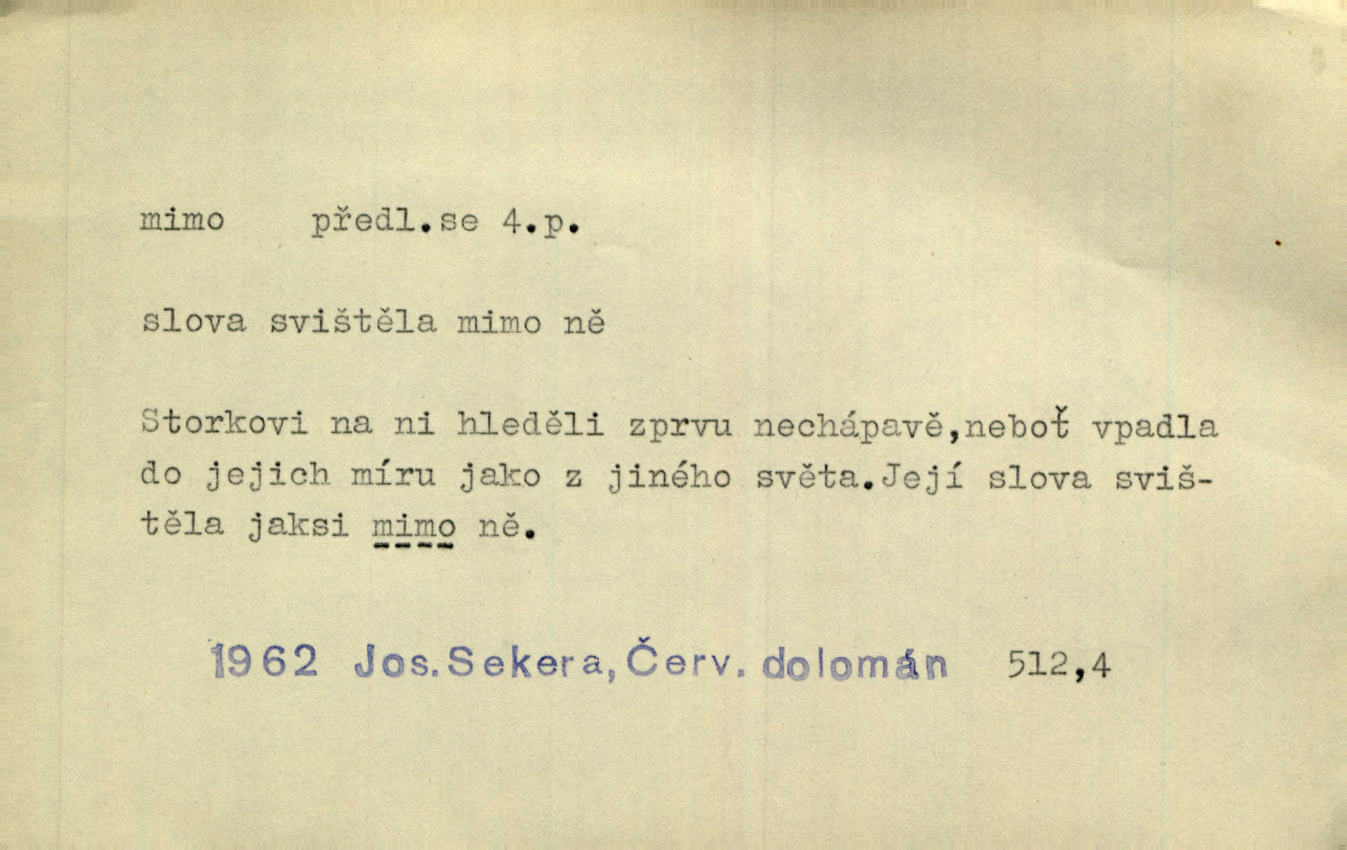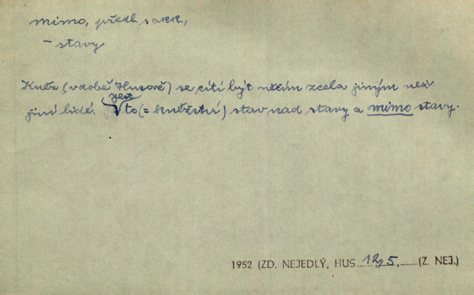 - mimo adv. stranou, vedle. Pátou [ránu] pustil [střelec] mimo. Ehrenb. Škoda každé rány, která jde mimo. Přísl. Když jsem se hnal přes prkno, skočil jsem mimo, do té louže. Jir. Usmál se lhostejně a hledě mimo poznamenal. Maria. On zvyklý počítati věcnými faktory; věci nehotové leží mu jaksi mimo. Šmil. D podle, kolem, okolo. Nechť, kdo mimo jdou, se pokřižují. Heyd. Lidé spěchali kvapným krokem mimo. Mach. D vyjma, kromě, leda. Mimo v řezbách okrasních vidíme plody výtvarného umění také na japonském bronzu. Ner. Žid mimo sobě a komoře královské stěží komu jinému býval za užitele. Win. Aniž si byl kdo, že nový host do světnice přibyl, povšimnul; mimo hospodský, který častěji se byl po dvéřích ohlížel. Tyl. D mimochodem. Úžasných věcí nám při tom [čtení Caesara] nabíjeli do hlavy: strategii, taktiku, ale všecko suše, bez map, obrazů, jen tak mimo jako vedlejší věc. Mach.