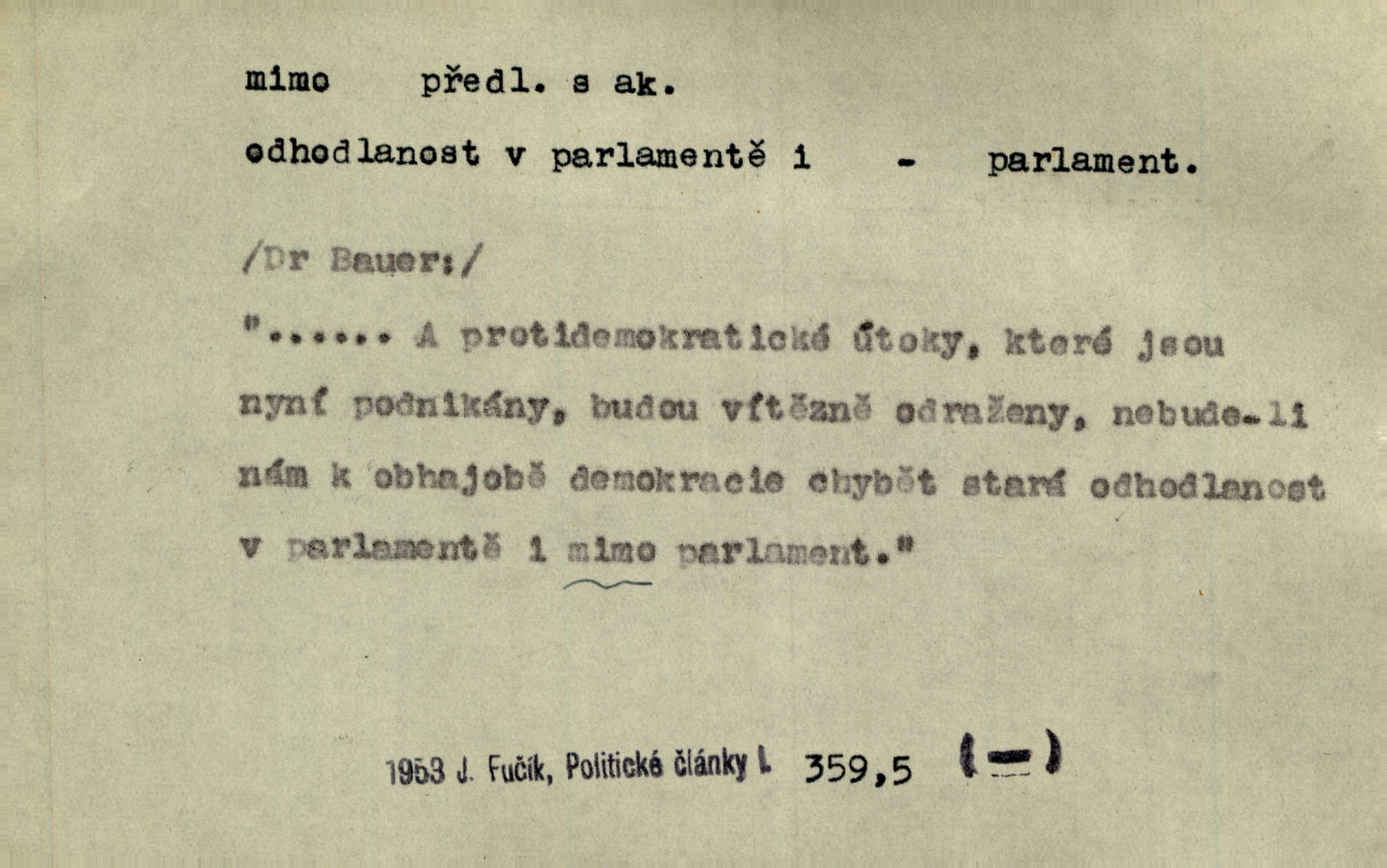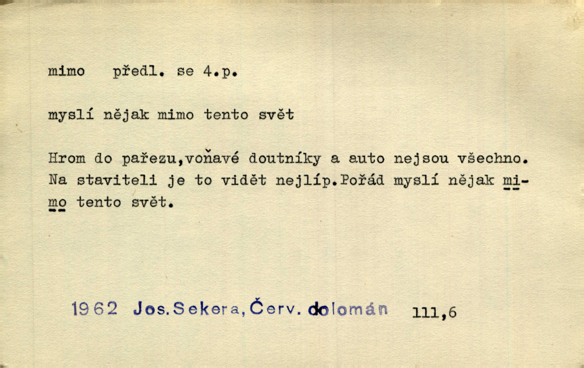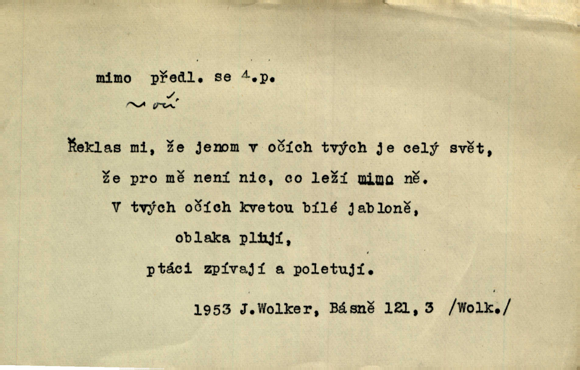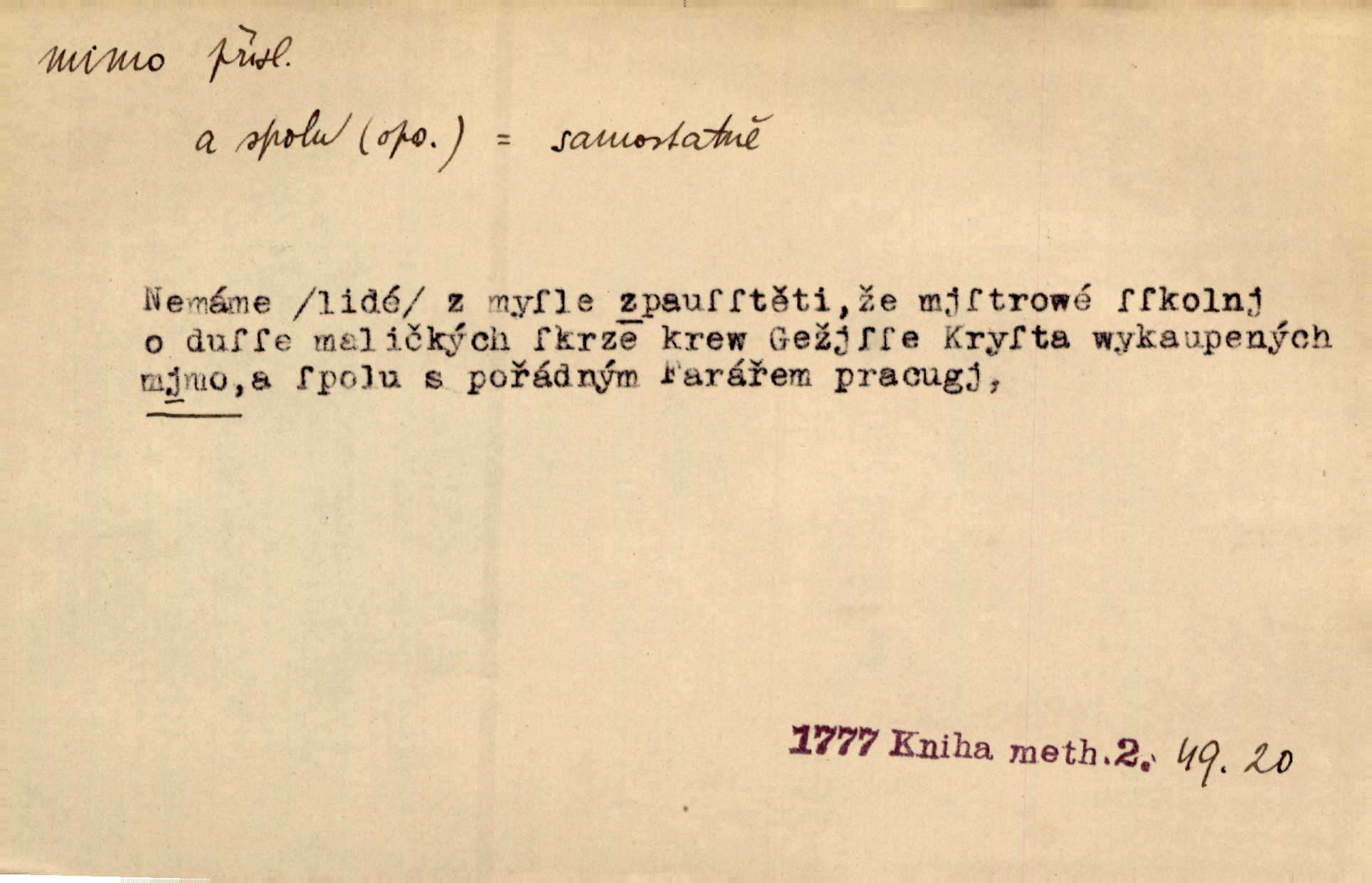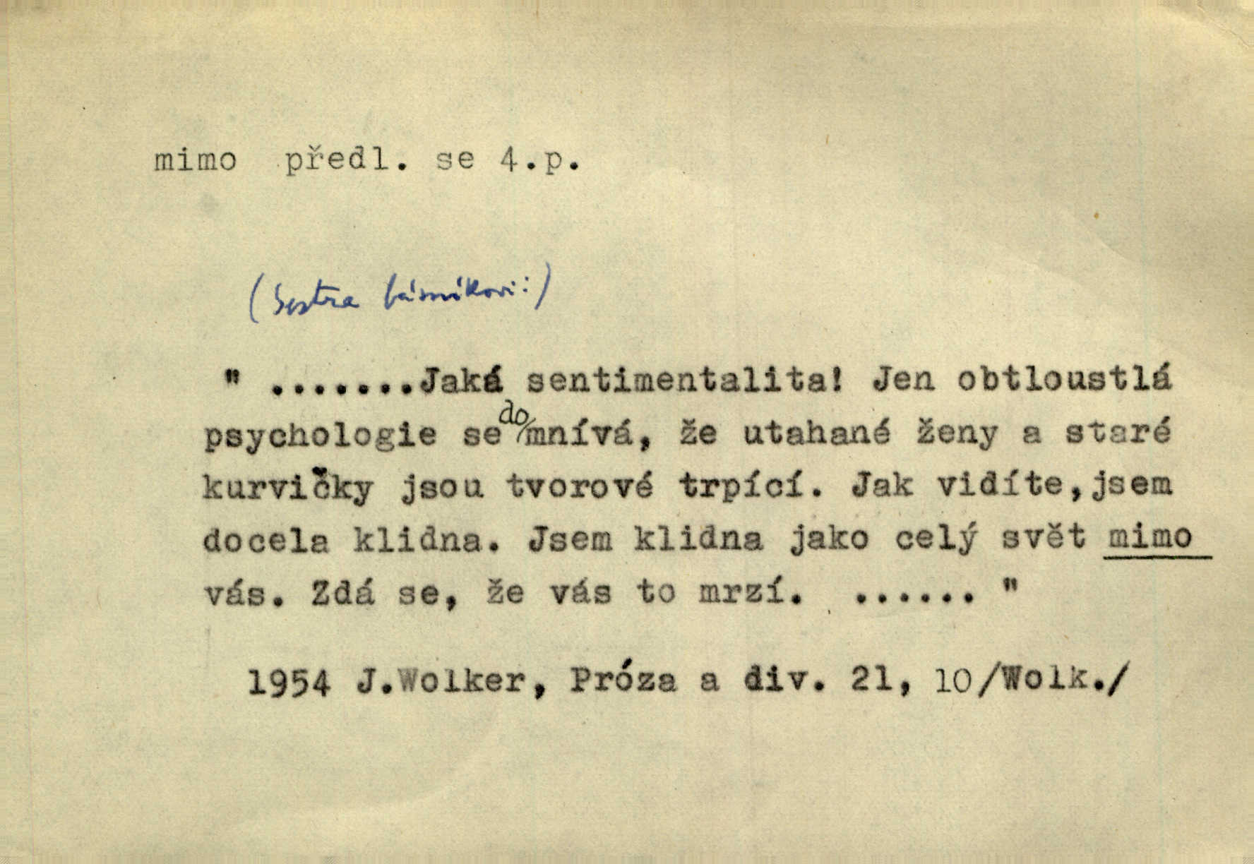 - mimo adv. stranou, vedle. Pátou [ránu] pustil [střelec] mimo. Ehrenb. Škoda každé rány, která jde mimo. Přísl. Když jsem se hnal přes prkno, skočil jsem mimo, do té louže. Jir. Usmál se lhostejně a hledě mimo poznamenal. Maria. On zvyklý počítati věcnými faktory; věci nehotové leží mu jaksi mimo. Šmil. D podle, kolem, okolo. Nechť, kdo mimo jdou, se pokřižují. Heyd. Lidé spěchali kvapným krokem mimo. Mach. D vyjma, kromě, leda. Mimo v řezbách okrasních vidíme plody výtvarného umění také na japonském bronzu. Ner. Žid mimo sobě a komoře královské stěží komu jinému býval za užitele. Win. Aniž si byl kdo, že nový host do světnice přibyl, povšimnul; mimo hospodský, který častěji se byl po dvéřích ohlížel. Tyl. D mimochodem. Úžasných věcí nám při tom [čtení Caesara] nabíjeli do hlavy: strategii, taktiku, ale všecko suše, bez map, obrazů, jen tak mimo jako vedlejší věc. Mach.
