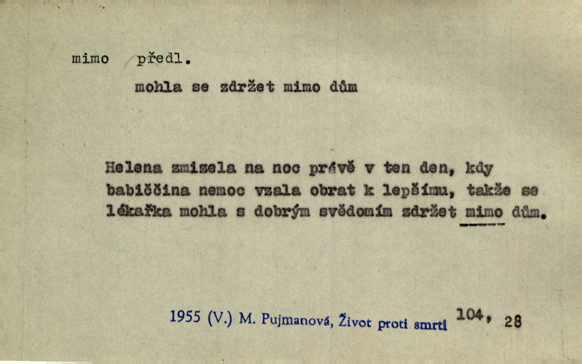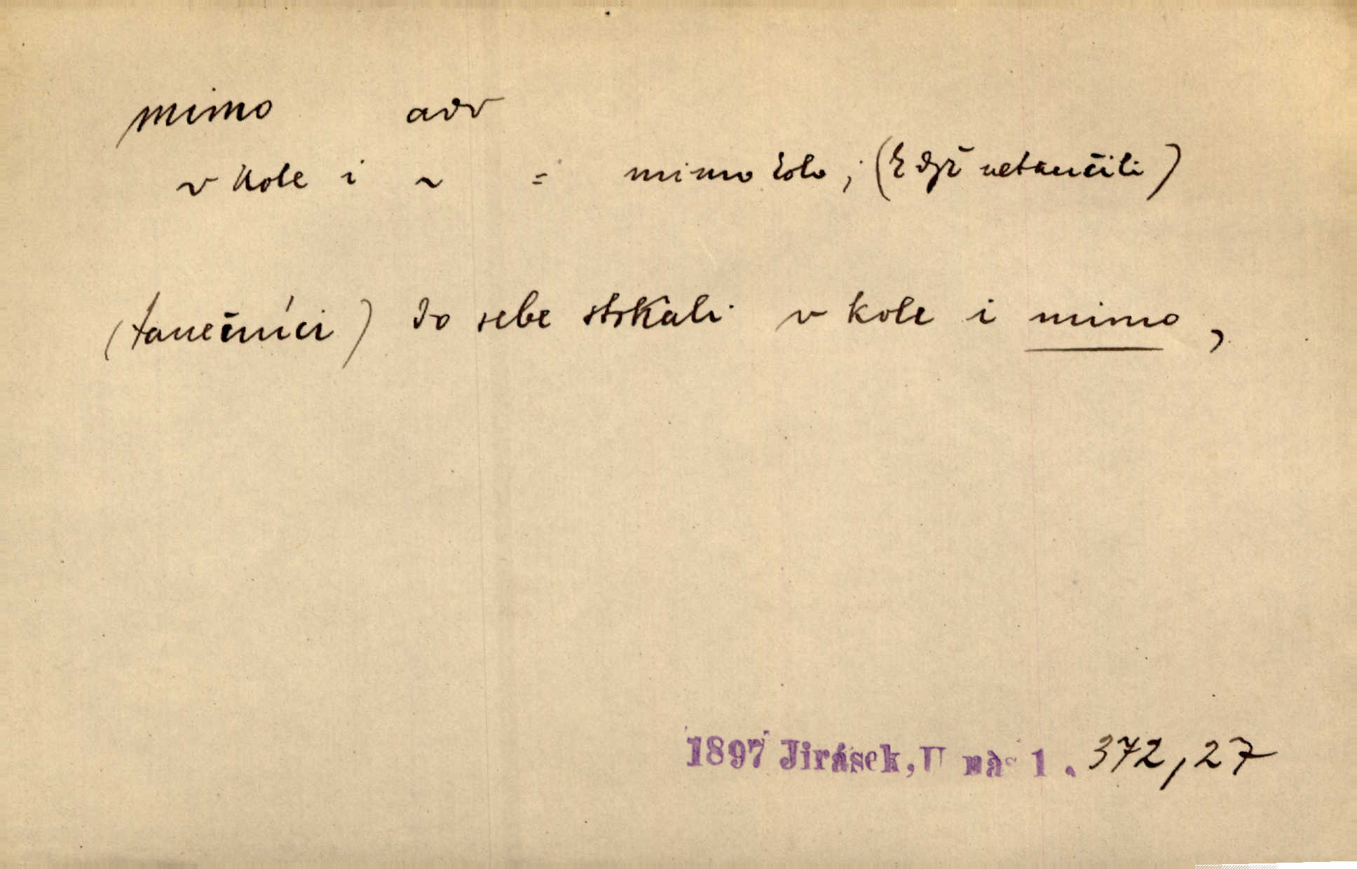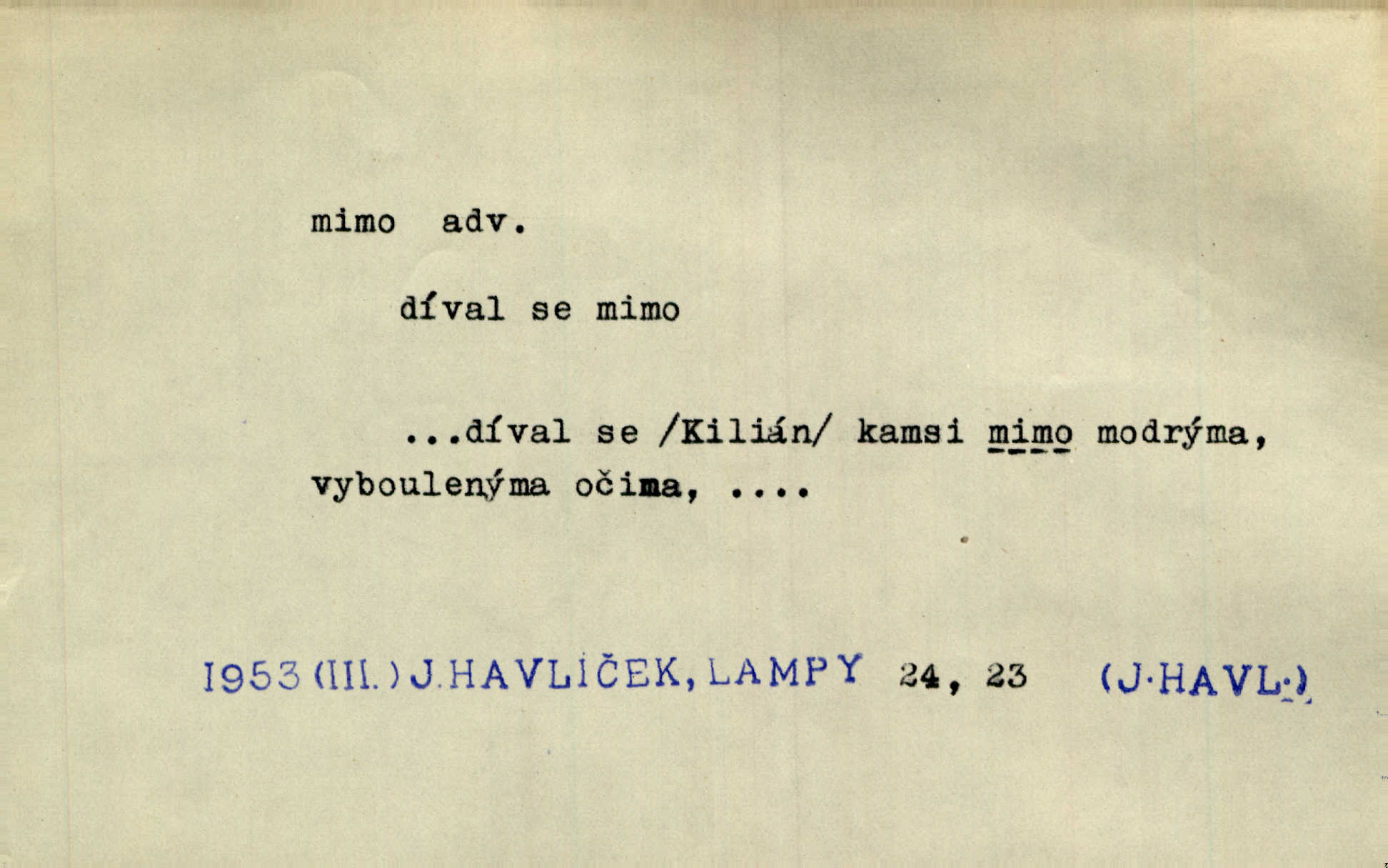 - mimo předl. s akus. označuje osobu n. věc, vedle, podle, kolem níž se děje nějaký pohyb. Němý a hluchý chodil Voborník mimo ostatní námořníky. Maj. Ani mimo zvířata nepřecházel lhostejně. Maj. Málo který den minul, aby mimo naše okna pěší vojsko netáhlo. Kos. D označuje místo, které jest vyloučeno z děje vyjádřeného slovesem, které jest vně, stranou. Ztráví noc mimo dům. Svět. Rád by nějaký čas bydlel mimo Řím. Zey. Ve svých prvních začátcích vzniká hra mimo divadlo, na psacím stole ctižádostivého autora. Čap. V té chvíli ho nezaměstnávalo nic na světě, co bylo mimo její sedničku. Svět. Mimo cestu blíže lesa srubný domek leží. Heyd. Nejí a nepije prý mimo čas. Prav. Je tichá [ulice]‚ mimo všechen provoz. Olb. Dnešní „Lohengrin“ byl mimo předplacení. Čap. Ch. Běží o to, zdali představě odpovídá jakás věc skutečná mimo mne. Durd. Najdou se lidé mimo dobro a zlo, političtí nadlidé, kteří i právo na podvod hájí. Dyk. D označuje osobu n. věc, kromě níž lze (n. nelze) uvésti jinou, vedle, kromě. Všecko je v pořádku; mimo to jsem se přesvědčil, že sedlák lhal. Jir. Vodníka prý snadno jest mezi lidmi poznati, mimo jiné také po tom, že mu vždy ze šatu z levé strany kape. Erb. Mimo tyto věci měla babička v přítruhlíčku dva růžence. Něm. Mimo nás nikdo jiný v šenkovně nespal. Gallat. D označuje osobu n. věc, kterou pomíjíme nedbajíce jí; proti. Já zas mimo obyčej dovolával jsem se zákona. Arb. Ku zvýšení dojmu vítězství přispělo i to, že se stalo mimo očekávání všech, kdož svádějí bitvy na mapách. Hol. Pak se dostal do tajemné jizby sousedovy mimo nadání. Jir. Mimo vůli a maně šli jsme směrem k mohylám. E. Jel.