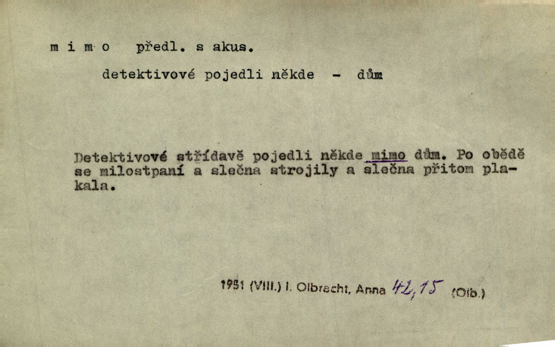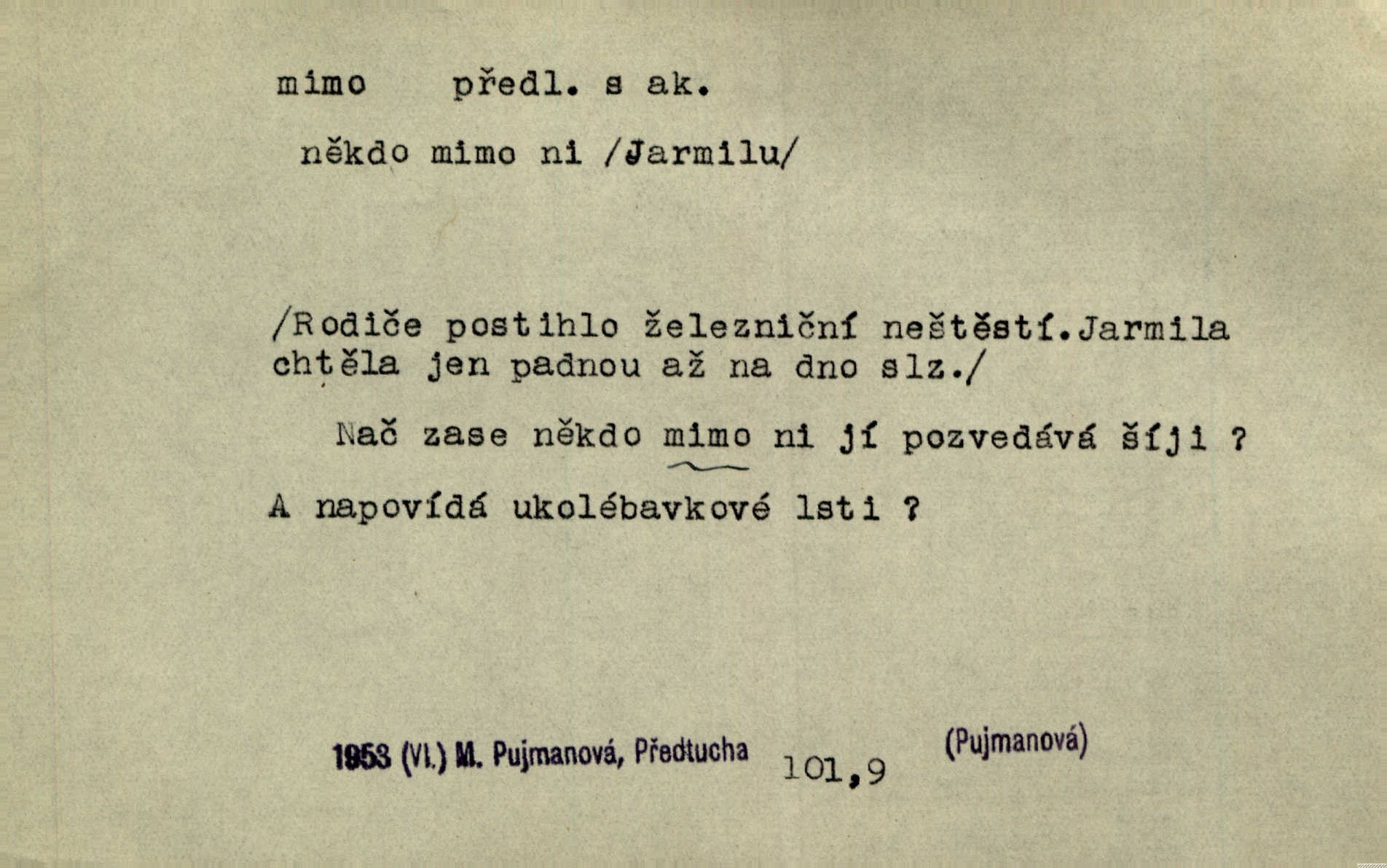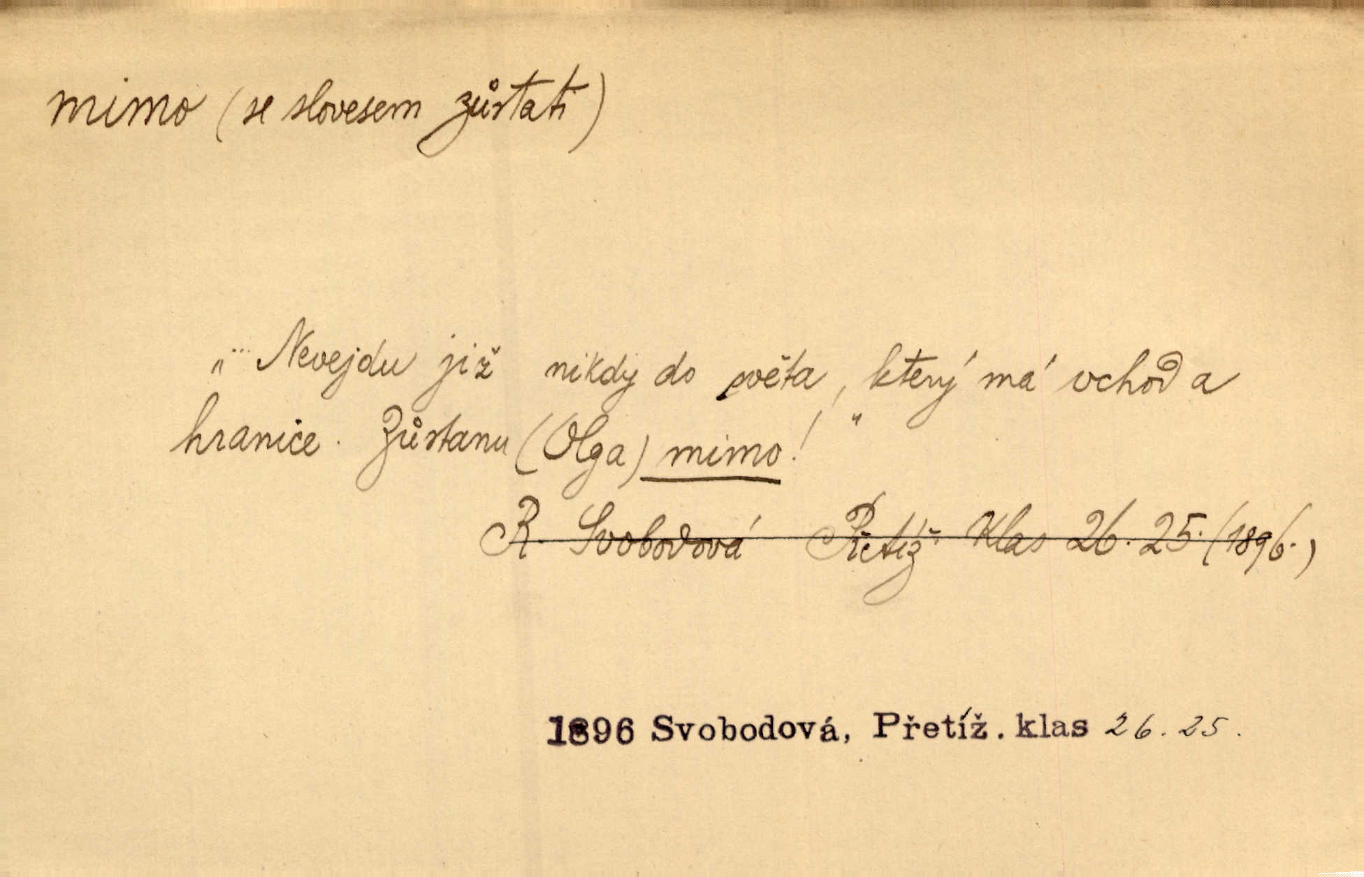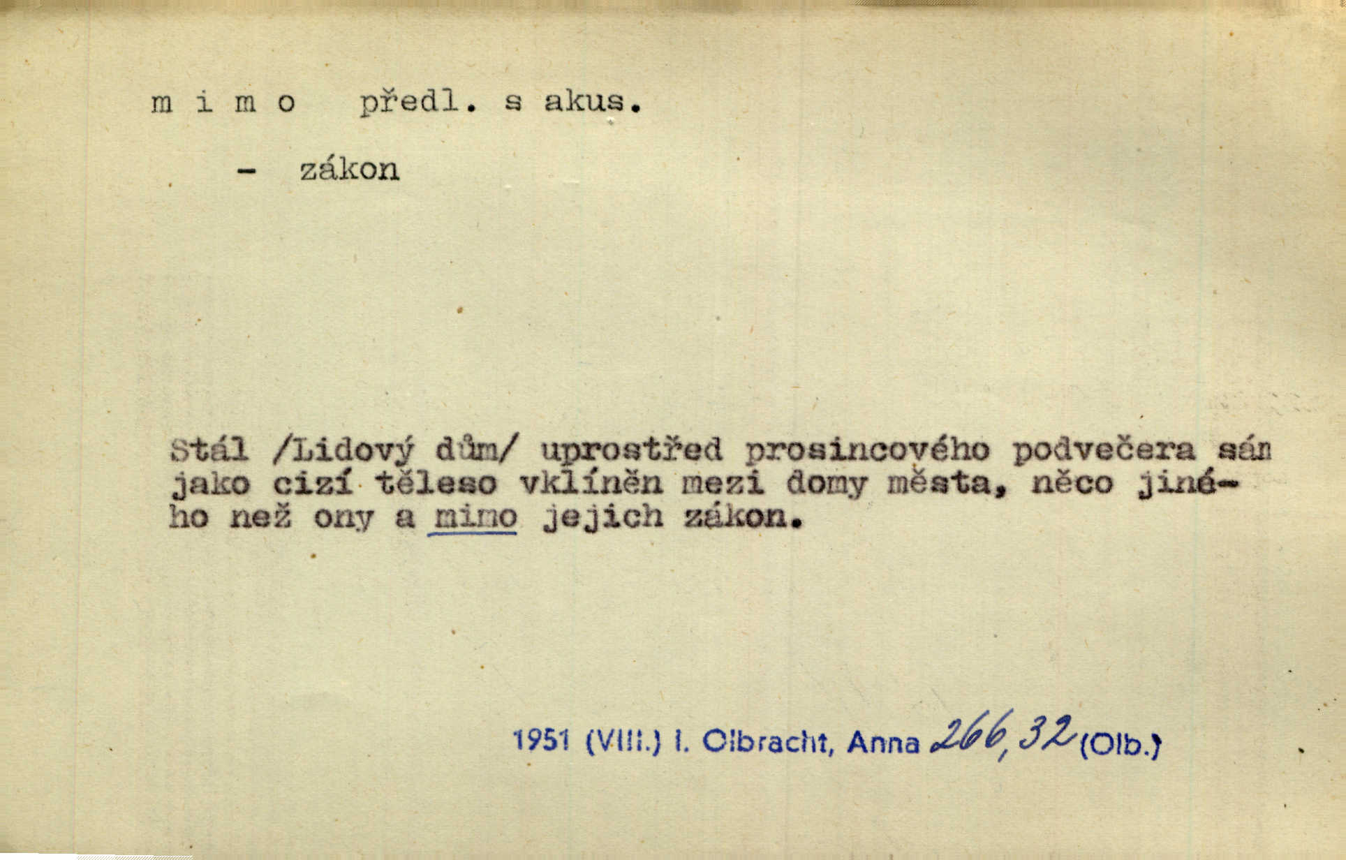 - mimo předl. s akus. označuje osobu n. věc, vedle, podle, kolem níž se děje nějaký pohyb. Němý a hluchý chodil Voborník mimo ostatní námořníky. Maj. Ani mimo zvířata nepřecházel lhostejně. Maj. Málo který den minul, aby mimo naše okna pěší vojsko netáhlo. Kos. D označuje místo, které jest vyloučeno z děje vyjádřeného slovesem, které jest vně, stranou. Ztráví noc mimo dům. Svět. Rád by nějaký čas bydlel mimo Řím. Zey. Ve svých prvních začátcích vzniká hra mimo divadlo, na psacím stole ctižádostivého autora. Čap. V té chvíli ho nezaměstnávalo nic na světě, co bylo mimo její sedničku. Svět. Mimo cestu blíže lesa srubný domek leží. Heyd. Nejí a nepije prý mimo čas. Prav. Je tichá [ulice]‚ mimo všechen provoz. Olb. Dnešní „Lohengrin“ byl mimo předplacení. Čap. Ch. Běží o to, zdali představě odpovídá jakás věc skutečná mimo mne. Durd. Najdou se lidé mimo dobro a zlo, političtí nadlidé, kteří i právo na podvod hájí. Dyk. D označuje osobu n. věc, kromě níž lze (n. nelze) uvésti jinou, vedle, kromě. Všecko je v pořádku; mimo to jsem se přesvědčil, že sedlák lhal. Jir. Vodníka prý snadno jest mezi lidmi poznati, mimo jiné také po tom, že mu vždy ze šatu z levé strany kape. Erb. Mimo tyto věci měla babička v přítruhlíčku dva růžence. Něm. Mimo nás nikdo jiný v šenkovně nespal. Gallat. D označuje osobu n. věc, kterou pomíjíme nedbajíce jí; proti. Já zas mimo obyčej dovolával jsem se zákona. Arb. Ku zvýšení dojmu vítězství přispělo i to, že se stalo mimo očekávání všech, kdož svádějí bitvy na mapách. Hol. Pak se dostal do tajemné jizby sousedovy mimo nadání. Jir. Mimo vůli a maně šli jsme směrem k mohylám. E. Jel.