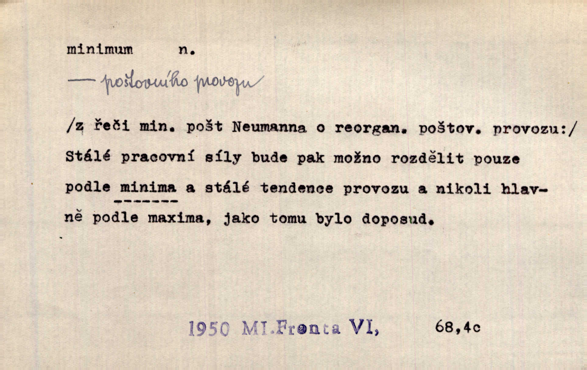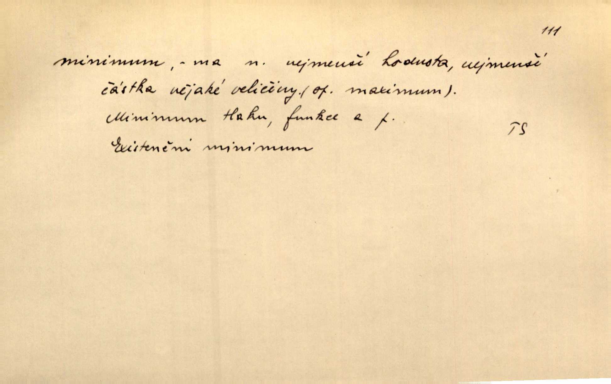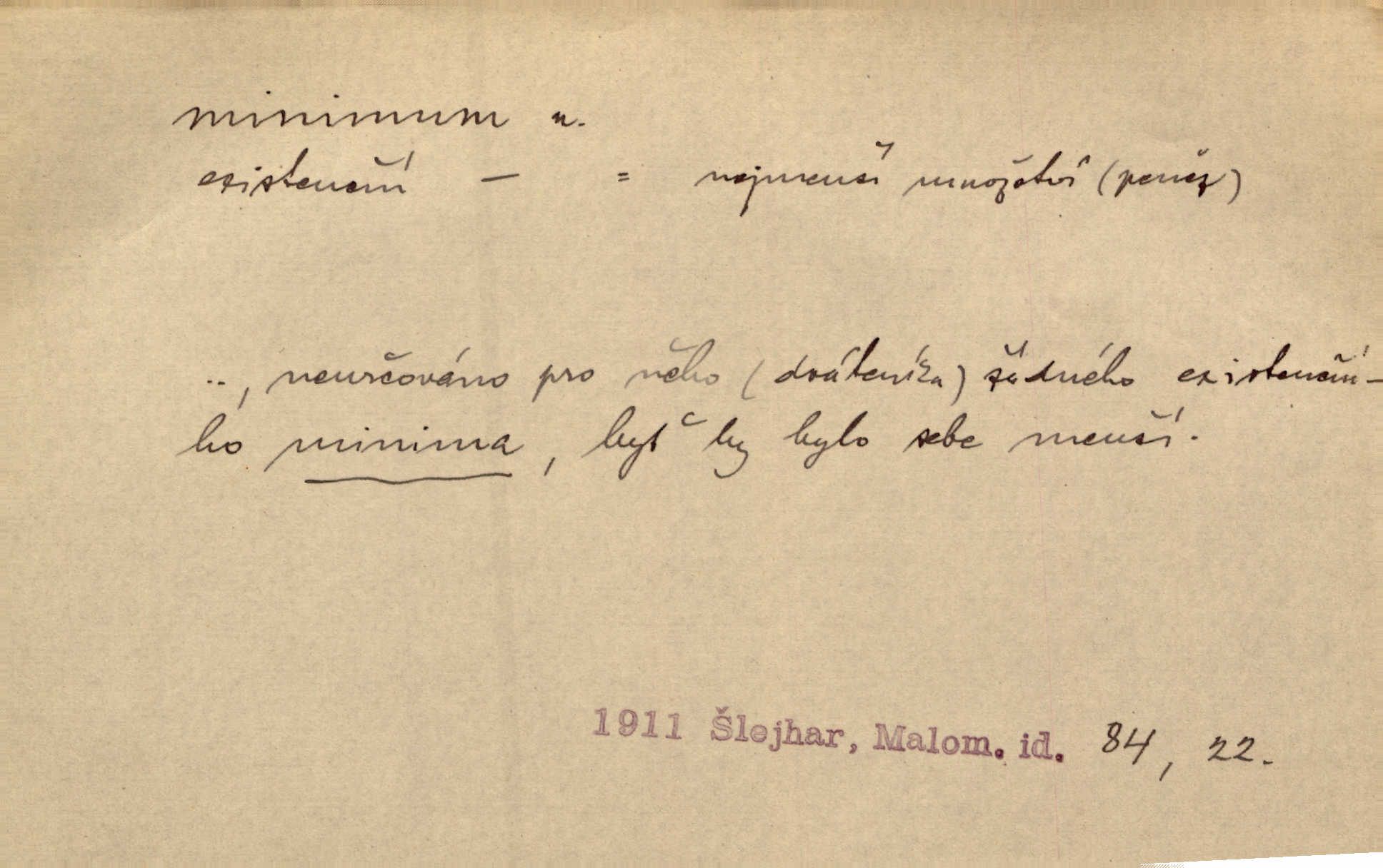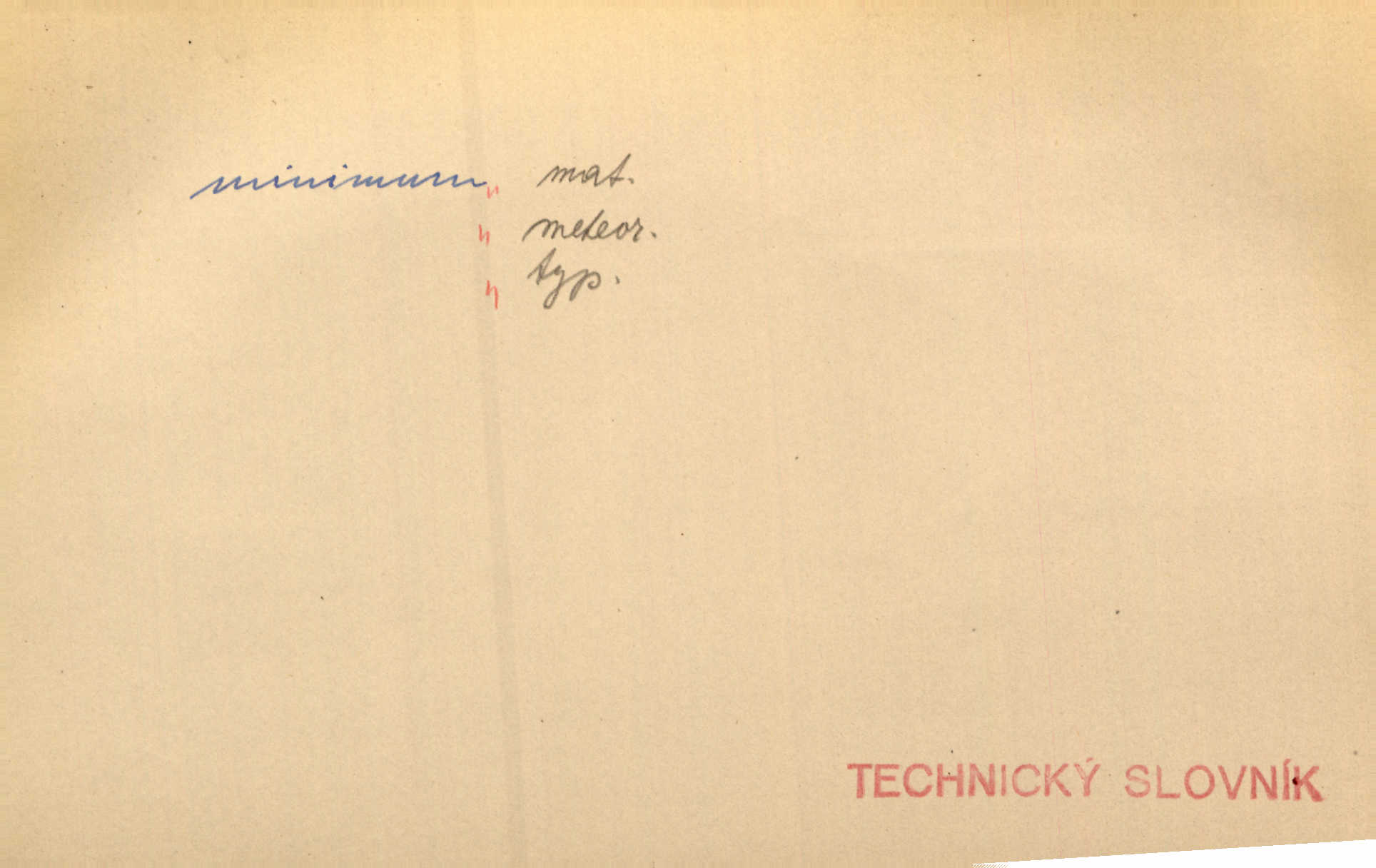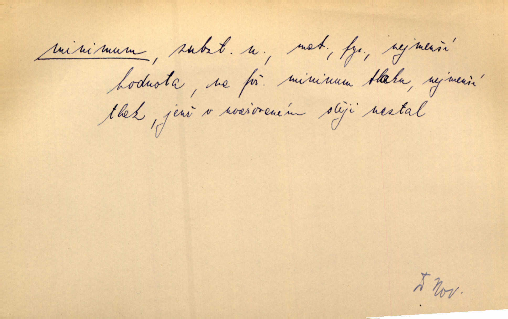 - minimum (vysl. -ny-), -nima n. nejmenší hodnota, míra, nejmenší částka nějaké veličiny (op. maximum). Vypravovatelská funkce epikova stlačena na minimum. Sez. Myslíte, že se dá důtkami pomoci zemi, která po dobrém nevydala ani minimum své obětavosti? Kop. Existenční minimum důchod naprosto nutný k uhájení živobytí. Fys. minimum tlaku nejnižší tlak, který v uvažovaném ději nastal.