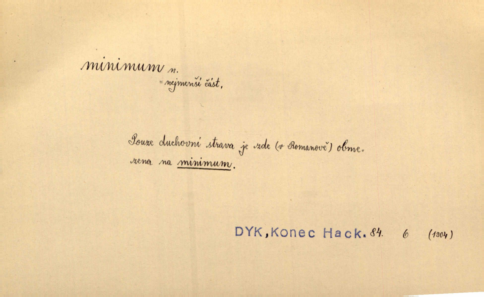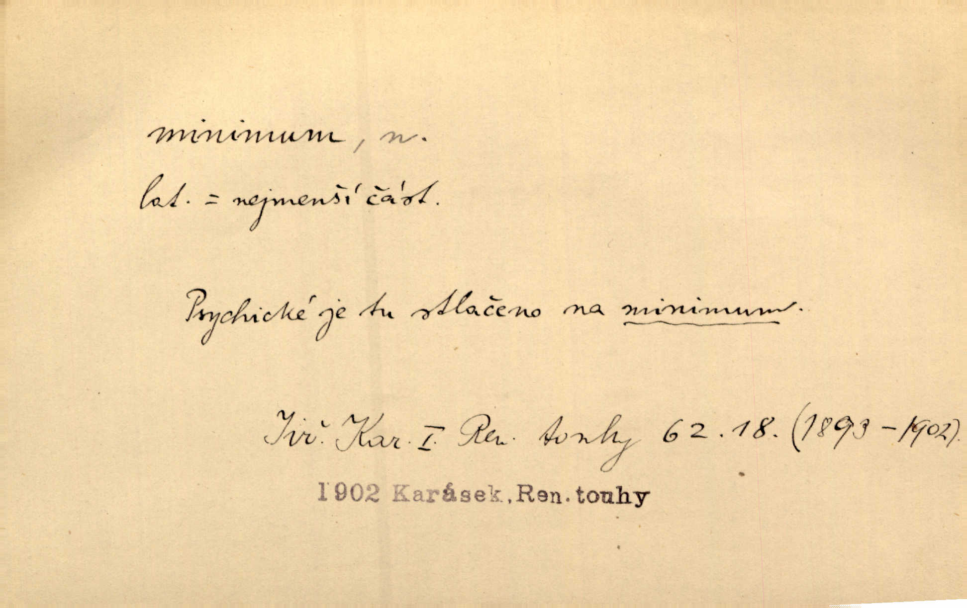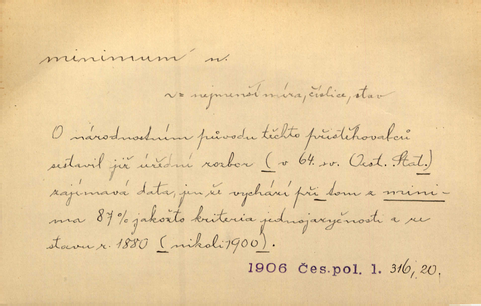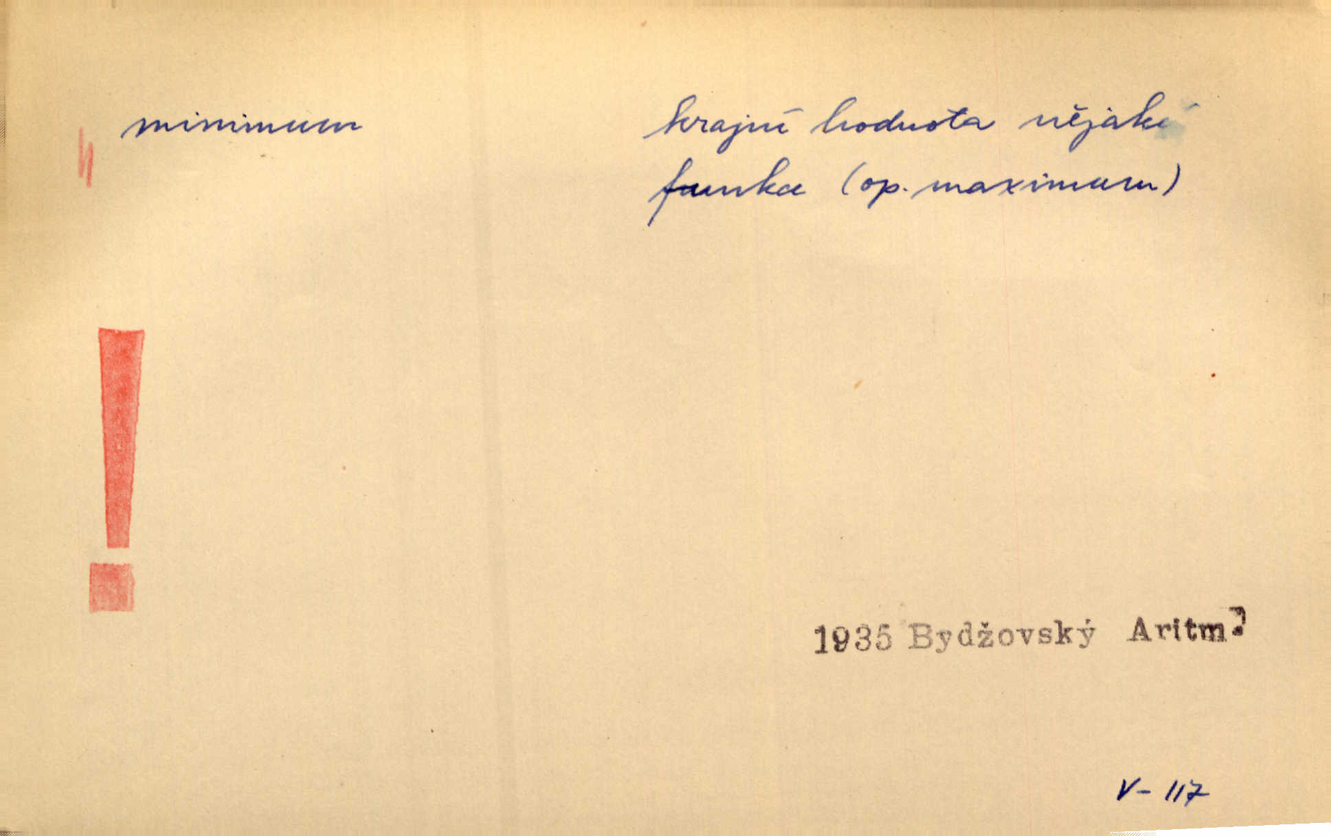 - minimum (vysl. -ny-), -nima n. nejmenší hodnota, míra, nejmenší částka nějaké veličiny (op. maximum). Vypravovatelská funkce epikova stlačena na minimum. Sez. Myslíte, že se dá důtkami pomoci zemi, která po dobrém nevydala ani minimum své obětavosti? Kop. Existenční minimum důchod naprosto nutný k uhájení živobytí. Fys. minimum tlaku nejnižší tlak, který v uvažovaném ději nastal.