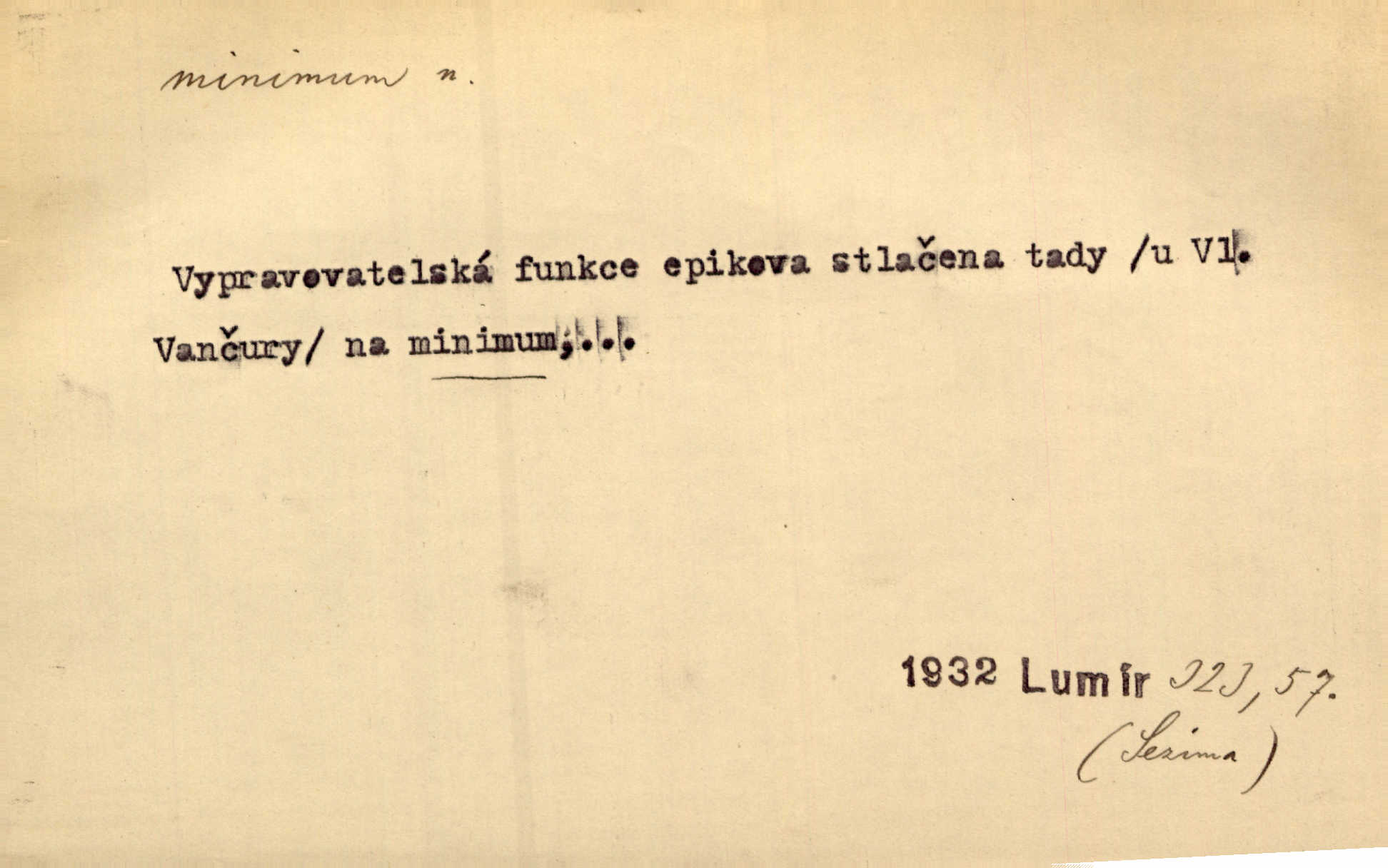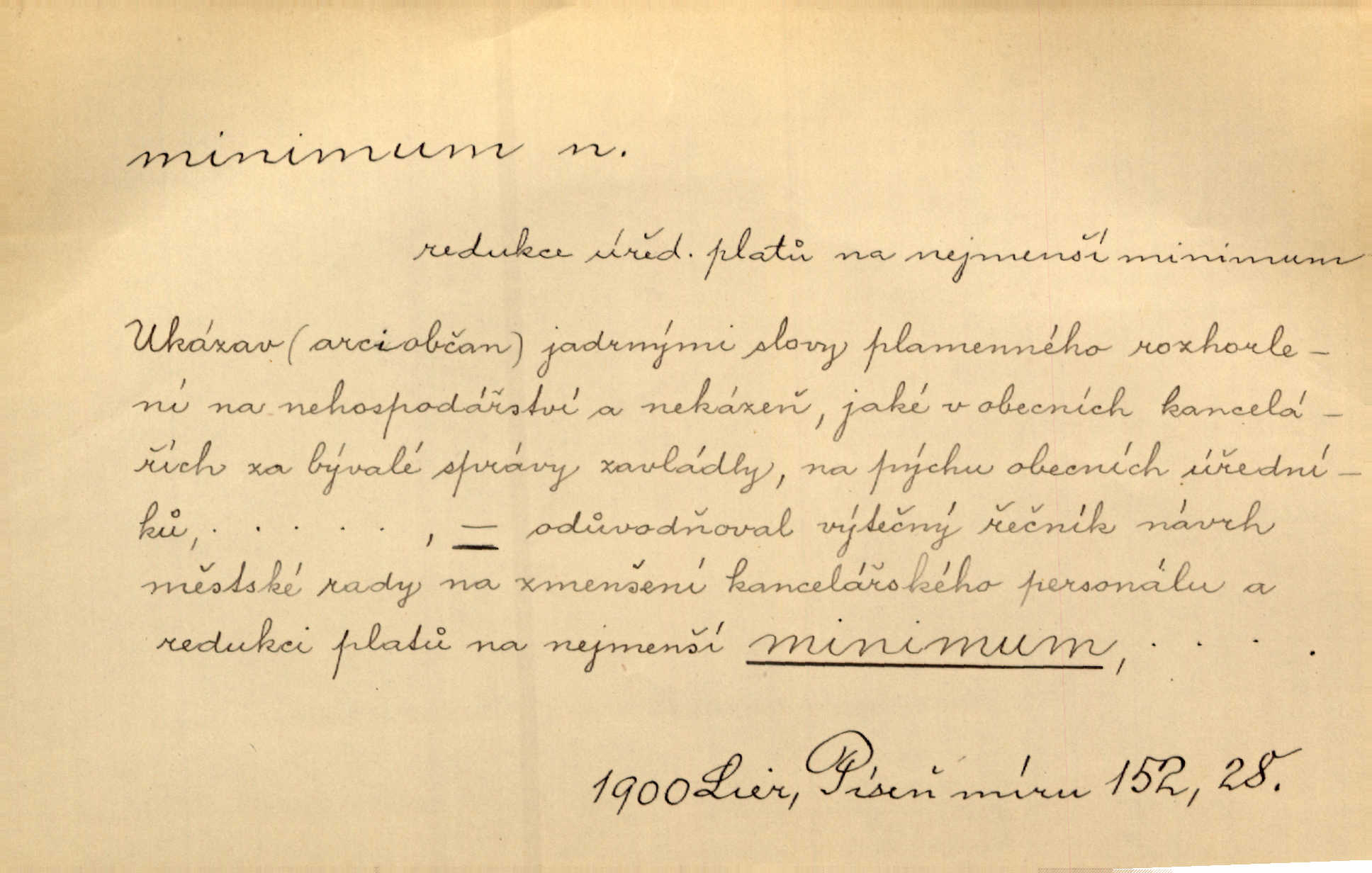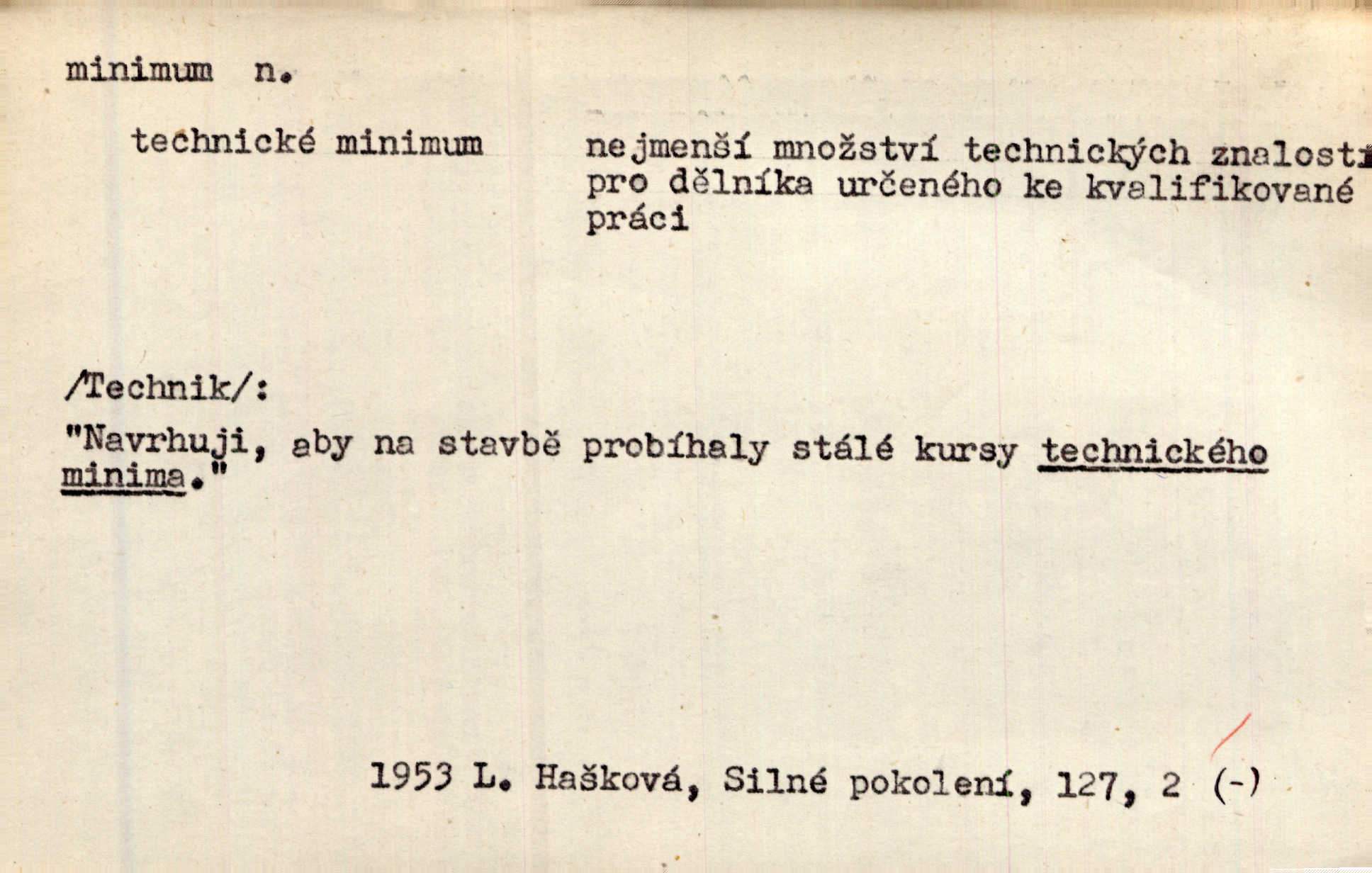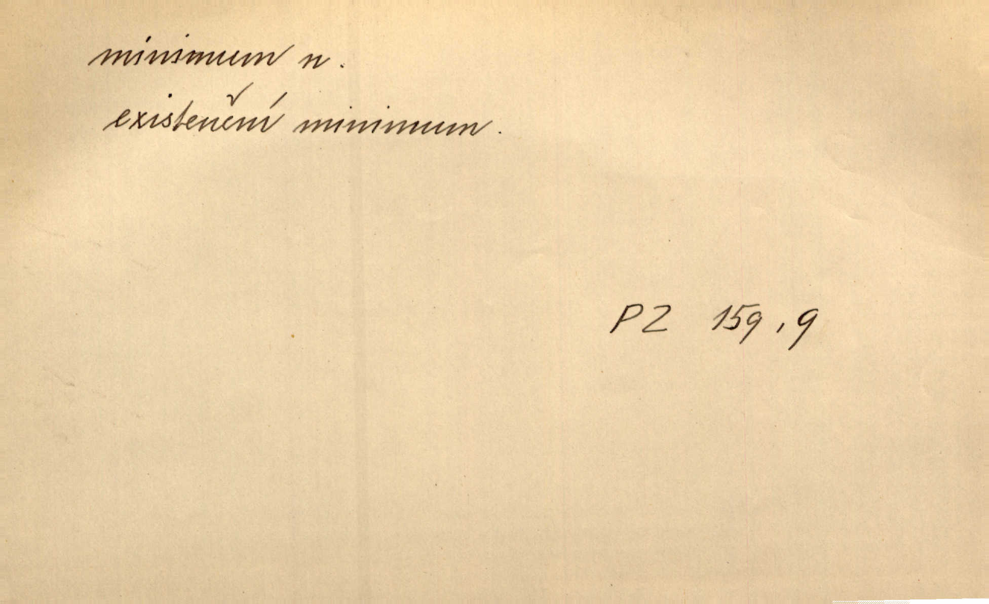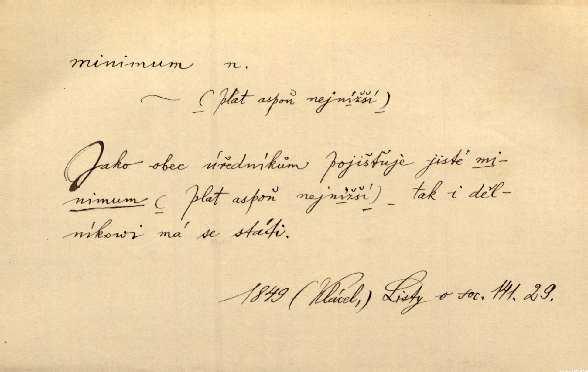 - minimum (vysl. -ny-), -nima n. nejmenší hodnota, míra, nejmenší částka nějaké veličiny (op. maximum). Vypravovatelská funkce epikova stlačena na minimum. Sez. Myslíte, že se dá důtkami pomoci zemi, která po dobrém nevydala ani minimum své obětavosti? Kop. Existenční minimum důchod naprosto nutný k uhájení živobytí. Fys. minimum tlaku nejnižší tlak, který v uvažovaném ději nastal.