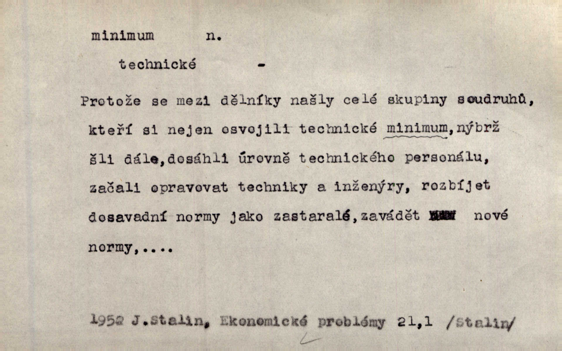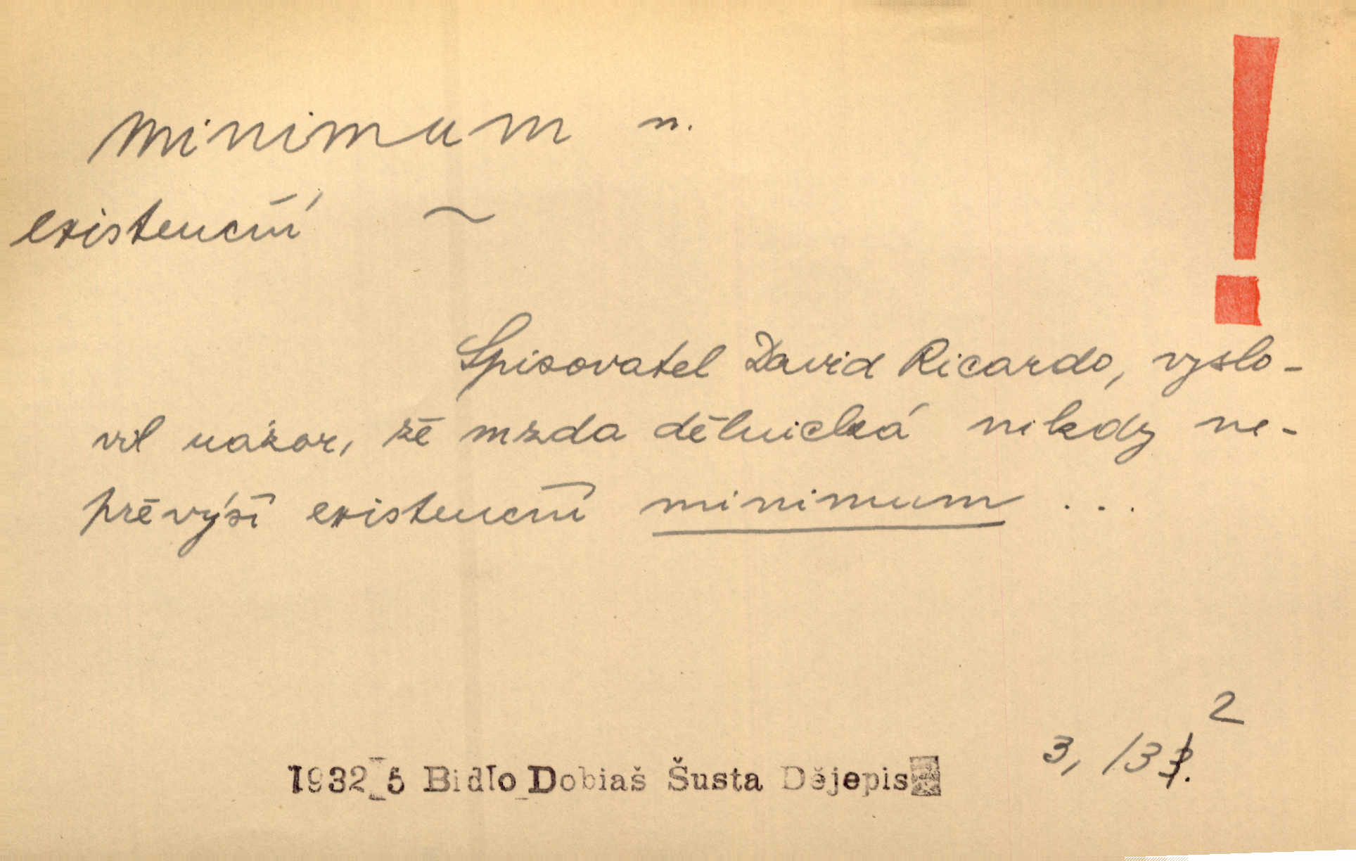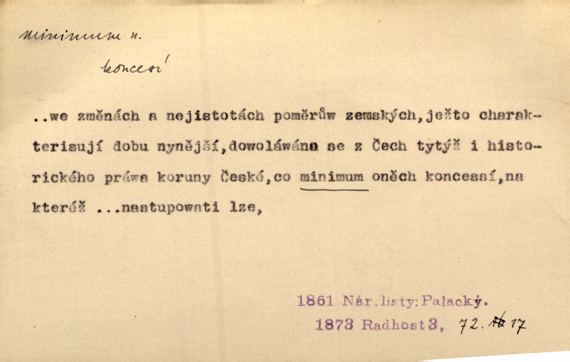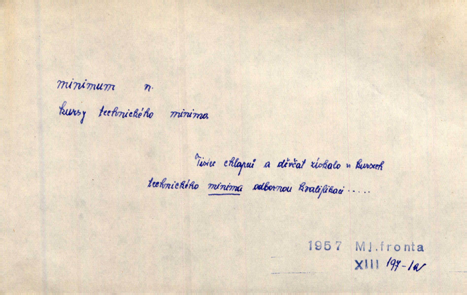 - minimum (vysl. -ny-), -nima n. nejmenší hodnota, míra, nejmenší částka nějaké veličiny (op. maximum). Vypravovatelská funkce epikova stlačena na minimum. Sez. Myslíte, že se dá důtkami pomoci zemi, která po dobrém nevydala ani minimum své obětavosti? Kop. Existenční minimum důchod naprosto nutný k uhájení živobytí. Fys. minimum tlaku nejnižší tlak, který v uvažovaném ději nastal.