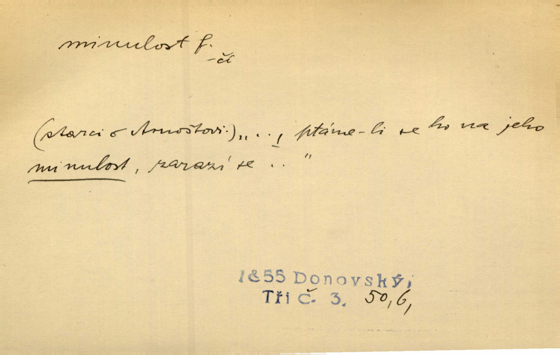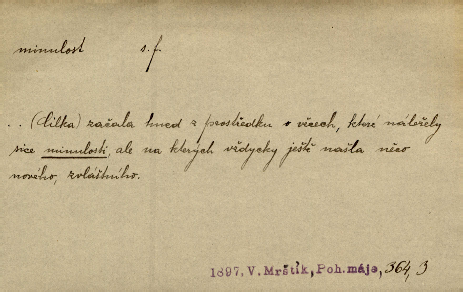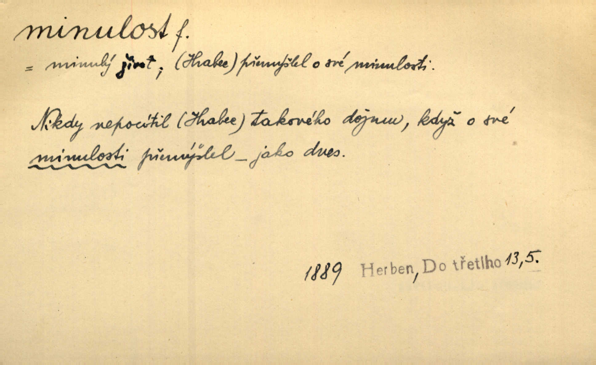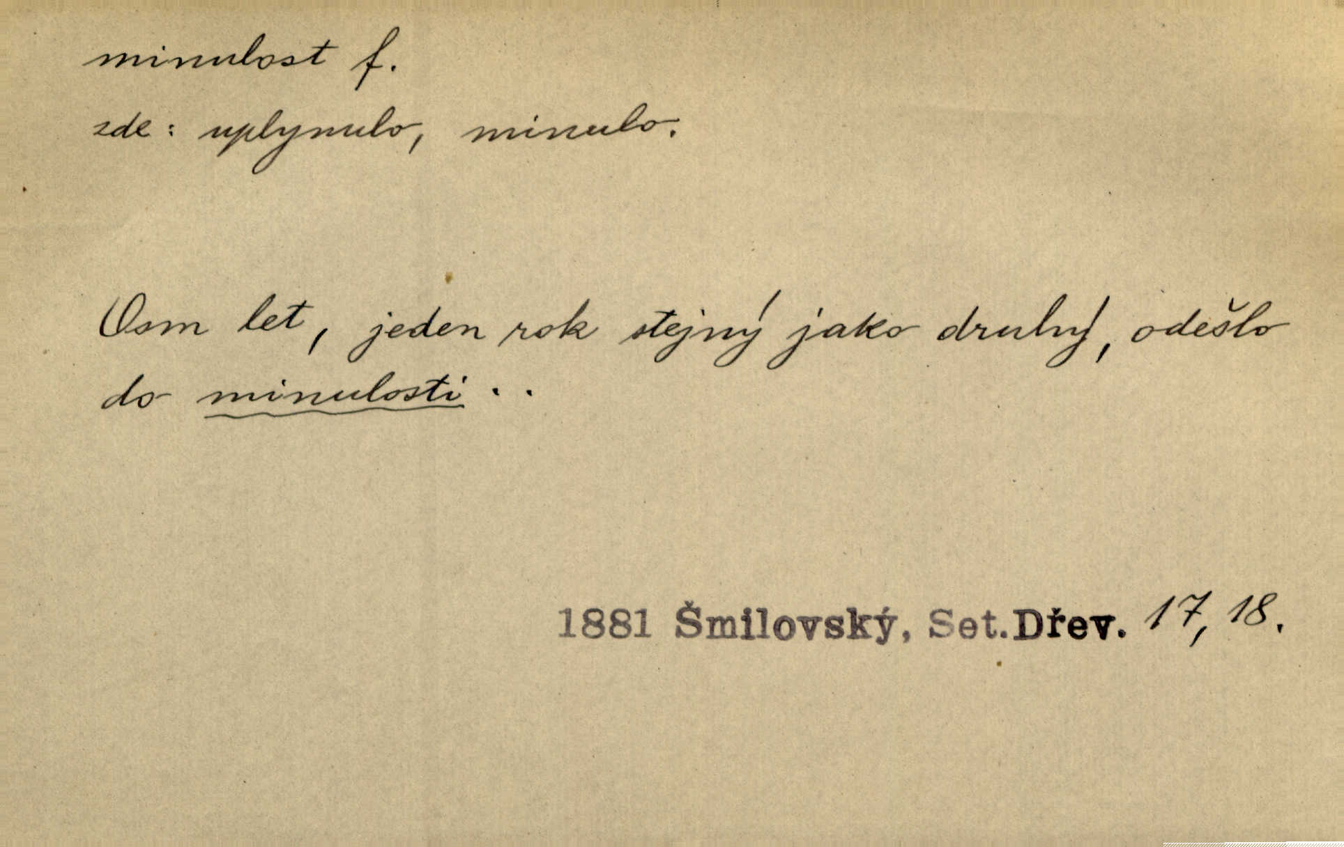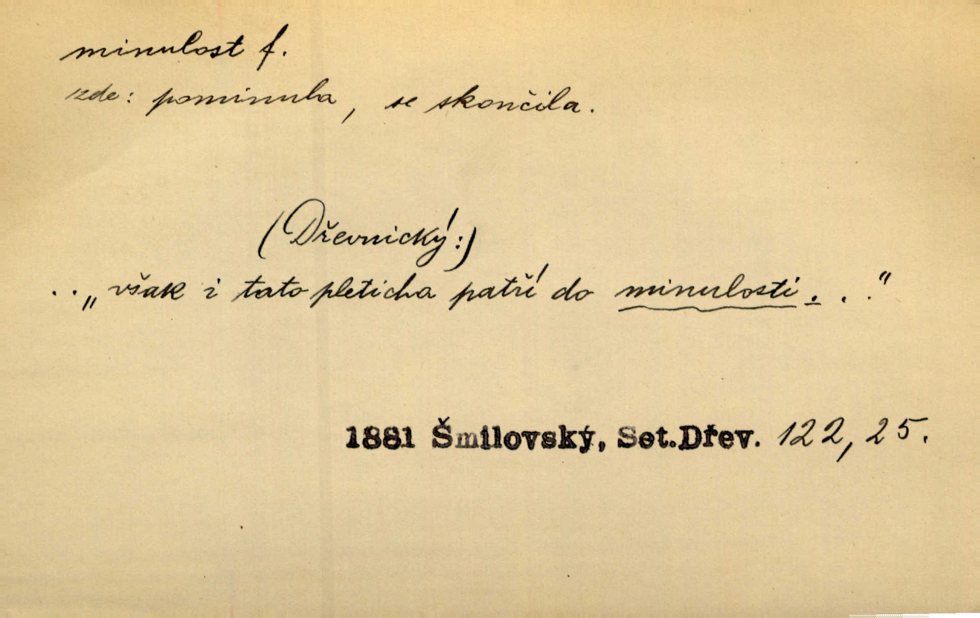 - minulost, -i f. minulá, uplynulá doba. Jen z minulosti jasně poznané dá se dobře poznat přítomnost. Durd. předvčerejšek zdá se mně být už šedou minulostí. Ner. Osm let, jeden rok stejný jako druhý, odešlo do minulosti. Šmil. I tato pleticha patří do minulosti pominula. Šmil. D Zvl. minulý život n. způsob života, minulé činy. Dívko, nechť minulost tvoje jakákoli, chci, bys byla mou. Zey. Má minulost byla velmi trudná. Sab. Propustili mne [žebráka na policii]‚ když se přesvědčili, že mám lepší minulost. Vach. Tvrdilo se, že je to [bratří Čapkové] pseudonym, za kterým se skrývá ruinovaný bankéř čili, jak se říká, člověk s minulostí se špatnou pověstí. Čap.