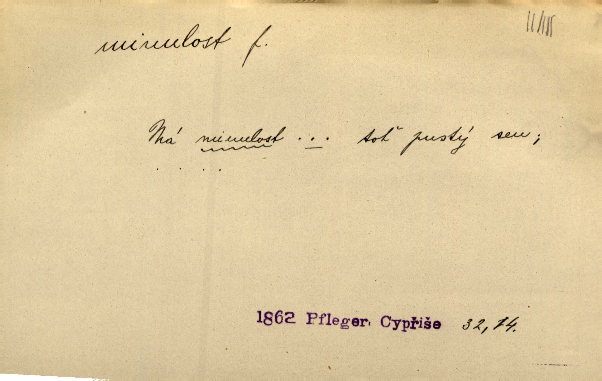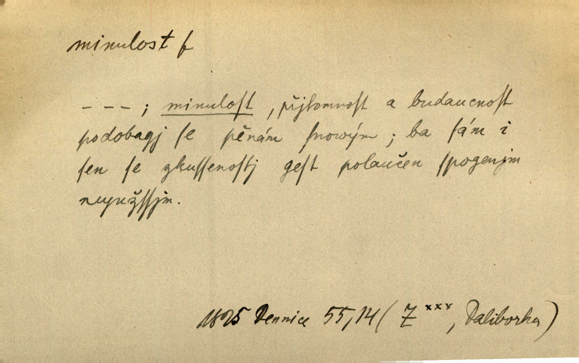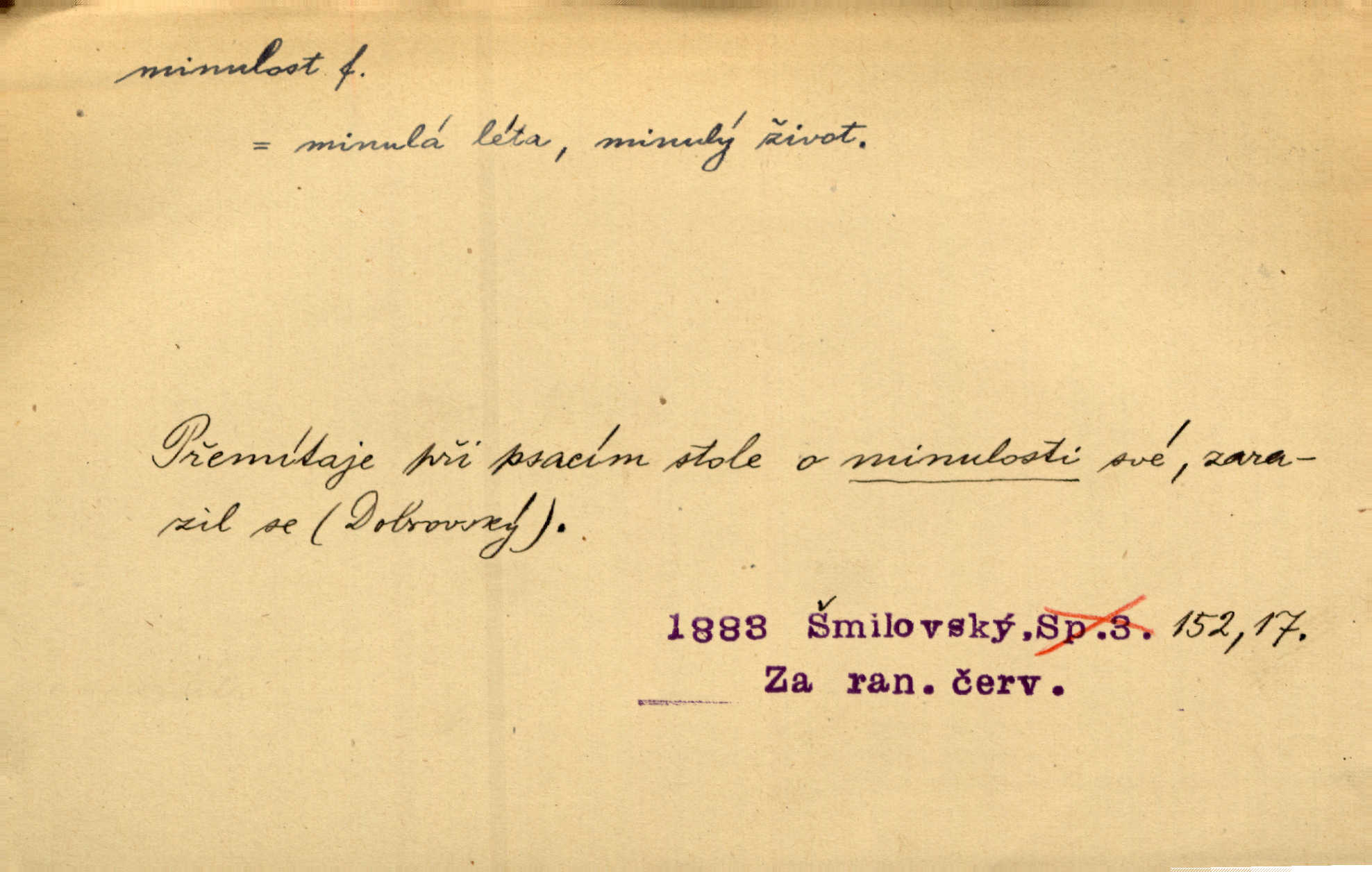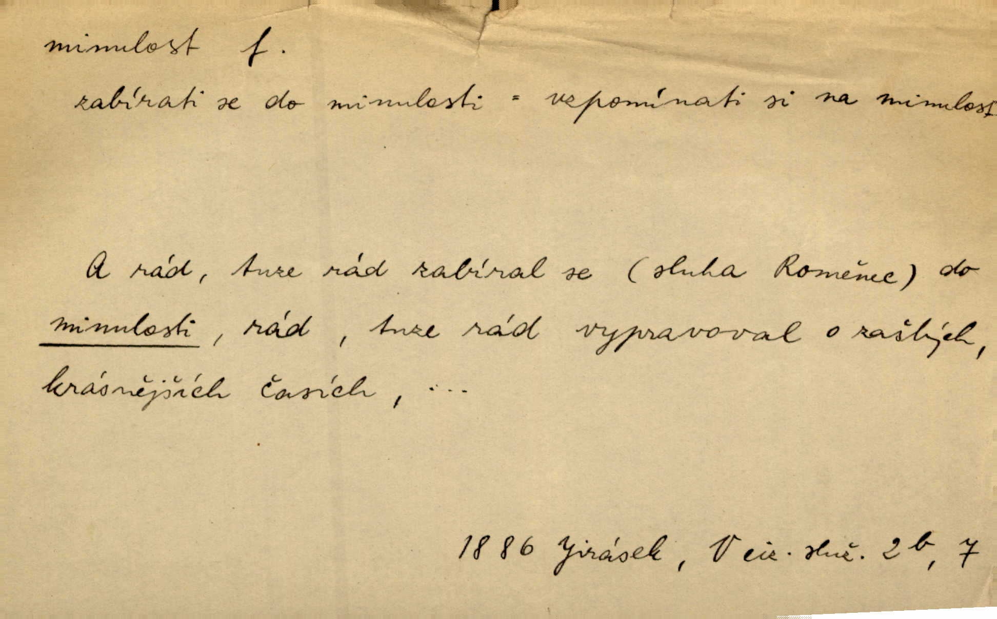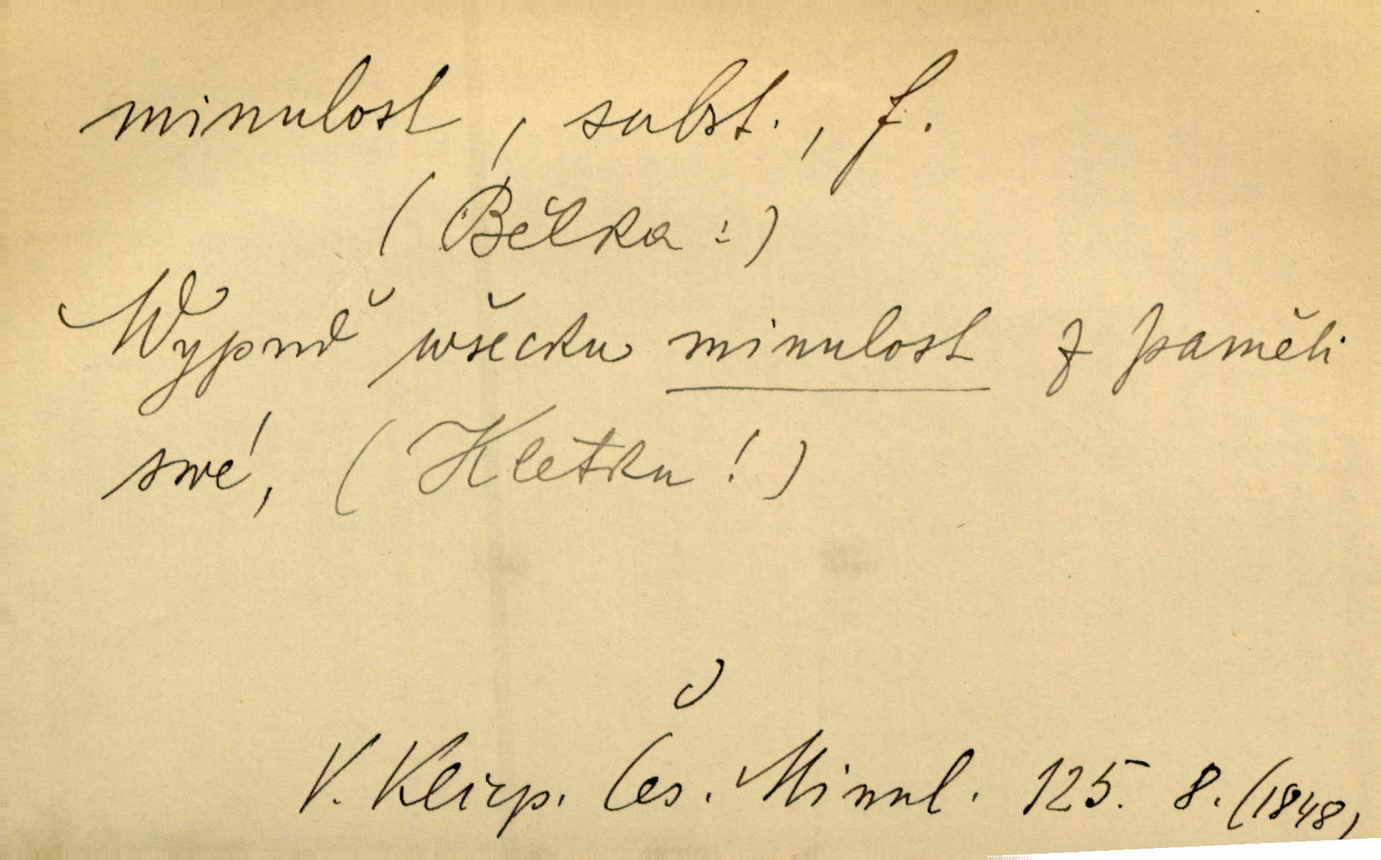 - minulost, -i f. minulá, uplynulá doba. Jen z minulosti jasně poznané dá se dobře poznat přítomnost. Durd. předvčerejšek zdá se mně být už šedou minulostí. Ner. Osm let, jeden rok stejný jako druhý, odešlo do minulosti. Šmil. I tato pleticha patří do minulosti pominula. Šmil. D Zvl. minulý život n. způsob života, minulé činy. Dívko, nechť minulost tvoje jakákoli, chci, bys byla mou. Zey. Má minulost byla velmi trudná. Sab. Propustili mne [žebráka na policii]‚ když se přesvědčili, že mám lepší minulost. Vach. Tvrdilo se, že je to [bratří Čapkové] pseudonym, za kterým se skrývá ruinovaný bankéř čili, jak se říká, člověk s minulostí se špatnou pověstí. Čap.