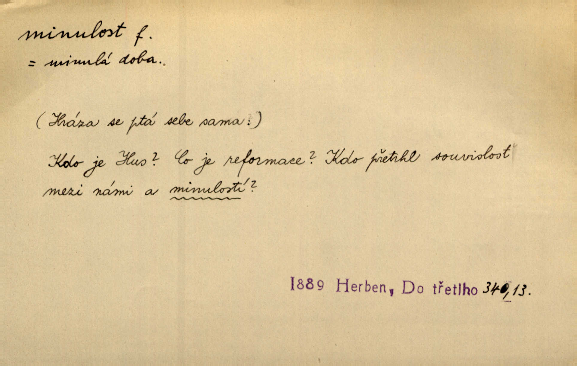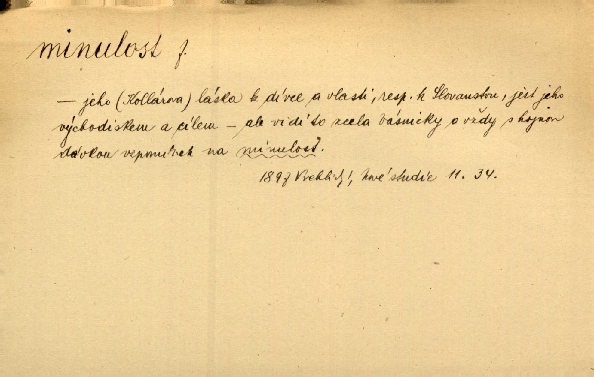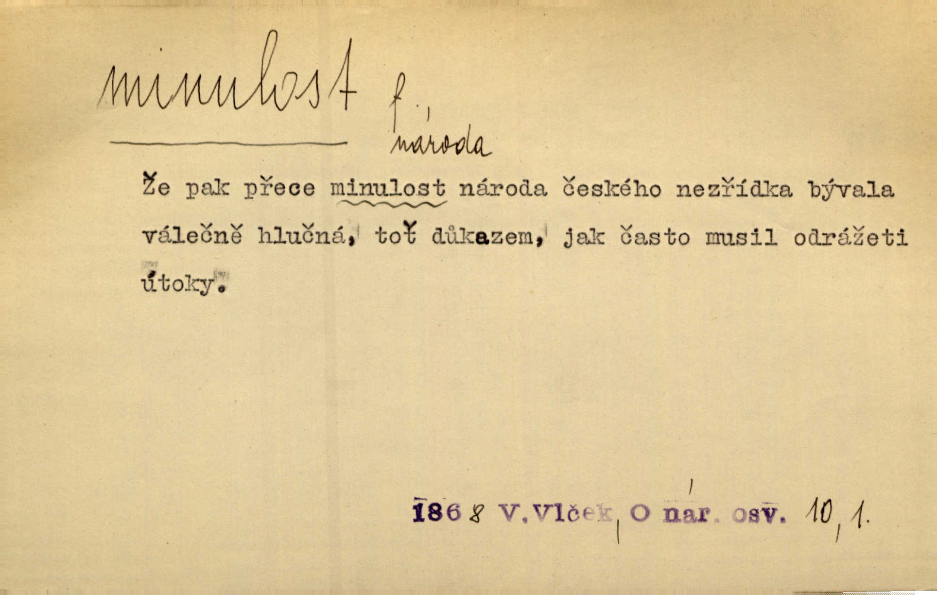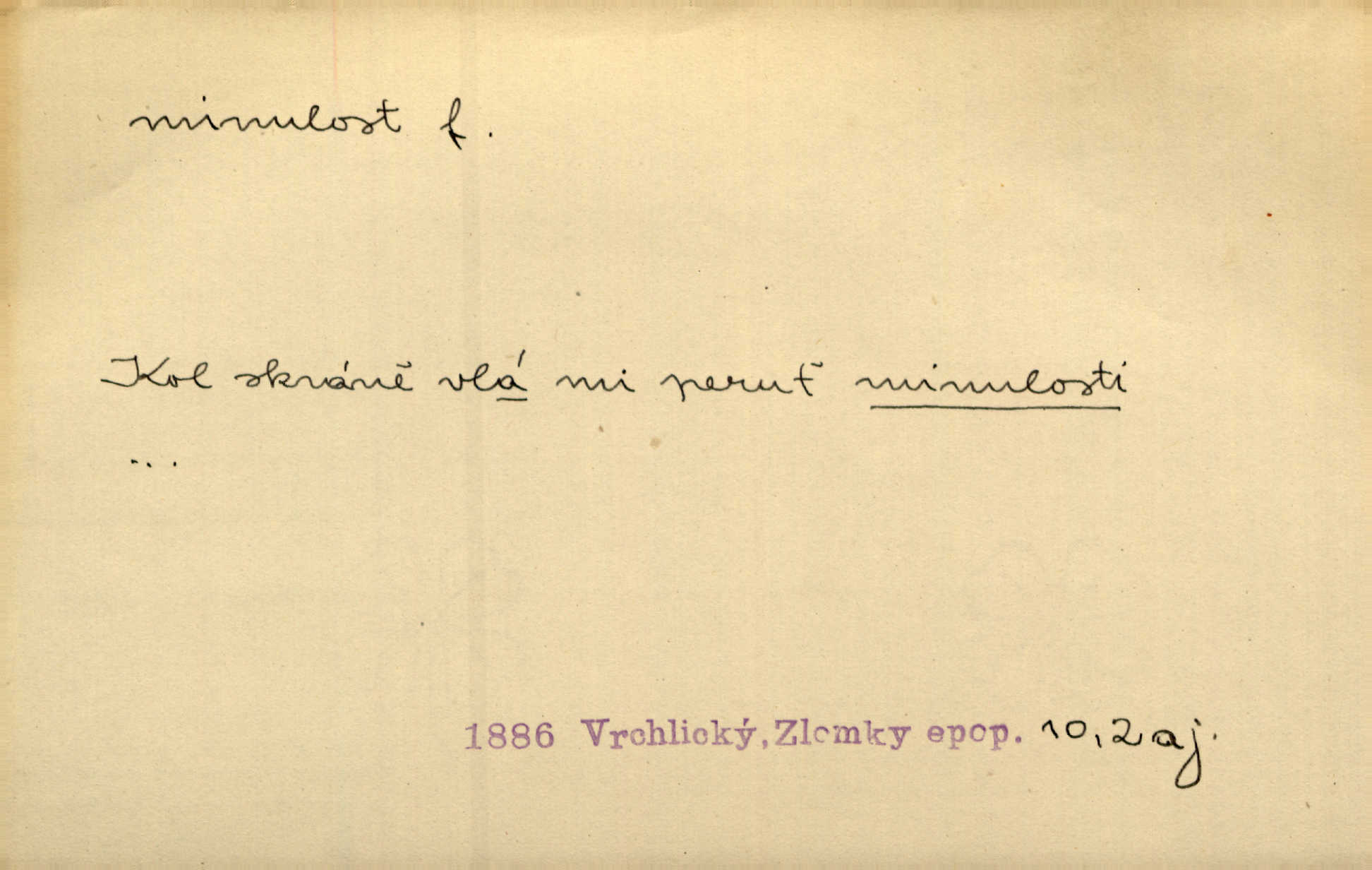- minulost, -i f. minulá, uplynulá doba. Jen z minulosti jasně poznané dá se dobře poznat přítomnost. Durd. předvčerejšek zdá se mně být už šedou minulostí. Ner. Osm let, jeden rok stejný jako druhý, odešlo do minulosti. Šmil. I tato pleticha patří do minulosti pominula. Šmil. D Zvl. minulý život n. způsob života, minulé činy. Dívko, nechť minulost tvoje jakákoli, chci, bys byla mou. Zey. Má minulost byla velmi trudná. Sab. Propustili mne [žebráka na policii]‚ když se přesvědčili, že mám lepší minulost. Vach. Tvrdilo se, že je to [bratří Čapkové] pseudonym, za kterým se skrývá ruinovaný bankéř čili, jak se říká, člověk s minulostí se špatnou pověstí. Čap.