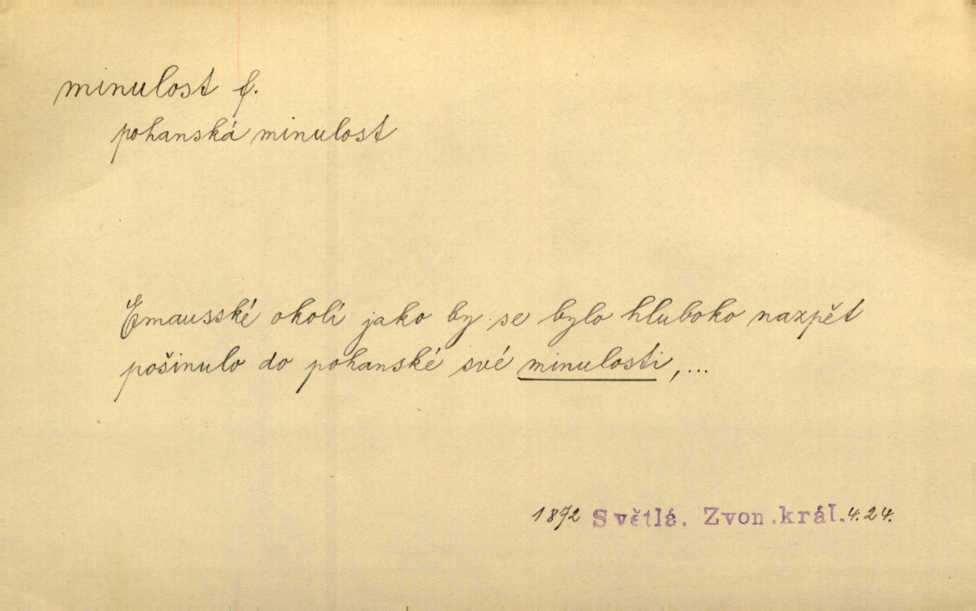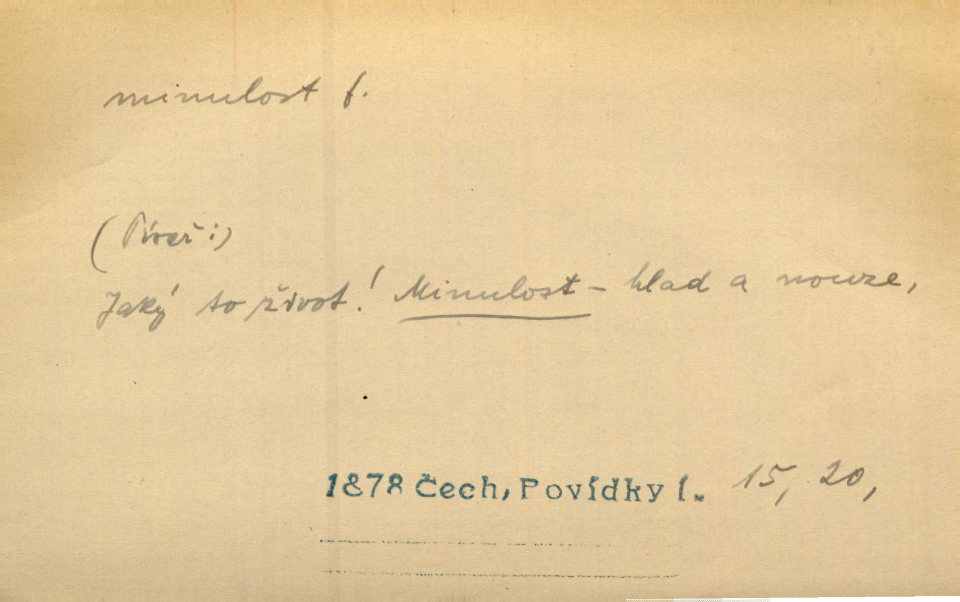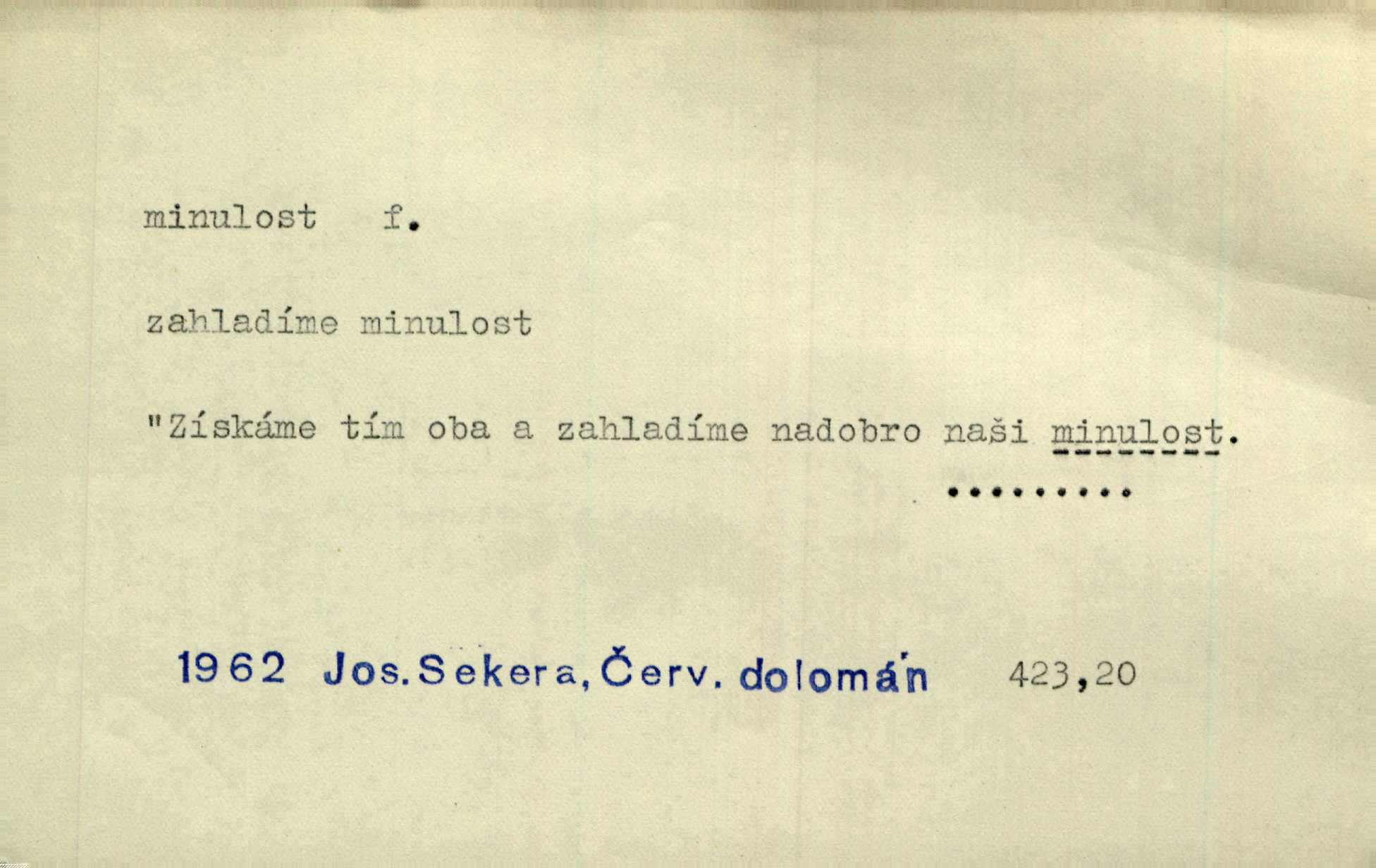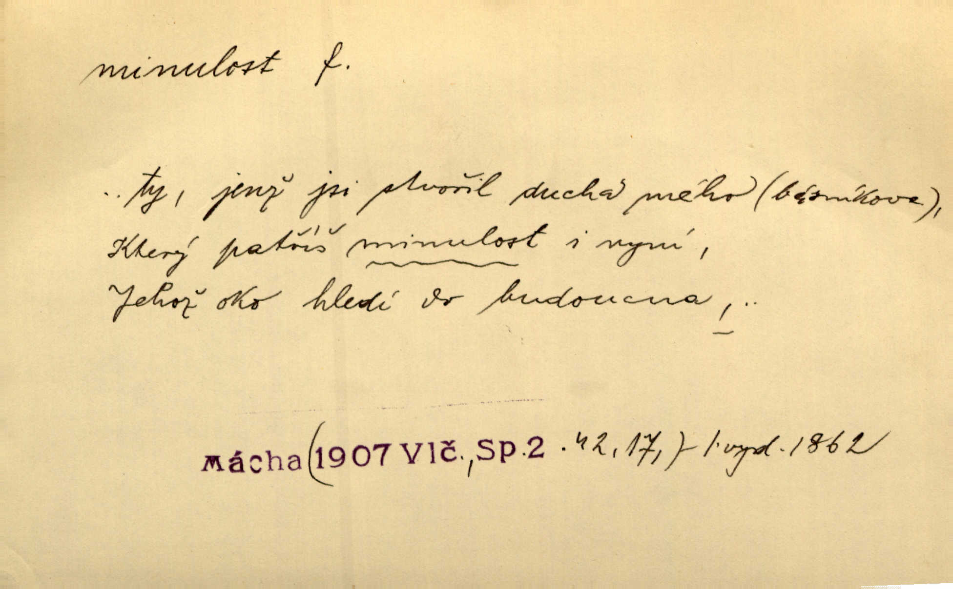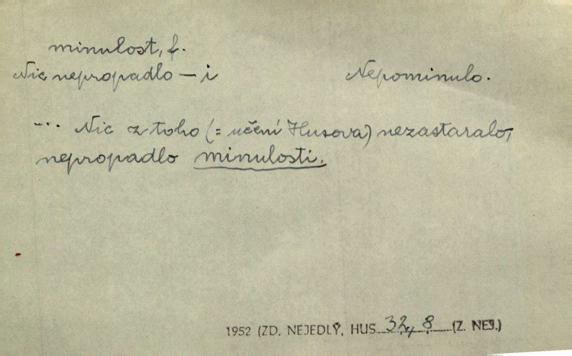 - minulost, -i f. minulá, uplynulá doba. Jen z minulosti jasně poznané dá se dobře poznat přítomnost. Durd. předvčerejšek zdá se mně být už šedou minulostí. Ner. Osm let, jeden rok stejný jako druhý, odešlo do minulosti. Šmil. I tato pleticha patří do minulosti pominula. Šmil. D Zvl. minulý život n. způsob života, minulé činy. Dívko, nechť minulost tvoje jakákoli, chci, bys byla mou. Zey. Má minulost byla velmi trudná. Sab. Propustili mne [žebráka na policii]‚ když se přesvědčili, že mám lepší minulost. Vach. Tvrdilo se, že je to [bratří Čapkové] pseudonym, za kterým se skrývá ruinovaný bankéř čili, jak se říká, člověk s minulostí se špatnou pověstí. Čap.