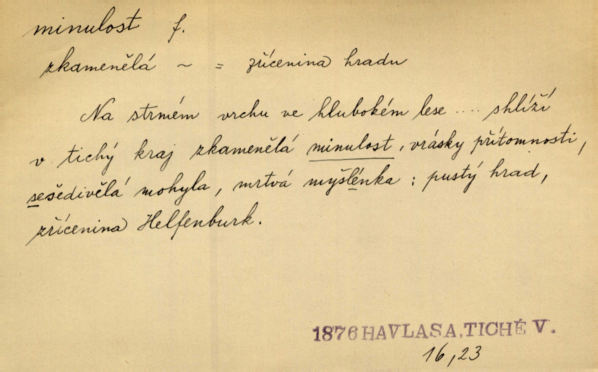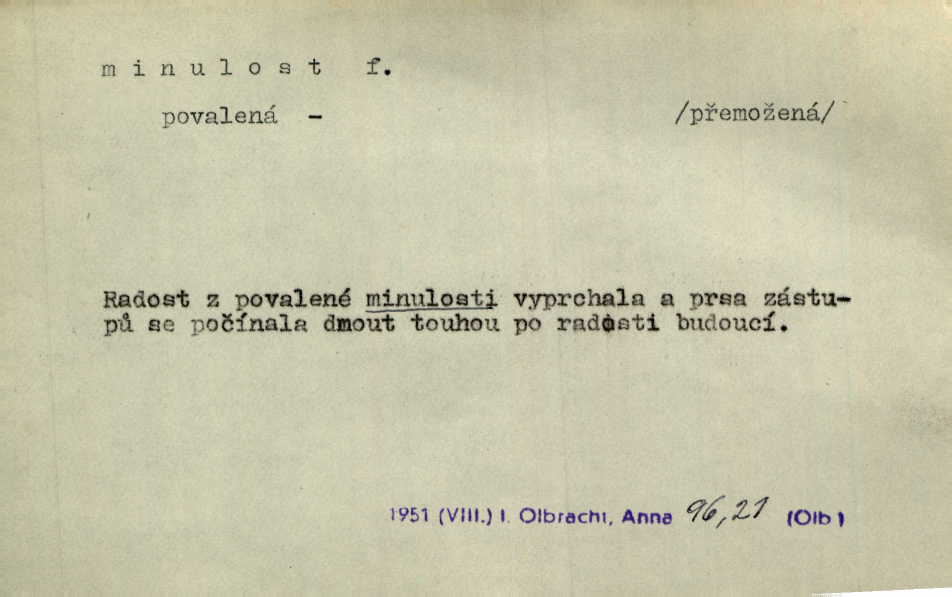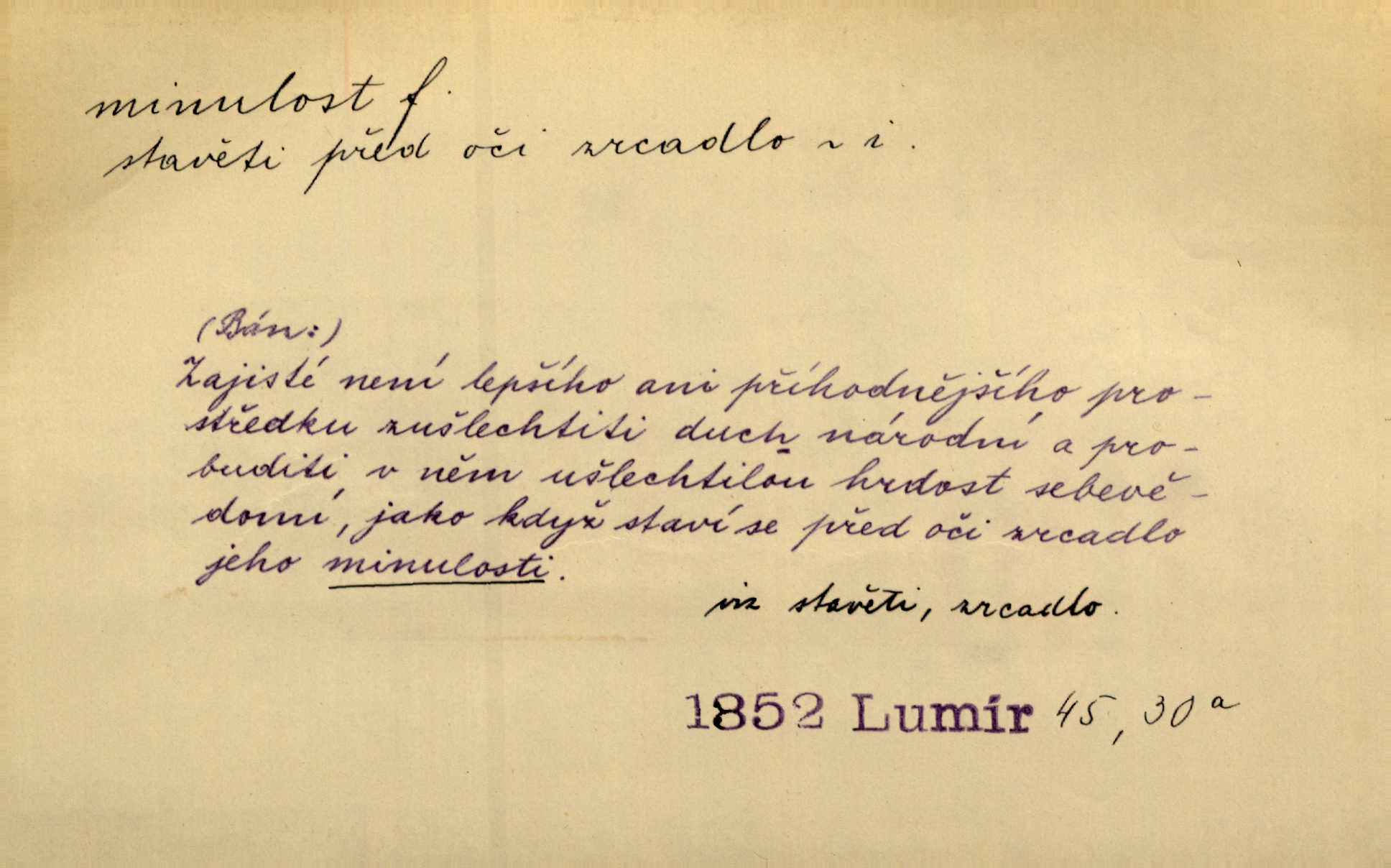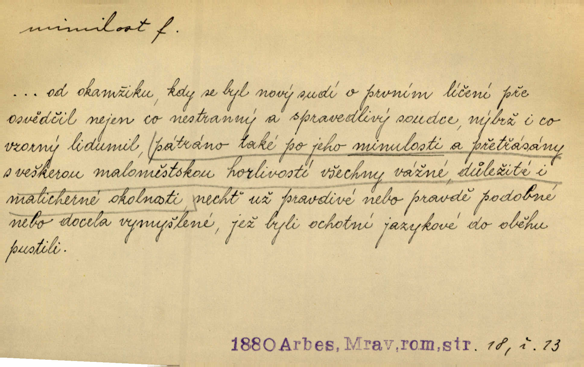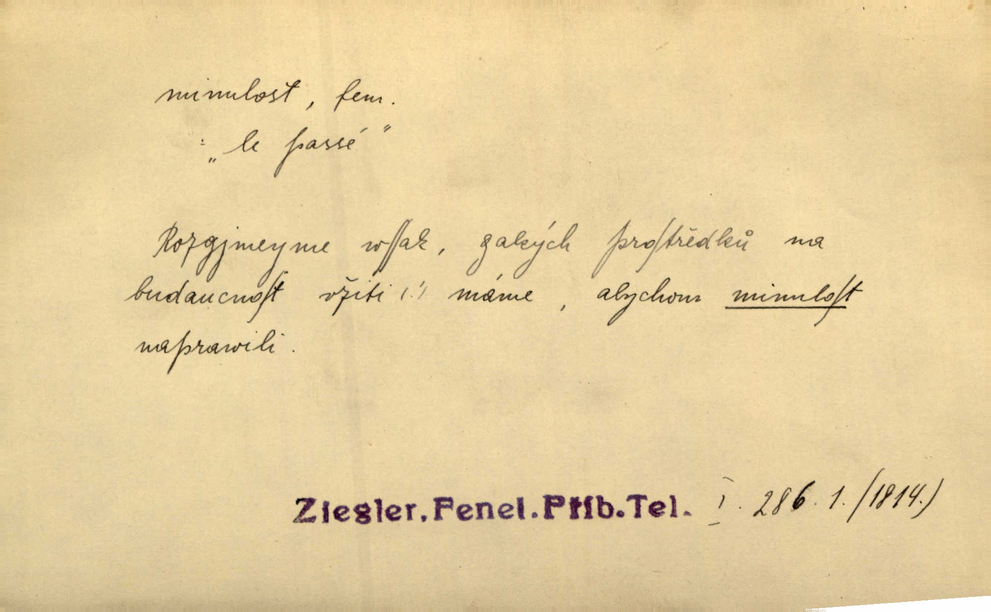 - minulost, -i f. minulá, uplynulá doba. Jen z minulosti jasně poznané dá se dobře poznat přítomnost. Durd. předvčerejšek zdá se mně být už šedou minulostí. Ner. Osm let, jeden rok stejný jako druhý, odešlo do minulosti. Šmil. I tato pleticha patří do minulosti pominula. Šmil. D Zvl. minulý život n. způsob života, minulé činy. Dívko, nechť minulost tvoje jakákoli, chci, bys byla mou. Zey. Má minulost byla velmi trudná. Sab. Propustili mne [žebráka na policii]‚ když se přesvědčili, že mám lepší minulost. Vach. Tvrdilo se, že je to [bratří Čapkové] pseudonym, za kterým se skrývá ruinovaný bankéř čili, jak se říká, člověk s minulostí se špatnou pověstí. Čap.