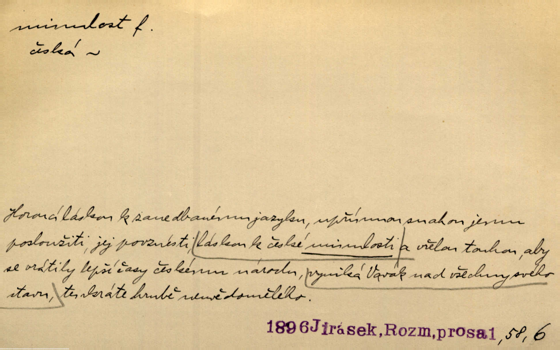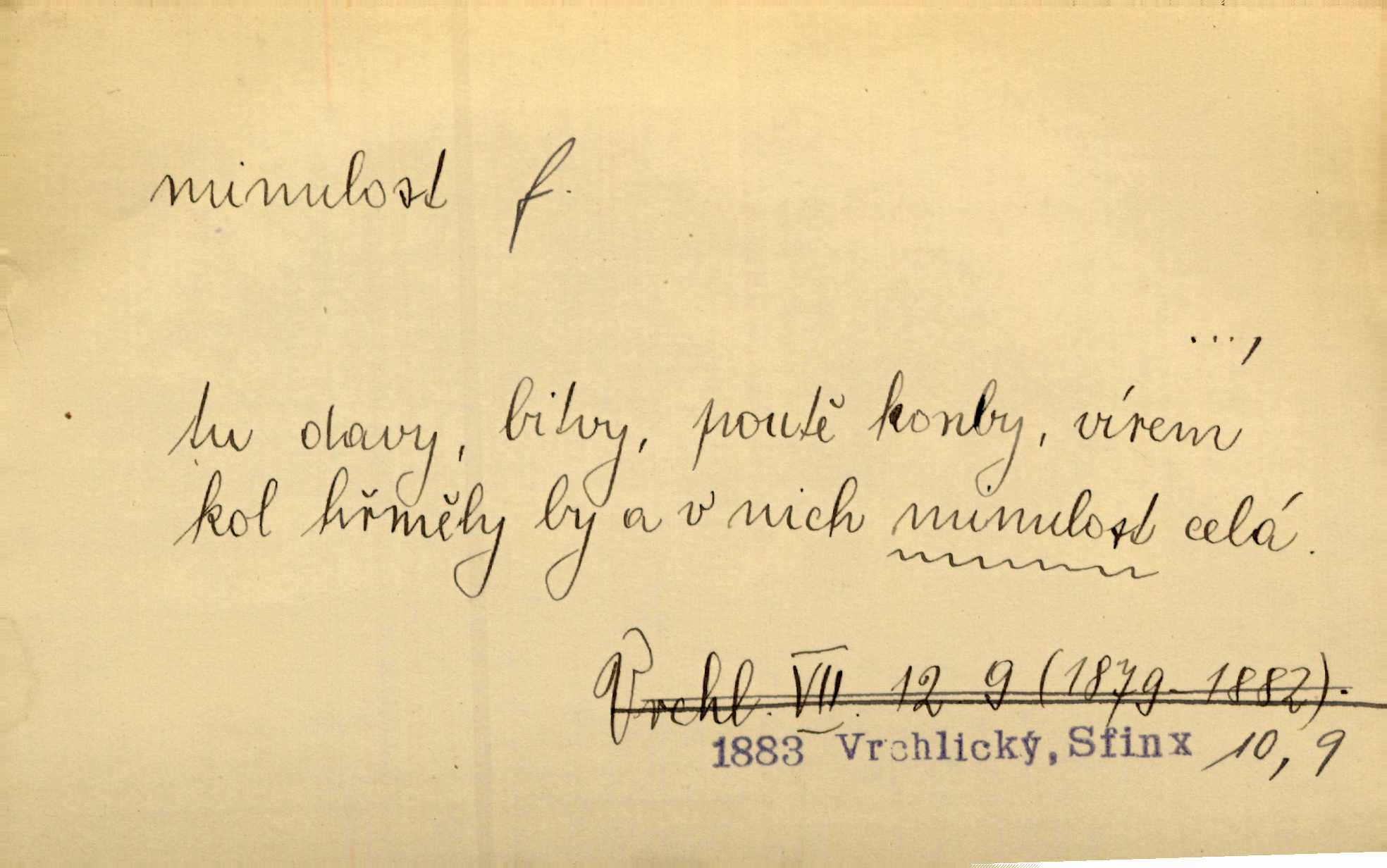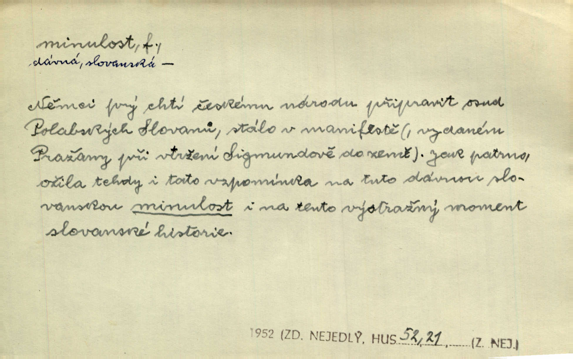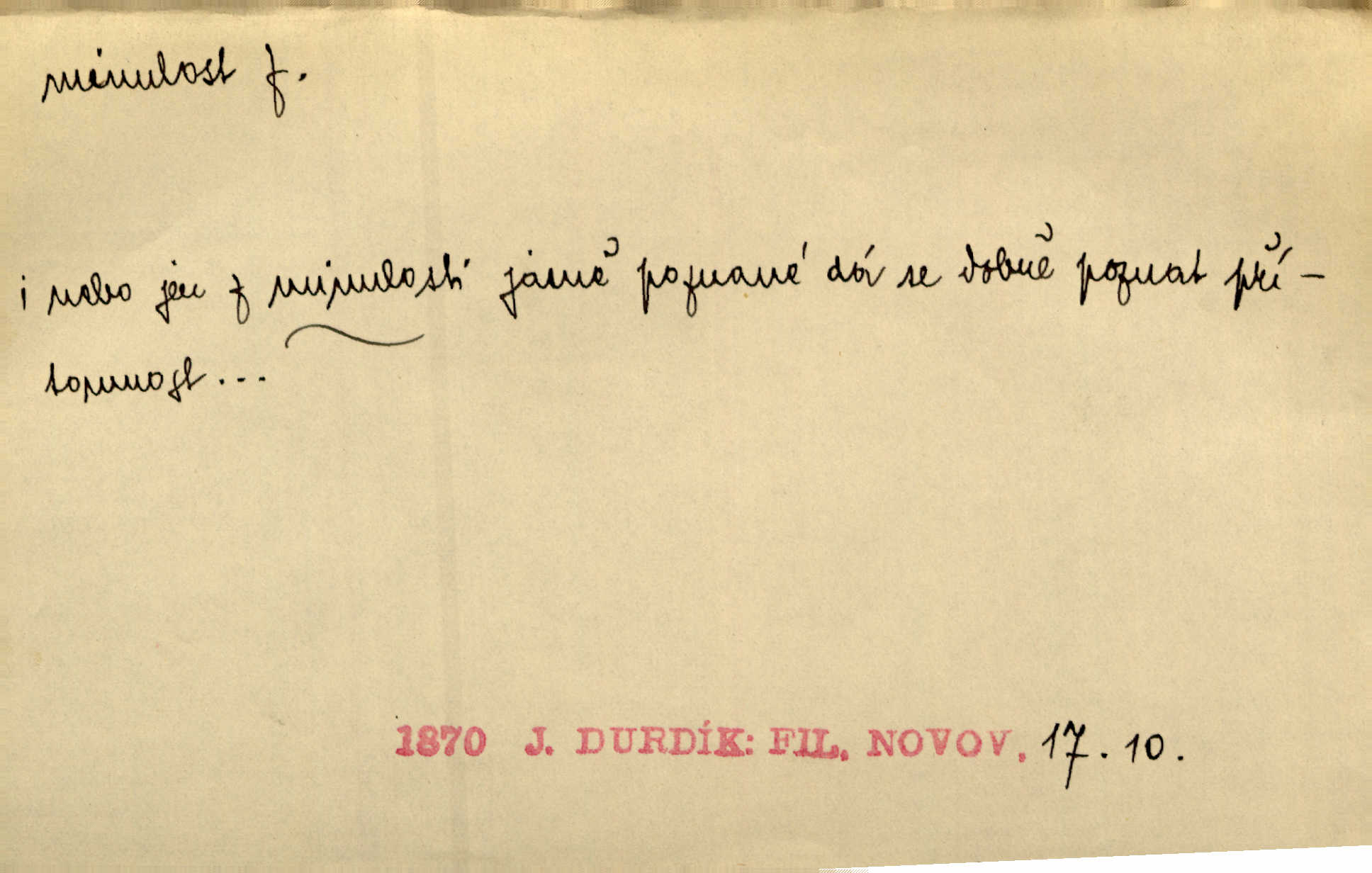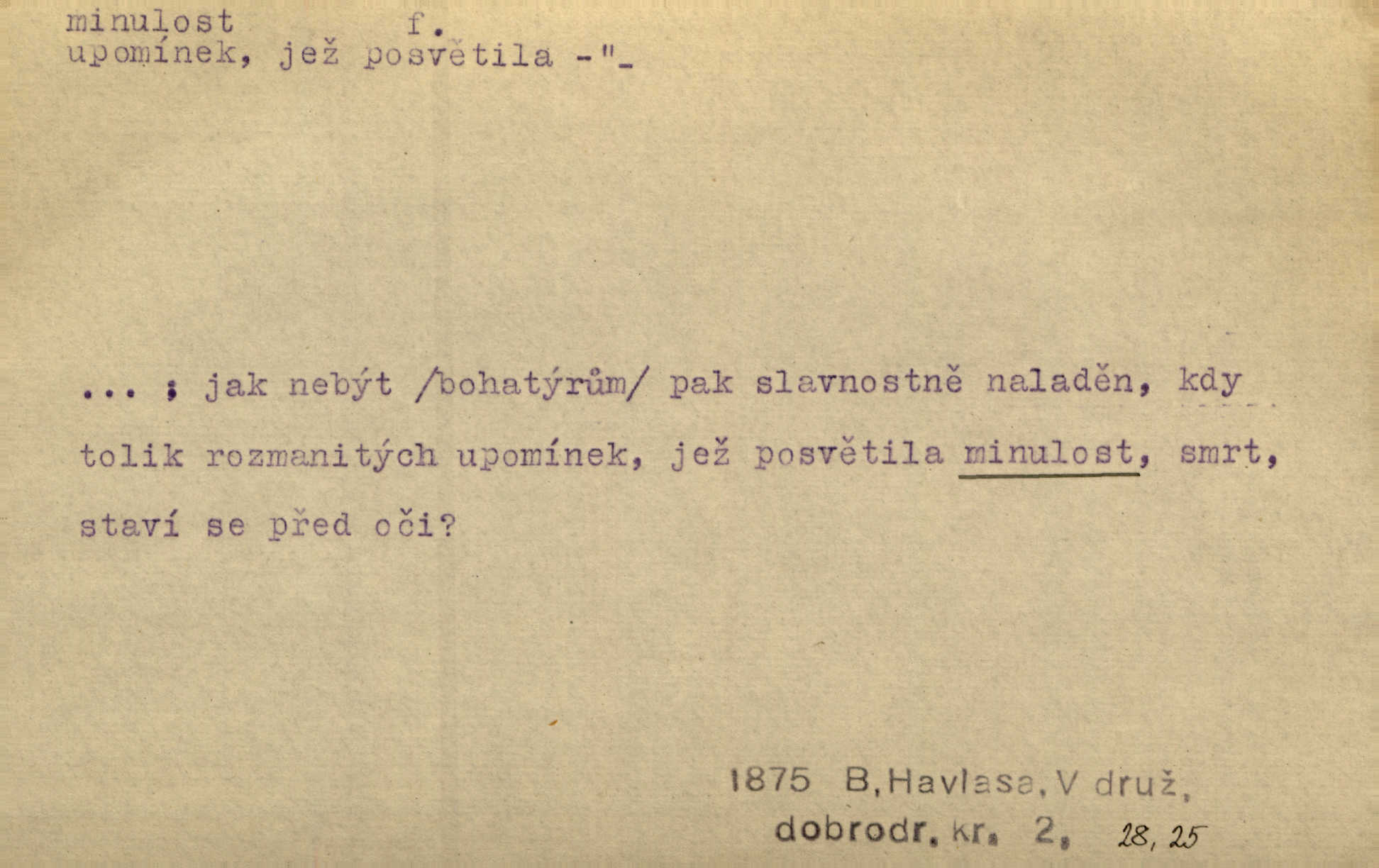 - minulost, -i f. minulá, uplynulá doba. Jen z minulosti jasně poznané dá se dobře poznat přítomnost. Durd. předvčerejšek zdá se mně být už šedou minulostí. Ner. Osm let, jeden rok stejný jako druhý, odešlo do minulosti. Šmil. I tato pleticha patří do minulosti pominula. Šmil. D Zvl. minulý život n. způsob života, minulé činy. Dívko, nechť minulost tvoje jakákoli, chci, bys byla mou. Zey. Má minulost byla velmi trudná. Sab. Propustili mne [žebráka na policii]‚ když se přesvědčili, že mám lepší minulost. Vach. Tvrdilo se, že je to [bratří Čapkové] pseudonym, za kterým se skrývá ruinovaný bankéř čili, jak se říká, člověk s minulostí se špatnou pověstí. Čap.