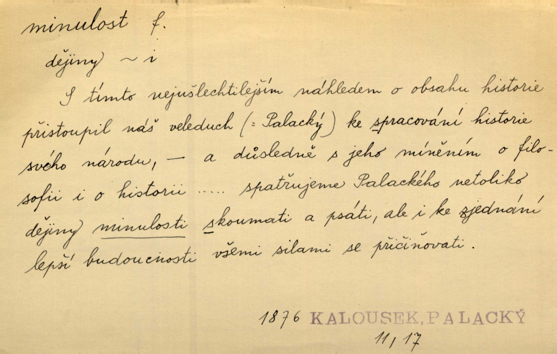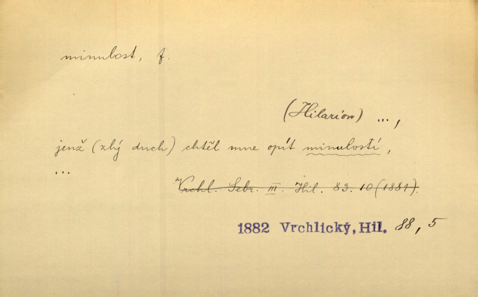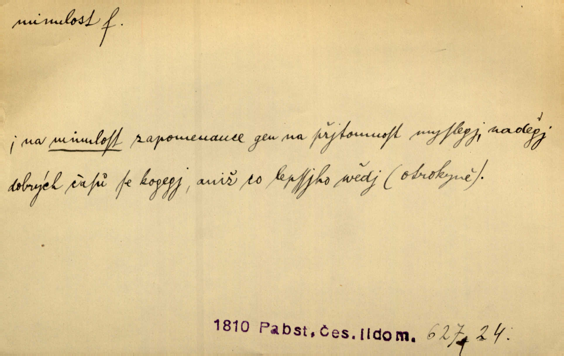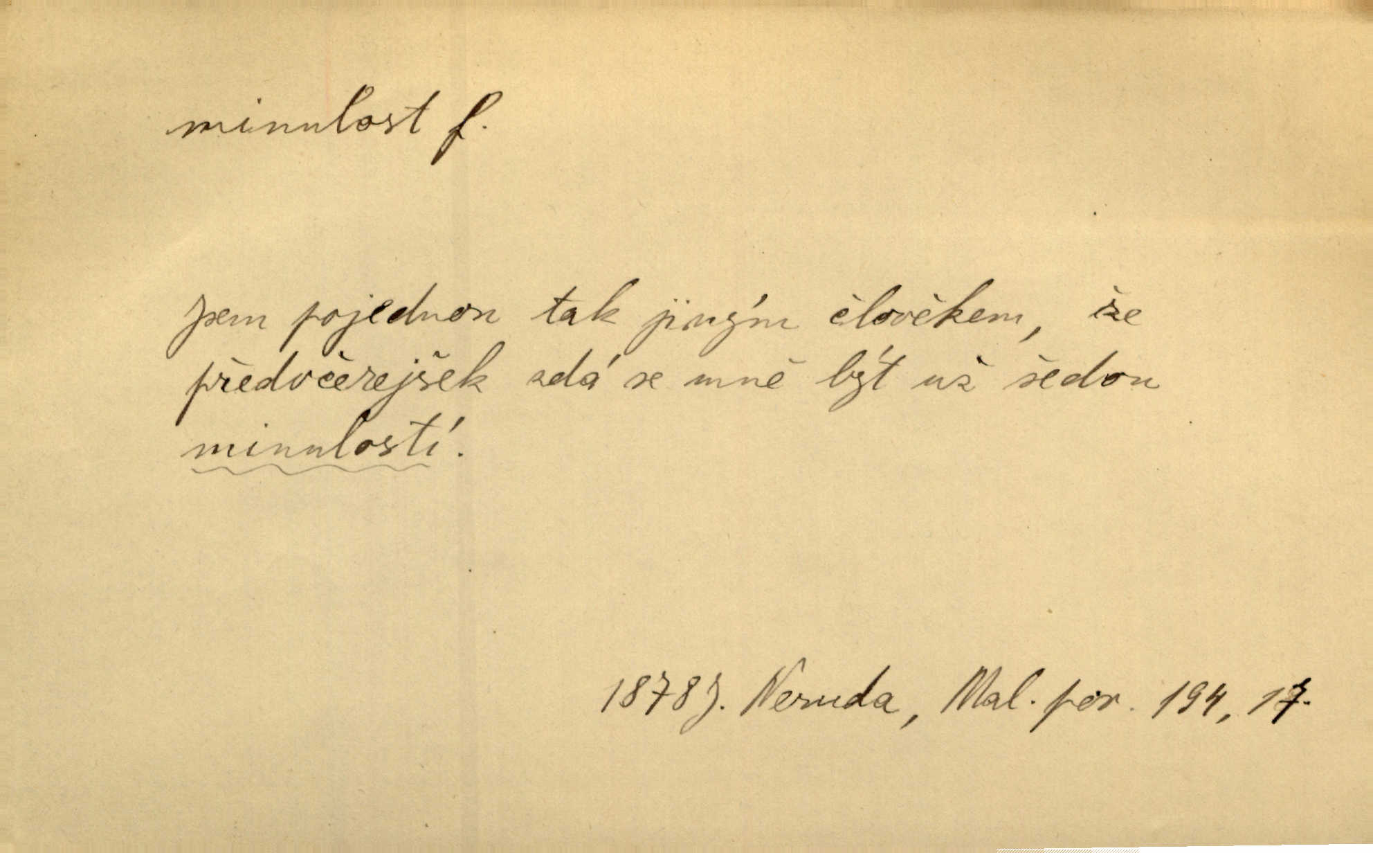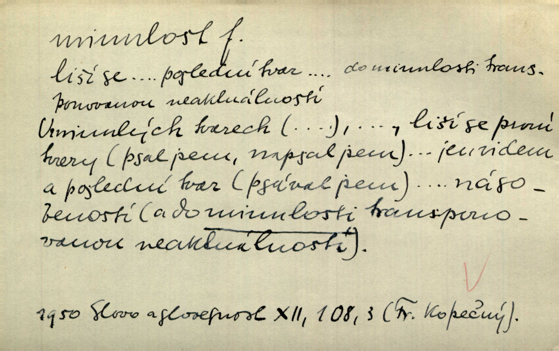 - minulost, -i f. minulá, uplynulá doba. Jen z minulosti jasně poznané dá se dobře poznat přítomnost. Durd. předvčerejšek zdá se mně být už šedou minulostí. Ner. Osm let, jeden rok stejný jako druhý, odešlo do minulosti. Šmil. I tato pleticha patří do minulosti pominula. Šmil. D Zvl. minulý život n. způsob života, minulé činy. Dívko, nechť minulost tvoje jakákoli, chci, bys byla mou. Zey. Má minulost byla velmi trudná. Sab. Propustili mne [žebráka na policii]‚ když se přesvědčili, že mám lepší minulost. Vach. Tvrdilo se, že je to [bratří Čapkové] pseudonym, za kterým se skrývá ruinovaný bankéř čili, jak se říká, člověk s minulostí se špatnou pověstí. Čap.