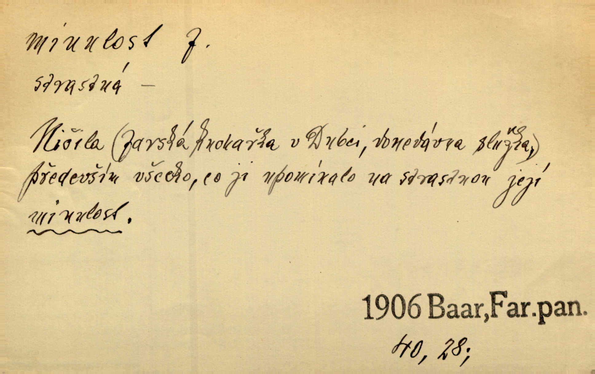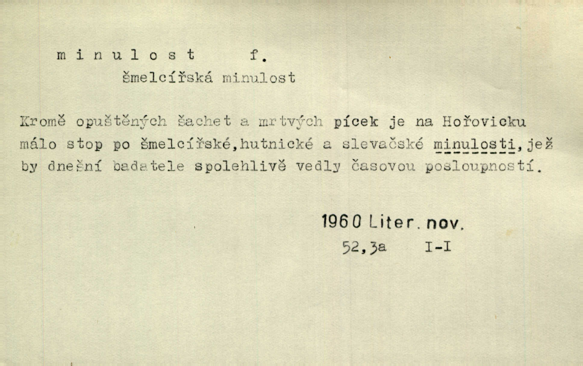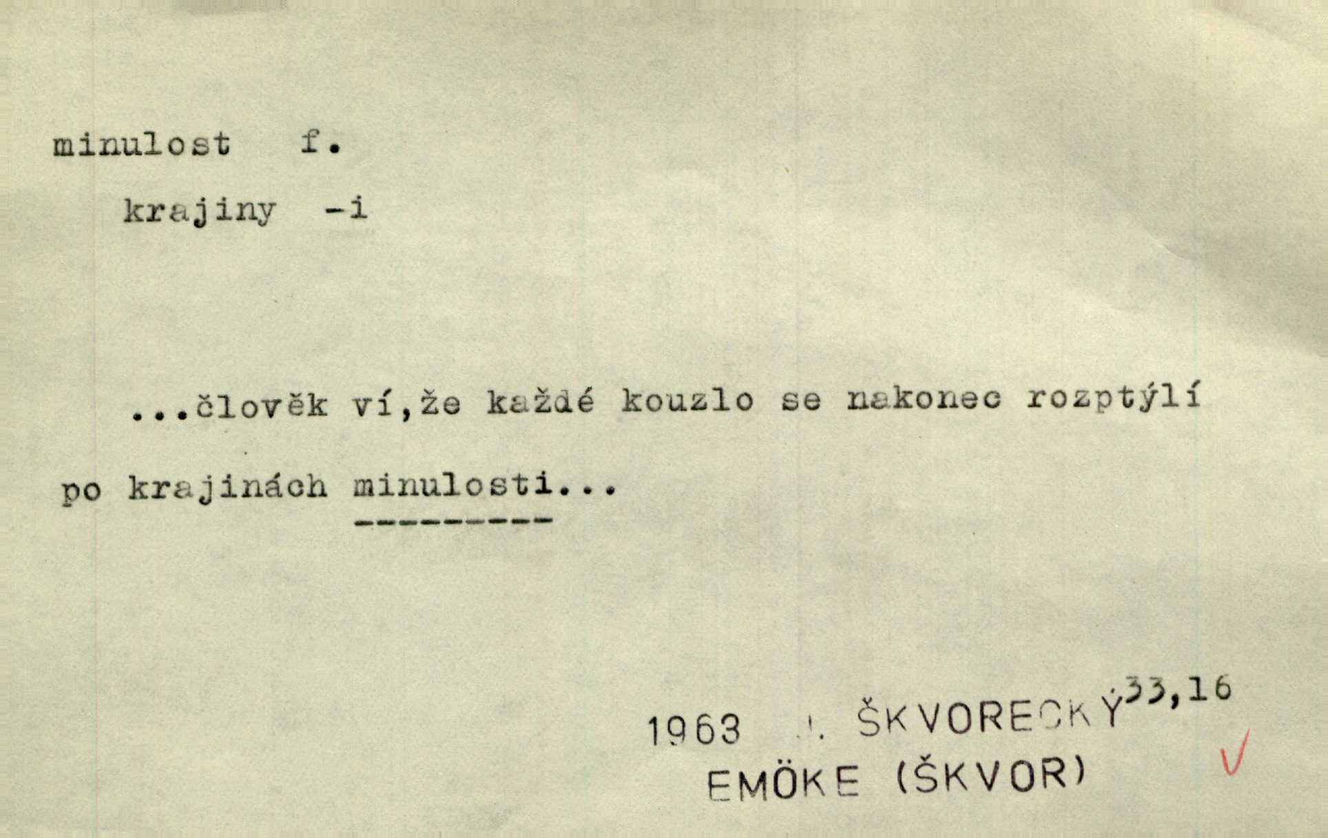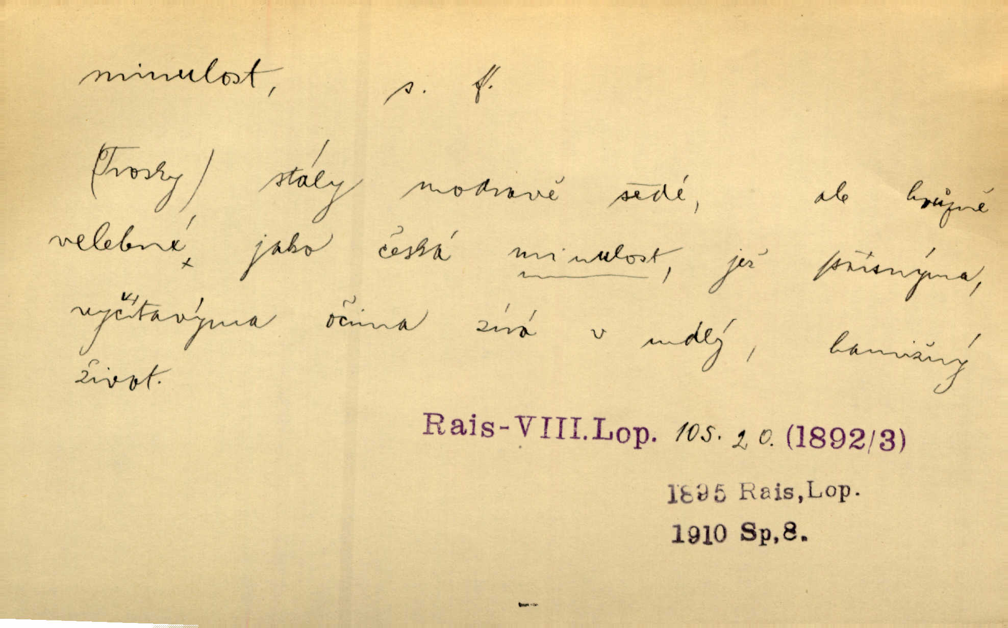 - minulost, -i f. minulá, uplynulá doba. Jen z minulosti jasně poznané dá se dobře poznat přítomnost. Durd. předvčerejšek zdá se mně být už šedou minulostí. Ner. Osm let, jeden rok stejný jako druhý, odešlo do minulosti. Šmil. I tato pleticha patří do minulosti pominula. Šmil. D Zvl. minulý život n. způsob života, minulé činy. Dívko, nechť minulost tvoje jakákoli, chci, bys byla mou. Zey. Má minulost byla velmi trudná. Sab. Propustili mne [žebráka na policii]‚ když se přesvědčili, že mám lepší minulost. Vach. Tvrdilo se, že je to [bratří Čapkové] pseudonym, za kterým se skrývá ruinovaný bankéř čili, jak se říká, člověk s minulostí se špatnou pověstí. Čap.