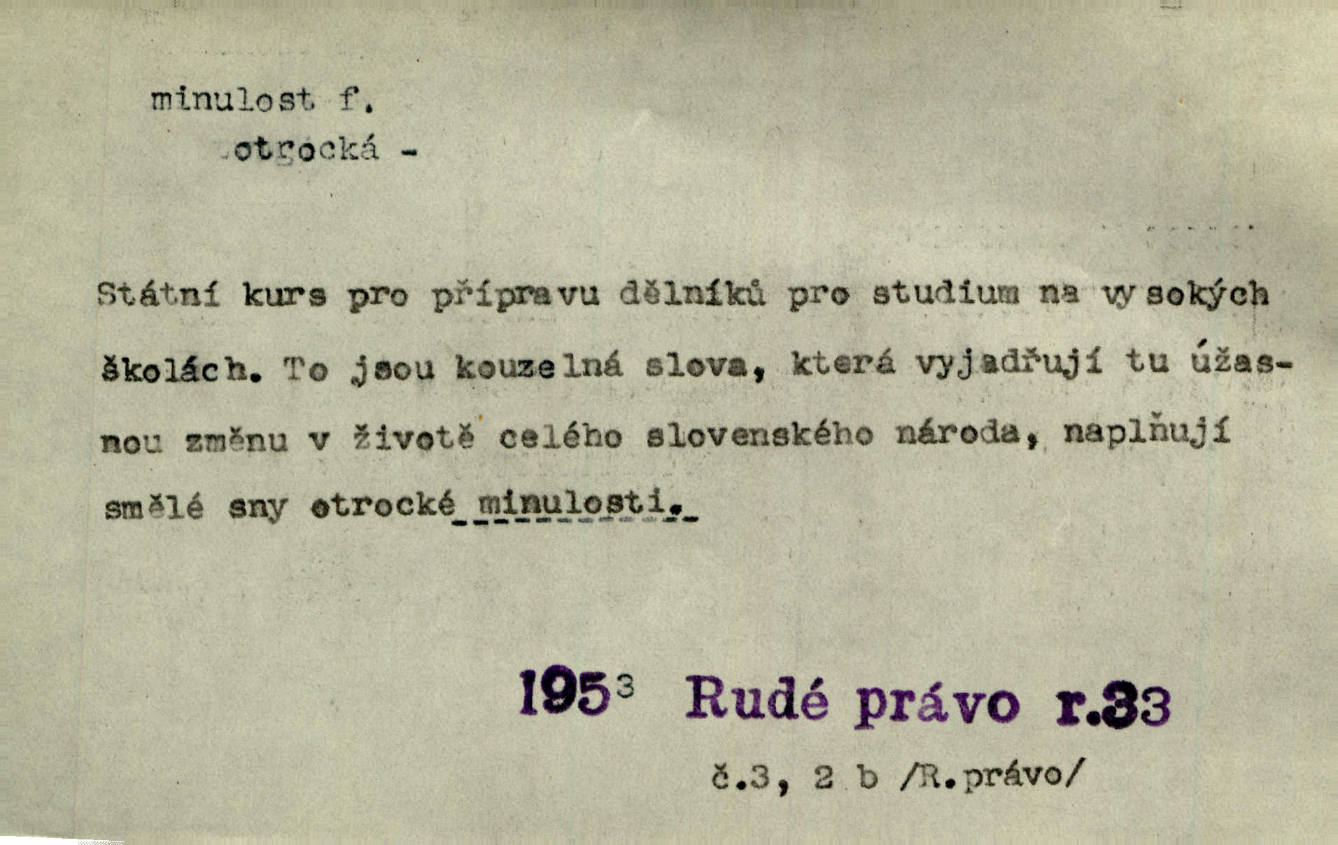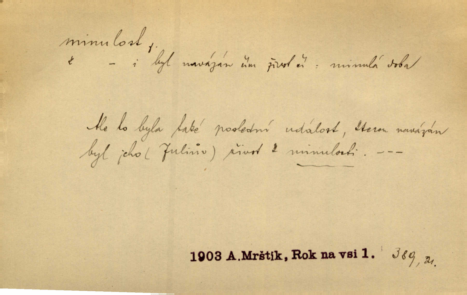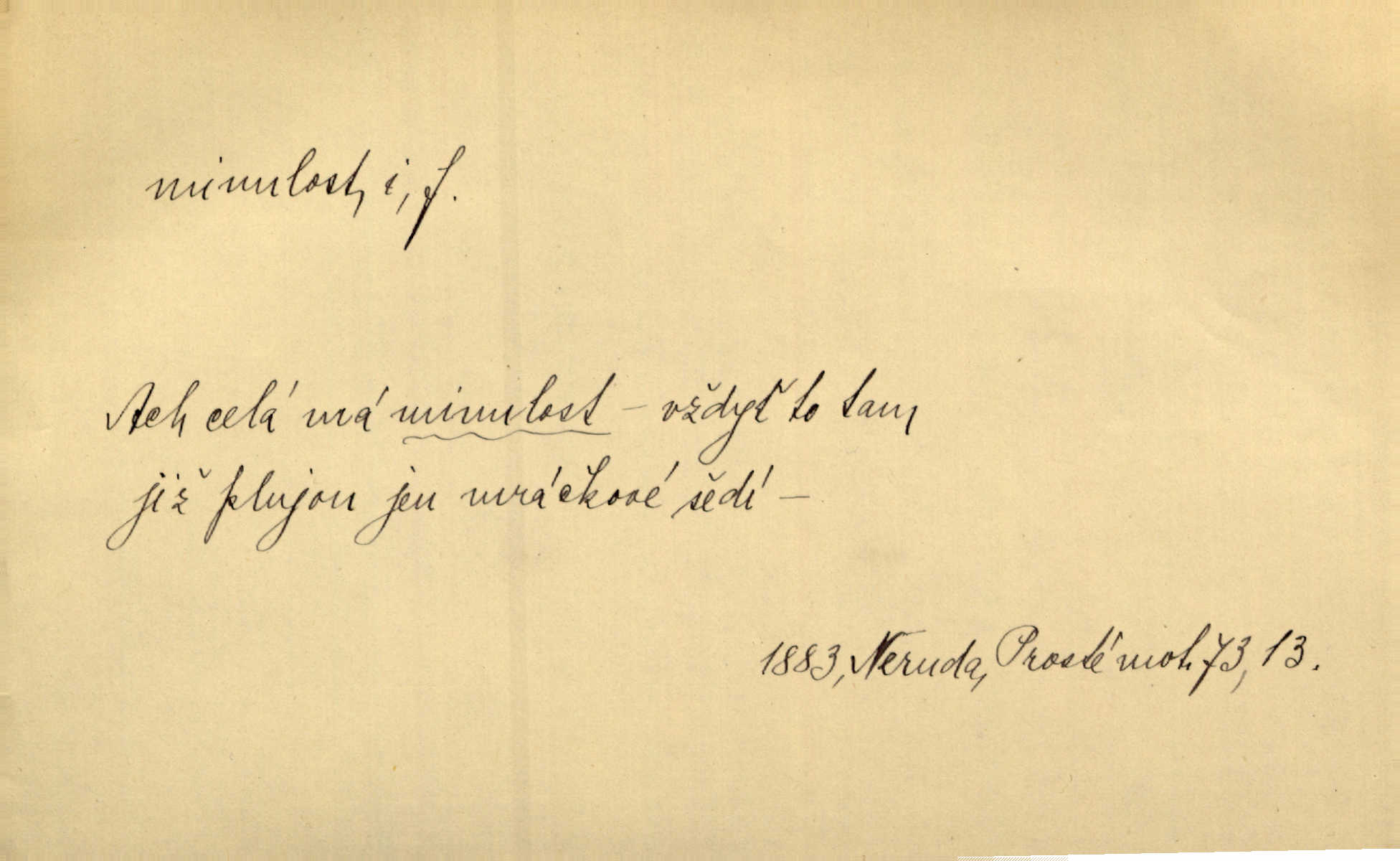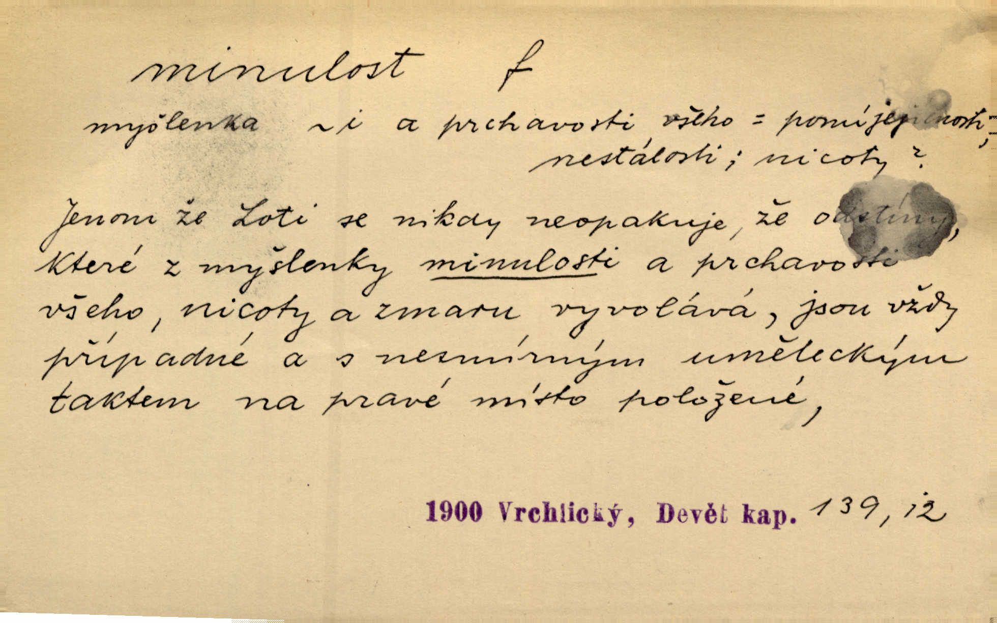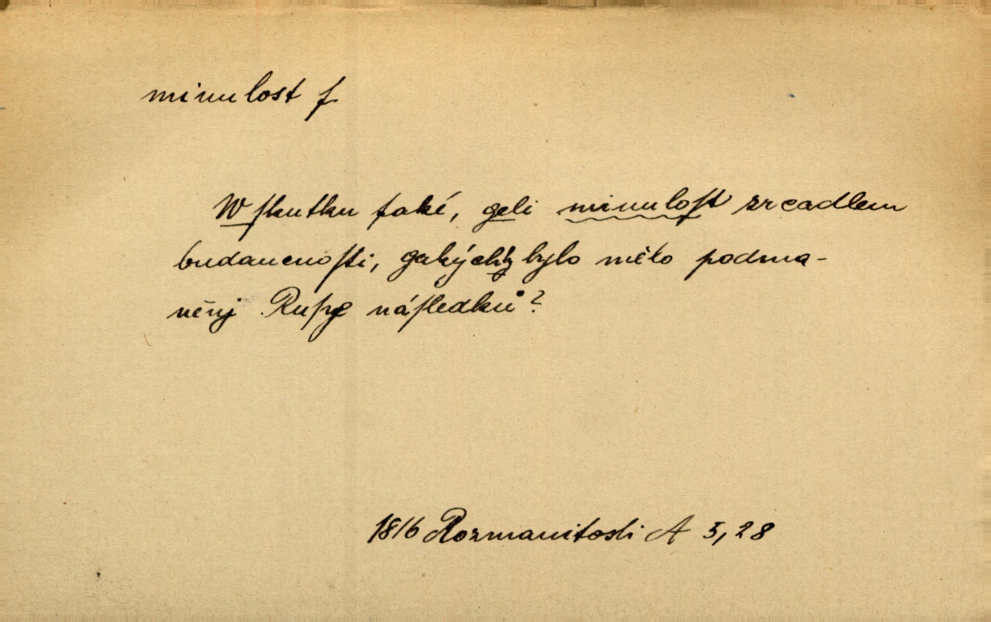 - minulost, -i f. minulá, uplynulá doba. Jen z minulosti jasně poznané dá se dobře poznat přítomnost. Durd. předvčerejšek zdá se mně být už šedou minulostí. Ner. Osm let, jeden rok stejný jako druhý, odešlo do minulosti. Šmil. I tato pleticha patří do minulosti pominula. Šmil. D Zvl. minulý život n. způsob života, minulé činy. Dívko, nechť minulost tvoje jakákoli, chci, bys byla mou. Zey. Má minulost byla velmi trudná. Sab. Propustili mne [žebráka na policii]‚ když se přesvědčili, že mám lepší minulost. Vach. Tvrdilo se, že je to [bratří Čapkové] pseudonym, za kterým se skrývá ruinovaný bankéř čili, jak se říká, člověk s minulostí se špatnou pověstí. Čap.