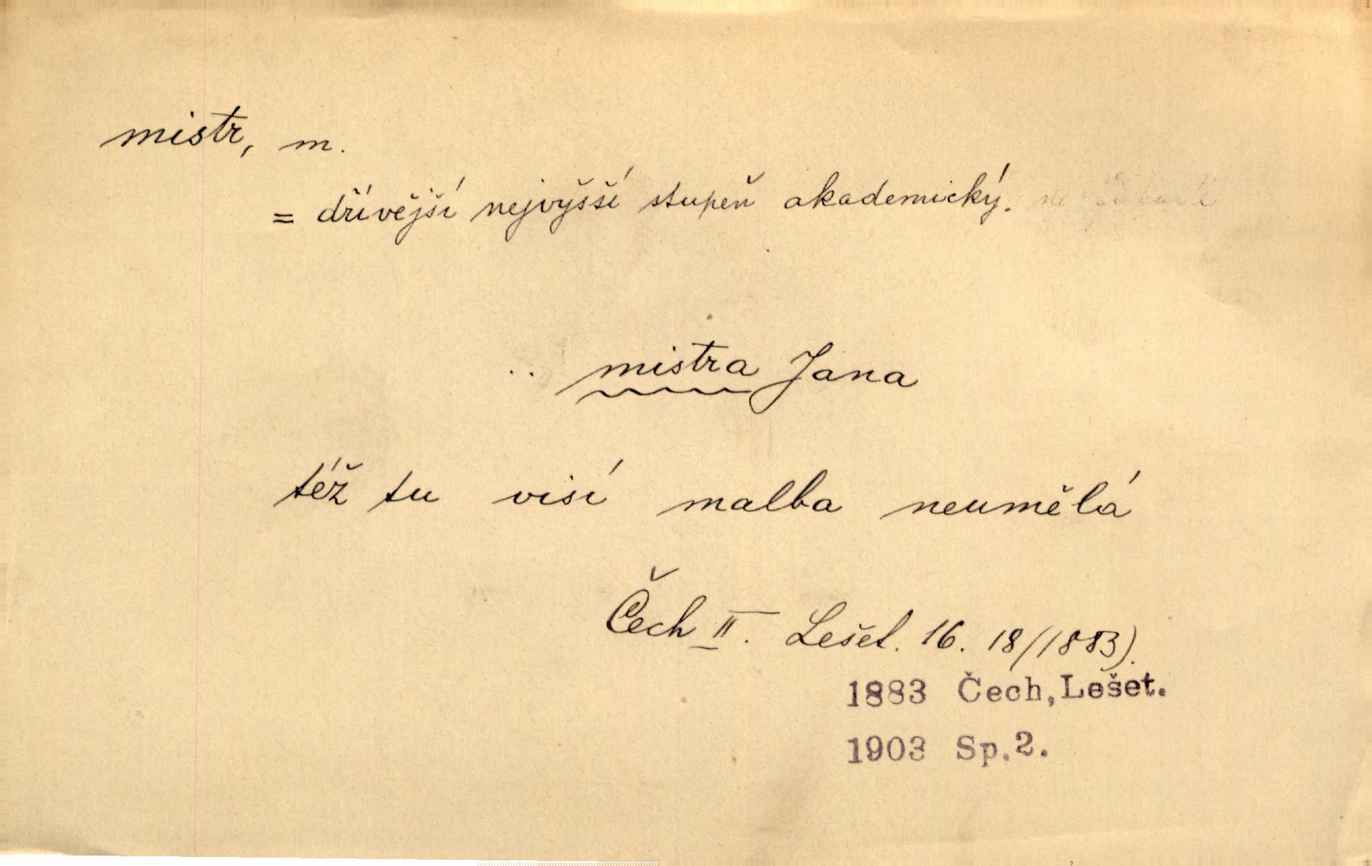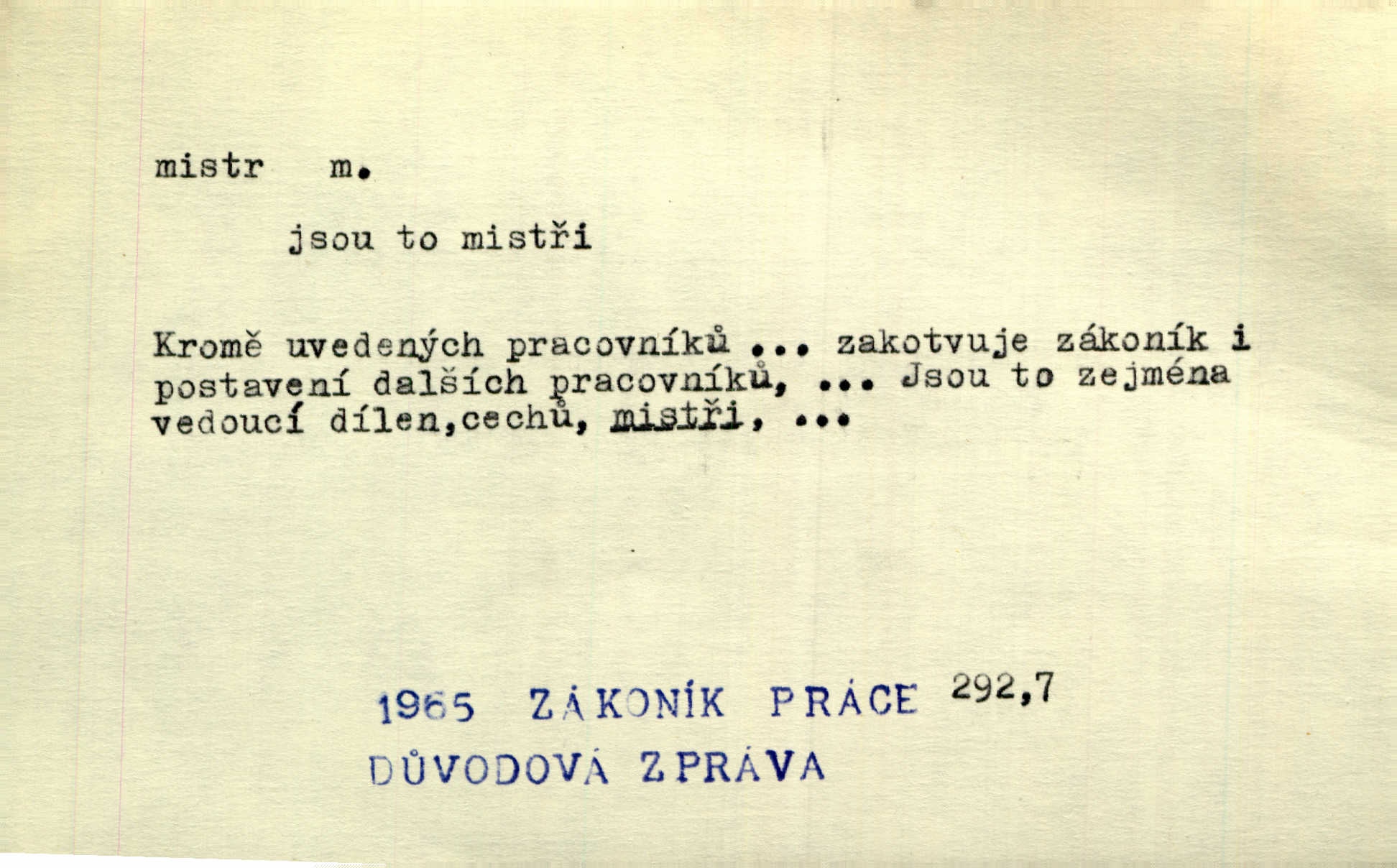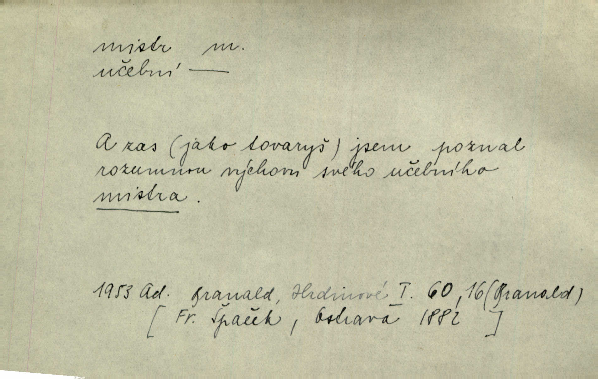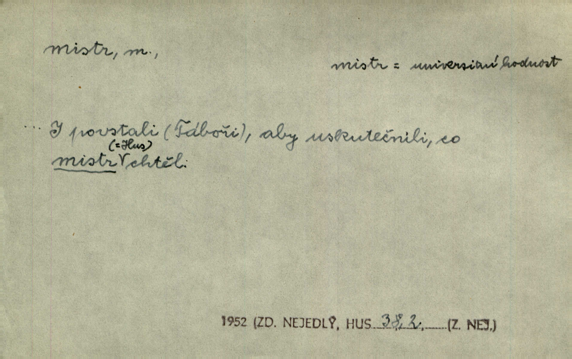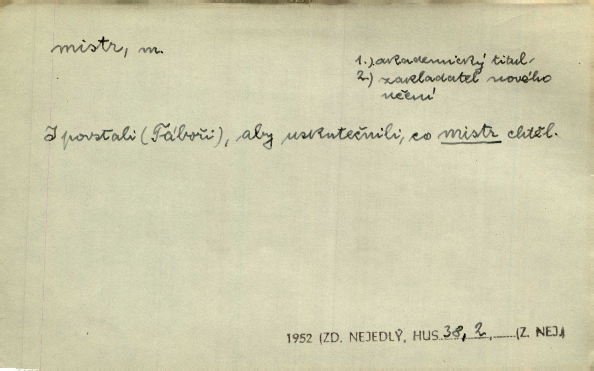 - mistr, -a m. řemeslník oprávněný vykonávati samostatně řemeslo. [Borek] vstoupil do učení k zednickému mistru. Maj. „Jste, starosto, moudrý muž. Ale i mistr tesař se utne.“ Šmil. Mistr Kondelík! Skoro celá Praha ví od nedávna, že je to malíř pokojů. Ale ne nějaký zcela obyčejný hudlař. Herrm. Mistr popravčí není osobně zlý a nepřívětivý člověk, ó nikoliv; plní jen svou povinnost a jeho svědomí je čisté. K. Čap. D dílovedoucí v továrnách, přední dělník. Otec byl mistrem v brněnské jedné továrně. V. Mrš. Žel. staniční, návěštní, telegrafní mistr. D znalec, odborník. Každý [z tovaryšů] měl vykázaný obor své práce. Ten šil jen kalhoty, ten rukávy do kabátů všíval, ten byl mistr na vesty. Her. Nebyl valný mistr v kartách. Jir. [Usedlí mužové] jsou trochu neohební v rozmluvách s dámami: na to jsou mistři páni poručíkové. Havl. To jim je mistr na klavír, toho zvou všude. Jir. Ukázal, že je mistrem svého jazyka dokonalým. Vrch. Co hmatů v lepké hlíně mistr dláta se nazkouší, než v sličném vása tvaru se z jeví oku? sochař. Vrch. Mistr tónů hudební skladatel. Vrch. [Nakladatelství nezapomínalo] ani na staré a starší mistry pera spisovatele. Přít. D čestný titul, název pro vynikající umělce. „Nám umělcům se neříká pan mistr, nýbrž toliko mistr, bez pan.“ Čap. Ch. [K Al. Jiráskovi:] Mistře! Vy ji lépe znáte, naši Prahu. Klášt. Volné tyto studie vznikly na podnět mistra Nerudy. Vrch. Dílo to [obraz] zajisté pravého francouzského mistra. Jir. Staré rytiny francouzských mistrů. Jir. Též titul vynikajících sportovců. Mistr světa v boxu, v lehké atletice a j. D autor, původce, tvůrce vynikajícího díla literárního n. uměleckého. Spis tento mistra svého nezapře. Tyl. Ten, kdo byl jejich [kreseb] mistrem, prošel školou nejpřísnější kázně. R. Svob. D učitel, hlava n. vůdce skupiny, školy, směru. Tak bylo jemu [Dantovi]‚ jejž ctím mistrem svým. Vrch. [Němci] Rusům za hlavní vinu to pokládají, čemu je sami naučili a v čem se ještě posavad žákové svým mistrům ani nevyrovnali. Havl. Taneční mistr. Baletní mistr cvičitel baletu v divadle. Koncertní mistr přední vedoucí hráč na některý nástroj (zvl. housle a cello) v orchestru. D o Kristu, zvláště v poměru k apoštolům. Petr, ač by rád byl koláče jedl, také se děkoval, připomínaje si mistrův zákaz. Něm. D akademická hodnost středověká. Se šťastným humorem, ironií proloženým, popisuje nám [básník] mistry v kolleji. Havl. Učení Mistra Jana Husi. Rais.