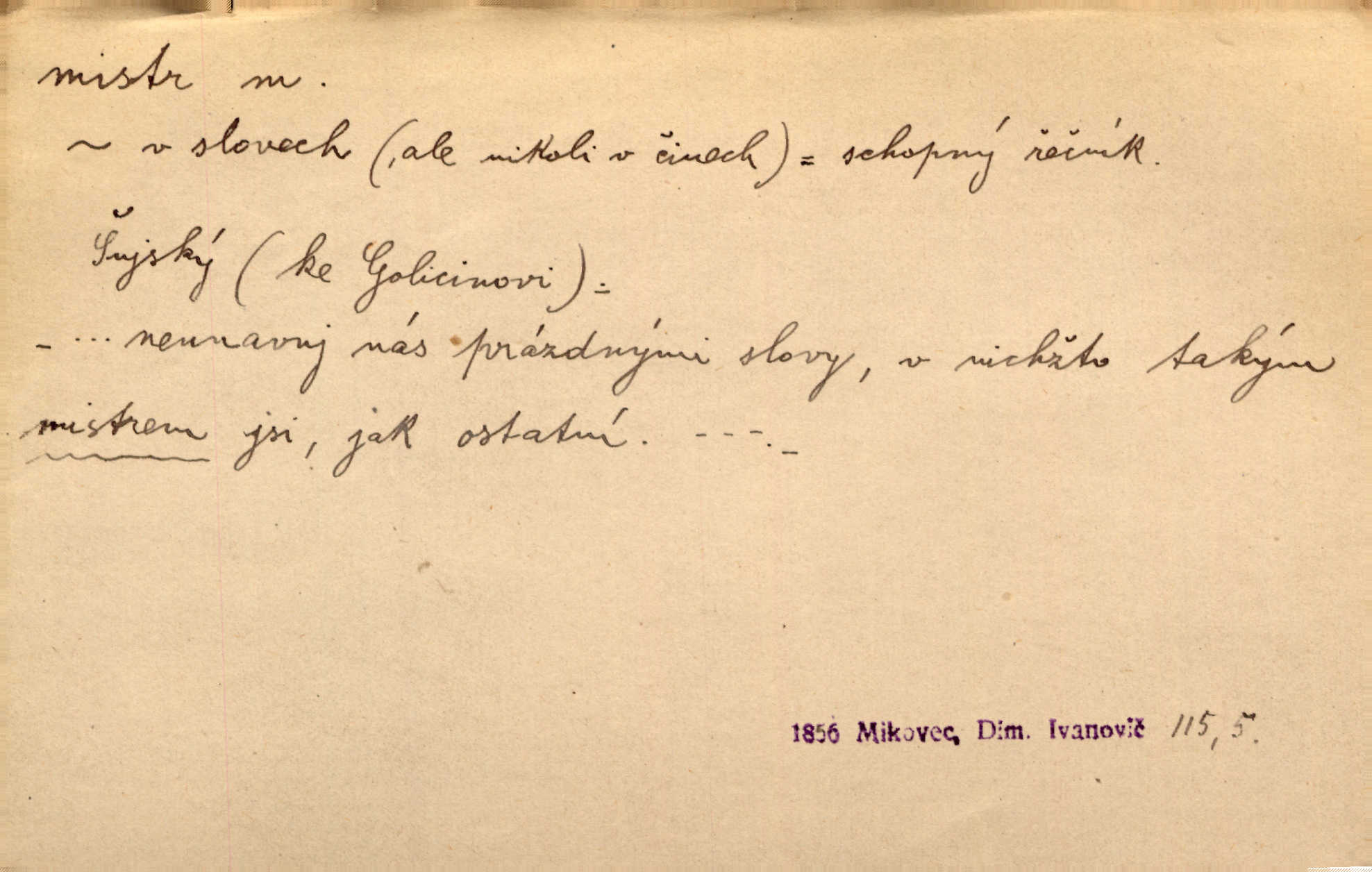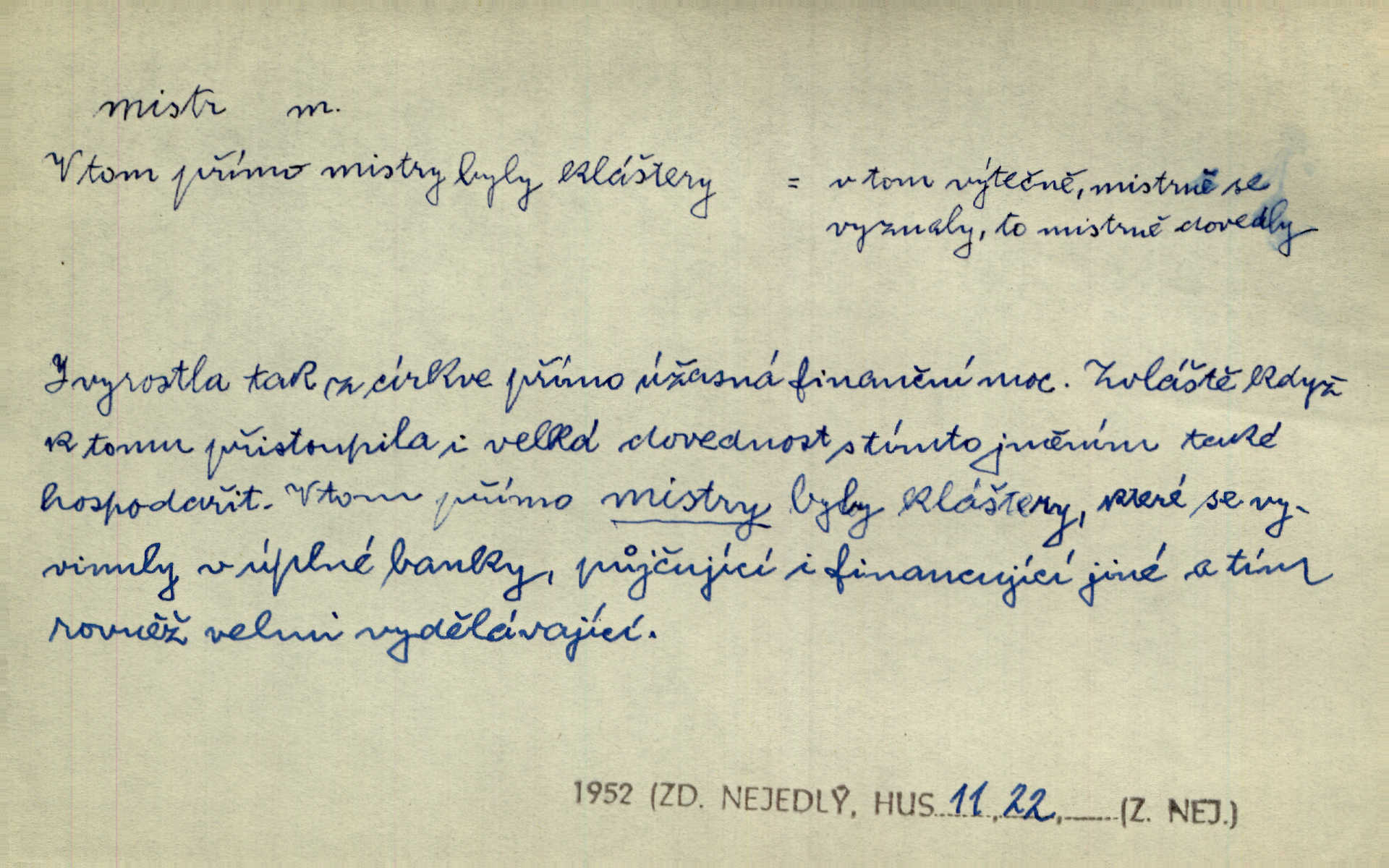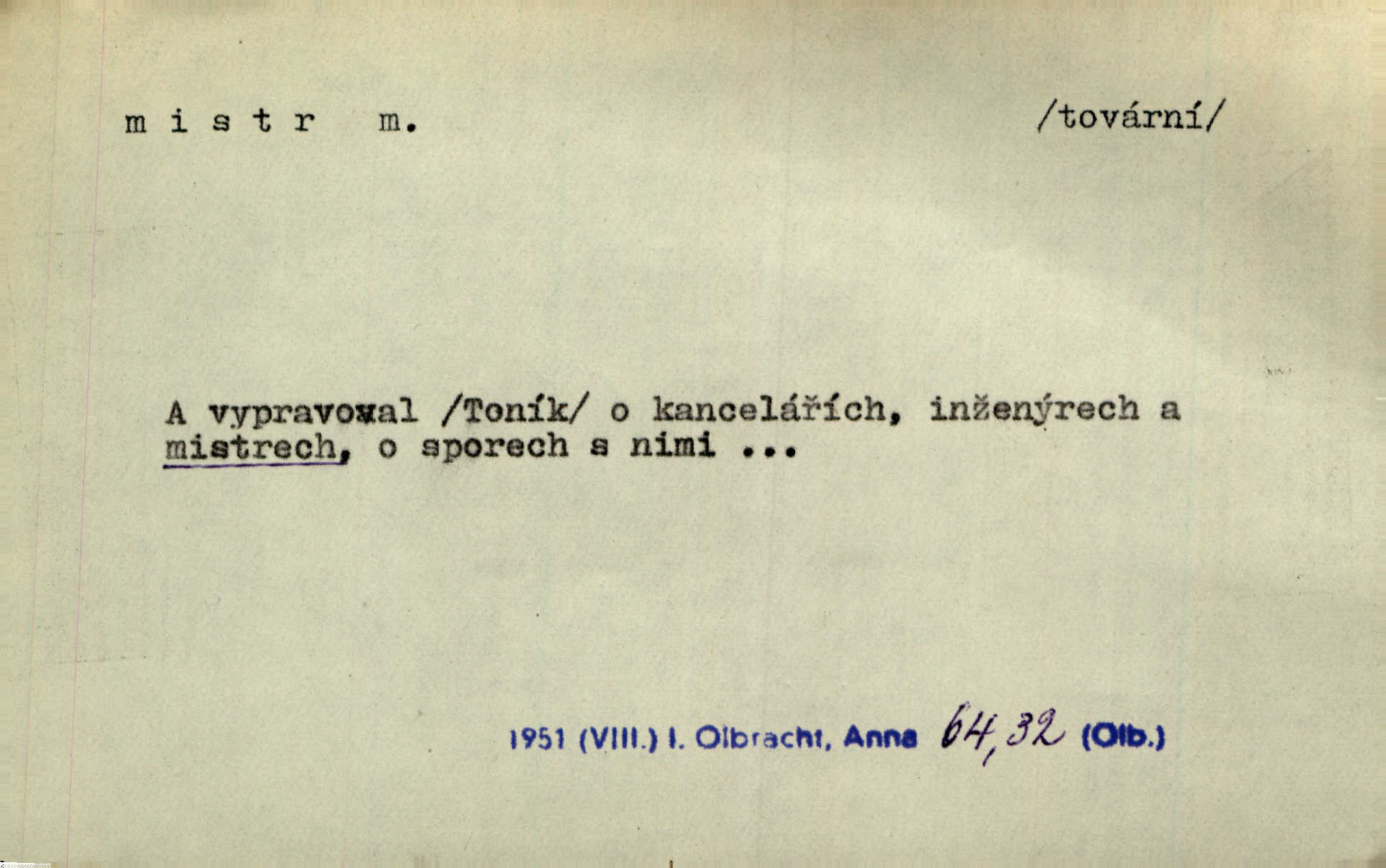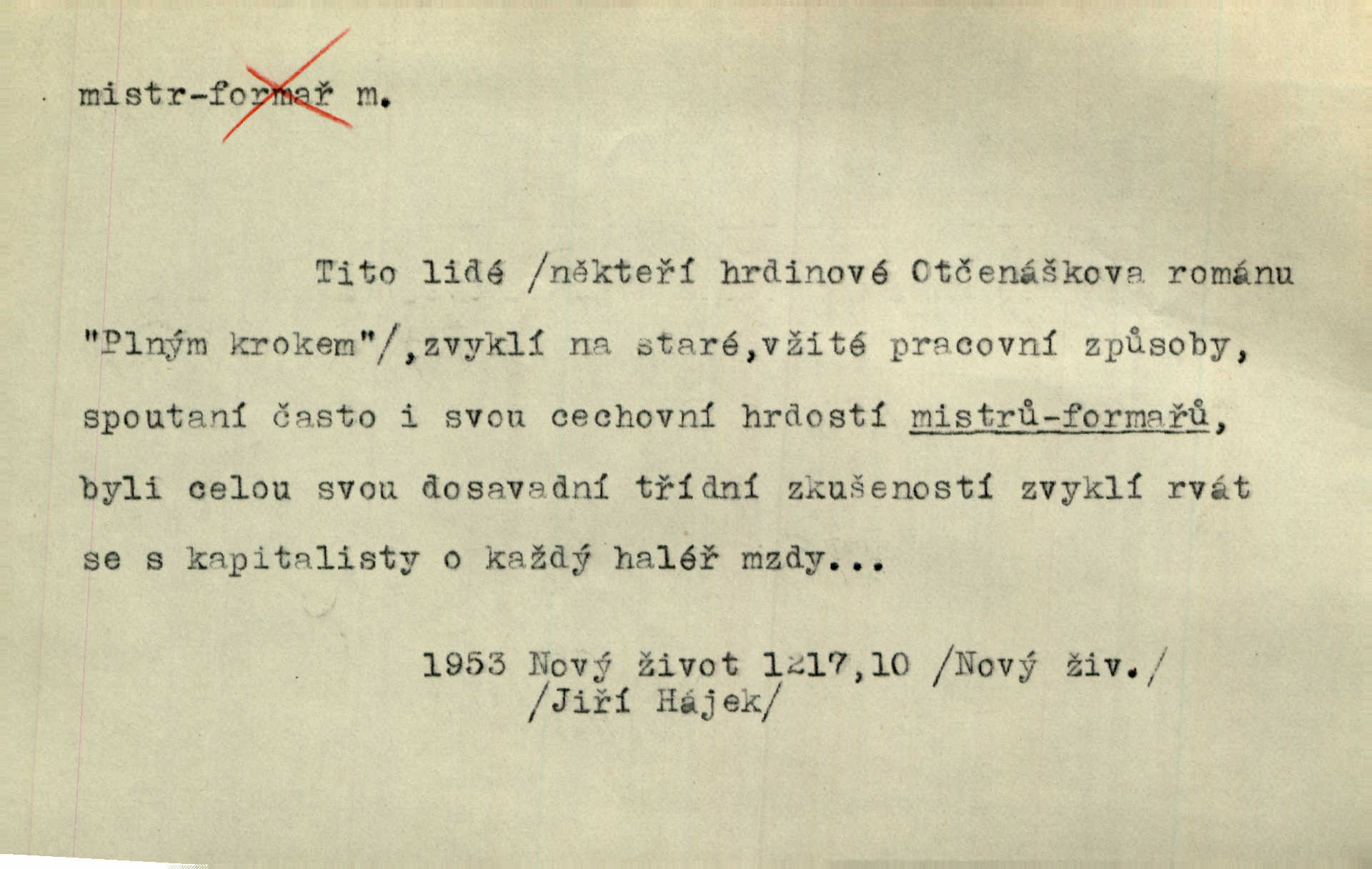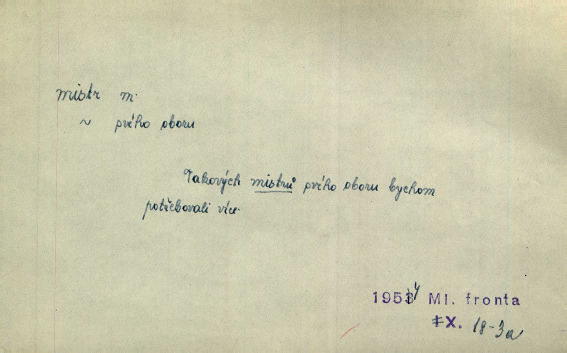- mistr, -a m. řemeslník oprávněný vykonávati samostatně řemeslo. [Borek] vstoupil do učení k zednickému mistru. Maj. „Jste, starosto, moudrý muž. Ale i mistr tesař se utne.“ Šmil. Mistr Kondelík! Skoro celá Praha ví od nedávna, že je to malíř pokojů. Ale ne nějaký zcela obyčejný hudlař. Herrm. Mistr popravčí není osobně zlý a nepřívětivý člověk, ó nikoliv; plní jen svou povinnost a jeho svědomí je čisté. K. Čap. D dílovedoucí v továrnách, přední dělník. Otec byl mistrem v brněnské jedné továrně. V. Mrš. Žel. staniční, návěštní, telegrafní mistr. D znalec, odborník. Každý [z tovaryšů] měl vykázaný obor své práce. Ten šil jen kalhoty, ten rukávy do kabátů všíval, ten byl mistr na vesty. Her. Nebyl valný mistr v kartách. Jir. [Usedlí mužové] jsou trochu neohební v rozmluvách s dámami: na to jsou mistři páni poručíkové. Havl. To jim je mistr na klavír, toho zvou všude. Jir. Ukázal, že je mistrem svého jazyka dokonalým. Vrch. Co hmatů v lepké hlíně mistr dláta se nazkouší, než v sličném vása tvaru se z jeví oku? sochař. Vrch. Mistr tónů hudební skladatel. Vrch. [Nakladatelství nezapomínalo] ani na staré a starší mistry pera spisovatele. Přít. D čestný titul, název pro vynikající umělce. „Nám umělcům se neříká pan mistr, nýbrž toliko mistr, bez pan.“ Čap. Ch. [K Al. Jiráskovi:] Mistře! Vy ji lépe znáte, naši Prahu. Klášt. Volné tyto studie vznikly na podnět mistra Nerudy. Vrch. Dílo to [obraz] zajisté pravého francouzského mistra. Jir. Staré rytiny francouzských mistrů. Jir. Též titul vynikajících sportovců. Mistr světa v boxu, v lehké atletice a j. D autor, původce, tvůrce vynikajícího díla literárního n. uměleckého. Spis tento mistra svého nezapře. Tyl. Ten, kdo byl jejich [kreseb] mistrem, prošel školou nejpřísnější kázně. R. Svob. D učitel, hlava n. vůdce skupiny, školy, směru. Tak bylo jemu [Dantovi]‚ jejž ctím mistrem svým. Vrch. [Němci] Rusům za hlavní vinu to pokládají, čemu je sami naučili a v čem se ještě posavad žákové svým mistrům ani nevyrovnali. Havl. Taneční mistr. Baletní mistr cvičitel baletu v divadle. Koncertní mistr přední vedoucí hráč na některý nástroj (zvl. housle a cello) v orchestru. D o Kristu, zvláště v poměru k apoštolům. Petr, ač by rád byl koláče jedl, také se děkoval, připomínaje si mistrův zákaz. Něm. D akademická hodnost středověká. Se šťastným humorem, ironií proloženým, popisuje nám [básník] mistry v kolleji. Havl. Učení Mistra Jana Husi. Rais.