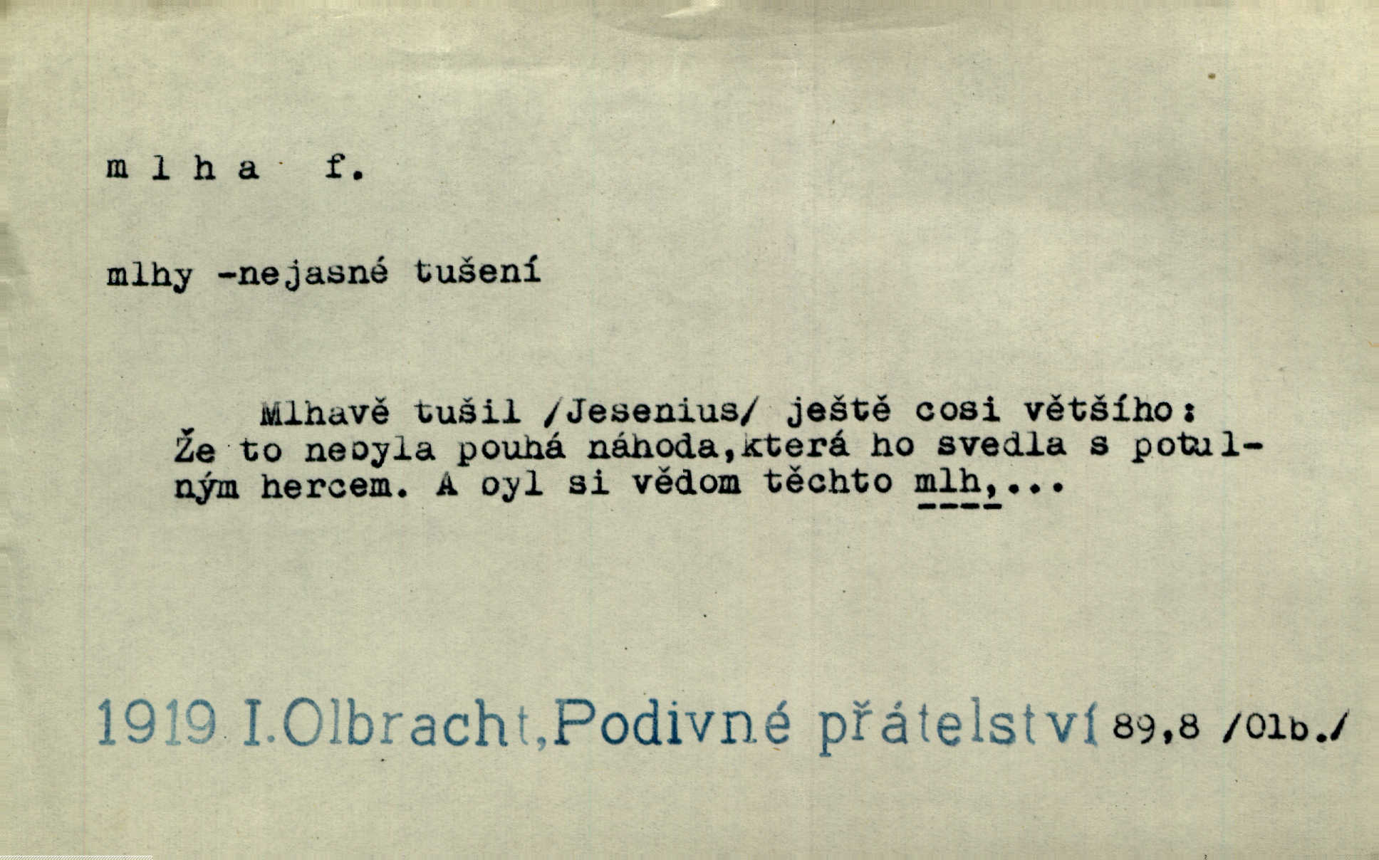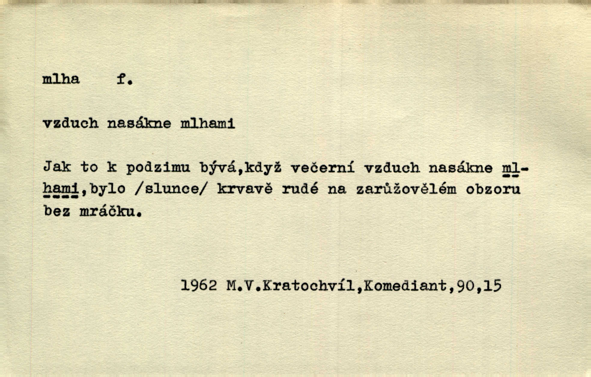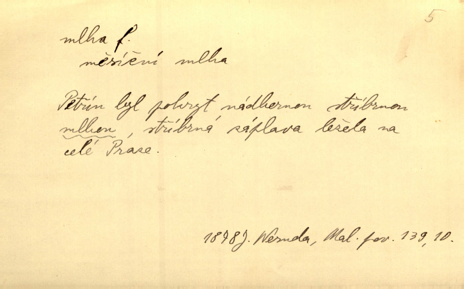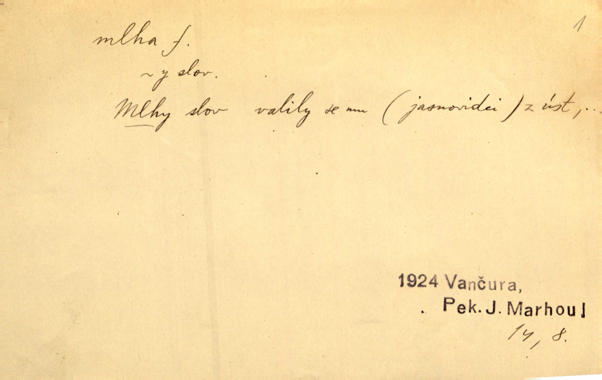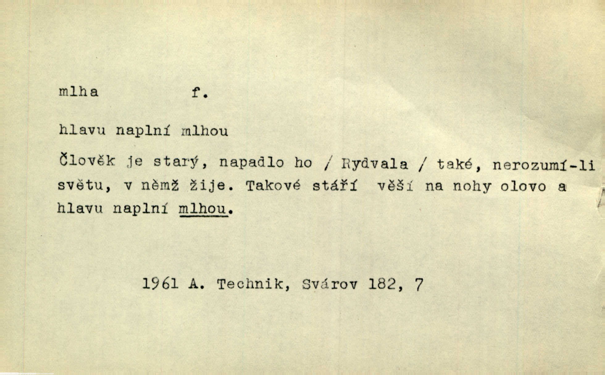 - mlha (ob. mha, zř. mhla), -y f. sražené vodní páry vznášející se blízko nad povrchem země. Stráně se ztrácely v mlhách. Kos. Pozadí s Petřínem bylo ještě zahaleno mlhou. Čech. Nebylo nic vidět pro samou mlhu. Něm. Mha obklopuje z rána zemi. Sova. „To je tam zas mlha, jako pytel,“ hlásili. Baar. Mlha padá, bude hezky. Zvon. Spocený ubíhá do listopadové mlhy. Maj. [Hřbitov za měsíční noci] zahalený ve stříbrné mlze. Vrch. Ustál. sp. Na Marjánku pamatuji se jen jako v mlze nejasně. Rais. [Bylo živo v Náchodě,] panstva a dvořanů jako mhy velké množství, spousta. Jir. Chodila jako v mlhách tápavě, s obestřenými smysly. Merh. Voj. umělá mlha neprůhledný oblak vyvinutý rozličnými chemikaliemi. Mlha yperitová. D vůbec o něčem, co zastírá jasný, správný pohled n. názor na skutečnost. Příští světlo prokmitává už mlhou předsudkův. Durd. Mlha studentských snů klesala a život počal se mu objevovati v určitých formách. Hlad. [Umírající:] Nebojím se ničeho. Mlha přede mnou, mlha za mnou. Podl. Jistě to viděl, ale tvářil se mha přede mnou, mha za mnou, neřekl nic jako by neviděl. Šrám. Jen v mlhách viděl její tvář v nejasné vzpomínce. Hlad. [Lenin] z mlhy zapomenutí vyprošťuje učení Marxovo o státě. Slav. Mlha mi padá s očí, krásné vidění [že se vrací můj syn] mizí! Mik. Nemysli, že mám mlhu na očích že špatně vidím. Šmil. Myslil, že má slepičí mlhu, a protíral si oko za okem. Šmil. [Mladá rozpěněná krev] vstupuje brzo na mozek, až oči dostanou kočičí mlhu. Jan. Vlčí mlha, noční mlha, večerní mlha hemeralopie. To jsi měl vlčí mhlu. Něm. A ty babičko, trpíš na noční mlhu nevidíš za soumraku. J. z Hv. V kapse mají pavučiny a v hlavách mlhu jsou hloupí. Šmil. D o něčem nejasném, neurčitém, ponurém. Mlhy slov valily se mu [jasnovidci] z úst. Vanč. Světový názor Tolstojův prohlašuje Nordau za mlhu a nerozum myšlenkový zmatek. Vrch. Úsměv, který znenáhla rozháněl mlhy melancholie ponurost. Hlad. D podnapilost, opička. Vydrážděn malou mlhou z vína, díval se veselýma očima na vřavu. Sova. D věc připomínající mlhu. V mlhách továrního dýmu značí se i Brno s šedým Špilberkem. A. Mrš. Koně funěli z nozder sloupy mlhy páry. Čap. Ch. D Dial. vlčí mlha květina vlčí mák. Jak se ta vlčí mlha, ta chrpa, ten koukol na nás pěkně smějí. Kosm. D Sport. slang. soudce mlha špatně posuzující výkony hráčů. Diváci kritisují hlasitě zasahování soudcovo: „Soudce špatně vidí! Soudce mlha!“ Lid. nov.