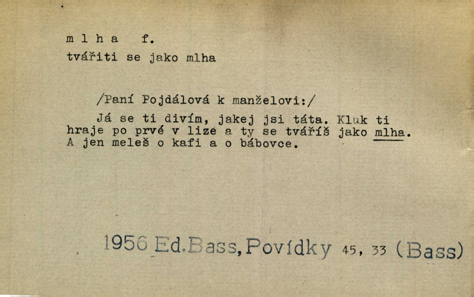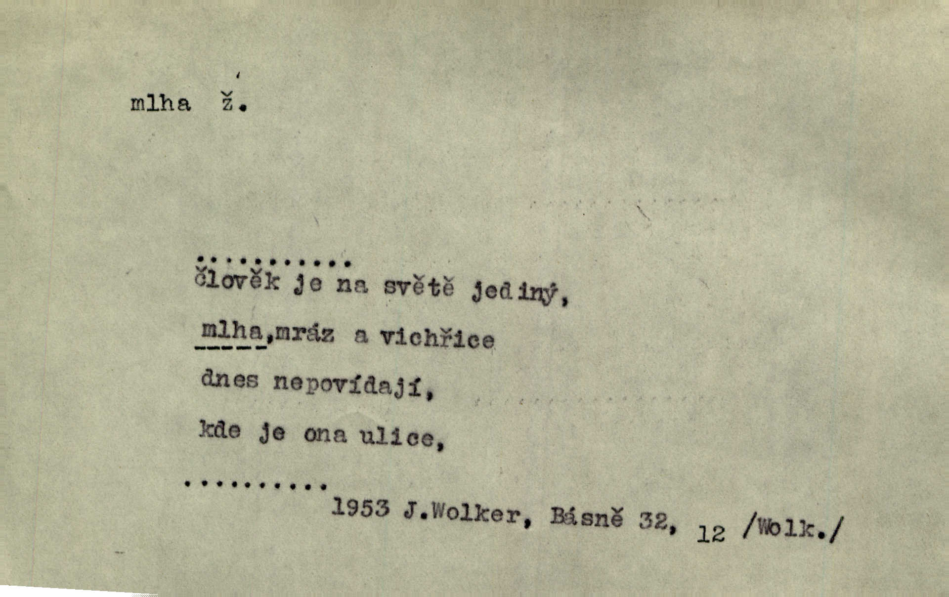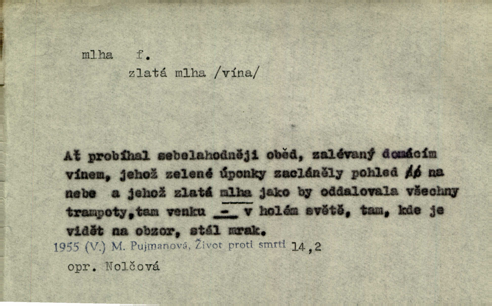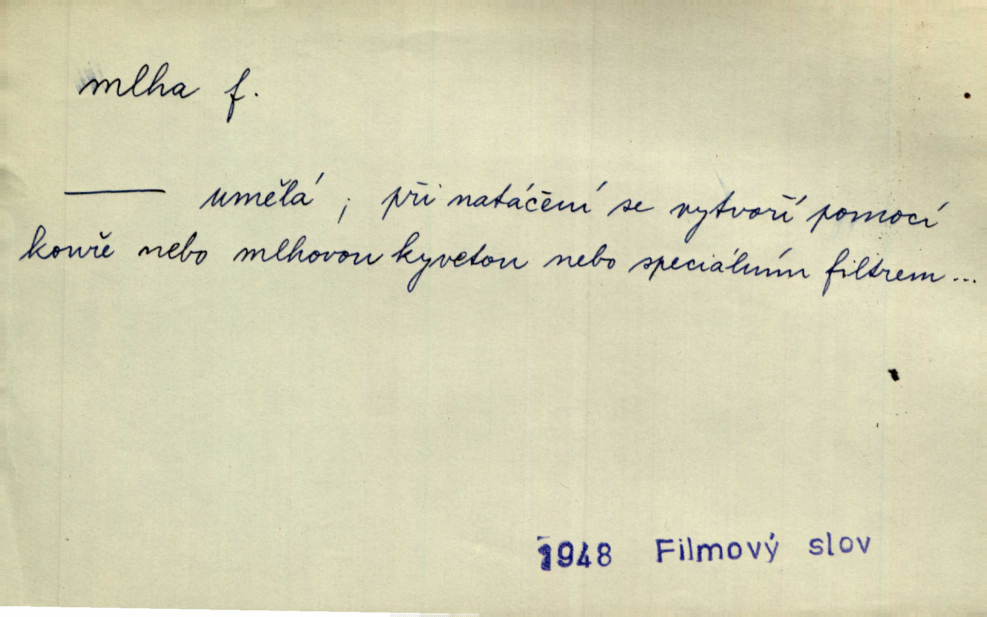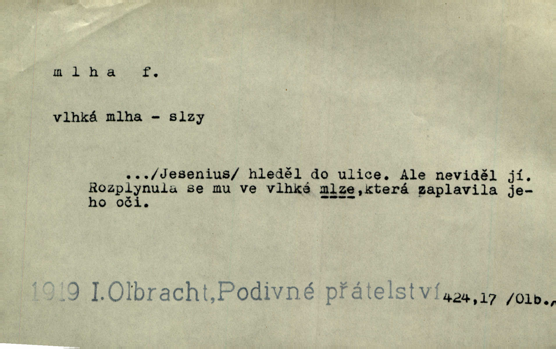 - mlha (ob. mha, zř. mhla), -y f. sražené vodní páry vznášející se blízko nad povrchem země. Stráně se ztrácely v mlhách. Kos. Pozadí s Petřínem bylo ještě zahaleno mlhou. Čech. Nebylo nic vidět pro samou mlhu. Něm. Mha obklopuje z rána zemi. Sova. „To je tam zas mlha, jako pytel,“ hlásili. Baar. Mlha padá, bude hezky. Zvon. Spocený ubíhá do listopadové mlhy. Maj. [Hřbitov za měsíční noci] zahalený ve stříbrné mlze. Vrch. Ustál. sp. Na Marjánku pamatuji se jen jako v mlze nejasně. Rais. [Bylo živo v Náchodě,] panstva a dvořanů jako mhy velké množství, spousta. Jir. Chodila jako v mlhách tápavě, s obestřenými smysly. Merh. Voj. umělá mlha neprůhledný oblak vyvinutý rozličnými chemikaliemi. Mlha yperitová. D vůbec o něčem, co zastírá jasný, správný pohled n. názor na skutečnost. Příští světlo prokmitává už mlhou předsudkův. Durd. Mlha studentských snů klesala a život počal se mu objevovati v určitých formách. Hlad. [Umírající:] Nebojím se ničeho. Mlha přede mnou, mlha za mnou. Podl. Jistě to viděl, ale tvářil se mha přede mnou, mha za mnou, neřekl nic jako by neviděl. Šrám. Jen v mlhách viděl její tvář v nejasné vzpomínce. Hlad. [Lenin] z mlhy zapomenutí vyprošťuje učení Marxovo o státě. Slav. Mlha mi padá s očí, krásné vidění [že se vrací můj syn] mizí! Mik. Nemysli, že mám mlhu na očích že špatně vidím. Šmil. Myslil, že má slepičí mlhu, a protíral si oko za okem. Šmil. [Mladá rozpěněná krev] vstupuje brzo na mozek, až oči dostanou kočičí mlhu. Jan. Vlčí mlha, noční mlha, večerní mlha hemeralopie. To jsi měl vlčí mhlu. Něm. A ty babičko, trpíš na noční mlhu nevidíš za soumraku. J. z Hv. V kapse mají pavučiny a v hlavách mlhu jsou hloupí. Šmil. D o něčem nejasném, neurčitém, ponurém. Mlhy slov valily se mu [jasnovidci] z úst. Vanč. Světový názor Tolstojův prohlašuje Nordau za mlhu a nerozum myšlenkový zmatek. Vrch. Úsměv, který znenáhla rozháněl mlhy melancholie ponurost. Hlad. D podnapilost, opička. Vydrážděn malou mlhou z vína, díval se veselýma očima na vřavu. Sova. D věc připomínající mlhu. V mlhách továrního dýmu značí se i Brno s šedým Špilberkem. A. Mrš. Koně funěli z nozder sloupy mlhy páry. Čap. Ch. D Dial. vlčí mlha květina vlčí mák. Jak se ta vlčí mlha, ta chrpa, ten koukol na nás pěkně smějí. Kosm. D Sport. slang. soudce mlha špatně posuzující výkony hráčů. Diváci kritisují hlasitě zasahování soudcovo: „Soudce špatně vidí! Soudce mlha!“ Lid. nov.