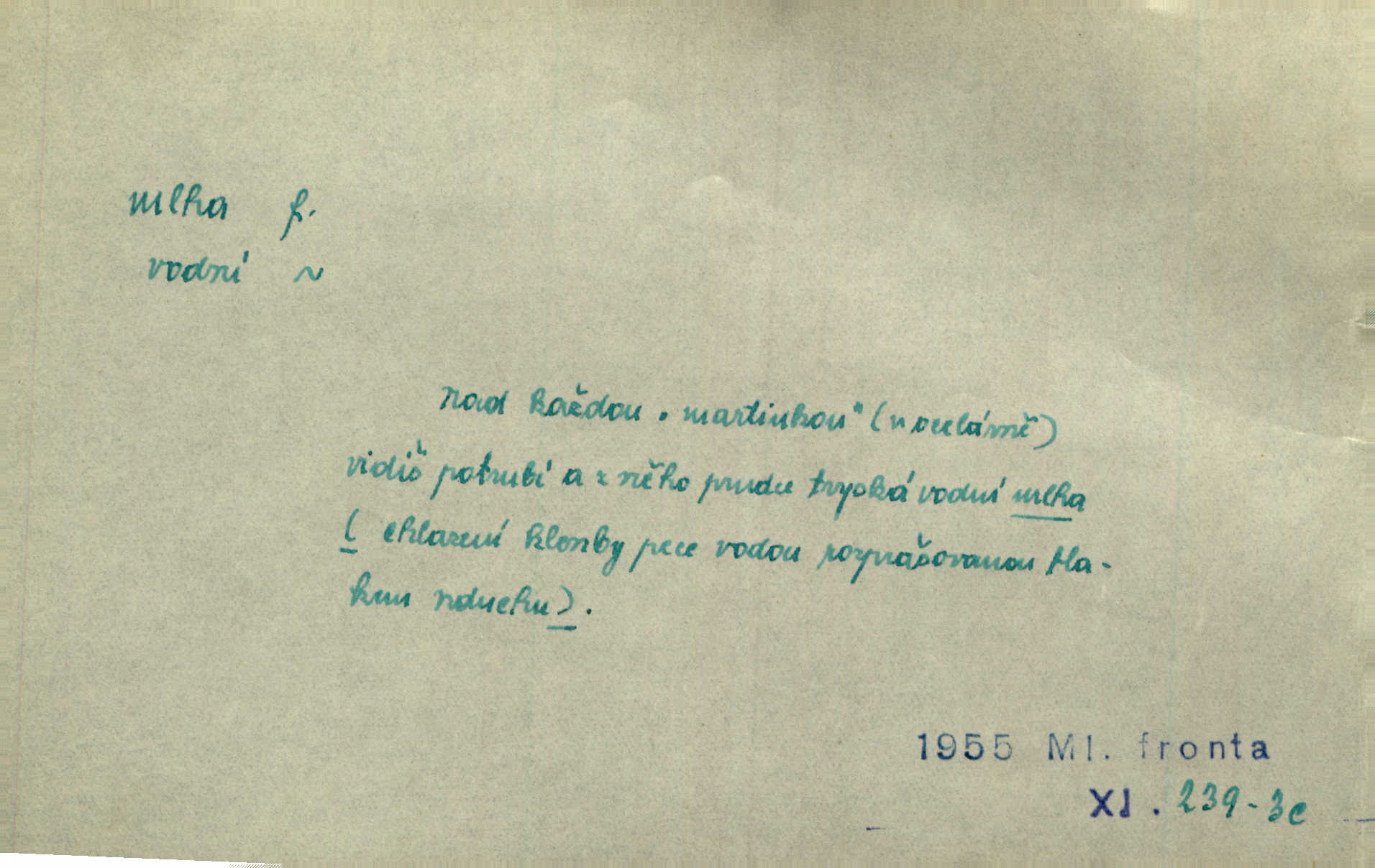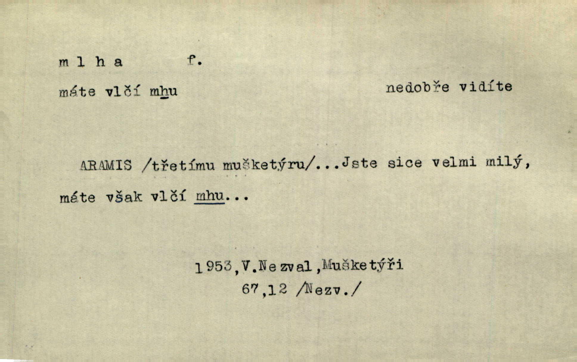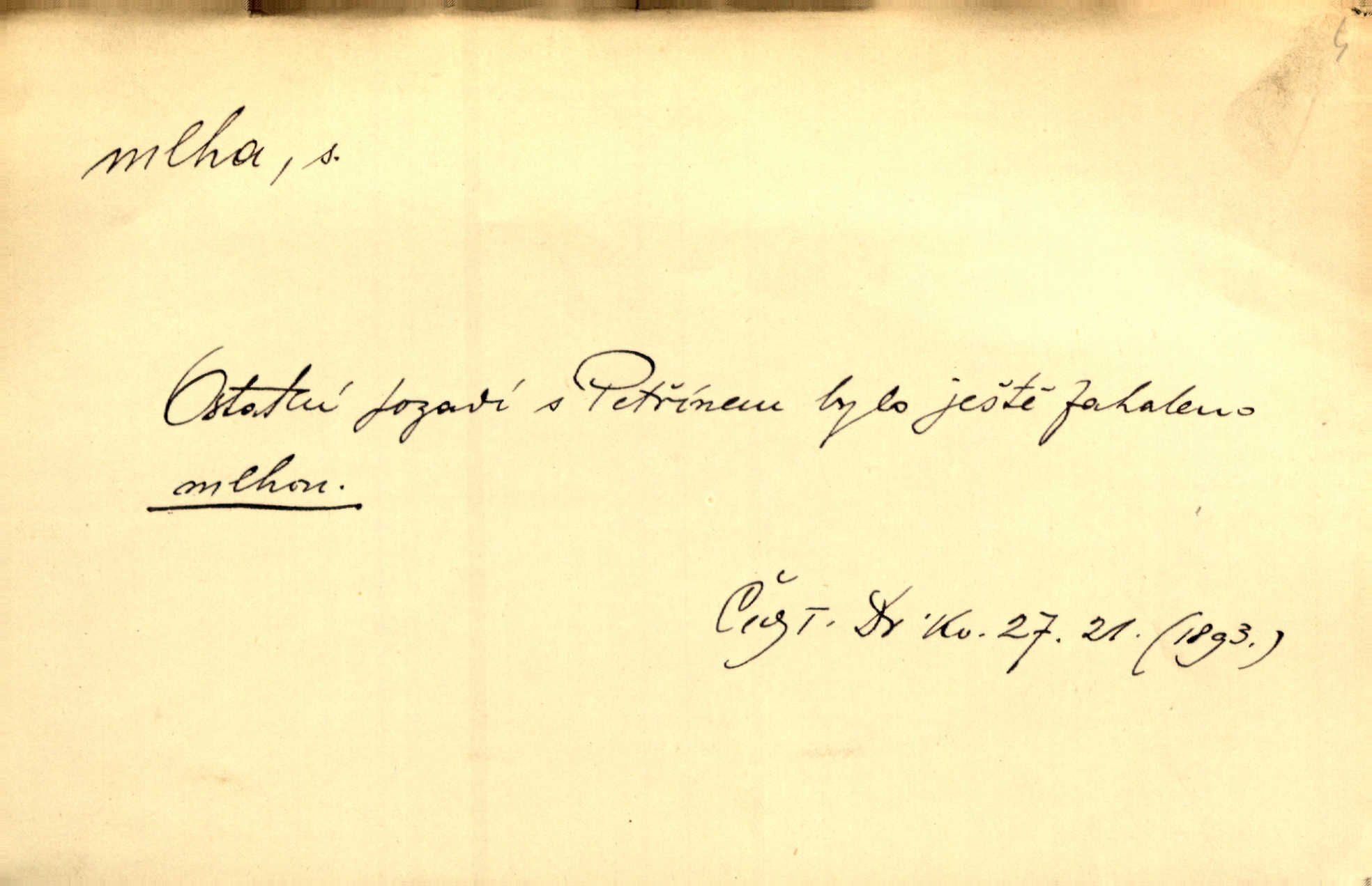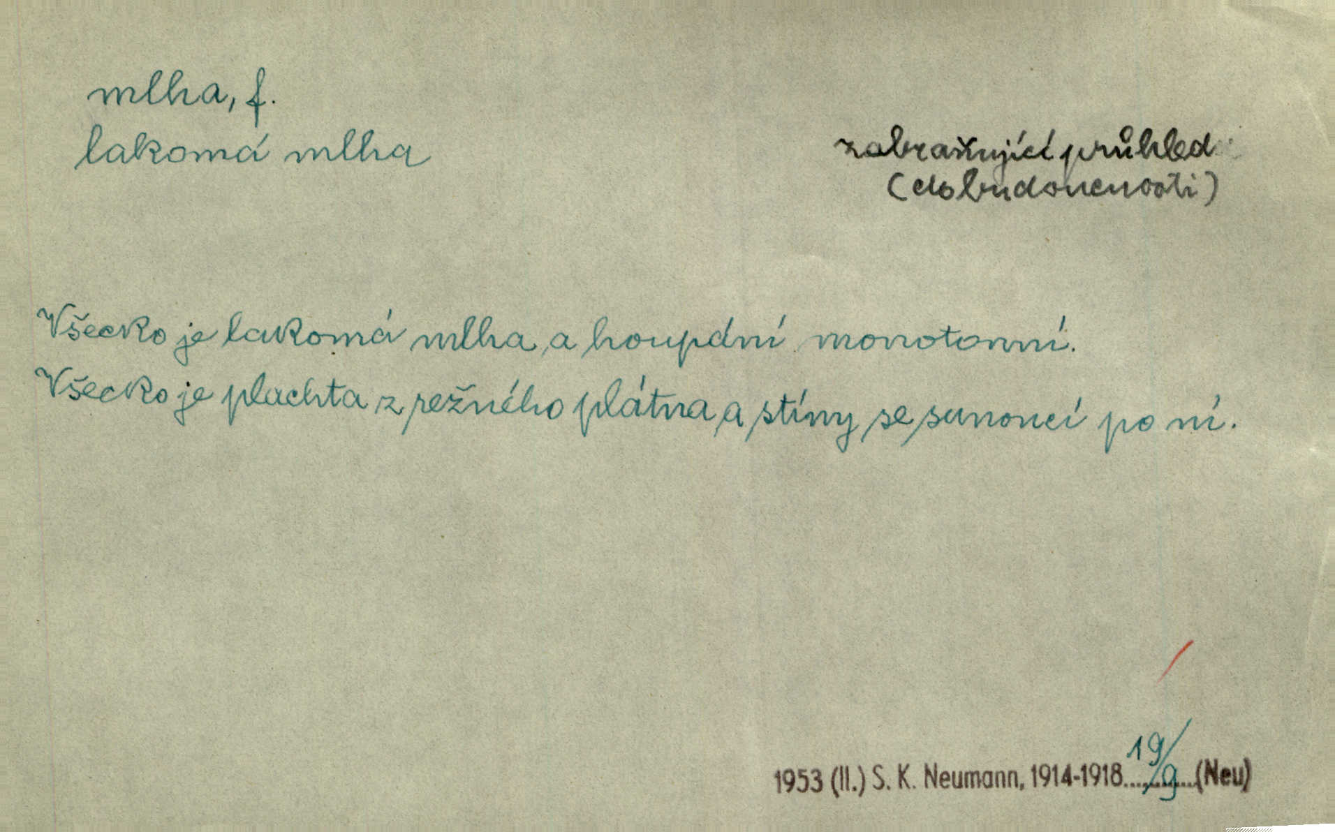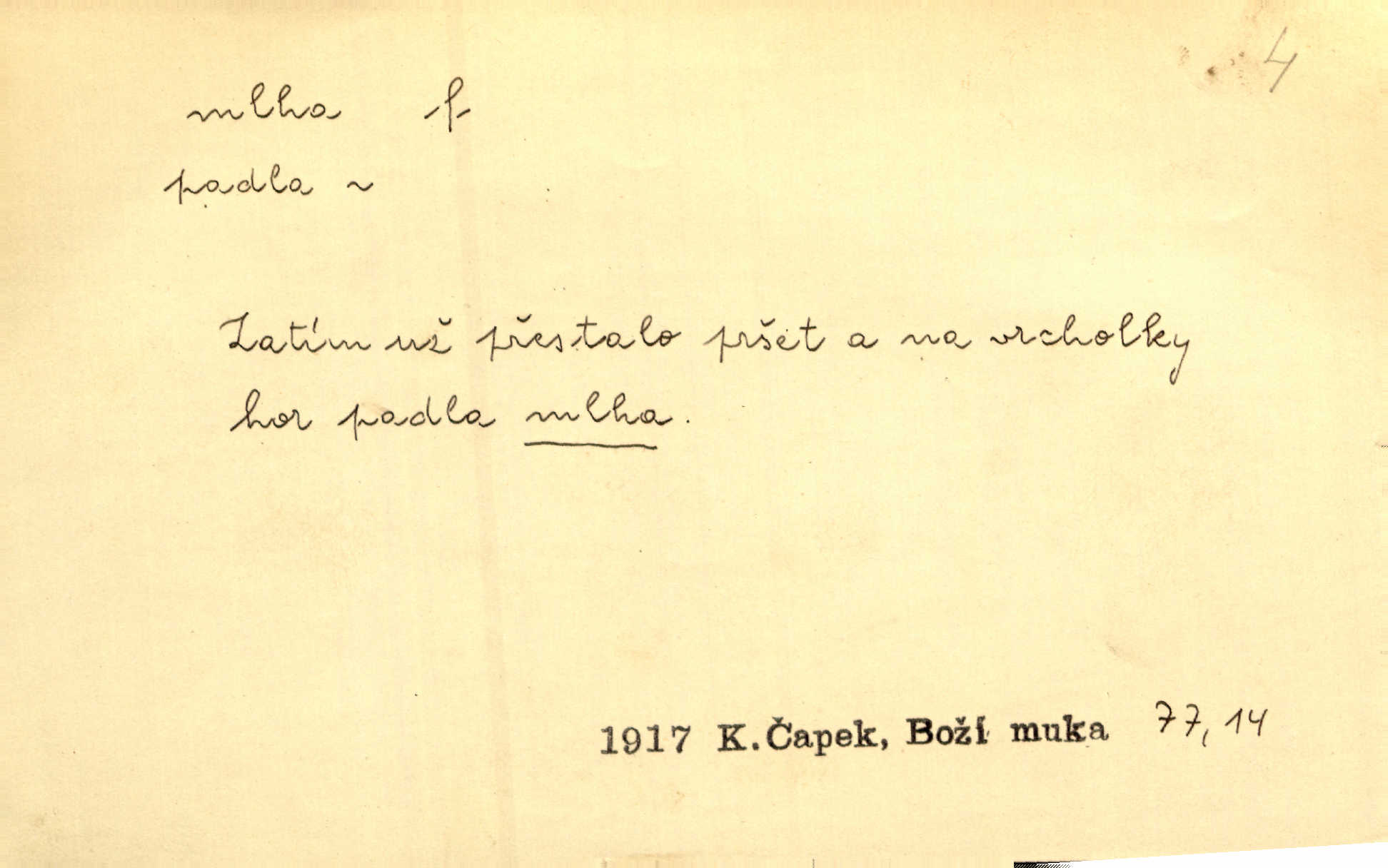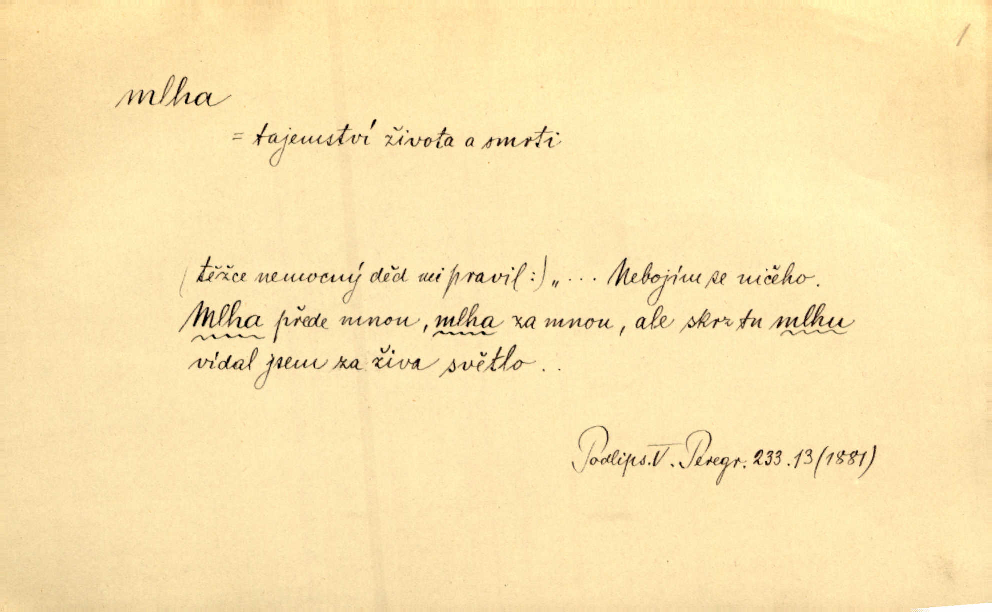 - mlha (ob. mha, zř. mhla), -y f. sražené vodní páry vznášející se blízko nad povrchem země. Stráně se ztrácely v mlhách. Kos. Pozadí s Petřínem bylo ještě zahaleno mlhou. Čech. Nebylo nic vidět pro samou mlhu. Něm. Mha obklopuje z rána zemi. Sova. „To je tam zas mlha, jako pytel,“ hlásili. Baar. Mlha padá, bude hezky. Zvon. Spocený ubíhá do listopadové mlhy. Maj. [Hřbitov za měsíční noci] zahalený ve stříbrné mlze. Vrch. Ustál. sp. Na Marjánku pamatuji se jen jako v mlze nejasně. Rais. [Bylo živo v Náchodě,] panstva a dvořanů jako mhy velké množství, spousta. Jir. Chodila jako v mlhách tápavě, s obestřenými smysly. Merh. Voj. umělá mlha neprůhledný oblak vyvinutý rozličnými chemikaliemi. Mlha yperitová. D vůbec o něčem, co zastírá jasný, správný pohled n. názor na skutečnost. Příští světlo prokmitává už mlhou předsudkův. Durd. Mlha studentských snů klesala a život počal se mu objevovati v určitých formách. Hlad. [Umírající:] Nebojím se ničeho. Mlha přede mnou, mlha za mnou. Podl. Jistě to viděl, ale tvářil se mha přede mnou, mha za mnou, neřekl nic jako by neviděl. Šrám. Jen v mlhách viděl její tvář v nejasné vzpomínce. Hlad. [Lenin] z mlhy zapomenutí vyprošťuje učení Marxovo o státě. Slav. Mlha mi padá s očí, krásné vidění [že se vrací můj syn] mizí! Mik. Nemysli, že mám mlhu na očích že špatně vidím. Šmil. Myslil, že má slepičí mlhu, a protíral si oko za okem. Šmil. [Mladá rozpěněná krev] vstupuje brzo na mozek, až oči dostanou kočičí mlhu. Jan. Vlčí mlha, noční mlha, večerní mlha hemeralopie. To jsi měl vlčí mhlu. Něm. A ty babičko, trpíš na noční mlhu nevidíš za soumraku. J. z Hv. V kapse mají pavučiny a v hlavách mlhu jsou hloupí. Šmil. D o něčem nejasném, neurčitém, ponurém. Mlhy slov valily se mu [jasnovidci] z úst. Vanč. Světový názor Tolstojův prohlašuje Nordau za mlhu a nerozum myšlenkový zmatek. Vrch. Úsměv, který znenáhla rozháněl mlhy melancholie ponurost. Hlad. D podnapilost, opička. Vydrážděn malou mlhou z vína, díval se veselýma očima na vřavu. Sova. D věc připomínající mlhu. V mlhách továrního dýmu značí se i Brno s šedým Špilberkem. A. Mrš. Koně funěli z nozder sloupy mlhy páry. Čap. Ch. D Dial. vlčí mlha květina vlčí mák. Jak se ta vlčí mlha, ta chrpa, ten koukol na nás pěkně smějí. Kosm. D Sport. slang. soudce mlha špatně posuzující výkony hráčů. Diváci kritisují hlasitě zasahování soudcovo: „Soudce špatně vidí! Soudce mlha!“ Lid. nov.