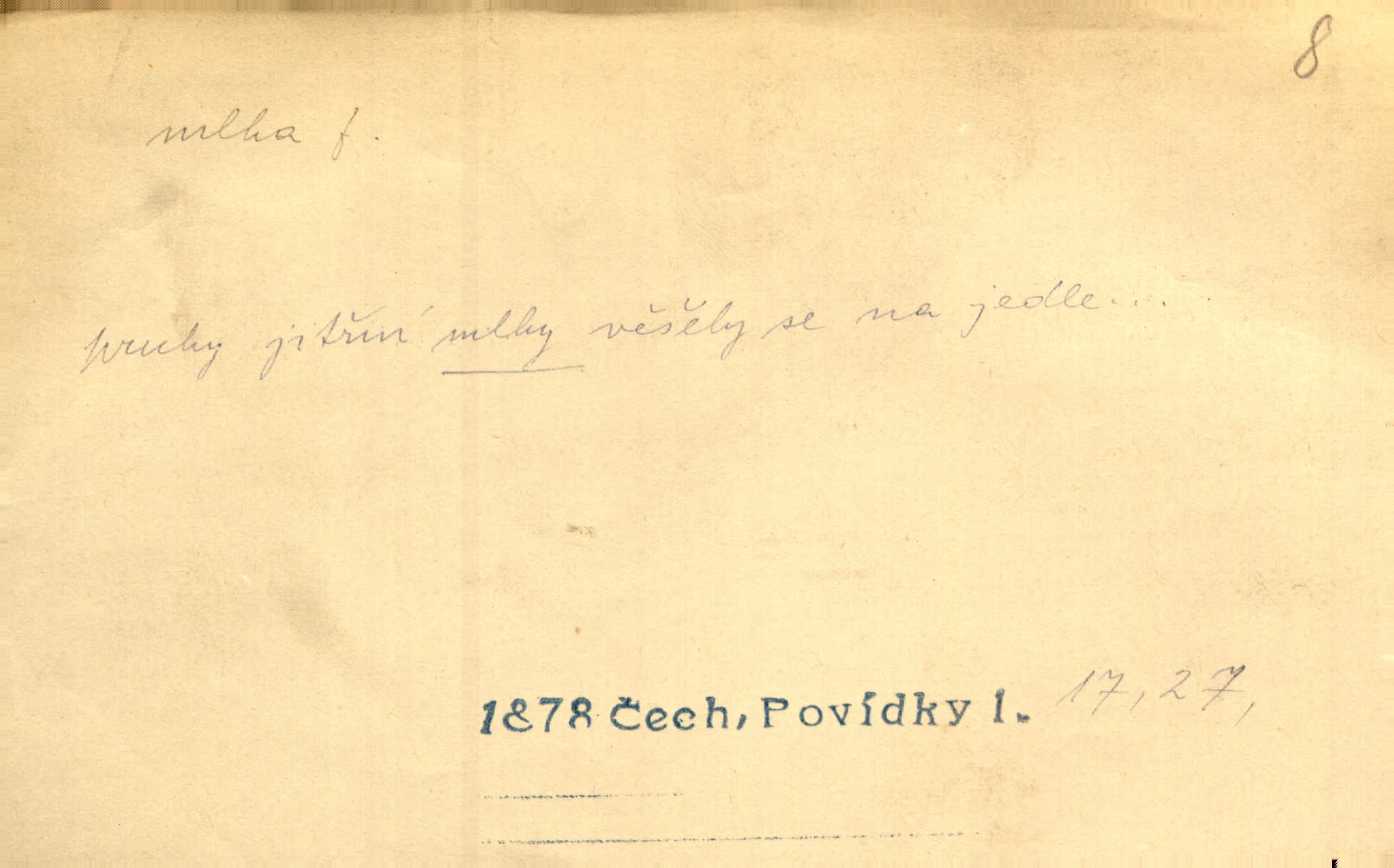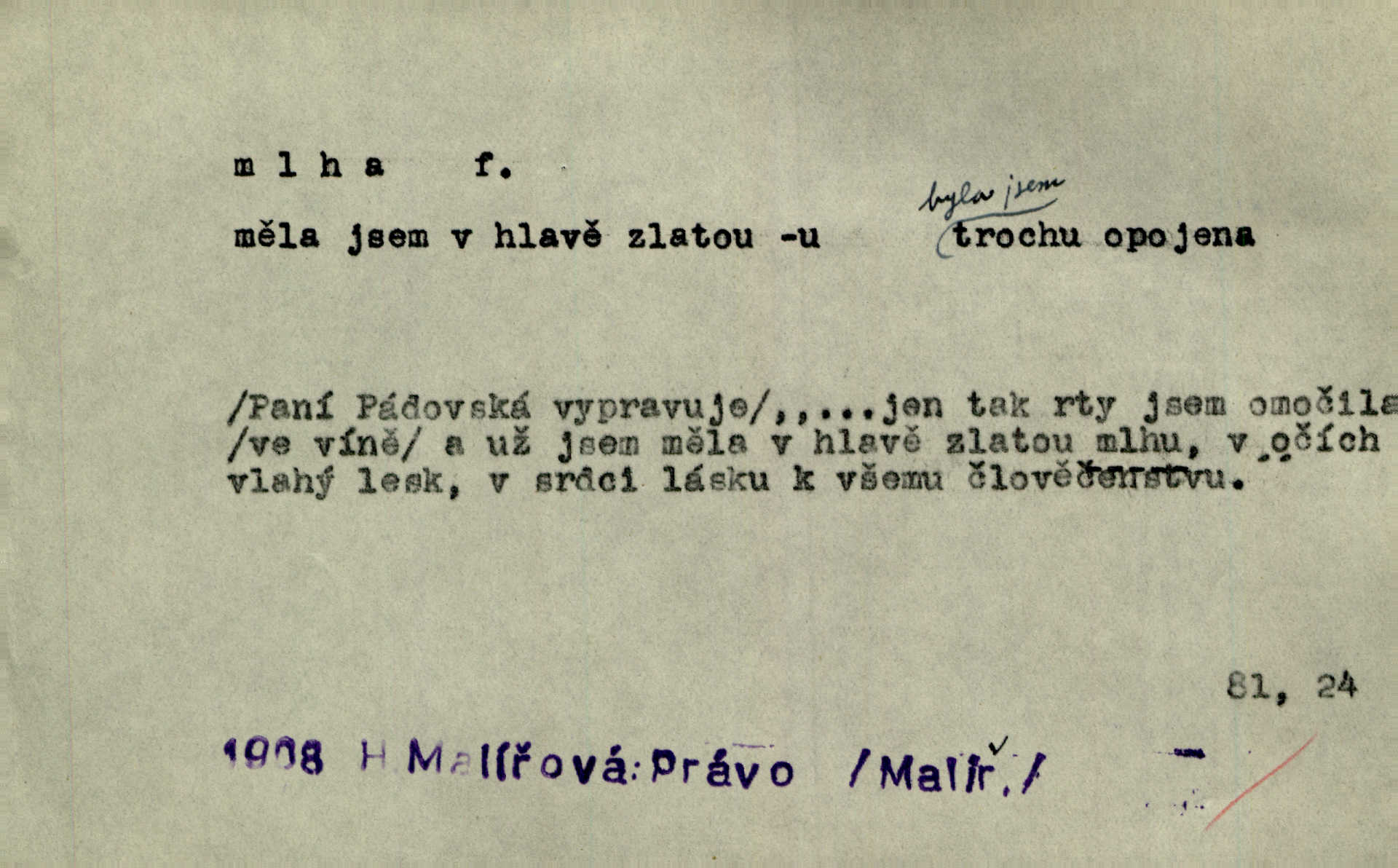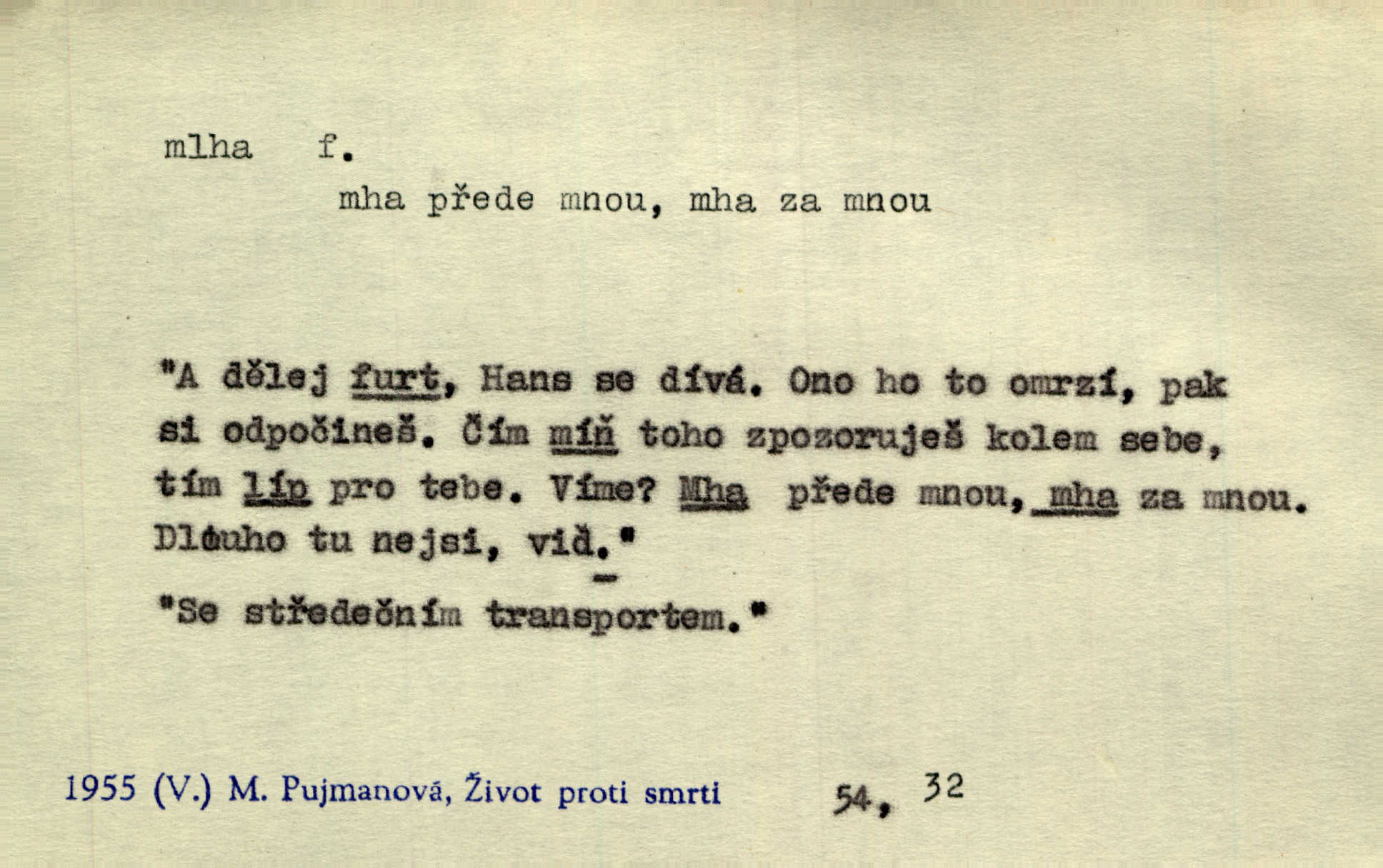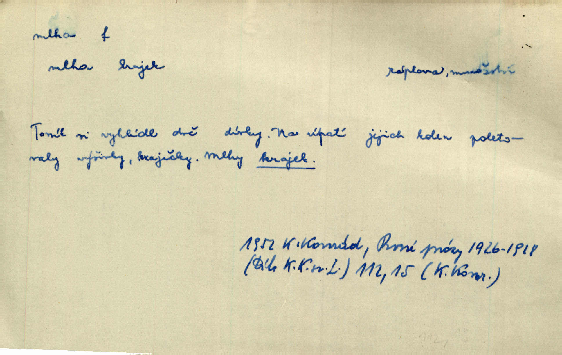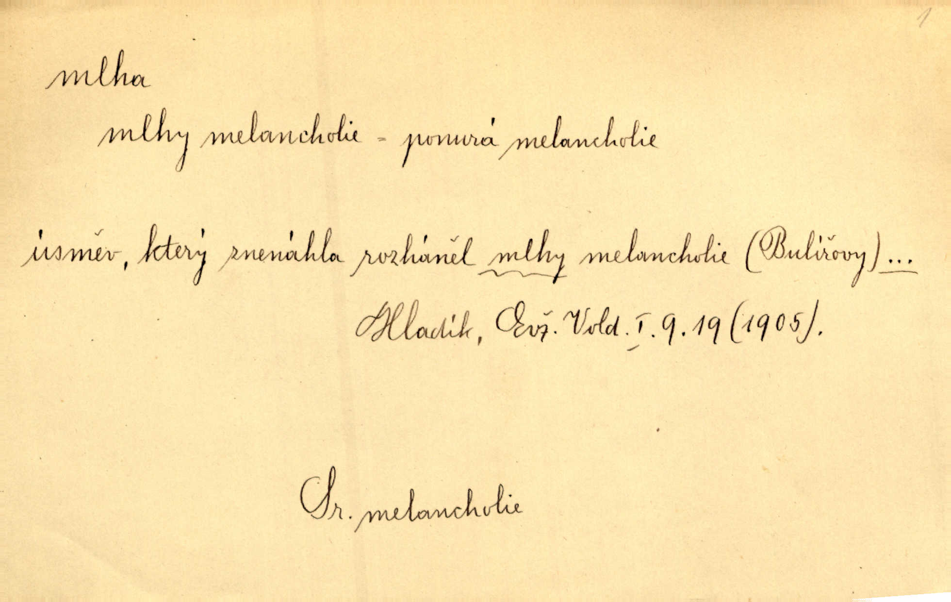 - mlha (ob. mha, zř. mhla), -y f. sražené vodní páry vznášející se blízko nad povrchem země. Stráně se ztrácely v mlhách. Kos. Pozadí s Petřínem bylo ještě zahaleno mlhou. Čech. Nebylo nic vidět pro samou mlhu. Něm. Mha obklopuje z rána zemi. Sova. „To je tam zas mlha, jako pytel,“ hlásili. Baar. Mlha padá, bude hezky. Zvon. Spocený ubíhá do listopadové mlhy. Maj. [Hřbitov za měsíční noci] zahalený ve stříbrné mlze. Vrch. Ustál. sp. Na Marjánku pamatuji se jen jako v mlze nejasně. Rais. [Bylo živo v Náchodě,] panstva a dvořanů jako mhy velké množství, spousta. Jir. Chodila jako v mlhách tápavě, s obestřenými smysly. Merh. Voj. umělá mlha neprůhledný oblak vyvinutý rozličnými chemikaliemi. Mlha yperitová. D vůbec o něčem, co zastírá jasný, správný pohled n. názor na skutečnost. Příští světlo prokmitává už mlhou předsudkův. Durd. Mlha studentských snů klesala a život počal se mu objevovati v určitých formách. Hlad. [Umírající:] Nebojím se ničeho. Mlha přede mnou, mlha za mnou. Podl. Jistě to viděl, ale tvářil se mha přede mnou, mha za mnou, neřekl nic jako by neviděl. Šrám. Jen v mlhách viděl její tvář v nejasné vzpomínce. Hlad. [Lenin] z mlhy zapomenutí vyprošťuje učení Marxovo o státě. Slav. Mlha mi padá s očí, krásné vidění [že se vrací můj syn] mizí! Mik. Nemysli, že mám mlhu na očích že špatně vidím. Šmil. Myslil, že má slepičí mlhu, a protíral si oko za okem. Šmil. [Mladá rozpěněná krev] vstupuje brzo na mozek, až oči dostanou kočičí mlhu. Jan. Vlčí mlha, noční mlha, večerní mlha hemeralopie. To jsi měl vlčí mhlu. Něm. A ty babičko, trpíš na noční mlhu nevidíš za soumraku. J. z Hv. V kapse mají pavučiny a v hlavách mlhu jsou hloupí. Šmil. D o něčem nejasném, neurčitém, ponurém. Mlhy slov valily se mu [jasnovidci] z úst. Vanč. Světový názor Tolstojův prohlašuje Nordau za mlhu a nerozum myšlenkový zmatek. Vrch. Úsměv, který znenáhla rozháněl mlhy melancholie ponurost. Hlad. D podnapilost, opička. Vydrážděn malou mlhou z vína, díval se veselýma očima na vřavu. Sova. D věc připomínající mlhu. V mlhách továrního dýmu značí se i Brno s šedým Špilberkem. A. Mrš. Koně funěli z nozder sloupy mlhy páry. Čap. Ch. D Dial. vlčí mlha květina vlčí mák. Jak se ta vlčí mlha, ta chrpa, ten koukol na nás pěkně smějí. Kosm. D Sport. slang. soudce mlha špatně posuzující výkony hráčů. Diváci kritisují hlasitě zasahování soudcovo: „Soudce špatně vidí! Soudce mlha!“ Lid. nov.