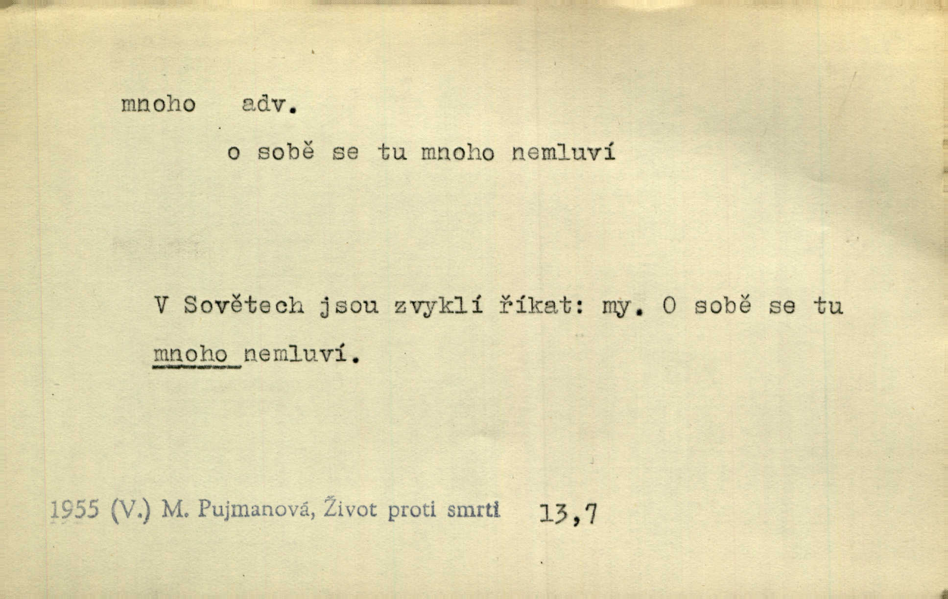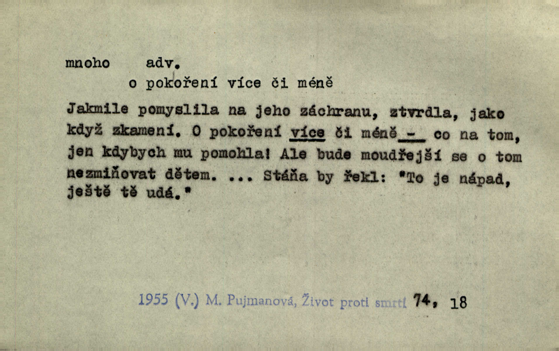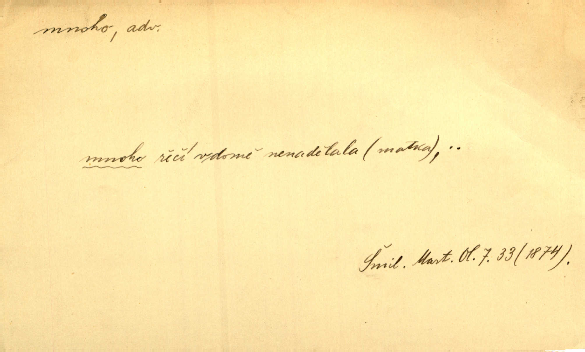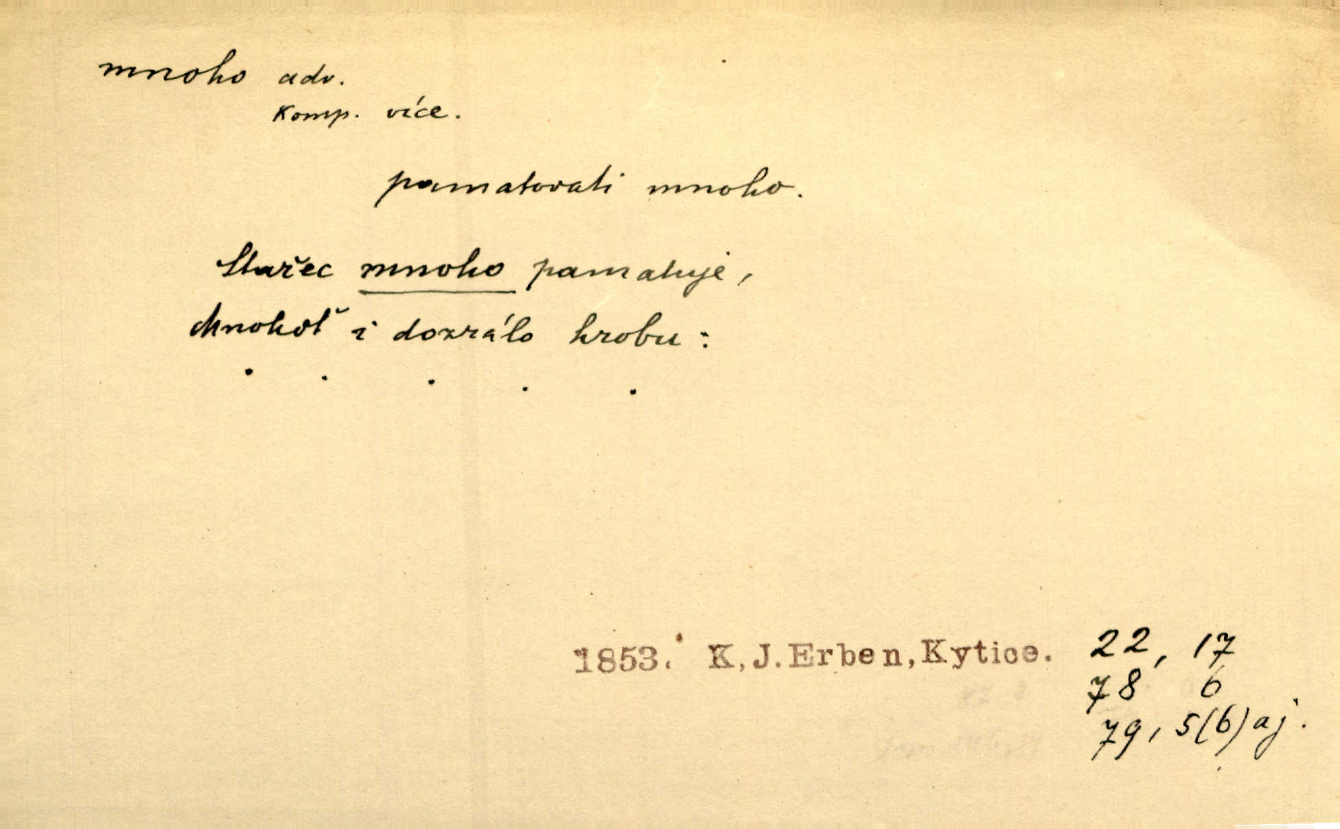 - mnoho adv. (komp. více, víc) velké množství, hodně (op. málo). Mnoho řečí v domě nenadělala. Šmil. Provázej Pán Bůh a mnoho štěstí! Baar. Mnoho povolaných, málo vyvolených. Přísl. Mnoho křiku, málo vlny. Pořek. Stařec mnoho pamatuje. Erb. Mámť důvody, jež mnoho váží. Šmil. Víte, že je mi dáno, abych mlčela a snáším raději křivdu, než bych se hájila. Ale co je mnoho, je mnoho je přílišné. Herrm. Na městě [Neapoli] samém ovšem není mnoho, kdo viděl Řím, Benátky, Cařihrad, podiví se střízlivé jednotvárnosti Neapole veliký počet věcí pozoruhodných. Ner. Myslil si [student] o sobě velmi mnoho. Svob. D Subst. mnoho, -a n. (výraz počítaného předmětu je v gen.; pravidlem je i v dat., lok., instr. tvar mnoha, a pak je výraz počítaného předmětu v pádě, kterého žádá souvislost) velké množství, velká míra. Dávejte z mála málo, z mnoha mnoho. Koll. Po mnohu vždy lakomec jen baží. Chmela. Nad málem byl jsi věrný, nad mnohem tebe ustanovím. Bible. Jeho [drába] živobytí zdálo se mu býti o mnoho lepší a lepší nežli sedláků mnohem. Herb. Historie páně Kondelíkova podobá se historii mnoha set malých živnostníků. Herrm. Poprvé po mnohu neděl pohrál si radostný úsměch rtoma jeho. Choch. Zločinec již od mnoha let krádeže páchal. Rozm. O mnoha věcech Frid. Ratzel ukázal přenesení aesthetických forem z krajin velmi vzdálených. Ath. Bylo to před ne mnoha lety. Pfleg. D adv. velkou měrou, velmi hodně. Zvlášť se ujímal mnoho študentů chudých. Něm. Však jsem právě přišla poprosit, aby byli tak mnoho laskavý a přimluvili se. Jir. Holý býval nyní mnoho mimo dům. Podl. D mnoho-li adv. táz. s gen. subst. uvozuje otázku po množství neurčitém (otázku po množství určitém uvozuje adv. kolik), jinak uvozuje otázku po množství vůbec: jak mnoho? kolik? Mnoho-li jsi zas asi za tuto noc polámal stromů, sklátil hnízd, zničil květů [vichr]? Svět. Listonoš byl vyslýchán, mnoho-li dopisů přišlo na Tomáše. Mah. Povím vám tedy jen z hlavy, co a mnoho-li mi koupíte. Svět. D Expr. (ve zvolání) vyjadřuje velký počet: velmi mnoho. Láska! … Mnoho-li se již asi o ní namluvilo a mnoho-li napsalo! A mnoho-li ještě napíše! Tyl. D adv. vztaž. vyjadřuje ve své větě počet, množství něčeho, které je ve vztahu k větě řídící. Při veškeré obětivosti nemohlo se tolik sebrat, mnoho-li bylo na stavbu třeba. Jir.