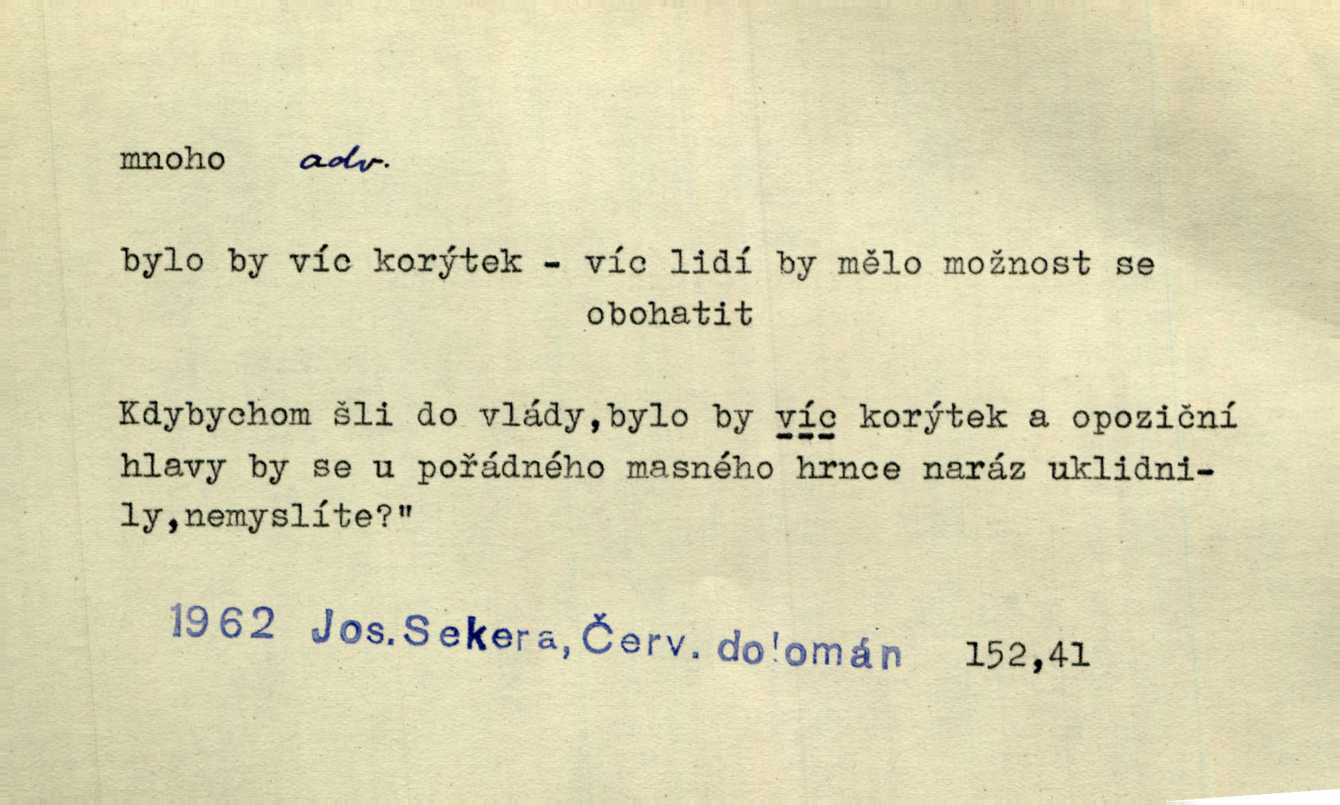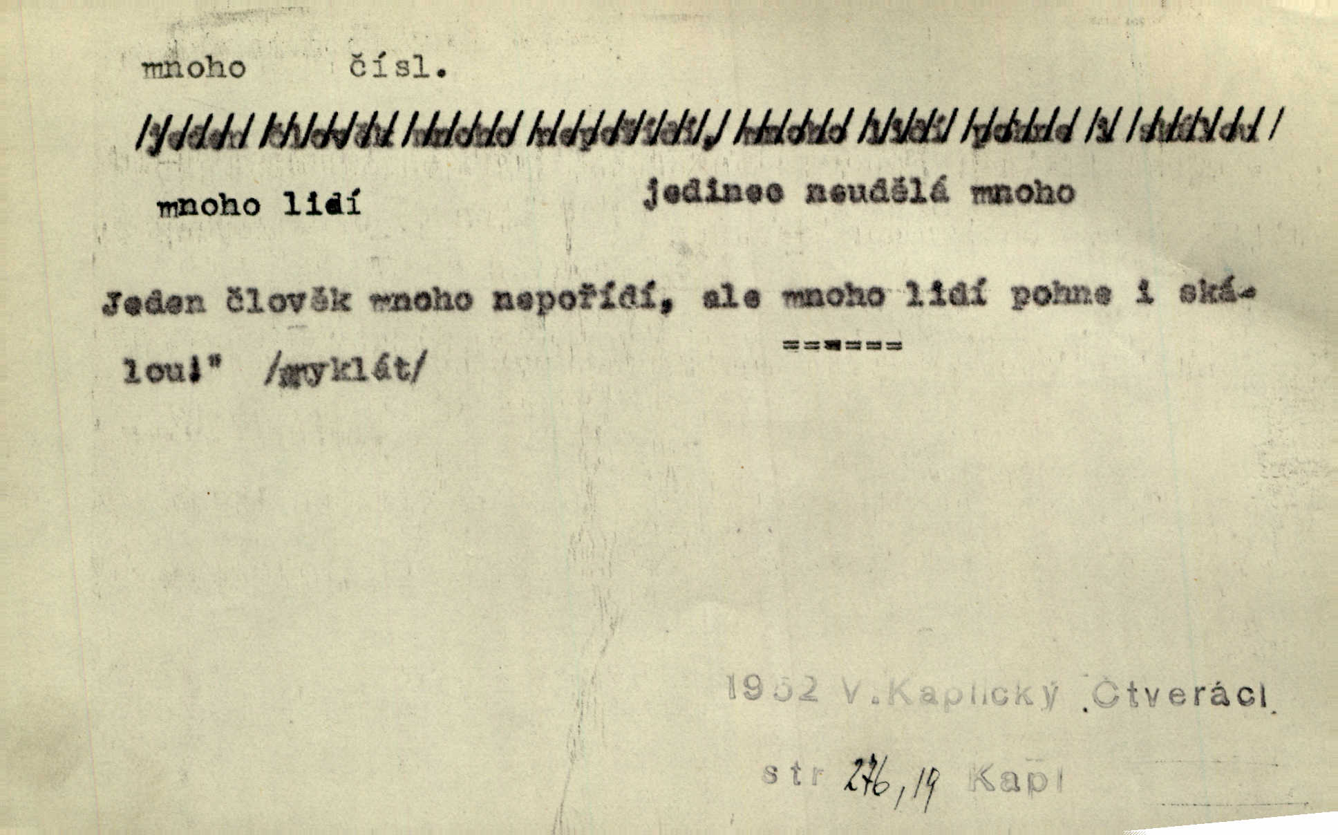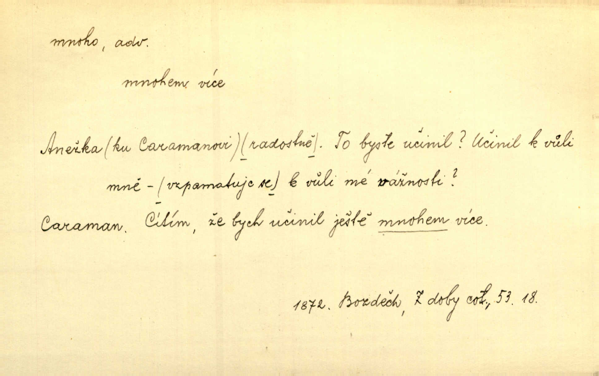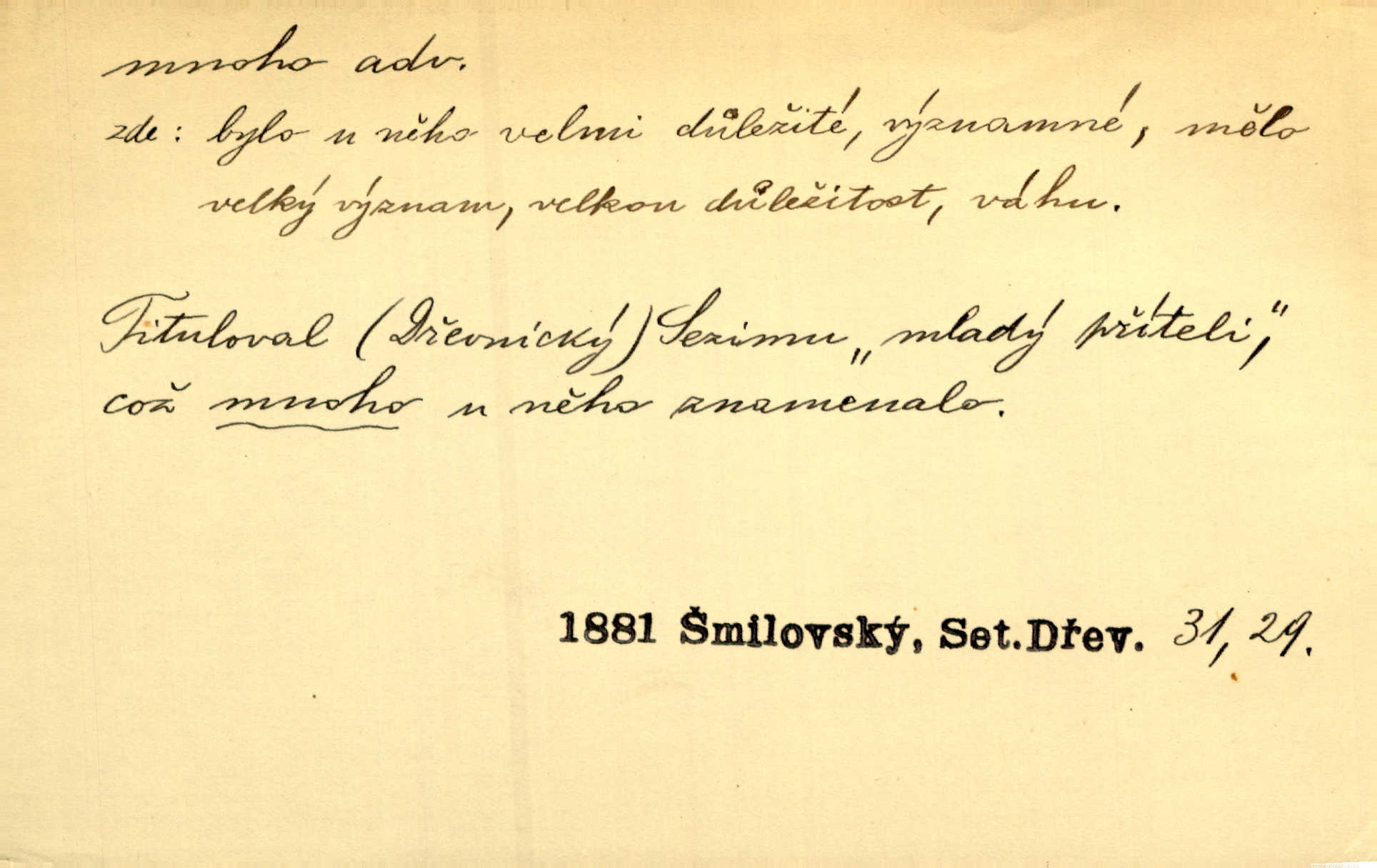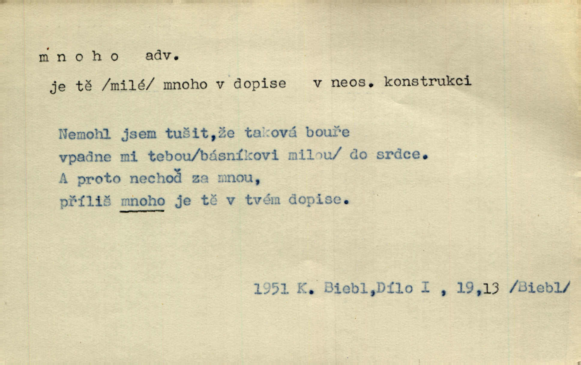 - mnoho adv. (komp. více, víc) velké množství, hodně (op. málo). Mnoho řečí v domě nenadělala. Šmil. Provázej Pán Bůh a mnoho štěstí! Baar. Mnoho povolaných, málo vyvolených. Přísl. Mnoho křiku, málo vlny. Pořek. Stařec mnoho pamatuje. Erb. Mámť důvody, jež mnoho váží. Šmil. Víte, že je mi dáno, abych mlčela a snáším raději křivdu, než bych se hájila. Ale co je mnoho, je mnoho je přílišné. Herrm. Na městě [Neapoli] samém ovšem není mnoho, kdo viděl Řím, Benátky, Cařihrad, podiví se střízlivé jednotvárnosti Neapole veliký počet věcí pozoruhodných. Ner. Myslil si [student] o sobě velmi mnoho. Svob. D Subst. mnoho, -a n. (výraz počítaného předmětu je v gen.; pravidlem je i v dat., lok., instr. tvar mnoha, a pak je výraz počítaného předmětu v pádě, kterého žádá souvislost) velké množství, velká míra. Dávejte z mála málo, z mnoha mnoho. Koll. Po mnohu vždy lakomec jen baží. Chmela. Nad málem byl jsi věrný, nad mnohem tebe ustanovím. Bible. Jeho [drába] živobytí zdálo se mu býti o mnoho lepší a lepší nežli sedláků mnohem. Herb. Historie páně Kondelíkova podobá se historii mnoha set malých živnostníků. Herrm. Poprvé po mnohu neděl pohrál si radostný úsměch rtoma jeho. Choch. Zločinec již od mnoha let krádeže páchal. Rozm. O mnoha věcech Frid. Ratzel ukázal přenesení aesthetických forem z krajin velmi vzdálených. Ath. Bylo to před ne mnoha lety. Pfleg. D adv. velkou měrou, velmi hodně. Zvlášť se ujímal mnoho študentů chudých. Něm. Však jsem právě přišla poprosit, aby byli tak mnoho laskavý a přimluvili se. Jir. Holý býval nyní mnoho mimo dům. Podl. D mnoho-li adv. táz. s gen. subst. uvozuje otázku po množství neurčitém (otázku po množství určitém uvozuje adv. kolik), jinak uvozuje otázku po množství vůbec: jak mnoho? kolik? Mnoho-li jsi zas asi za tuto noc polámal stromů, sklátil hnízd, zničil květů [vichr]? Svět. Listonoš byl vyslýchán, mnoho-li dopisů přišlo na Tomáše. Mah. Povím vám tedy jen z hlavy, co a mnoho-li mi koupíte. Svět. D Expr. (ve zvolání) vyjadřuje velký počet: velmi mnoho. Láska! … Mnoho-li se již asi o ní namluvilo a mnoho-li napsalo! A mnoho-li ještě napíše! Tyl. D adv. vztaž. vyjadřuje ve své větě počet, množství něčeho, které je ve vztahu k větě řídící. Při veškeré obětivosti nemohlo se tolik sebrat, mnoho-li bylo na stavbu třeba. Jir.