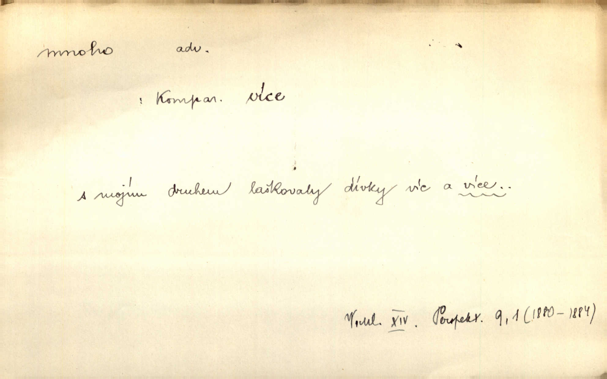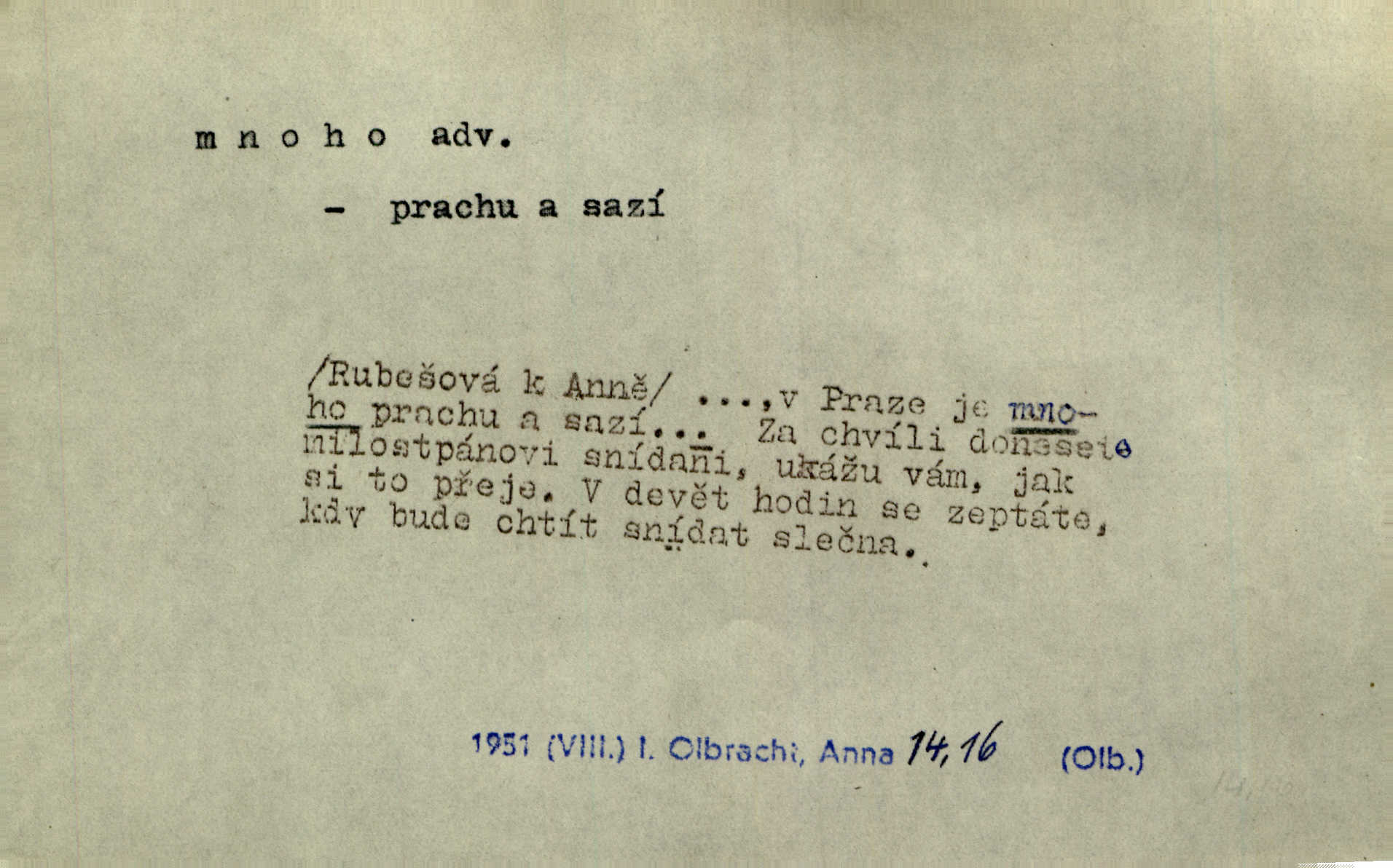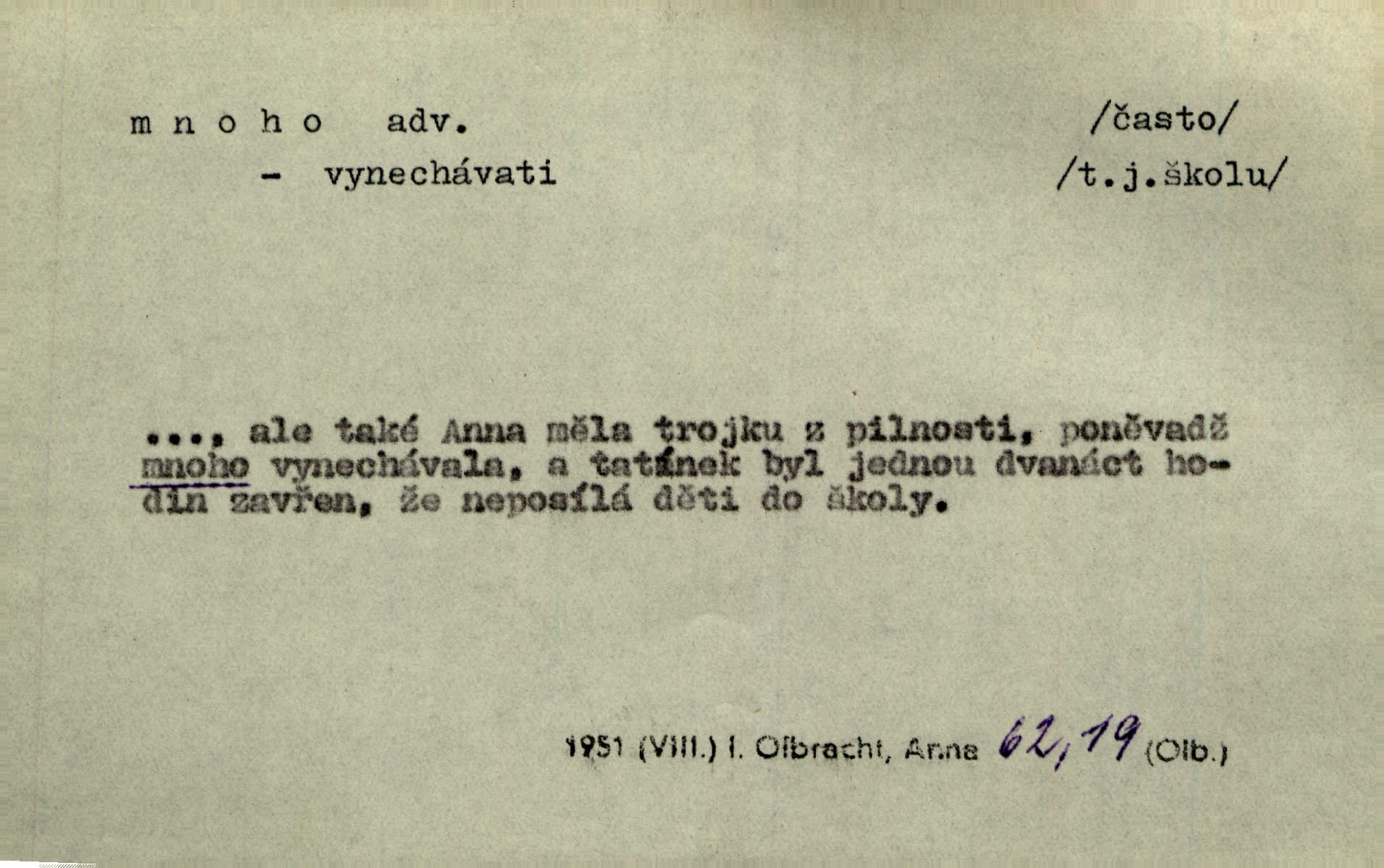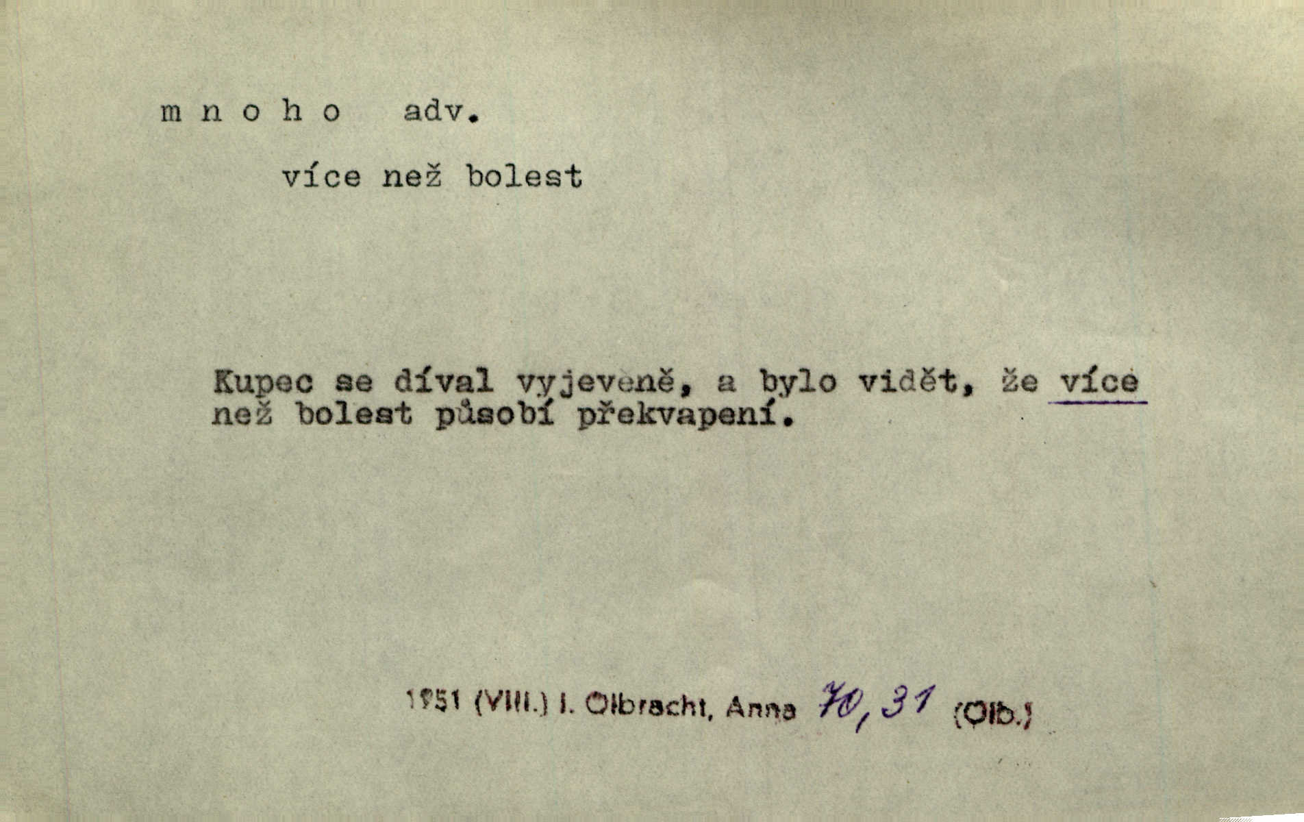 - mnoho adv. (komp. více, víc) velké množství, hodně (op. málo). Mnoho řečí v domě nenadělala. Šmil. Provázej Pán Bůh a mnoho štěstí! Baar. Mnoho povolaných, málo vyvolených. Přísl. Mnoho křiku, málo vlny. Pořek. Stařec mnoho pamatuje. Erb. Mámť důvody, jež mnoho váží. Šmil. Víte, že je mi dáno, abych mlčela a snáším raději křivdu, než bych se hájila. Ale co je mnoho, je mnoho je přílišné. Herrm. Na městě [Neapoli] samém ovšem není mnoho, kdo viděl Řím, Benátky, Cařihrad, podiví se střízlivé jednotvárnosti Neapole veliký počet věcí pozoruhodných. Ner. Myslil si [student] o sobě velmi mnoho. Svob. D Subst. mnoho, -a n. (výraz počítaného předmětu je v gen.; pravidlem je i v dat., lok., instr. tvar mnoha, a pak je výraz počítaného předmětu v pádě, kterého žádá souvislost) velké množství, velká míra. Dávejte z mála málo, z mnoha mnoho. Koll. Po mnohu vždy lakomec jen baží. Chmela. Nad málem byl jsi věrný, nad mnohem tebe ustanovím. Bible. Jeho [drába] živobytí zdálo se mu býti o mnoho lepší a lepší nežli sedláků mnohem. Herb. Historie páně Kondelíkova podobá se historii mnoha set malých živnostníků. Herrm. Poprvé po mnohu neděl pohrál si radostný úsměch rtoma jeho. Choch. Zločinec již od mnoha let krádeže páchal. Rozm. O mnoha věcech Frid. Ratzel ukázal přenesení aesthetických forem z krajin velmi vzdálených. Ath. Bylo to před ne mnoha lety. Pfleg. D adv. velkou měrou, velmi hodně. Zvlášť se ujímal mnoho študentů chudých. Něm. Však jsem právě přišla poprosit, aby byli tak mnoho laskavý a přimluvili se. Jir. Holý býval nyní mnoho mimo dům. Podl. D mnoho-li adv. táz. s gen. subst. uvozuje otázku po množství neurčitém (otázku po množství určitém uvozuje adv. kolik), jinak uvozuje otázku po množství vůbec: jak mnoho? kolik? Mnoho-li jsi zas asi za tuto noc polámal stromů, sklátil hnízd, zničil květů [vichr]? Svět. Listonoš byl vyslýchán, mnoho-li dopisů přišlo na Tomáše. Mah. Povím vám tedy jen z hlavy, co a mnoho-li mi koupíte. Svět. D Expr. (ve zvolání) vyjadřuje velký počet: velmi mnoho. Láska! … Mnoho-li se již asi o ní namluvilo a mnoho-li napsalo! A mnoho-li ještě napíše! Tyl. D adv. vztaž. vyjadřuje ve své větě počet, množství něčeho, které je ve vztahu k větě řídící. Při veškeré obětivosti nemohlo se tolik sebrat, mnoho-li bylo na stavbu třeba. Jir.