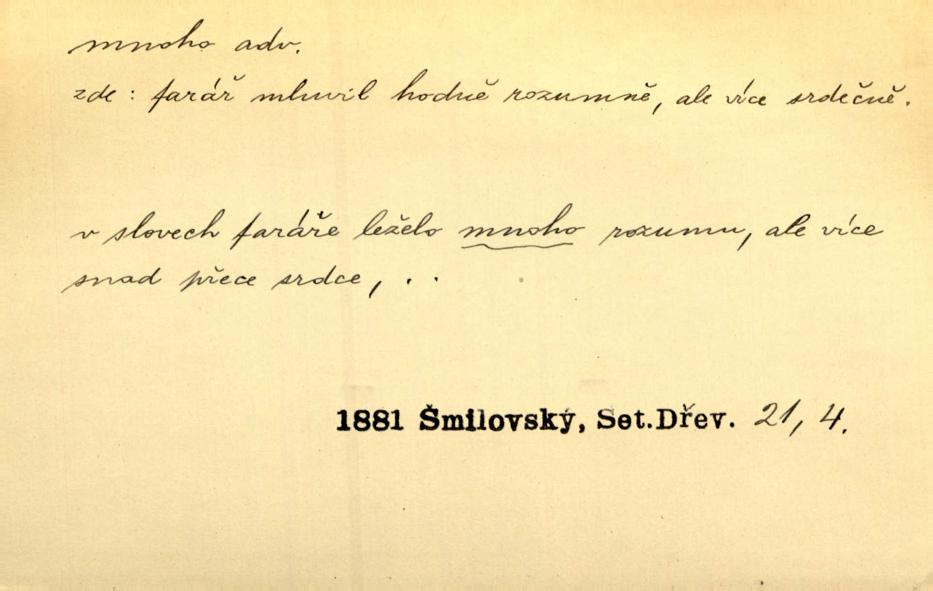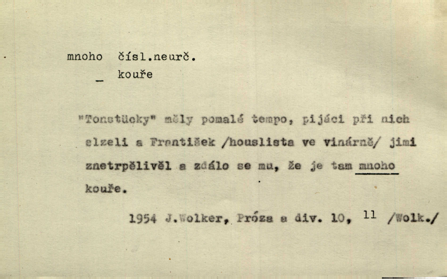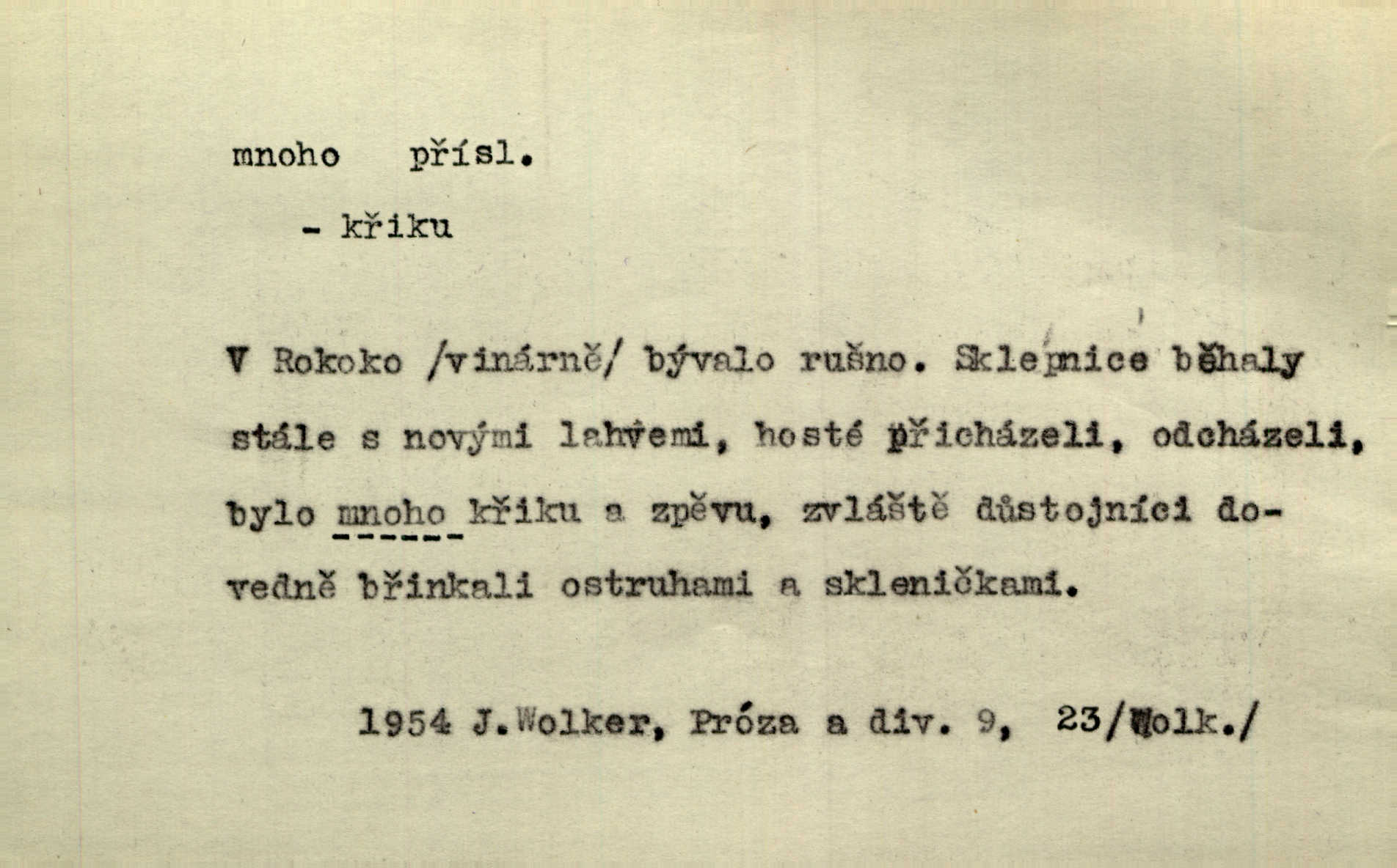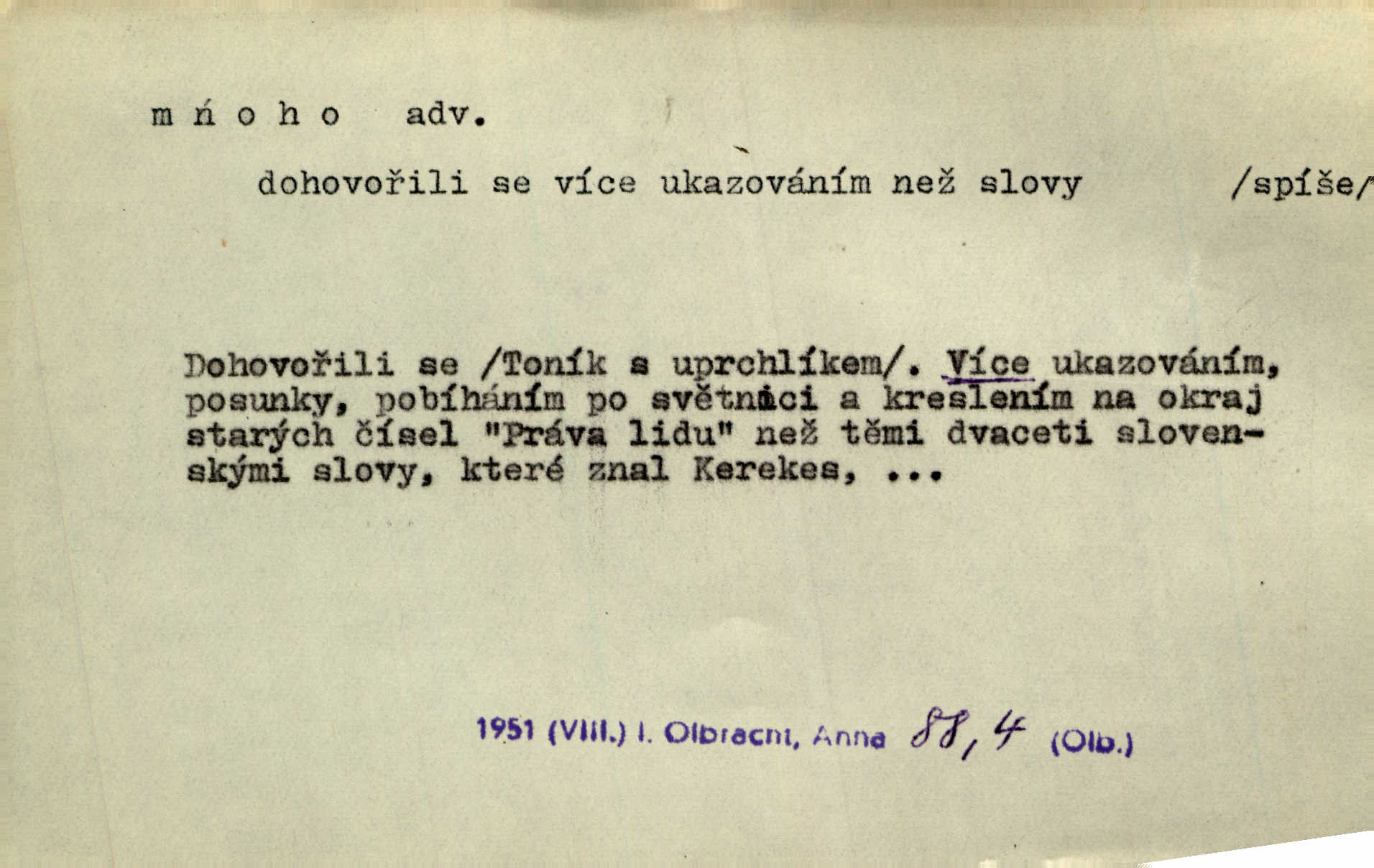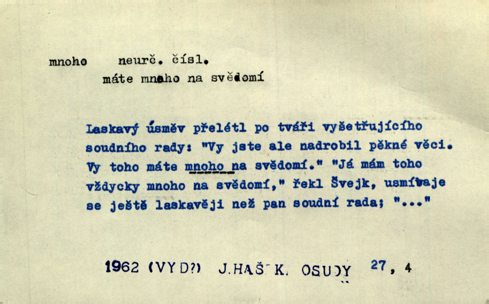 - mnoho adv. (komp. více, víc) velké množství, hodně (op. málo). Mnoho řečí v domě nenadělala. Šmil. Provázej Pán Bůh a mnoho štěstí! Baar. Mnoho povolaných, málo vyvolených. Přísl. Mnoho křiku, málo vlny. Pořek. Stařec mnoho pamatuje. Erb. Mámť důvody, jež mnoho váží. Šmil. Víte, že je mi dáno, abych mlčela a snáším raději křivdu, než bych se hájila. Ale co je mnoho, je mnoho je přílišné. Herrm. Na městě [Neapoli] samém ovšem není mnoho, kdo viděl Řím, Benátky, Cařihrad, podiví se střízlivé jednotvárnosti Neapole veliký počet věcí pozoruhodných. Ner. Myslil si [student] o sobě velmi mnoho. Svob. D Subst. mnoho, -a n. (výraz počítaného předmětu je v gen.; pravidlem je i v dat., lok., instr. tvar mnoha, a pak je výraz počítaného předmětu v pádě, kterého žádá souvislost) velké množství, velká míra. Dávejte z mála málo, z mnoha mnoho. Koll. Po mnohu vždy lakomec jen baží. Chmela. Nad málem byl jsi věrný, nad mnohem tebe ustanovím. Bible. Jeho [drába] živobytí zdálo se mu býti o mnoho lepší a lepší nežli sedláků mnohem. Herb. Historie páně Kondelíkova podobá se historii mnoha set malých živnostníků. Herrm. Poprvé po mnohu neděl pohrál si radostný úsměch rtoma jeho. Choch. Zločinec již od mnoha let krádeže páchal. Rozm. O mnoha věcech Frid. Ratzel ukázal přenesení aesthetických forem z krajin velmi vzdálených. Ath. Bylo to před ne mnoha lety. Pfleg. D adv. velkou měrou, velmi hodně. Zvlášť se ujímal mnoho študentů chudých. Něm. Však jsem právě přišla poprosit, aby byli tak mnoho laskavý a přimluvili se. Jir. Holý býval nyní mnoho mimo dům. Podl. D mnoho-li adv. táz. s gen. subst. uvozuje otázku po množství neurčitém (otázku po množství určitém uvozuje adv. kolik), jinak uvozuje otázku po množství vůbec: jak mnoho? kolik? Mnoho-li jsi zas asi za tuto noc polámal stromů, sklátil hnízd, zničil květů [vichr]? Svět. Listonoš byl vyslýchán, mnoho-li dopisů přišlo na Tomáše. Mah. Povím vám tedy jen z hlavy, co a mnoho-li mi koupíte. Svět. D Expr. (ve zvolání) vyjadřuje velký počet: velmi mnoho. Láska! … Mnoho-li se již asi o ní namluvilo a mnoho-li napsalo! A mnoho-li ještě napíše! Tyl. D adv. vztaž. vyjadřuje ve své větě počet, množství něčeho, které je ve vztahu k větě řídící. Při veškeré obětivosti nemohlo se tolik sebrat, mnoho-li bylo na stavbu třeba. Jir.