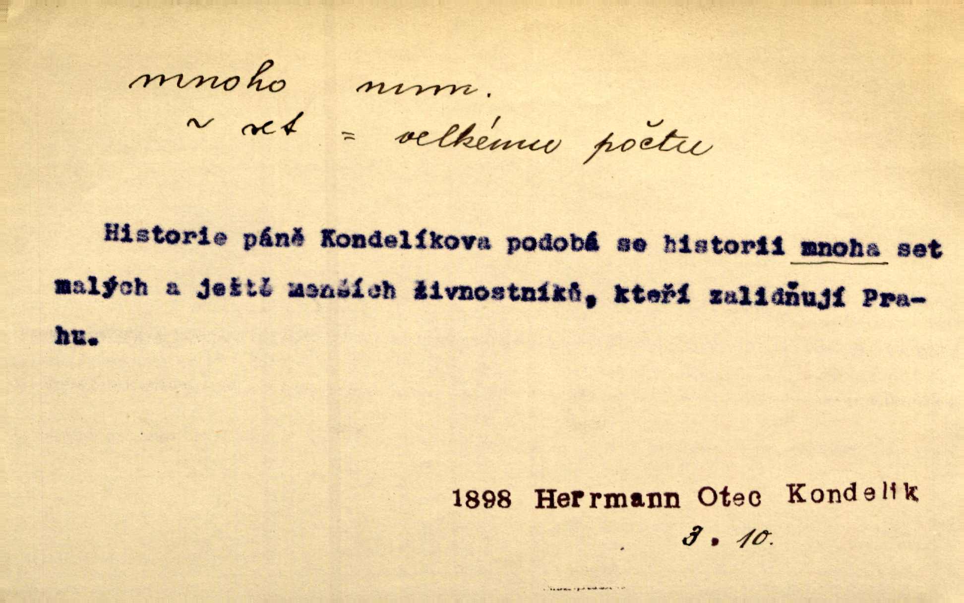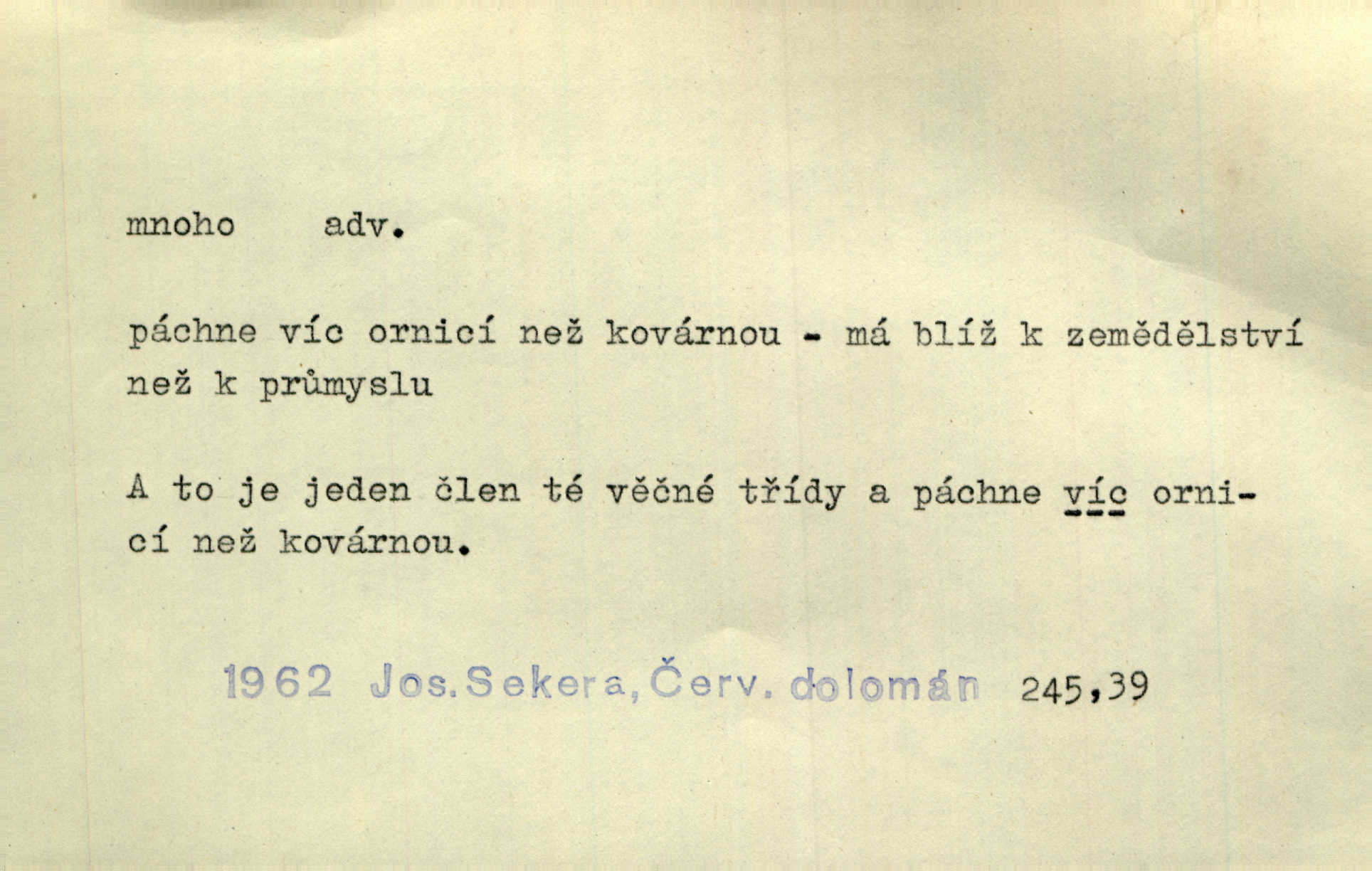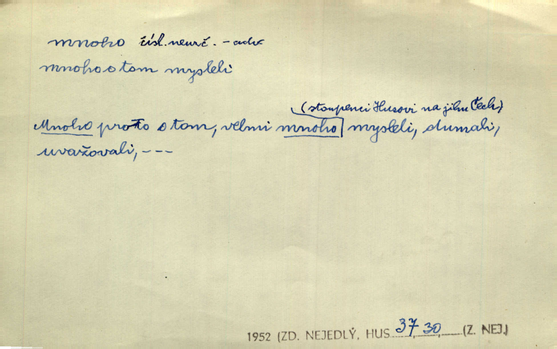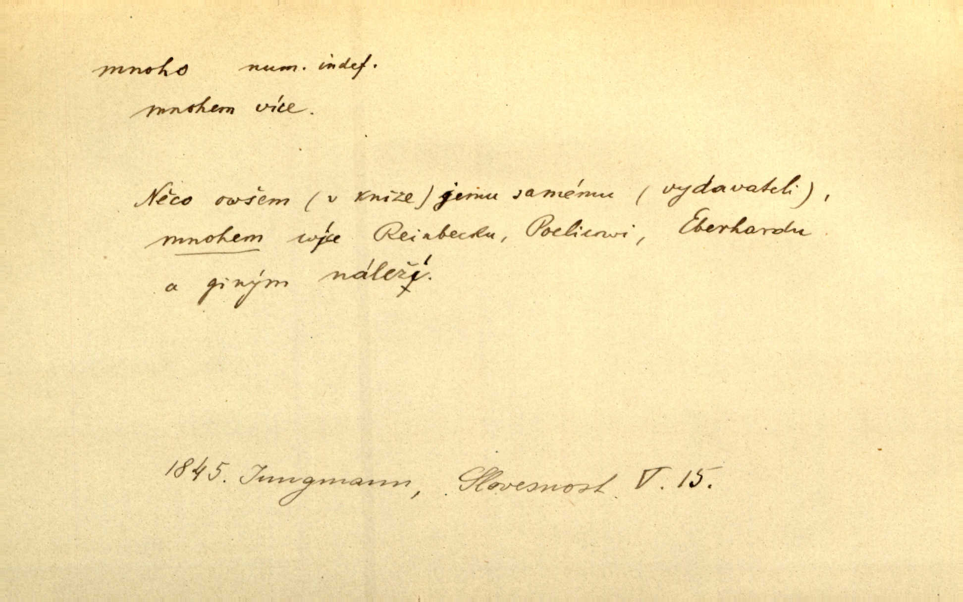 - mnoho adv. (komp. více, víc) velké množství, hodně (op. málo). Mnoho řečí v domě nenadělala. Šmil. Provázej Pán Bůh a mnoho štěstí! Baar. Mnoho povolaných, málo vyvolených. Přísl. Mnoho křiku, málo vlny. Pořek. Stařec mnoho pamatuje. Erb. Mámť důvody, jež mnoho váží. Šmil. Víte, že je mi dáno, abych mlčela a snáším raději křivdu, než bych se hájila. Ale co je mnoho, je mnoho je přílišné. Herrm. Na městě [Neapoli] samém ovšem není mnoho, kdo viděl Řím, Benátky, Cařihrad, podiví se střízlivé jednotvárnosti Neapole veliký počet věcí pozoruhodných. Ner. Myslil si [student] o sobě velmi mnoho. Svob. D Subst. mnoho, -a n. (výraz počítaného předmětu je v gen.; pravidlem je i v dat., lok., instr. tvar mnoha, a pak je výraz počítaného předmětu v pádě, kterého žádá souvislost) velké množství, velká míra. Dávejte z mála málo, z mnoha mnoho. Koll. Po mnohu vždy lakomec jen baží. Chmela. Nad málem byl jsi věrný, nad mnohem tebe ustanovím. Bible. Jeho [drába] živobytí zdálo se mu býti o mnoho lepší a lepší nežli sedláků mnohem. Herb. Historie páně Kondelíkova podobá se historii mnoha set malých živnostníků. Herrm. Poprvé po mnohu neděl pohrál si radostný úsměch rtoma jeho. Choch. Zločinec již od mnoha let krádeže páchal. Rozm. O mnoha věcech Frid. Ratzel ukázal přenesení aesthetických forem z krajin velmi vzdálených. Ath. Bylo to před ne mnoha lety. Pfleg. D adv. velkou měrou, velmi hodně. Zvlášť se ujímal mnoho študentů chudých. Něm. Však jsem právě přišla poprosit, aby byli tak mnoho laskavý a přimluvili se. Jir. Holý býval nyní mnoho mimo dům. Podl. D mnoho-li adv. táz. s gen. subst. uvozuje otázku po množství neurčitém (otázku po množství určitém uvozuje adv. kolik), jinak uvozuje otázku po množství vůbec: jak mnoho? kolik? Mnoho-li jsi zas asi za tuto noc polámal stromů, sklátil hnízd, zničil květů [vichr]? Svět. Listonoš byl vyslýchán, mnoho-li dopisů přišlo na Tomáše. Mah. Povím vám tedy jen z hlavy, co a mnoho-li mi koupíte. Svět. D Expr. (ve zvolání) vyjadřuje velký počet: velmi mnoho. Láska! … Mnoho-li se již asi o ní namluvilo a mnoho-li napsalo! A mnoho-li ještě napíše! Tyl. D adv. vztaž. vyjadřuje ve své větě počet, množství něčeho, které je ve vztahu k větě řídící. Při veškeré obětivosti nemohlo se tolik sebrat, mnoho-li bylo na stavbu třeba. Jir.