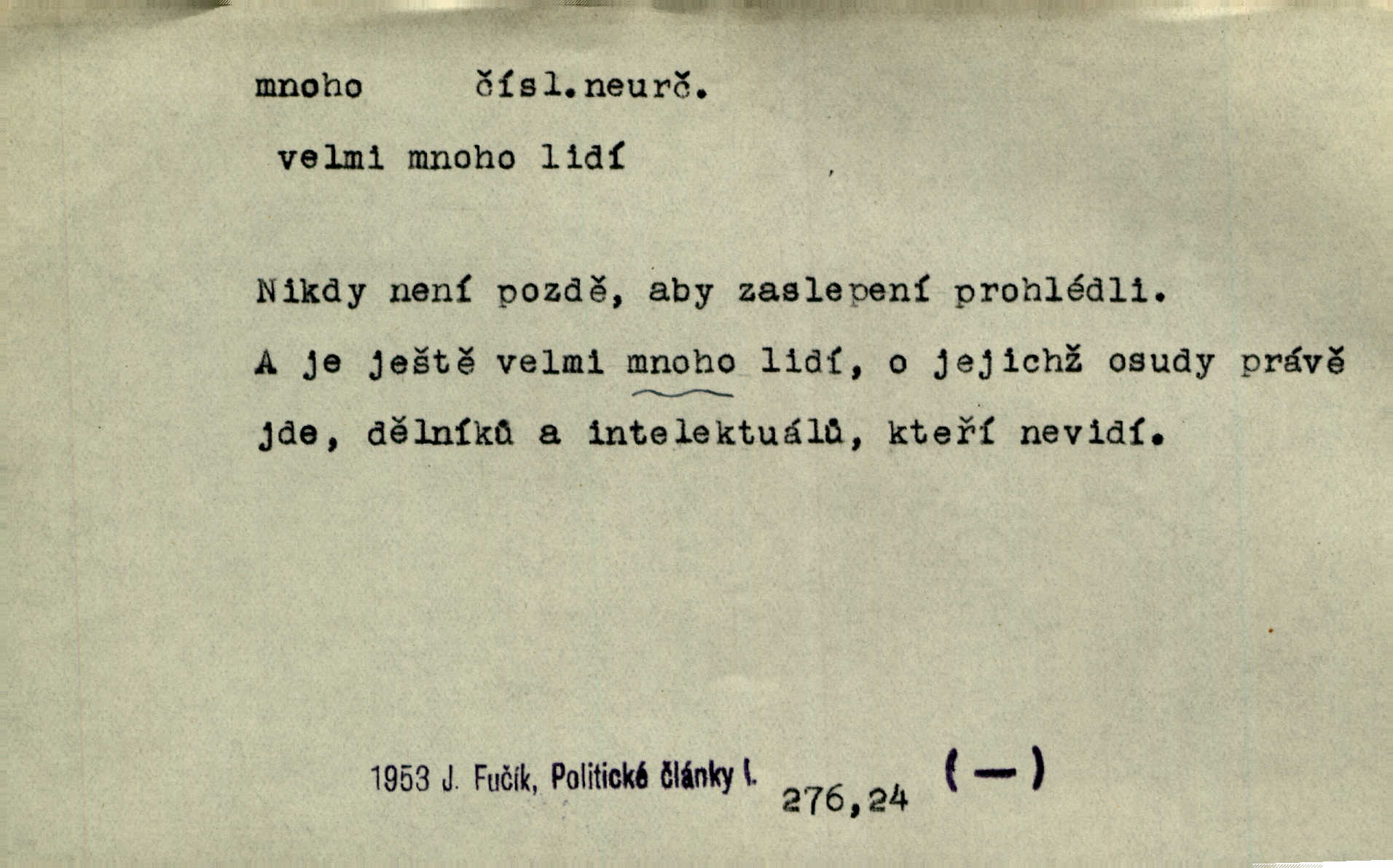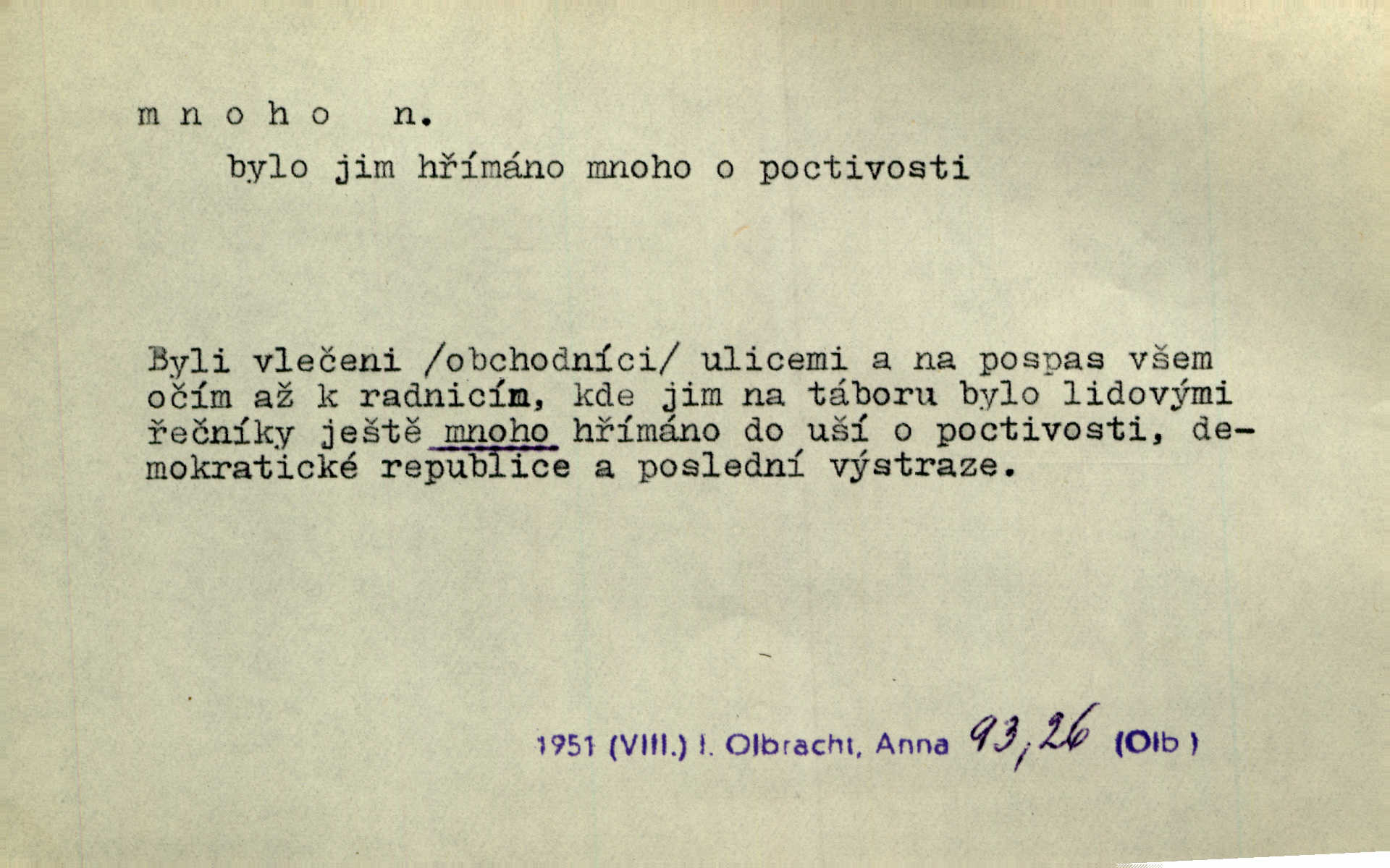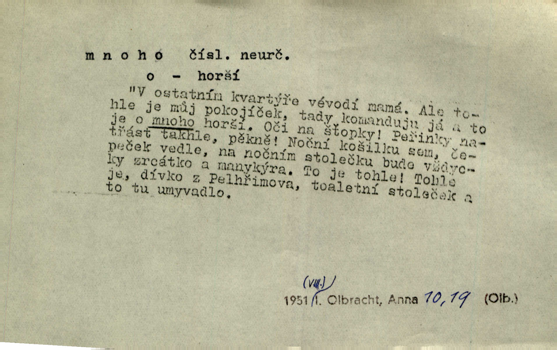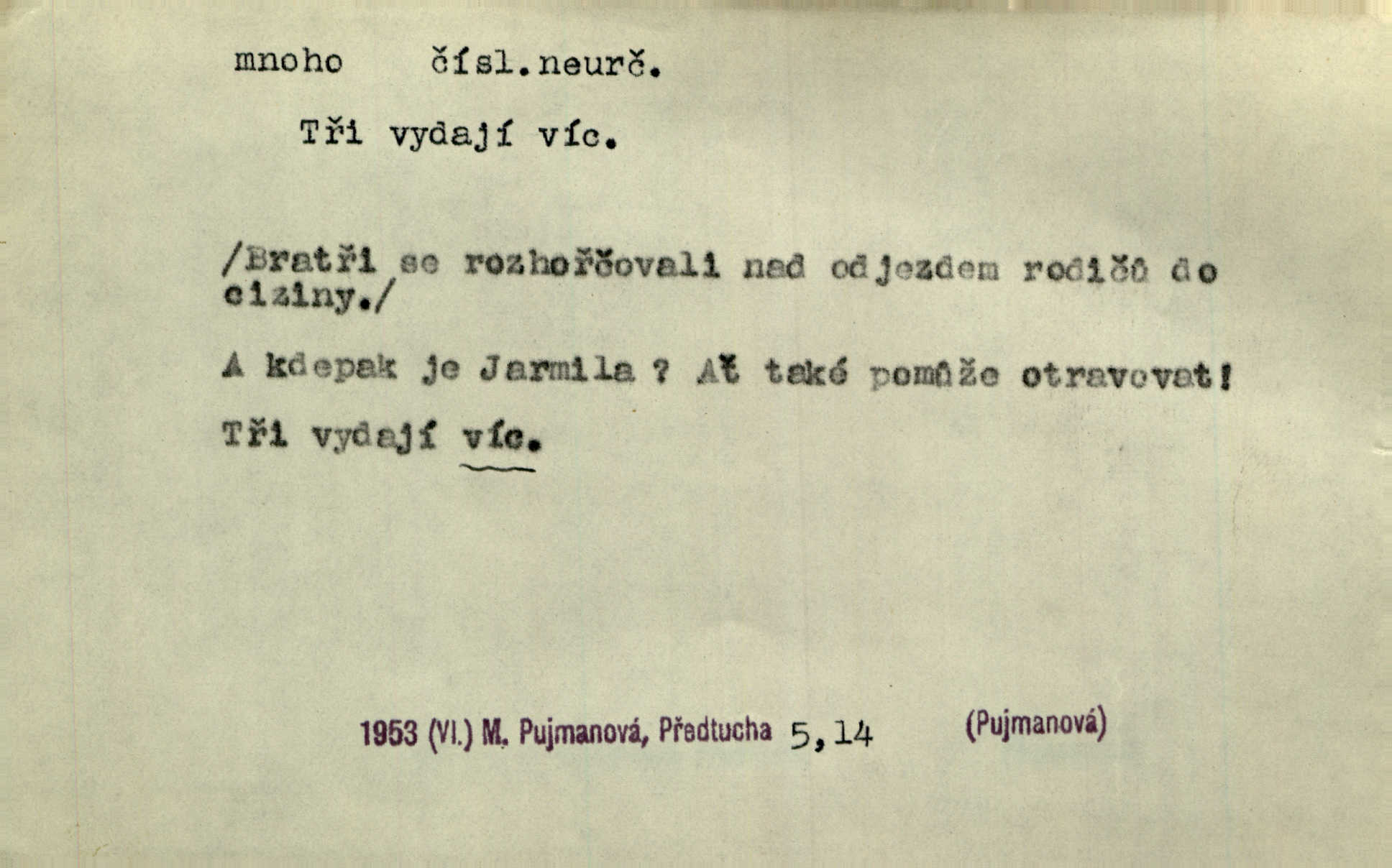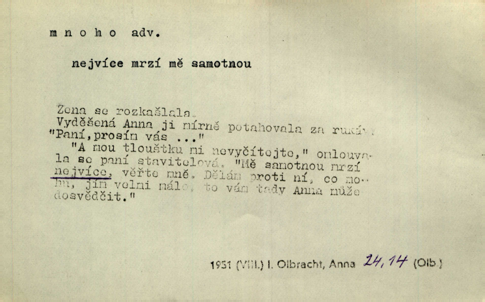 - mnoho adv. (komp. více, víc) velké množství, hodně (op. málo). Mnoho řečí v domě nenadělala. Šmil. Provázej Pán Bůh a mnoho štěstí! Baar. Mnoho povolaných, málo vyvolených. Přísl. Mnoho křiku, málo vlny. Pořek. Stařec mnoho pamatuje. Erb. Mámť důvody, jež mnoho váží. Šmil. Víte, že je mi dáno, abych mlčela a snáším raději křivdu, než bych se hájila. Ale co je mnoho, je mnoho je přílišné. Herrm. Na městě [Neapoli] samém ovšem není mnoho, kdo viděl Řím, Benátky, Cařihrad, podiví se střízlivé jednotvárnosti Neapole veliký počet věcí pozoruhodných. Ner. Myslil si [student] o sobě velmi mnoho. Svob. D Subst. mnoho, -a n. (výraz počítaného předmětu je v gen.; pravidlem je i v dat., lok., instr. tvar mnoha, a pak je výraz počítaného předmětu v pádě, kterého žádá souvislost) velké množství, velká míra. Dávejte z mála málo, z mnoha mnoho. Koll. Po mnohu vždy lakomec jen baží. Chmela. Nad málem byl jsi věrný, nad mnohem tebe ustanovím. Bible. Jeho [drába] živobytí zdálo se mu býti o mnoho lepší a lepší nežli sedláků mnohem. Herb. Historie páně Kondelíkova podobá se historii mnoha set malých živnostníků. Herrm. Poprvé po mnohu neděl pohrál si radostný úsměch rtoma jeho. Choch. Zločinec již od mnoha let krádeže páchal. Rozm. O mnoha věcech Frid. Ratzel ukázal přenesení aesthetických forem z krajin velmi vzdálených. Ath. Bylo to před ne mnoha lety. Pfleg. D adv. velkou měrou, velmi hodně. Zvlášť se ujímal mnoho študentů chudých. Něm. Však jsem právě přišla poprosit, aby byli tak mnoho laskavý a přimluvili se. Jir. Holý býval nyní mnoho mimo dům. Podl. D mnoho-li adv. táz. s gen. subst. uvozuje otázku po množství neurčitém (otázku po množství určitém uvozuje adv. kolik), jinak uvozuje otázku po množství vůbec: jak mnoho? kolik? Mnoho-li jsi zas asi za tuto noc polámal stromů, sklátil hnízd, zničil květů [vichr]? Svět. Listonoš byl vyslýchán, mnoho-li dopisů přišlo na Tomáše. Mah. Povím vám tedy jen z hlavy, co a mnoho-li mi koupíte. Svět. D Expr. (ve zvolání) vyjadřuje velký počet: velmi mnoho. Láska! … Mnoho-li se již asi o ní namluvilo a mnoho-li napsalo! A mnoho-li ještě napíše! Tyl. D adv. vztaž. vyjadřuje ve své větě počet, množství něčeho, které je ve vztahu k větě řídící. Při veškeré obětivosti nemohlo se tolik sebrat, mnoho-li bylo na stavbu třeba. Jir.