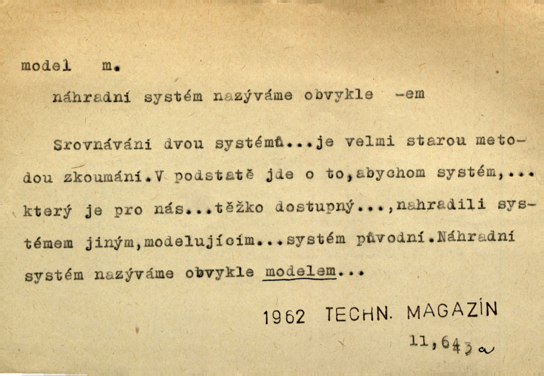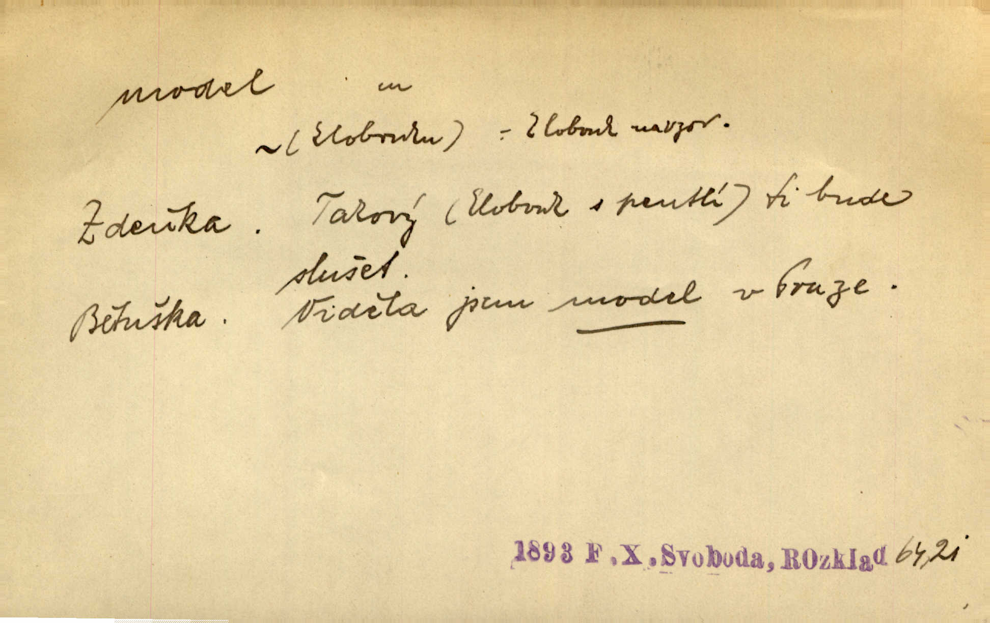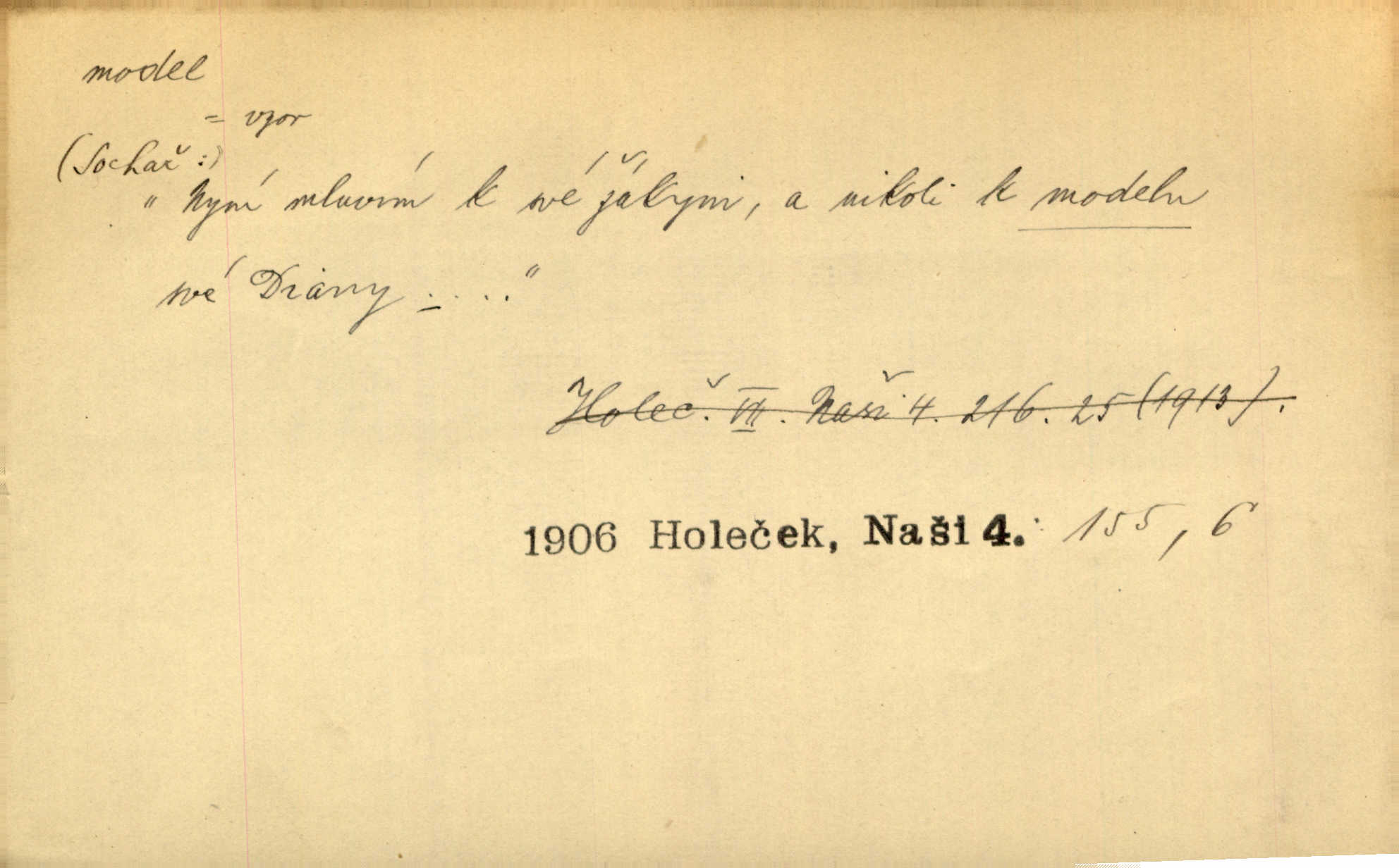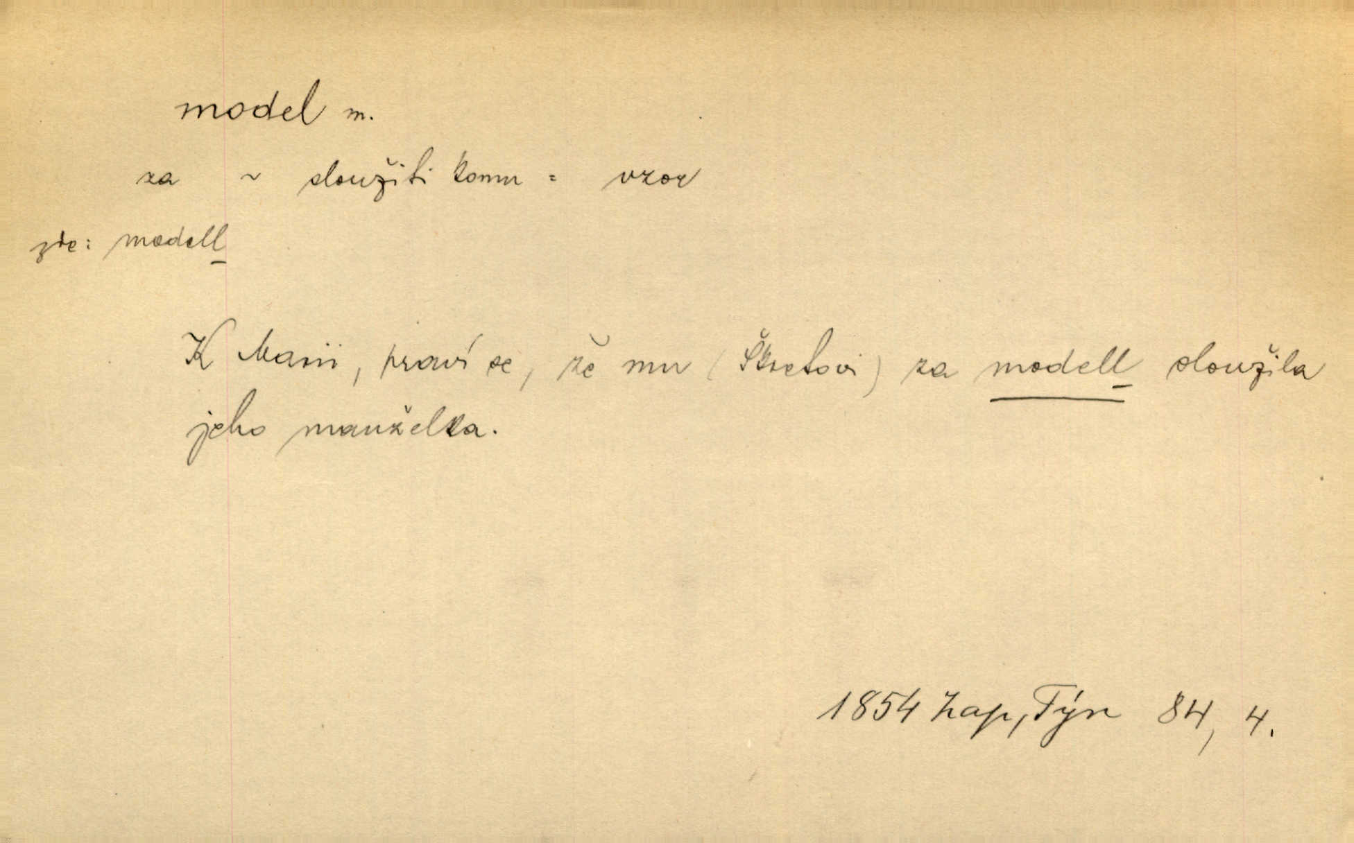 - model, -u m. věc n. osoba, která je předlohou k uměleckému tvoření, zvl. výtvarnému. Mám teď malovat svatého Krišpína, pan doktor by mně mohl sedět modelem. Ner. Do večerního aktu pro štukatéry chodil teď mužský model. Čap. Ch. Nyní mluvím k své žákyni, a nikoli k modelu Diany. Hol. Také Zališ, houslista, přicházel do Hronova, můj model k jednomu z mých prvních „obrázků z hor“. Jir. Kolik je tu [v Dykově „Konci Hackenschmiedově“] předloh a modelů čistě literárních! Šal. Výtv. živý model. D plastické podrobné znázornění stroje, stavby a pod., zprav. ve zmenšeném měřítku. Já jsem sestrojil svůj Perfect Carburator zprvu jen theoreticky. Pak jsem udělal malý model, který neběžel. Teprve čtvrtý model se opravdu točil. K. Čap. Tentokráte zničil mu požár duševní majetek, šedesát modelů rozličných strojů. Jir. Nevelký model mešity mekkské. Ner. Máte vylíčenu vlašskou chalupu tak, že byste dle líčení mohli modell její sestaviti. Ath. V rohu stolu nakupeno bylo několik slepených již modelů stereometrických těles. Šim. Fys. model atomu znázornění složení atomu. Slév. pomůcka, kterou se vytvořují dutiny ve formě. D Tech. typ, způsob provedení. Model auta, letadla, stroje, děla a pod. D Oděv. model na módní přehlídce (v t. zv. modelových domech) originální výrobek oděvnický, vzor, podle něhož se vyrábějí kusy další.