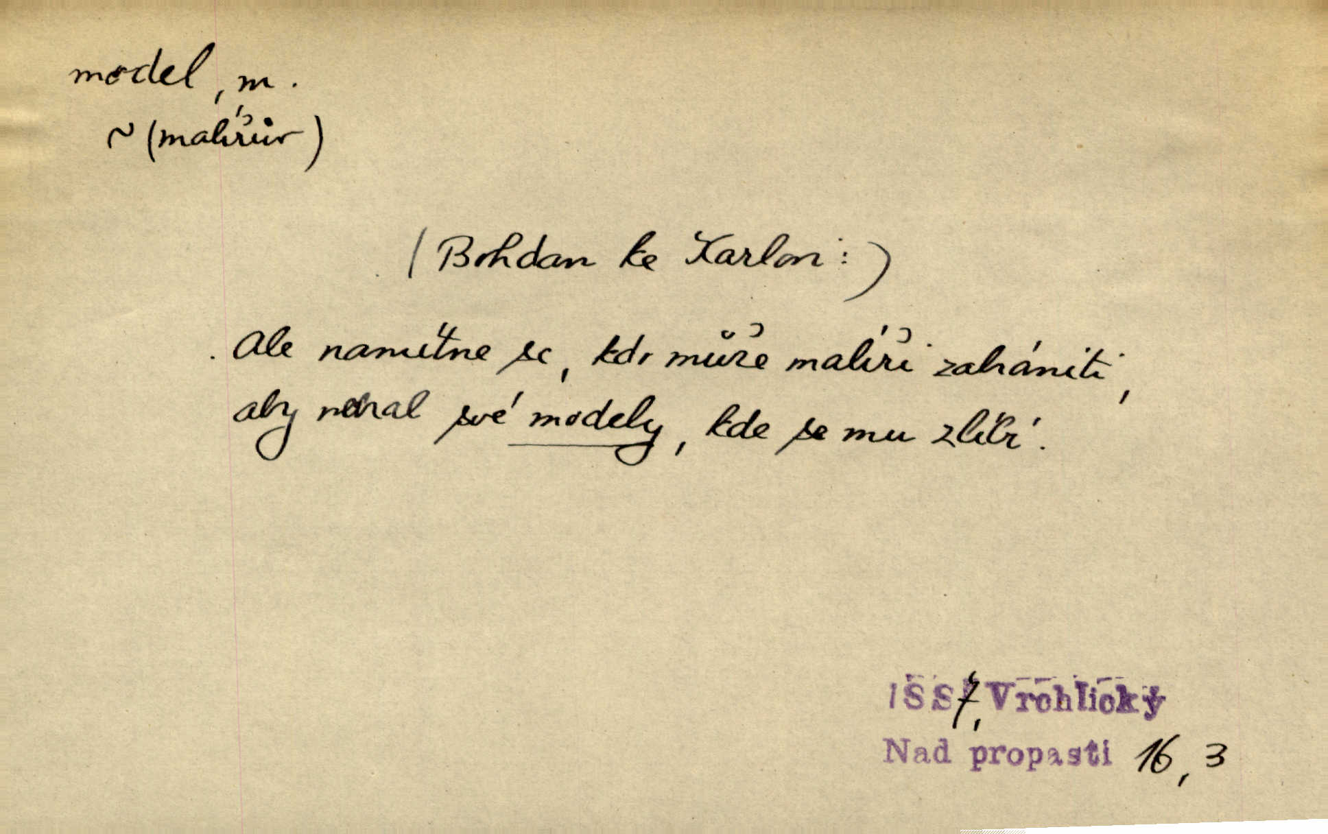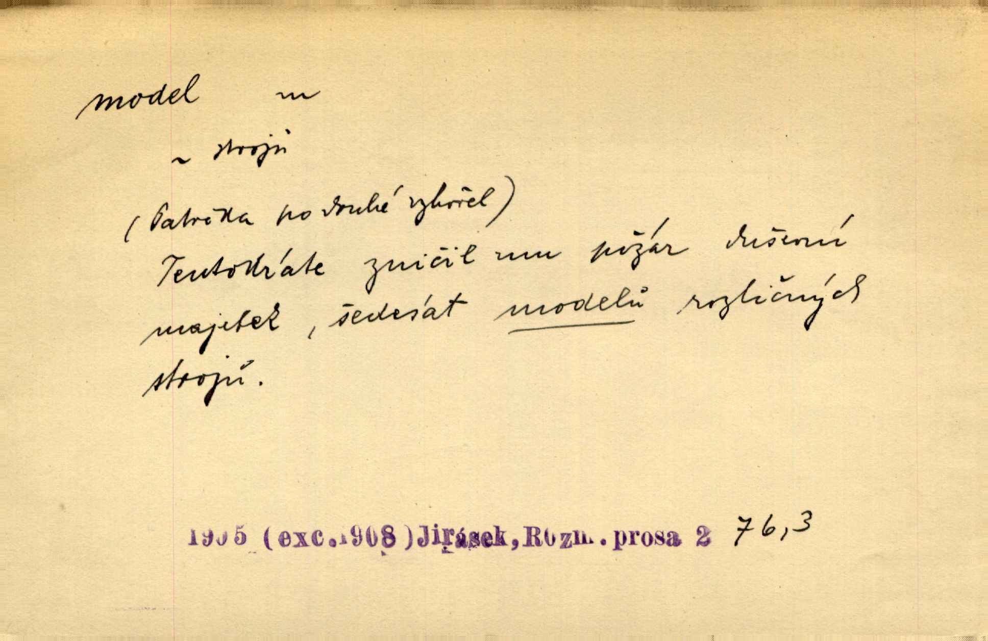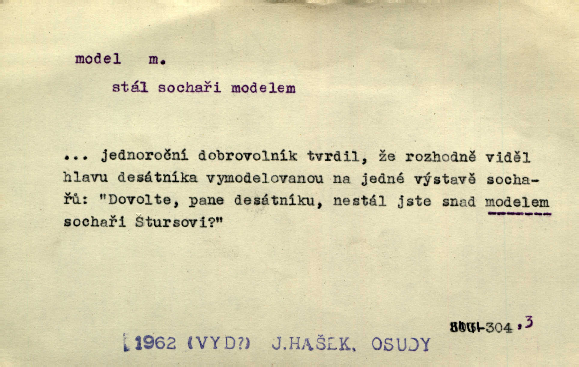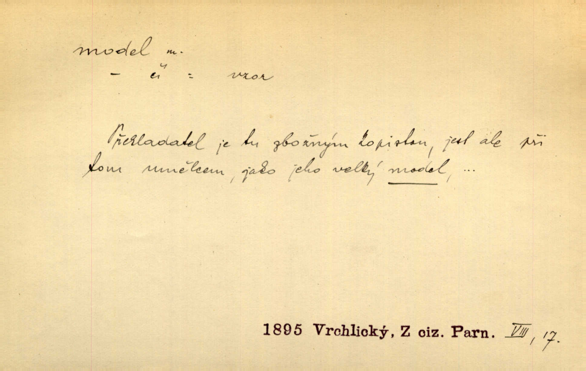 - model, -u m. věc n. osoba, která je předlohou k uměleckému tvoření, zvl. výtvarnému. Mám teď malovat svatého Krišpína, pan doktor by mně mohl sedět modelem. Ner. Do večerního aktu pro štukatéry chodil teď mužský model. Čap. Ch. Nyní mluvím k své žákyni, a nikoli k modelu Diany. Hol. Také Zališ, houslista, přicházel do Hronova, můj model k jednomu z mých prvních „obrázků z hor“. Jir. Kolik je tu [v Dykově „Konci Hackenschmiedově“] předloh a modelů čistě literárních! Šal. Výtv. živý model. D plastické podrobné znázornění stroje, stavby a pod., zprav. ve zmenšeném měřítku. Já jsem sestrojil svůj Perfect Carburator zprvu jen theoreticky. Pak jsem udělal malý model, který neběžel. Teprve čtvrtý model se opravdu točil. K. Čap. Tentokráte zničil mu požár duševní majetek, šedesát modelů rozličných strojů. Jir. Nevelký model mešity mekkské. Ner. Máte vylíčenu vlašskou chalupu tak, že byste dle líčení mohli modell její sestaviti. Ath. V rohu stolu nakupeno bylo několik slepených již modelů stereometrických těles. Šim. Fys. model atomu znázornění složení atomu. Slév. pomůcka, kterou se vytvořují dutiny ve formě. D Tech. typ, způsob provedení. Model auta, letadla, stroje, děla a pod. D Oděv. model na módní přehlídce (v t. zv. modelových domech) originální výrobek oděvnický, vzor, podle něhož se vyrábějí kusy další.