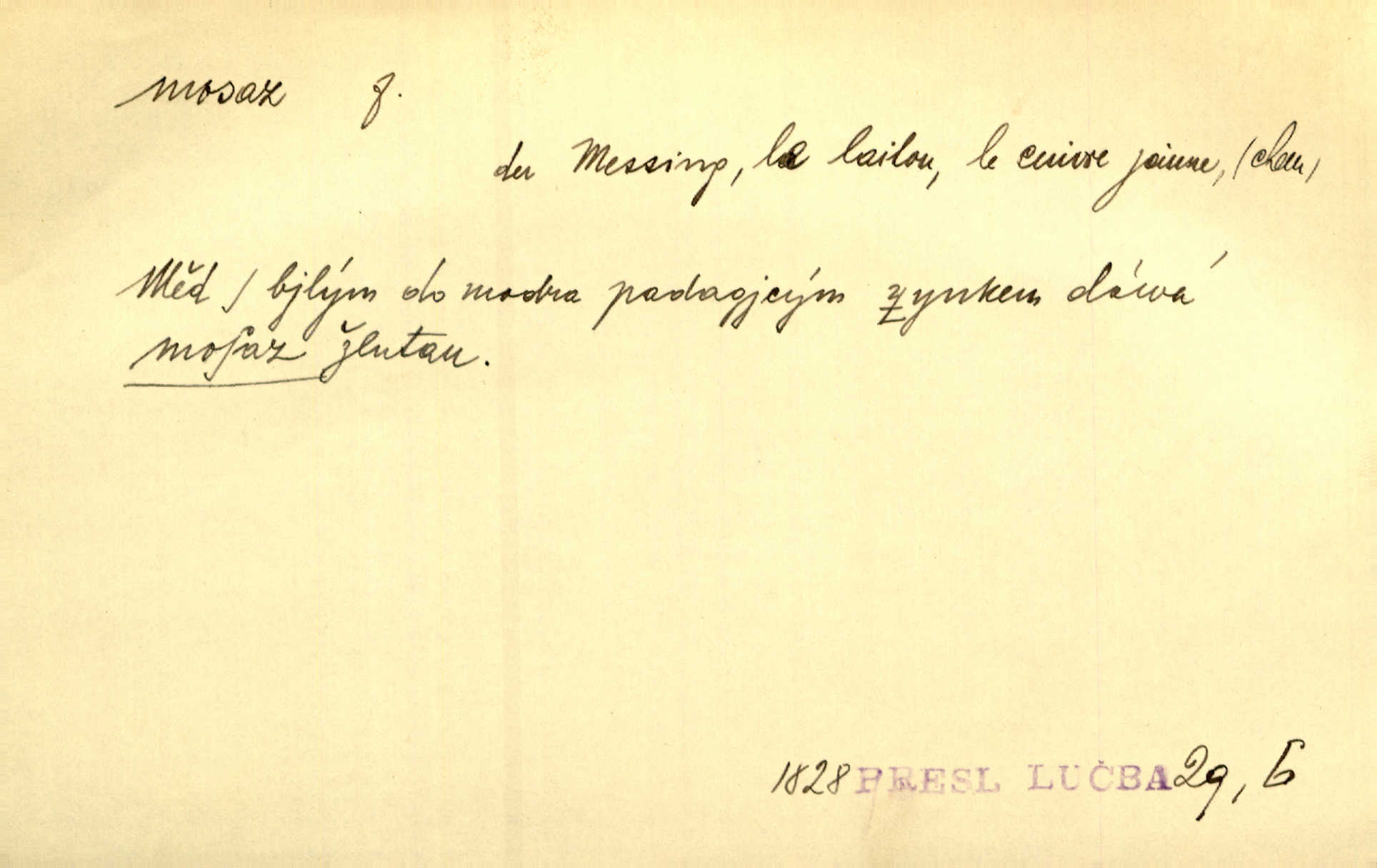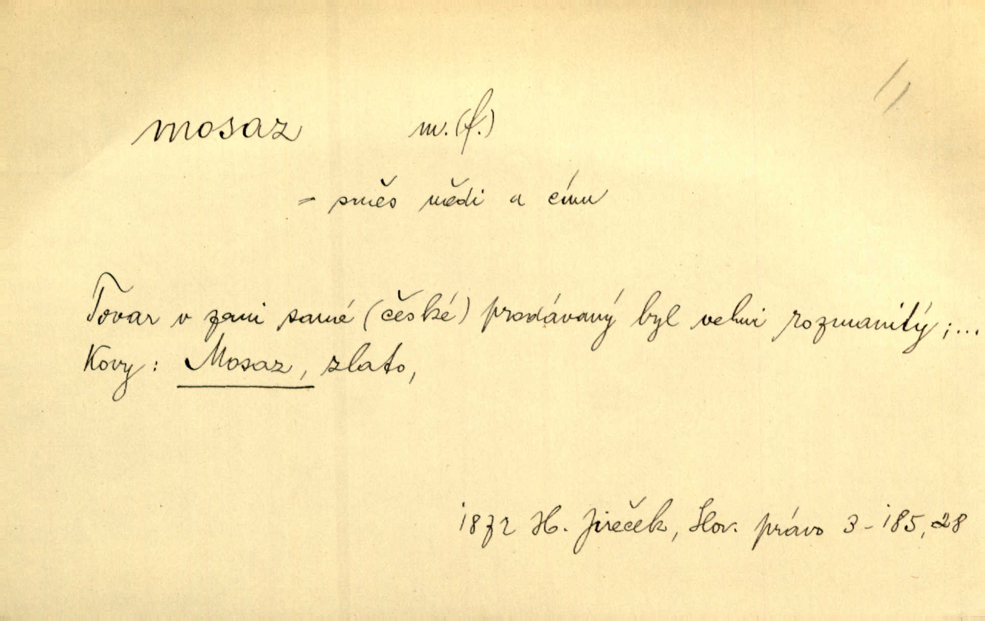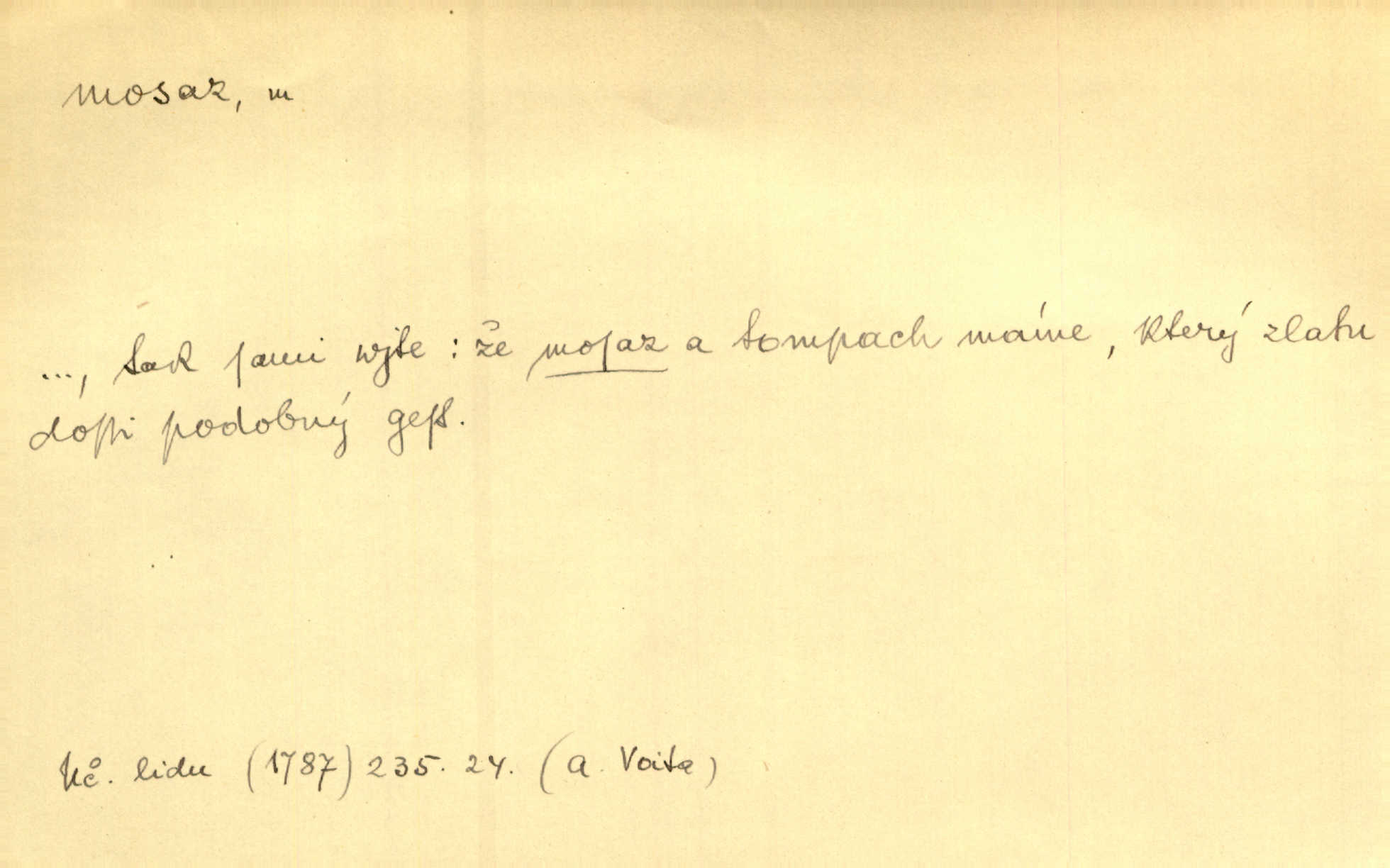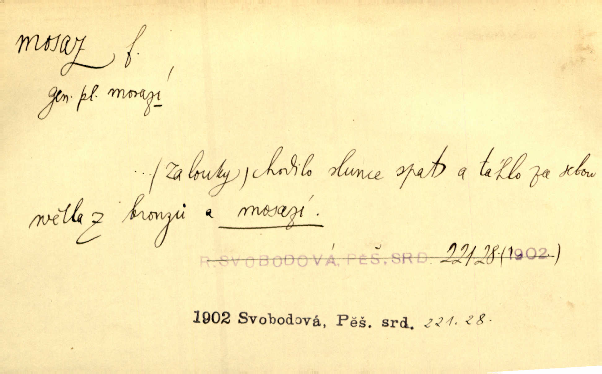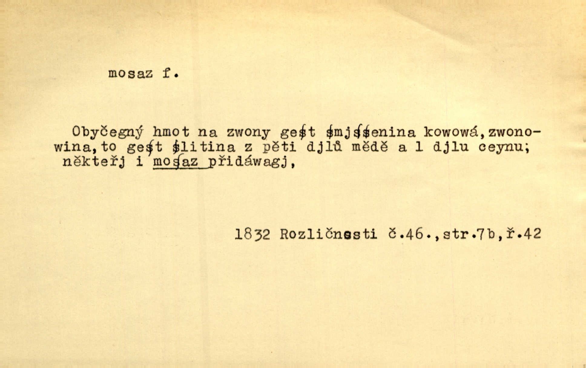 - mosaz, -i f., řidč. mosaz, -u m., slitina mědi se zinkem. Mosazem se blýská řemení. Krás. Výčepní stůl v baru zářil křišťálovým sklem, niklem a mosazí. Maj. Řemení formanských koní bylo až těžké svými ozdobami, nejvíce z lesklé mosaze. Jir. Dívčina s velkými, tenkými kruhy z mosazi v uších. Čech. D mosaz, -u m. předmět vyrobený z mosazi. Muzikanti foukali do dřeva a do mosazu až k ohlušení hudebních nástrojů z mosazi. Ehrenb. Páni hudebníci foukají za stříbro do mosazu. Rub.