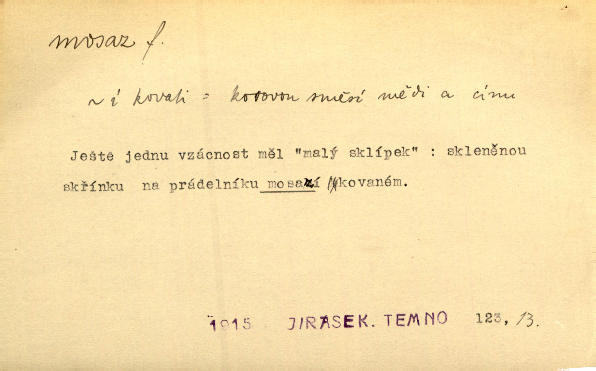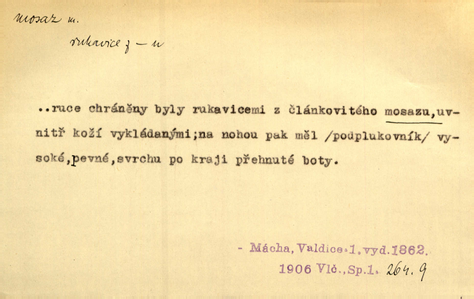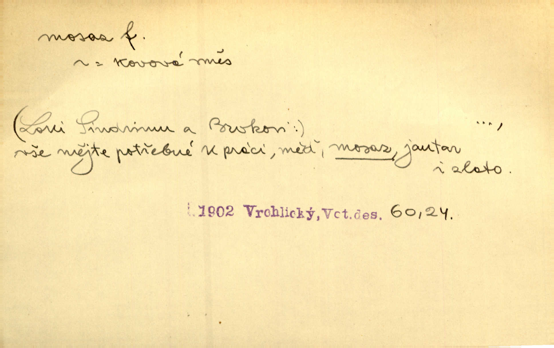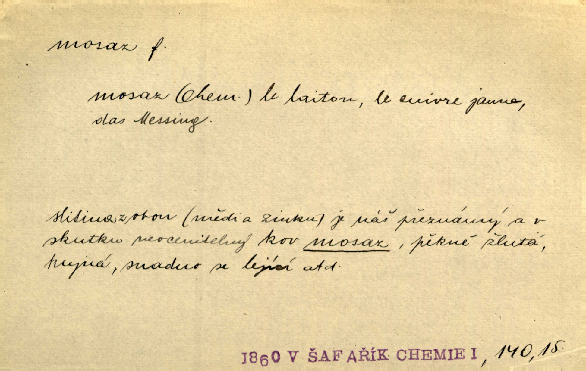 - mosaz, -i f., řidč. mosaz, -u m., slitina mědi se zinkem. Mosazem se blýská řemení. Krás. Výčepní stůl v baru zářil křišťálovým sklem, niklem a mosazí. Maj. Řemení formanských koní bylo až těžké svými ozdobami, nejvíce z lesklé mosaze. Jir. Dívčina s velkými, tenkými kruhy z mosazi v uších. Čech. D mosaz, -u m. předmět vyrobený z mosazi. Muzikanti foukali do dřeva a do mosazu až k ohlušení hudebních nástrojů z mosazi. Ehrenb. Páni hudebníci foukají za stříbro do mosazu. Rub.