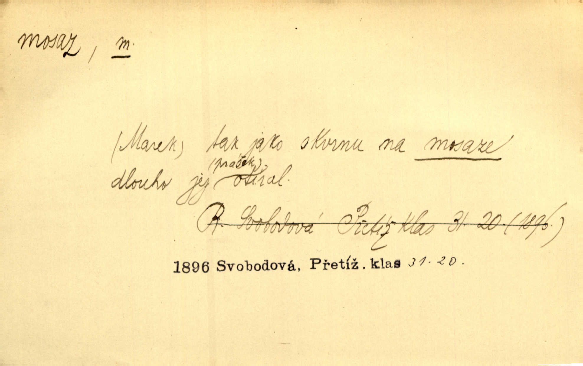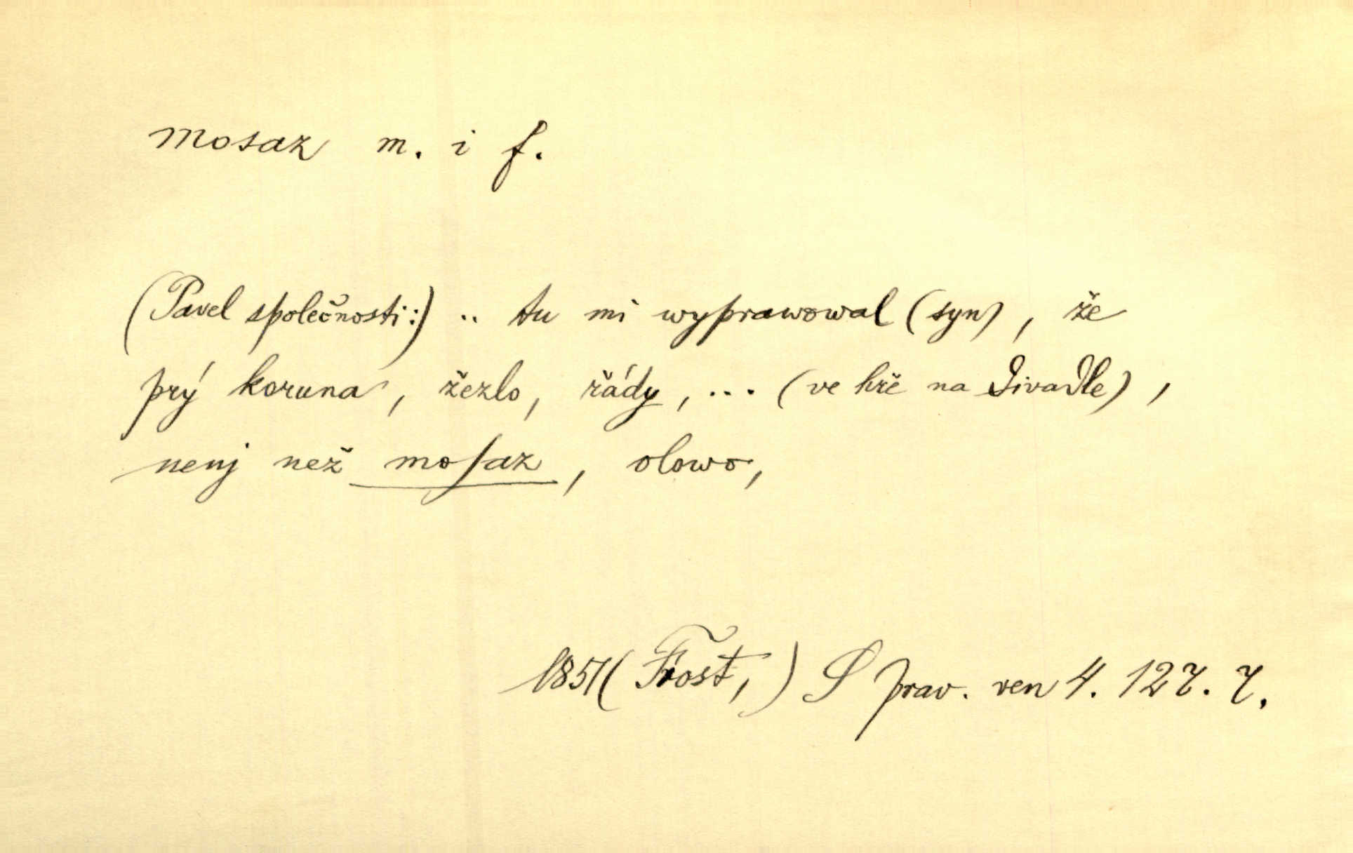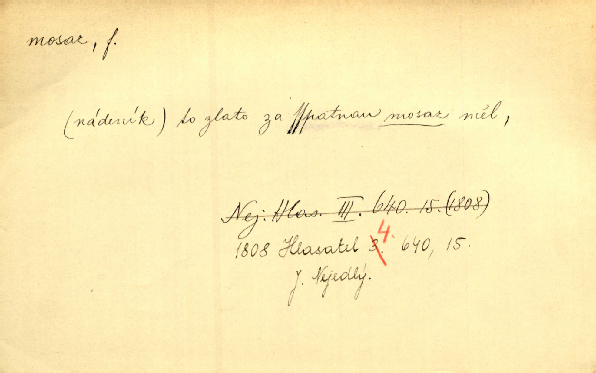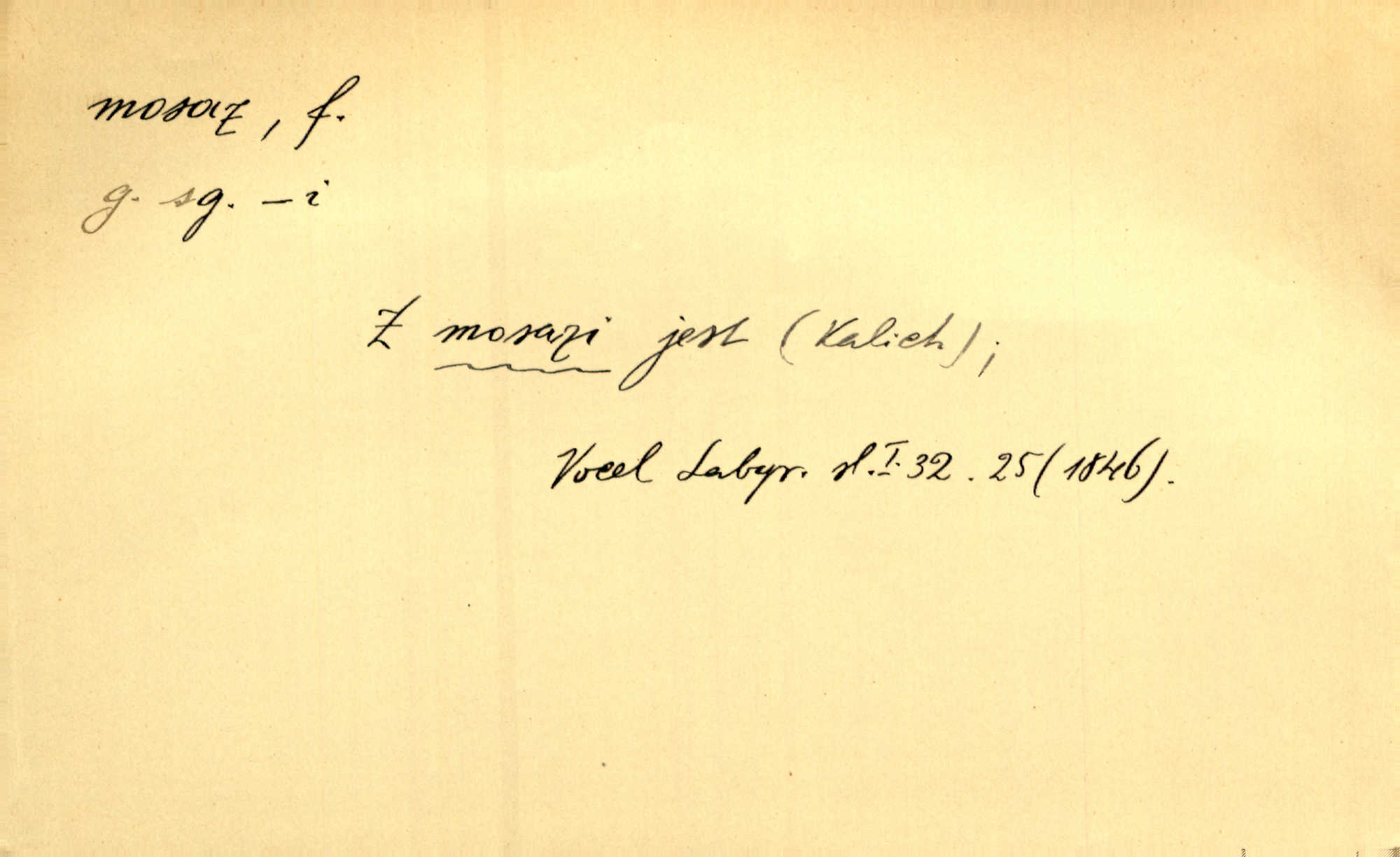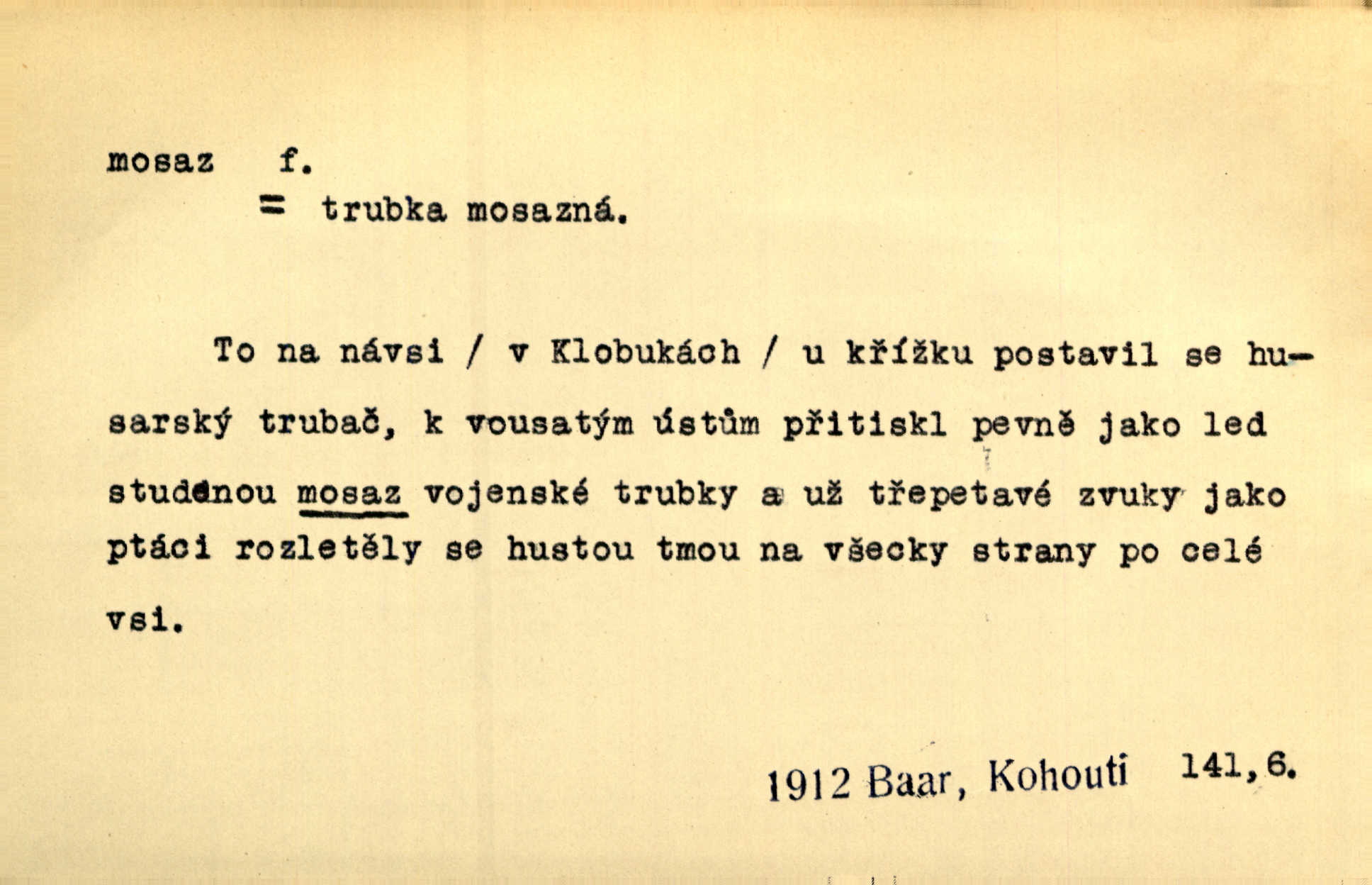 - mosaz, -i f., řidč. mosaz, -u m., slitina mědi se zinkem. Mosazem se blýská řemení. Krás. Výčepní stůl v baru zářil křišťálovým sklem, niklem a mosazí. Maj. Řemení formanských koní bylo až těžké svými ozdobami, nejvíce z lesklé mosaze. Jir. Dívčina s velkými, tenkými kruhy z mosazi v uších. Čech. D mosaz, -u m. předmět vyrobený z mosazi. Muzikanti foukali do dřeva a do mosazu až k ohlušení hudebních nástrojů z mosazi. Ehrenb. Páni hudebníci foukají za stříbro do mosazu. Rub.