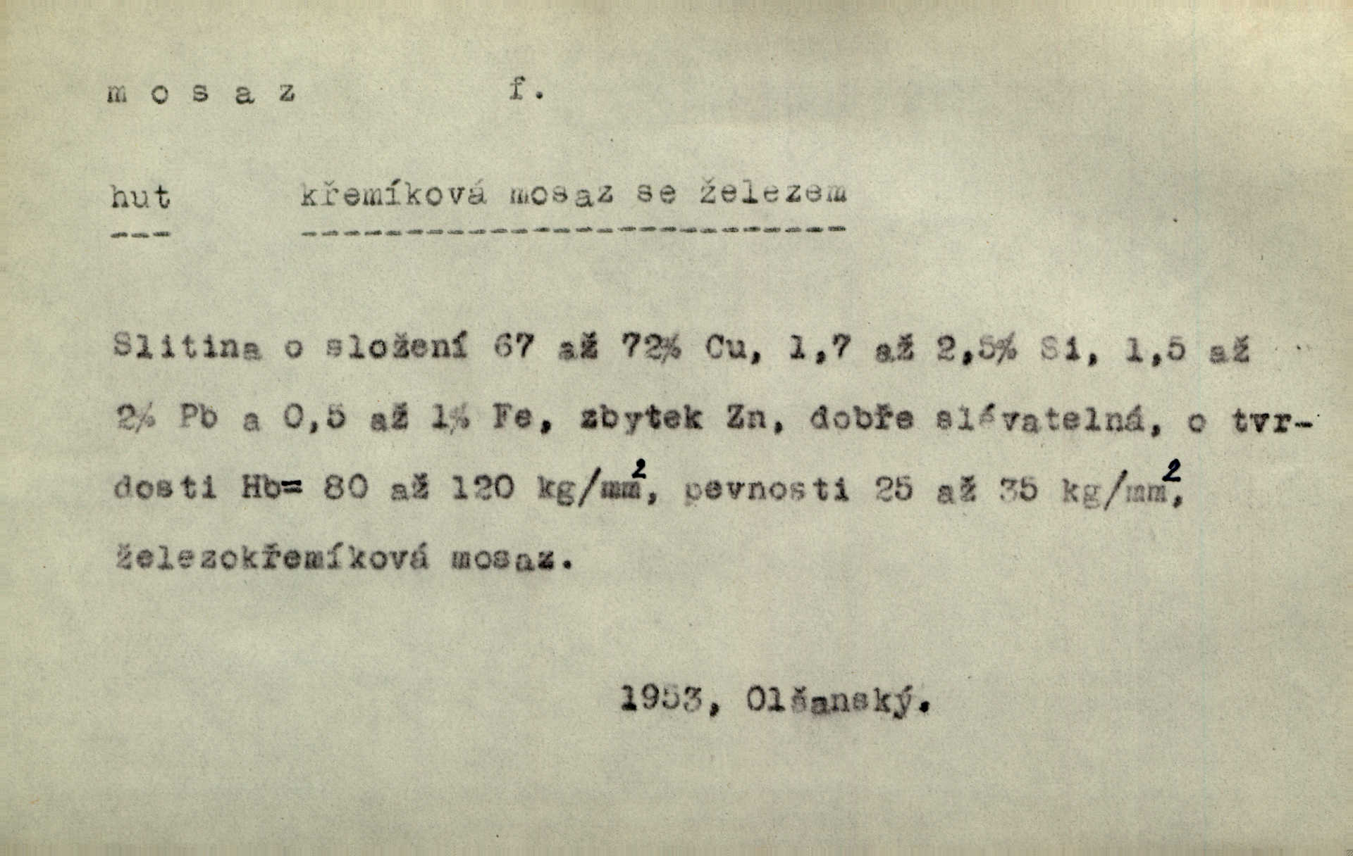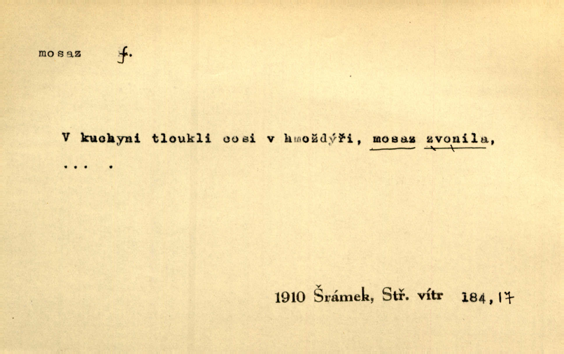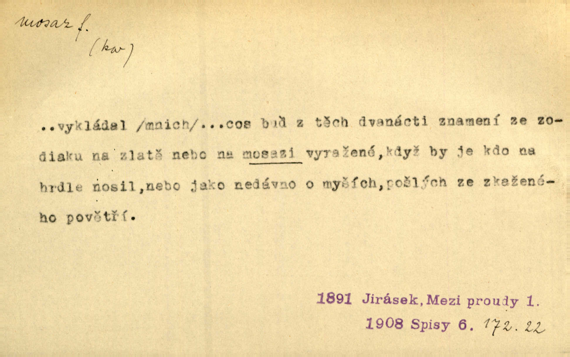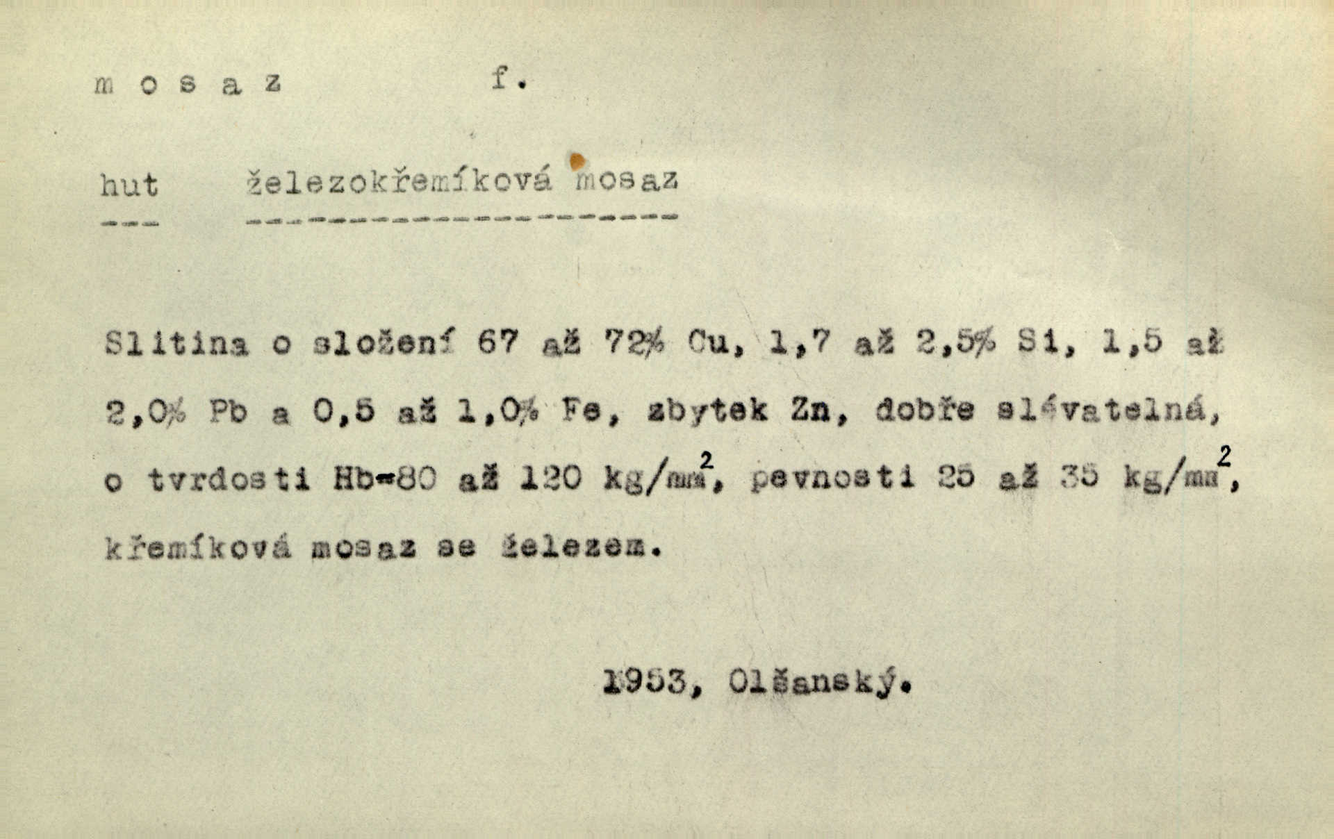 - mosaz, -i f., řidč. mosaz, -u m., slitina mědi se zinkem. Mosazem se blýská řemení. Krás. Výčepní stůl v baru zářil křišťálovým sklem, niklem a mosazí. Maj. Řemení formanských koní bylo až těžké svými ozdobami, nejvíce z lesklé mosaze. Jir. Dívčina s velkými, tenkými kruhy z mosazi v uších. Čech. D mosaz, -u m. předmět vyrobený z mosazi. Muzikanti foukali do dřeva a do mosazu až k ohlušení hudebních nástrojů z mosazi. Ehrenb. Páni hudebníci foukají za stříbro do mosazu. Rub.