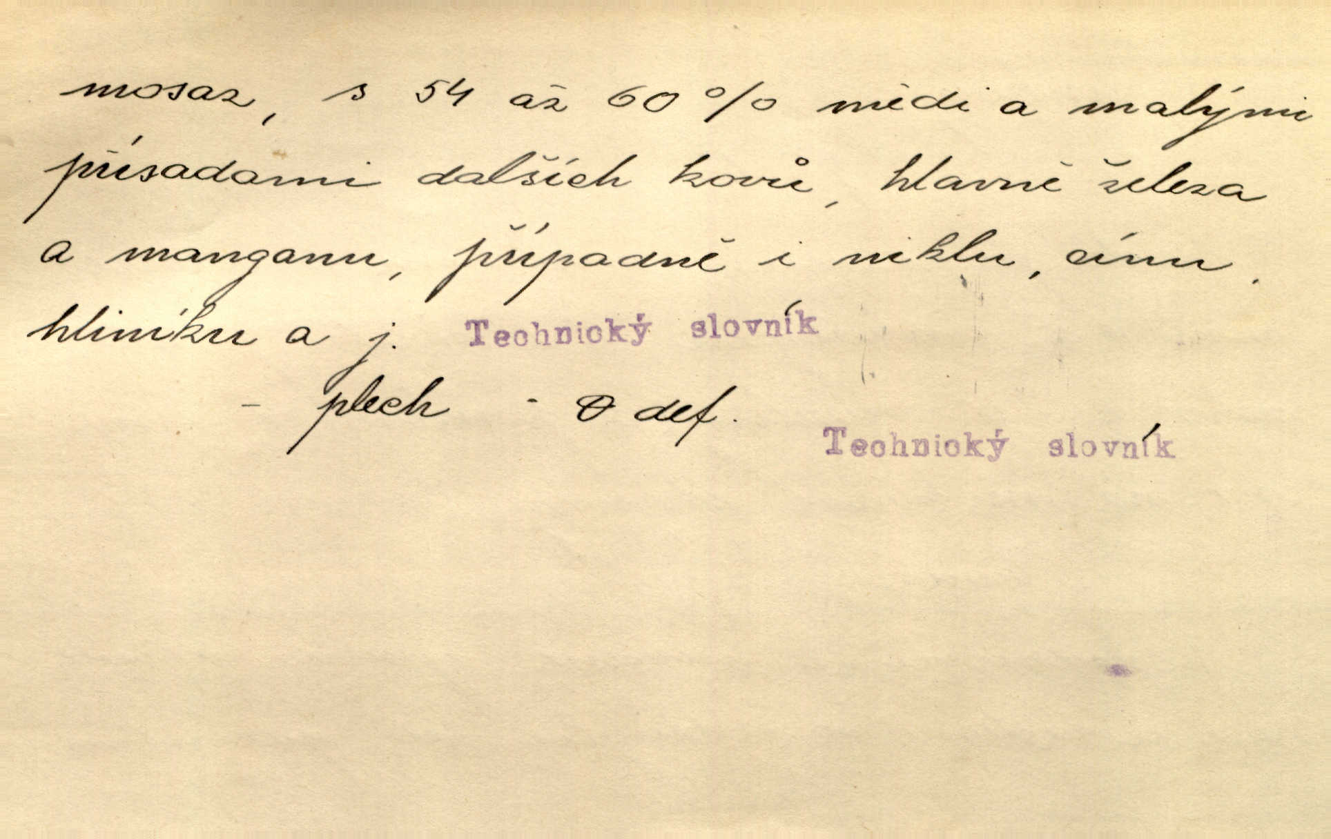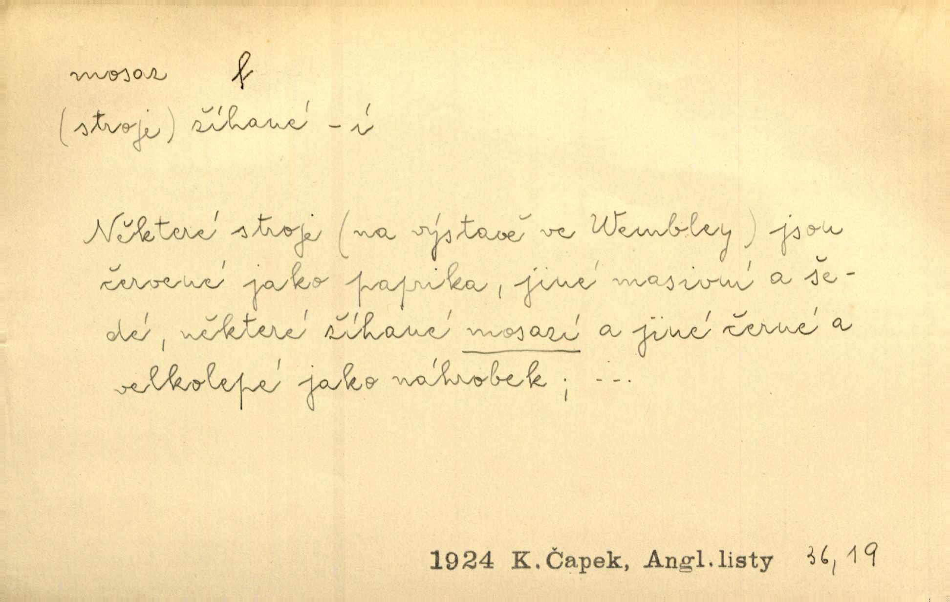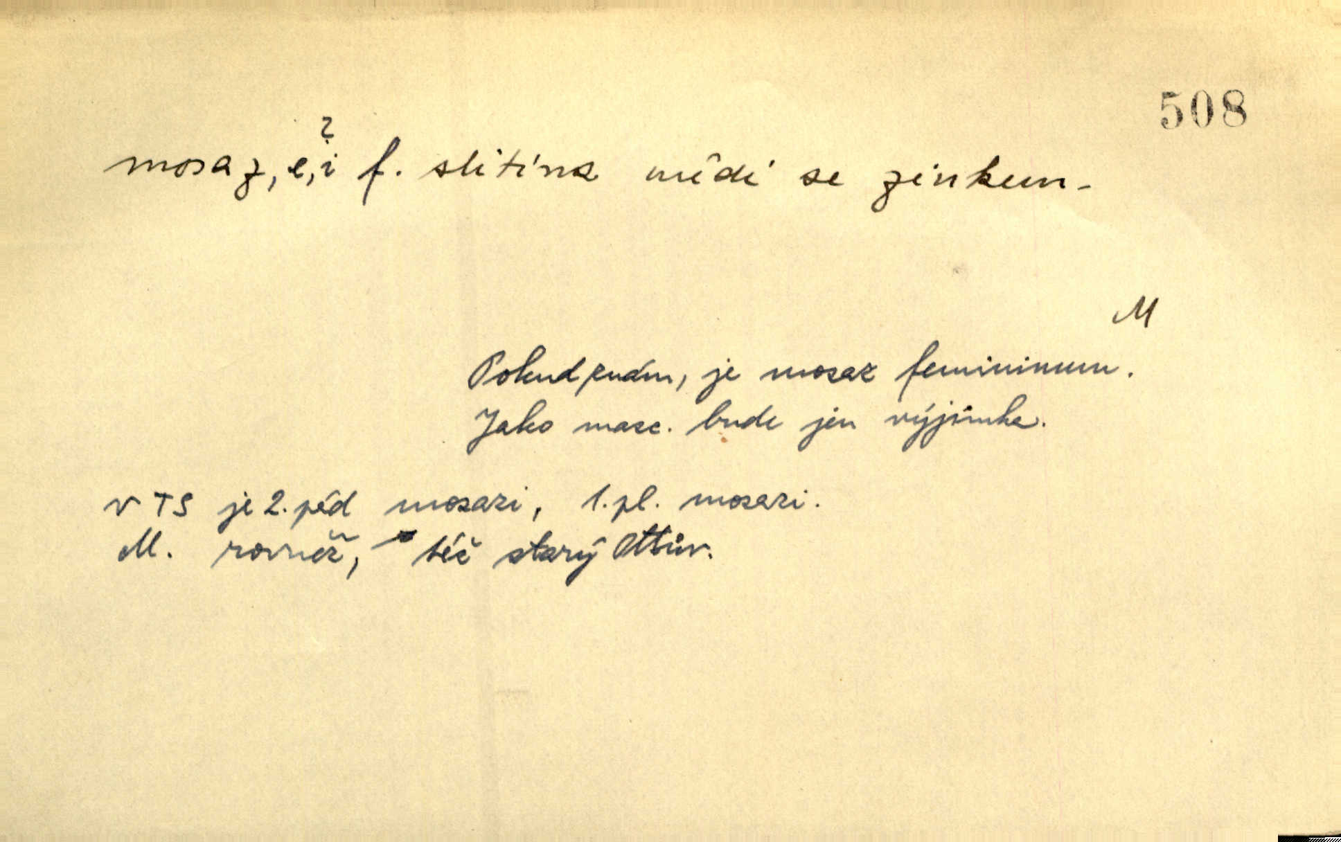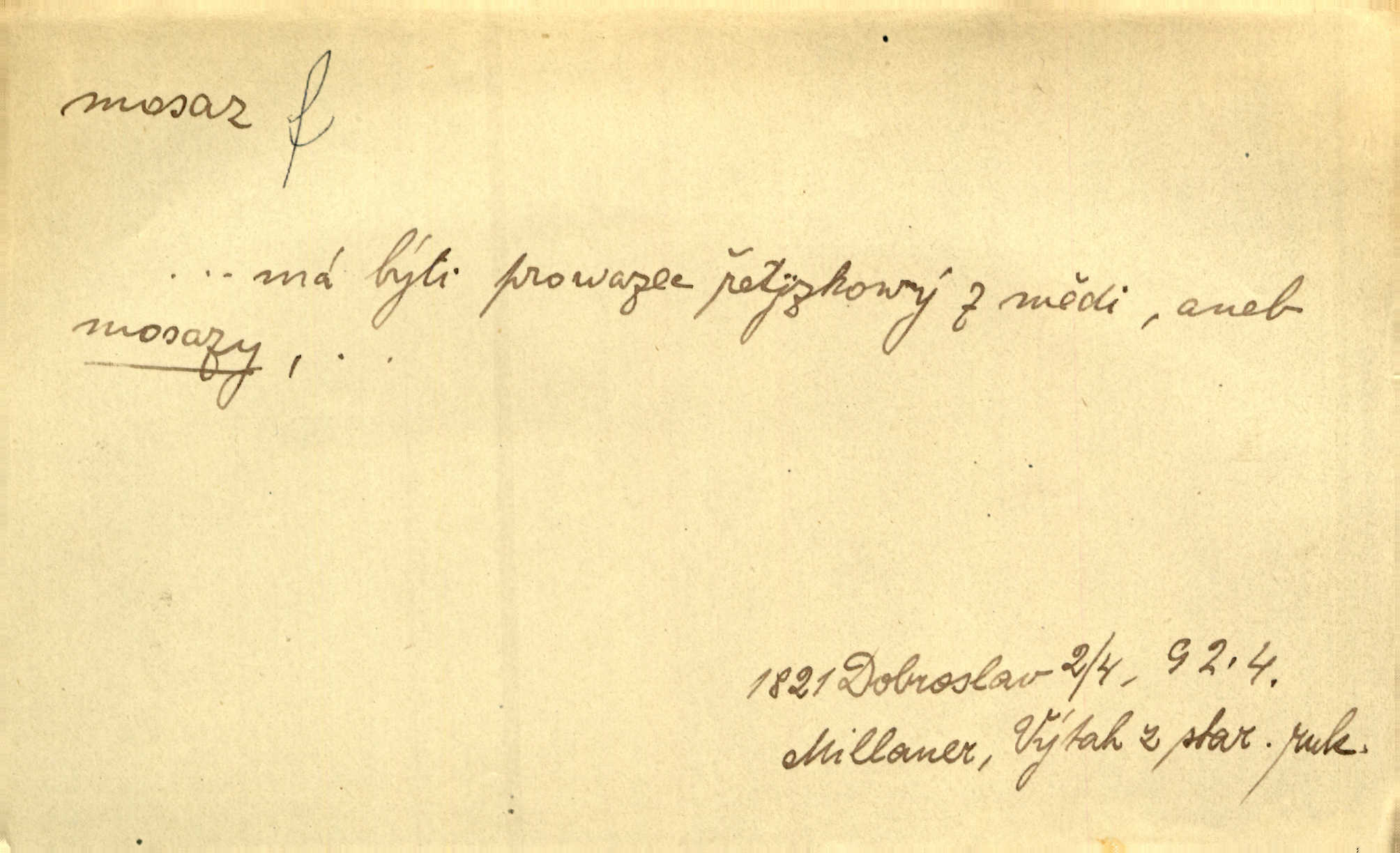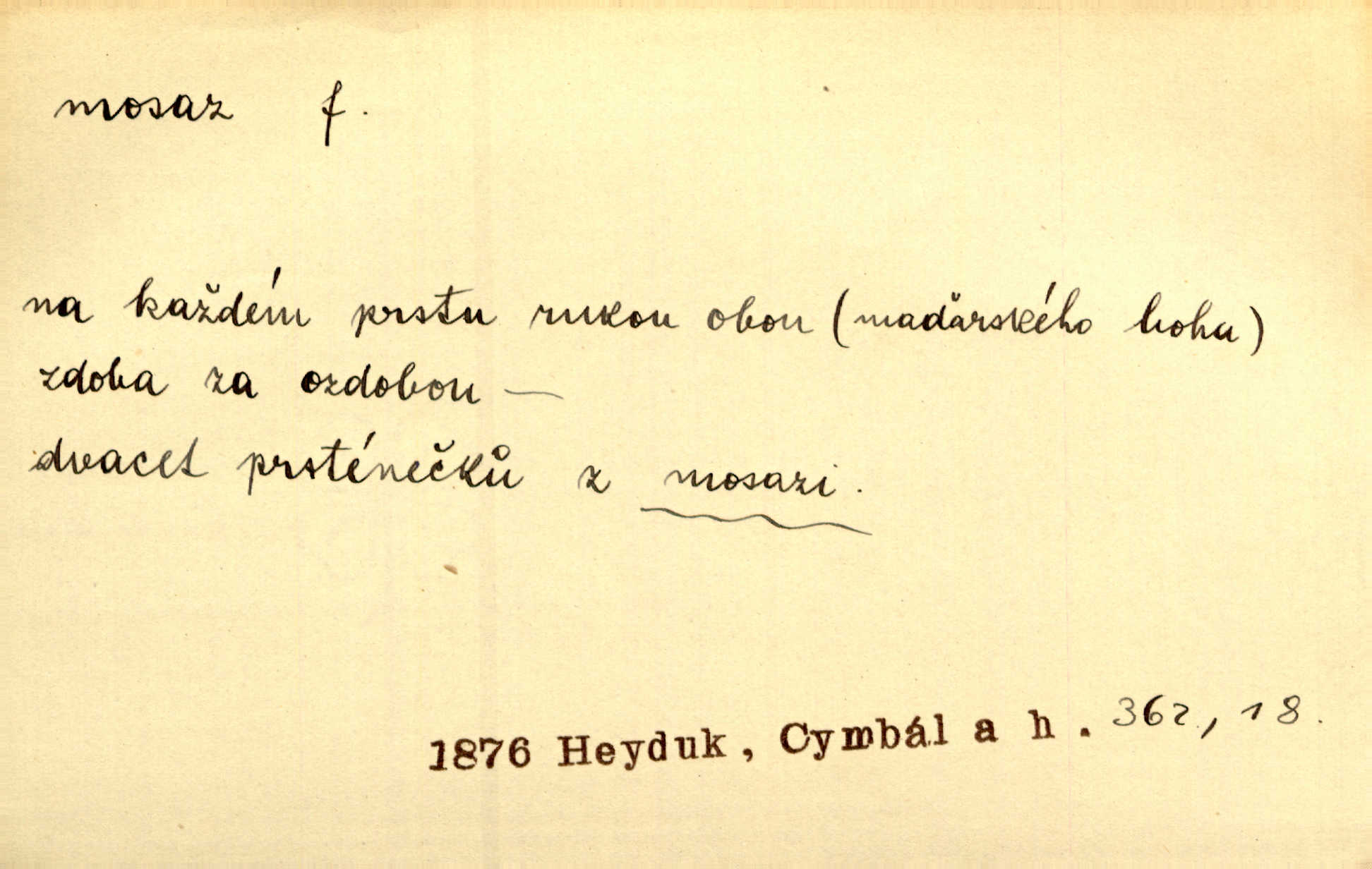 - mosaz, -i f., řidč. mosaz, -u m., slitina mědi se zinkem. Mosazem se blýská řemení. Krás. Výčepní stůl v baru zářil křišťálovým sklem, niklem a mosazí. Maj. Řemení formanských koní bylo až těžké svými ozdobami, nejvíce z lesklé mosaze. Jir. Dívčina s velkými, tenkými kruhy z mosazi v uších. Čech. D mosaz, -u m. předmět vyrobený z mosazi. Muzikanti foukali do dřeva a do mosazu až k ohlušení hudebních nástrojů z mosazi. Ehrenb. Páni hudebníci foukají za stříbro do mosazu. Rub.