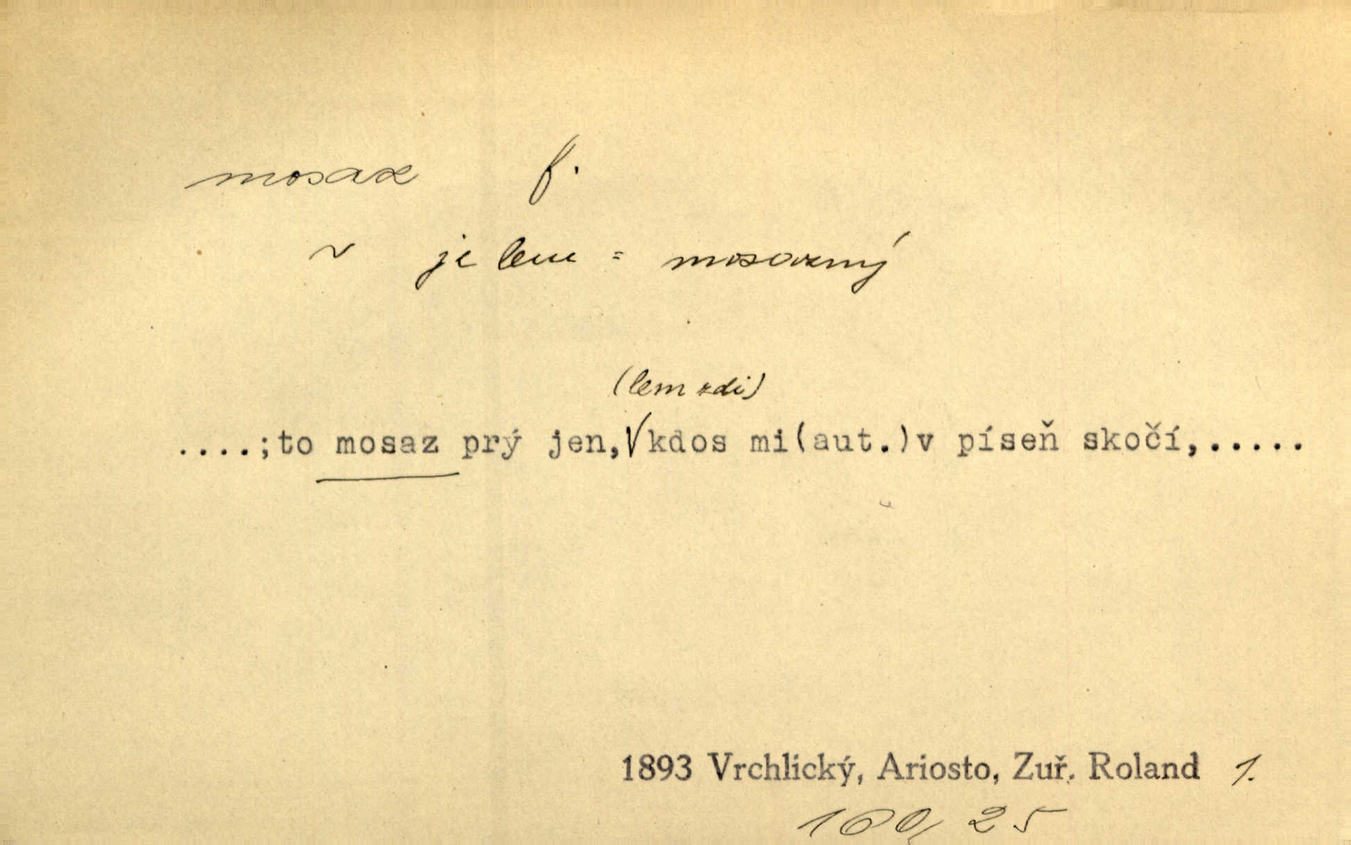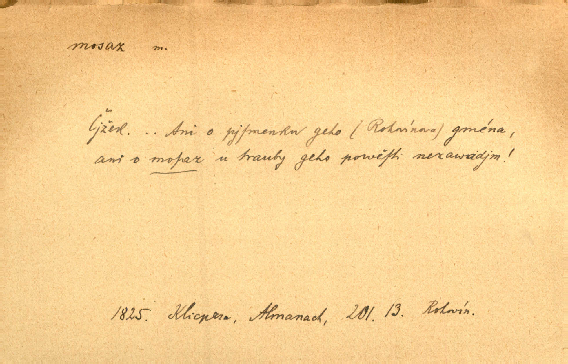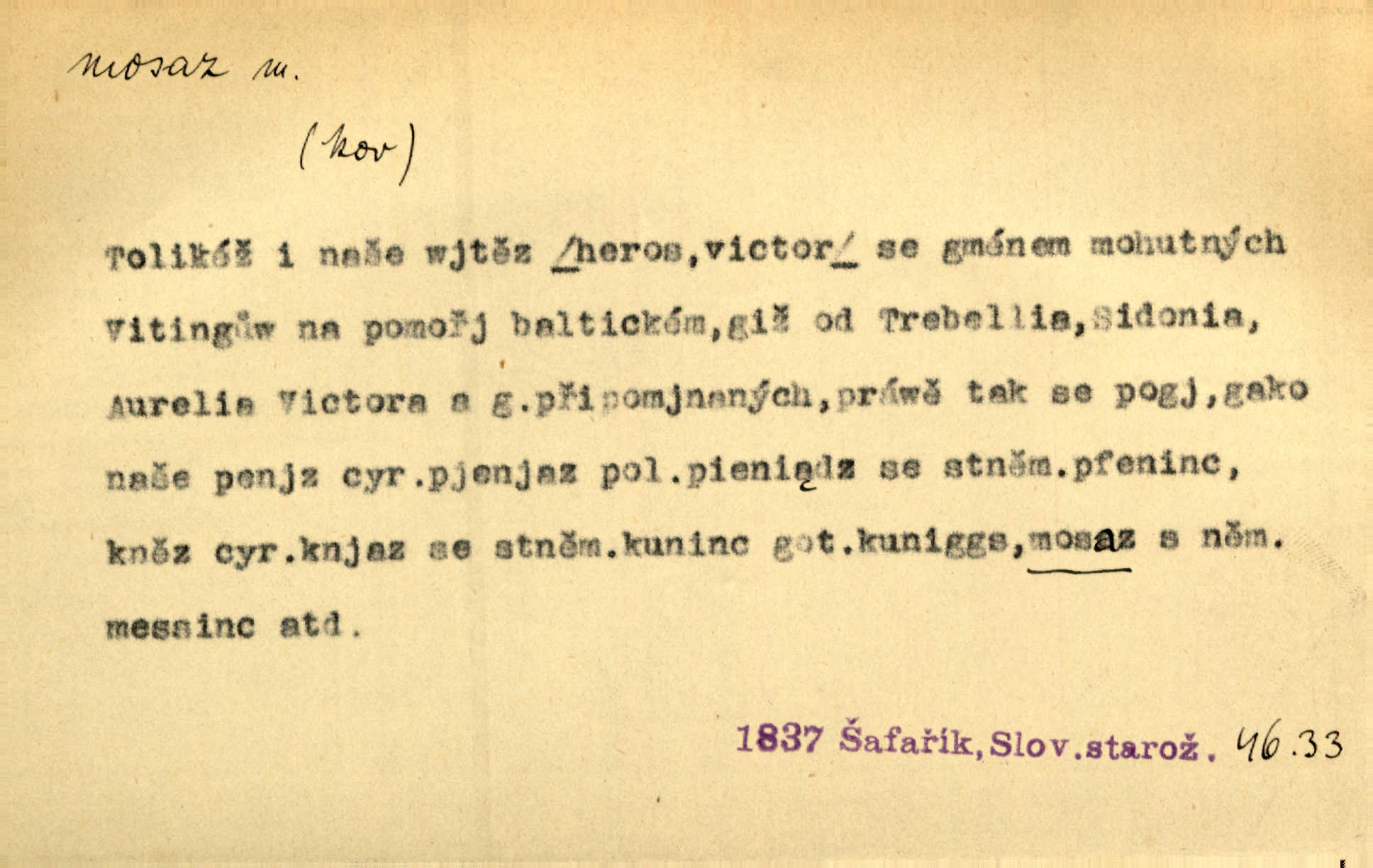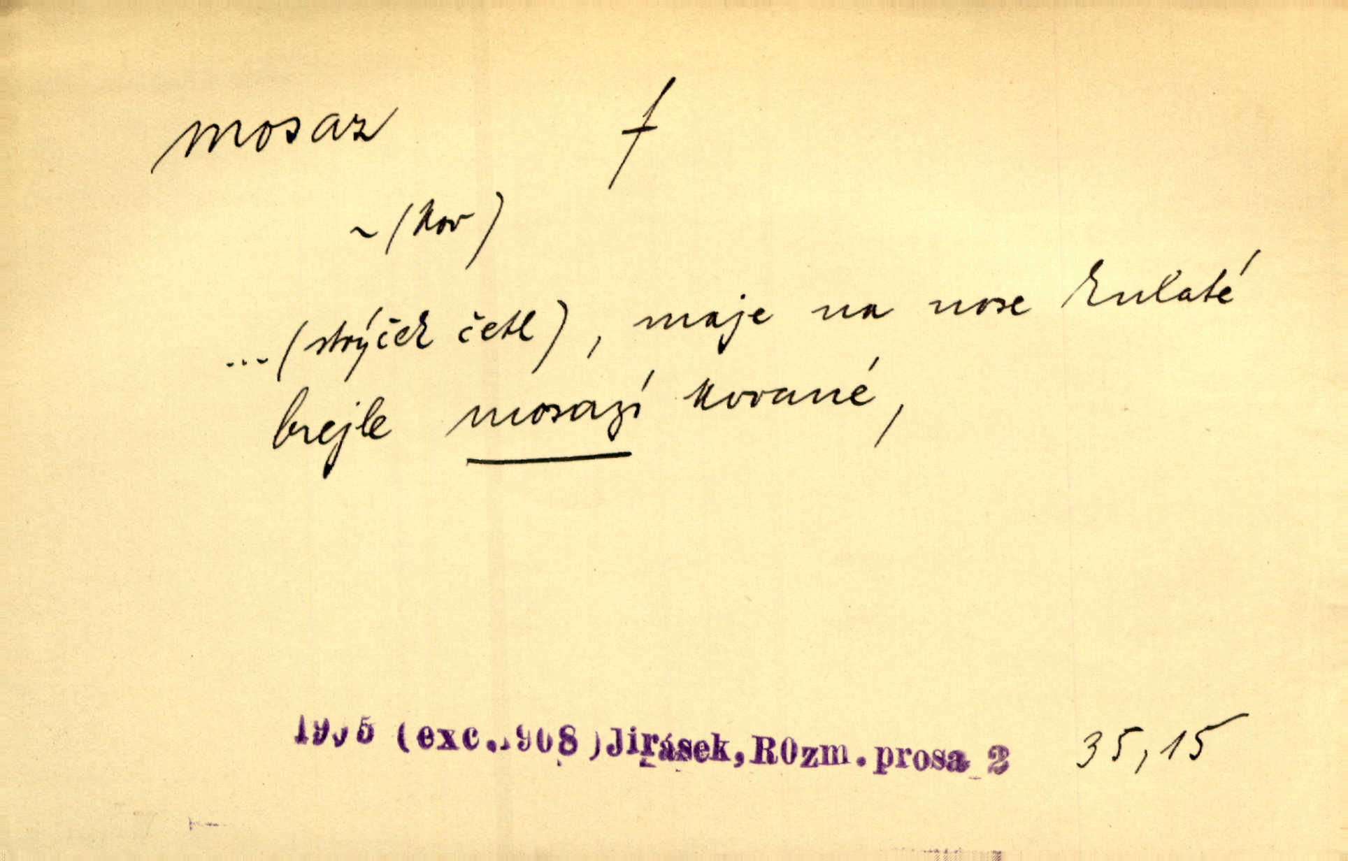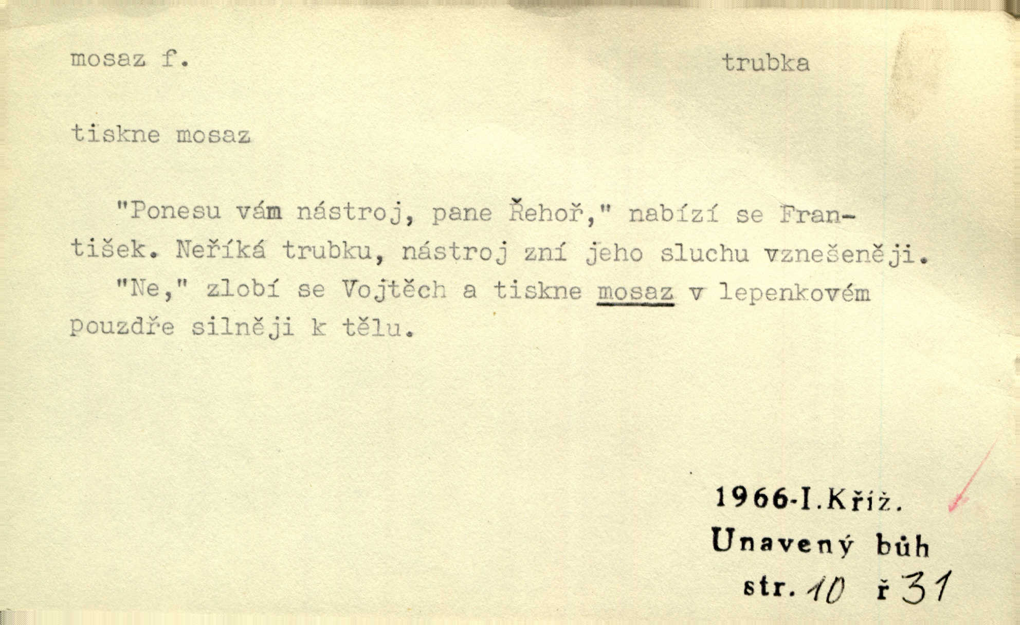 - mosaz, -i f., řidč. mosaz, -u m., slitina mědi se zinkem. Mosazem se blýská řemení. Krás. Výčepní stůl v baru zářil křišťálovým sklem, niklem a mosazí. Maj. Řemení formanských koní bylo až těžké svými ozdobami, nejvíce z lesklé mosaze. Jir. Dívčina s velkými, tenkými kruhy z mosazi v uších. Čech. D mosaz, -u m. předmět vyrobený z mosazi. Muzikanti foukali do dřeva a do mosazu až k ohlušení hudebních nástrojů z mosazi. Ehrenb. Páni hudebníci foukají za stříbro do mosazu. Rub.