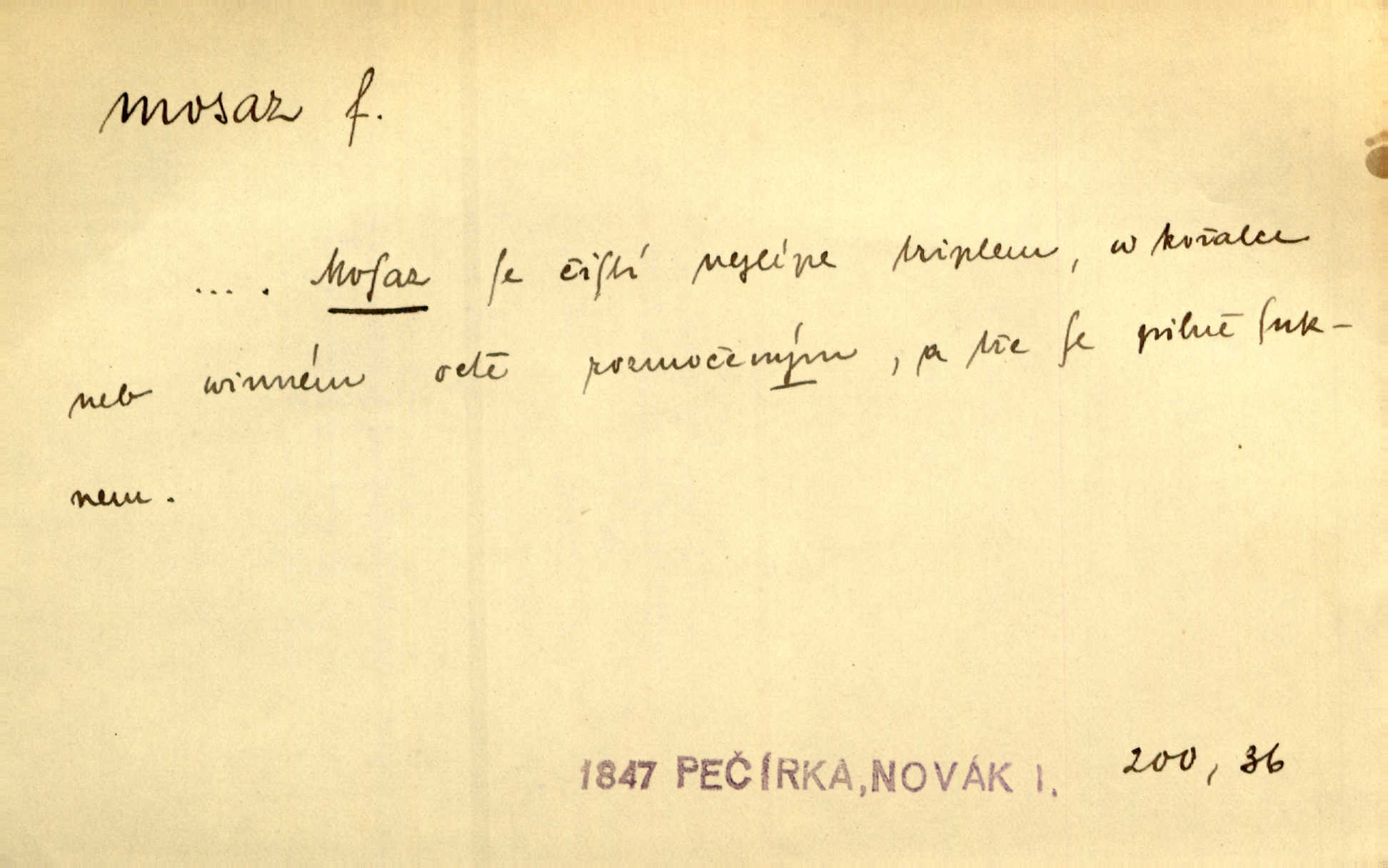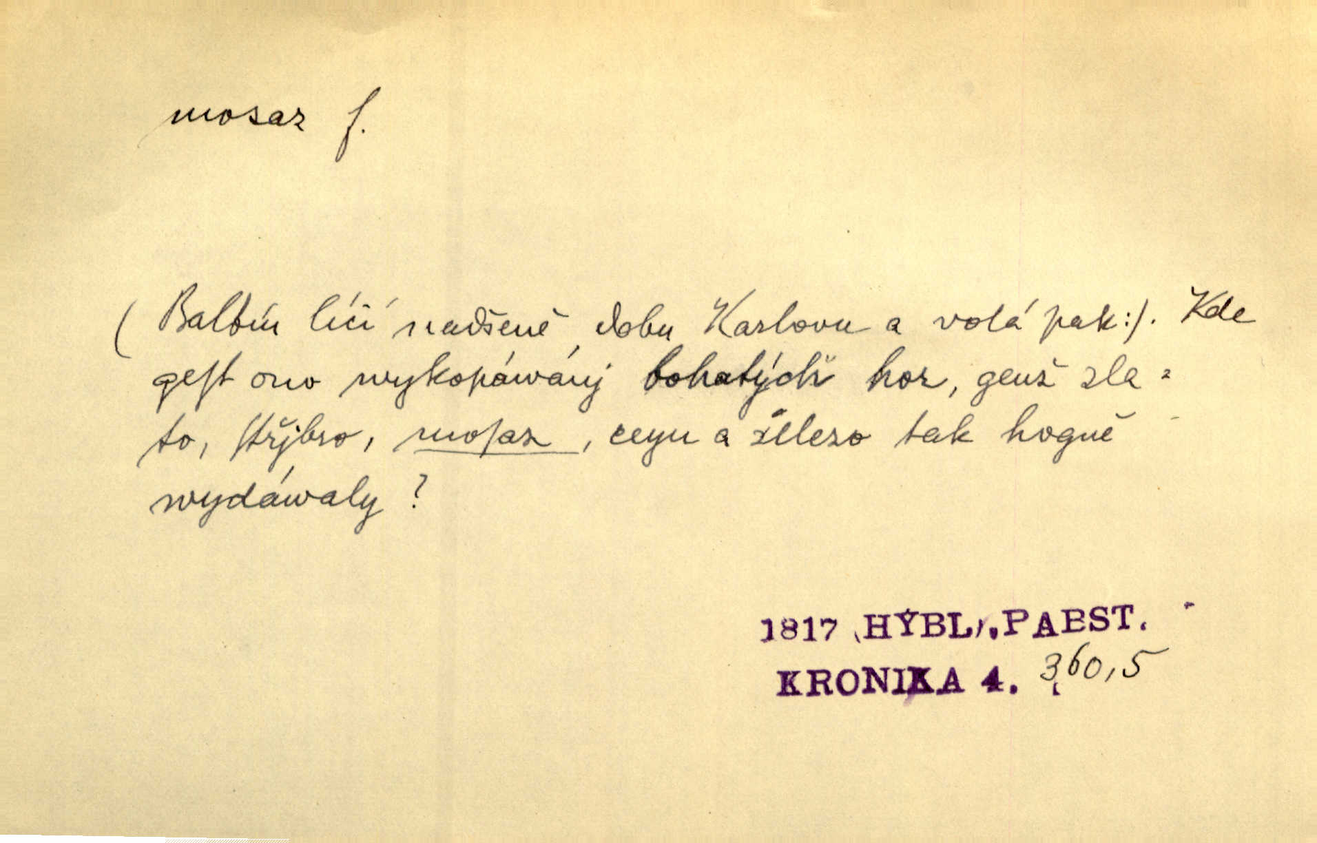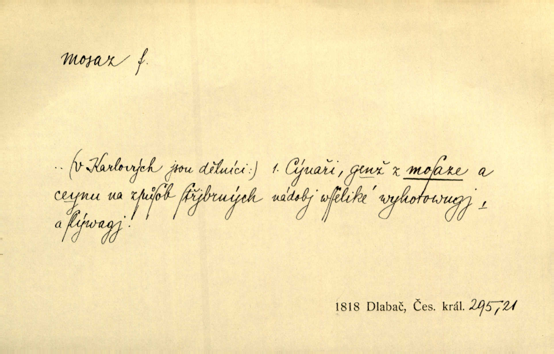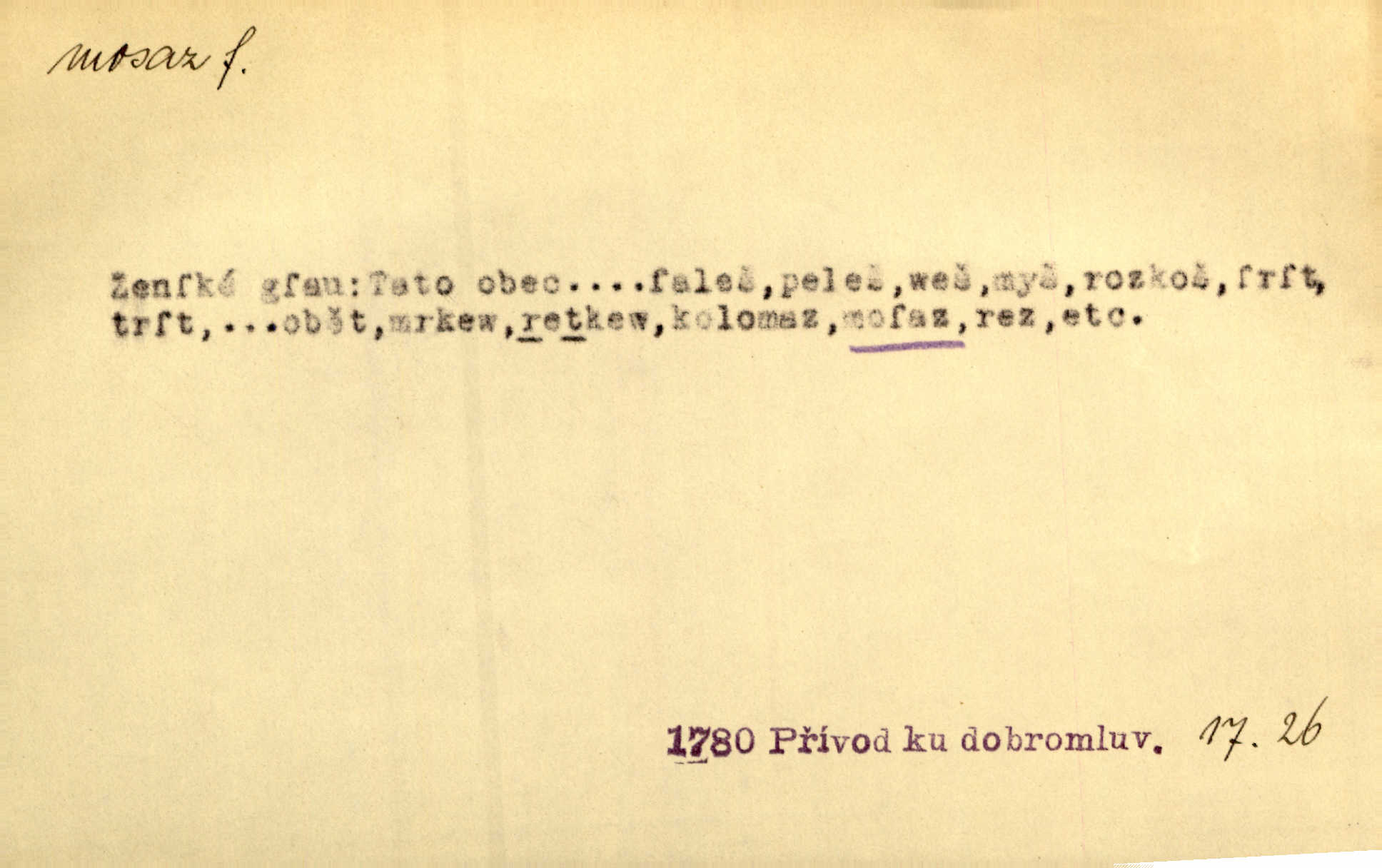 - mosaz, -i f., řidč. mosaz, -u m., slitina mědi se zinkem. Mosazem se blýská řemení. Krás. Výčepní stůl v baru zářil křišťálovým sklem, niklem a mosazí. Maj. Řemení formanských koní bylo až těžké svými ozdobami, nejvíce z lesklé mosaze. Jir. Dívčina s velkými, tenkými kruhy z mosazi v uších. Čech. D mosaz, -u m. předmět vyrobený z mosazi. Muzikanti foukali do dřeva a do mosazu až k ohlušení hudebních nástrojů z mosazi. Ehrenb. Páni hudebníci foukají za stříbro do mosazu. Rub.