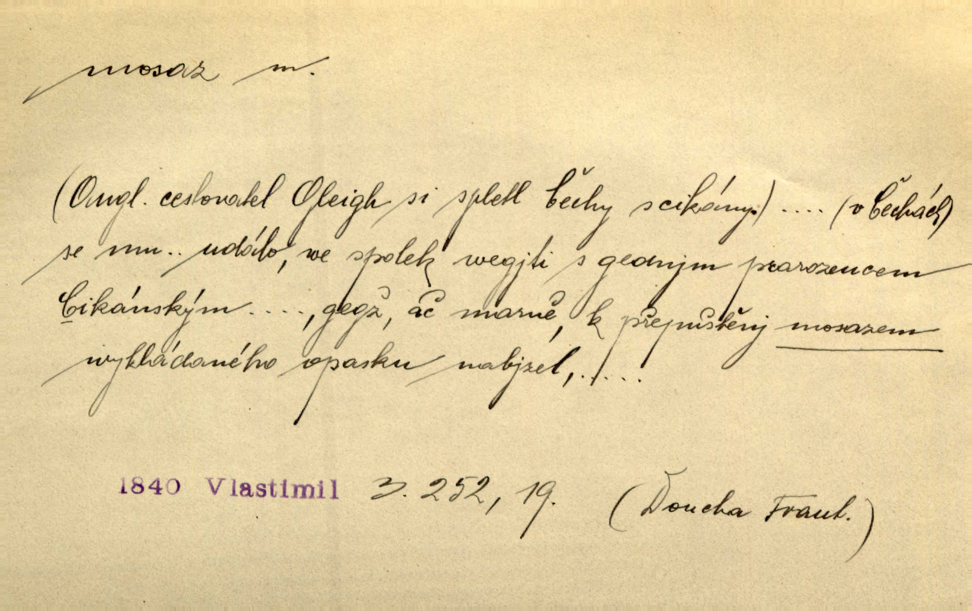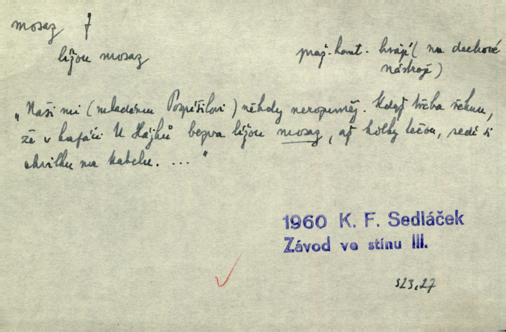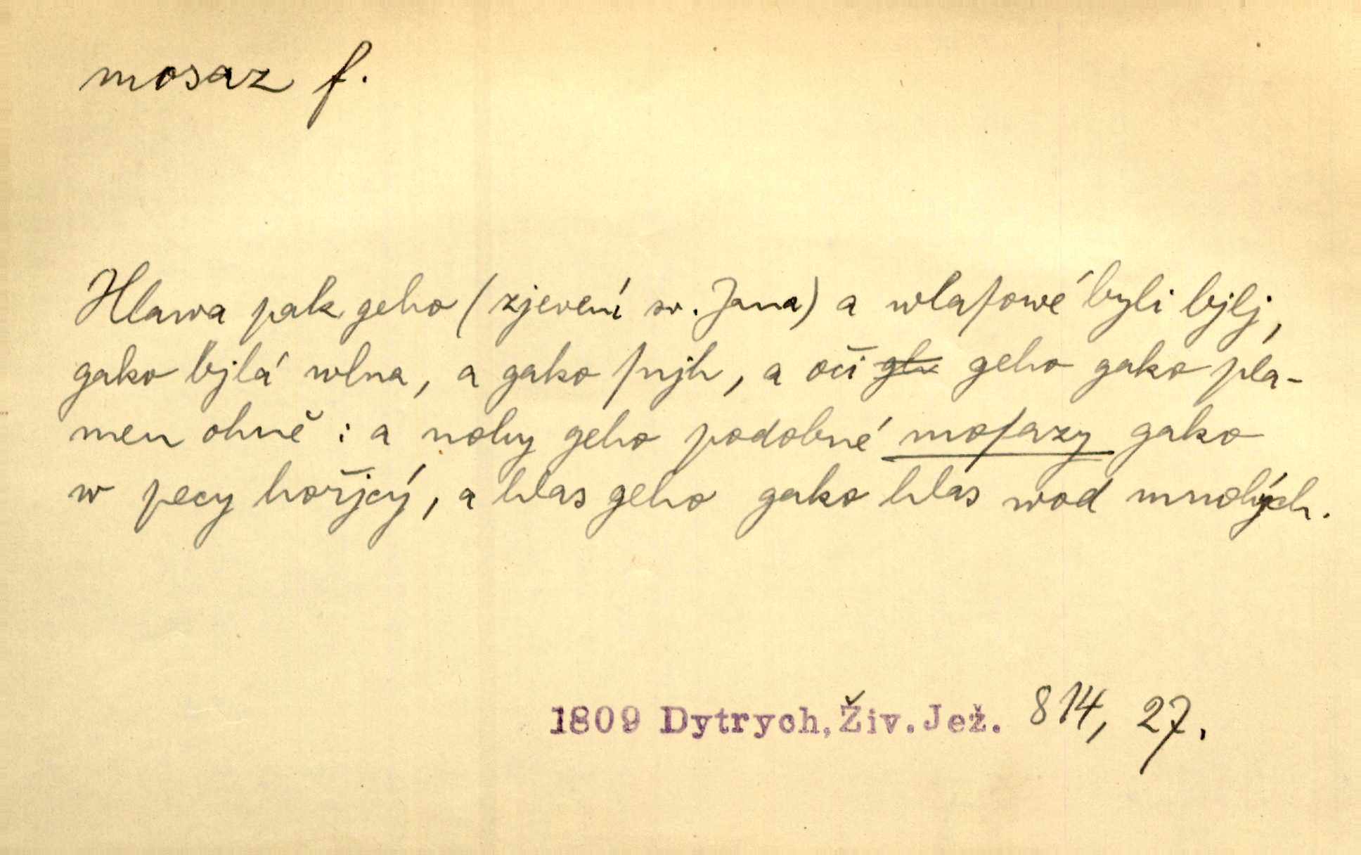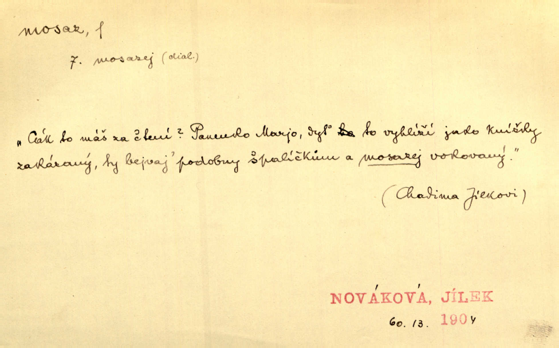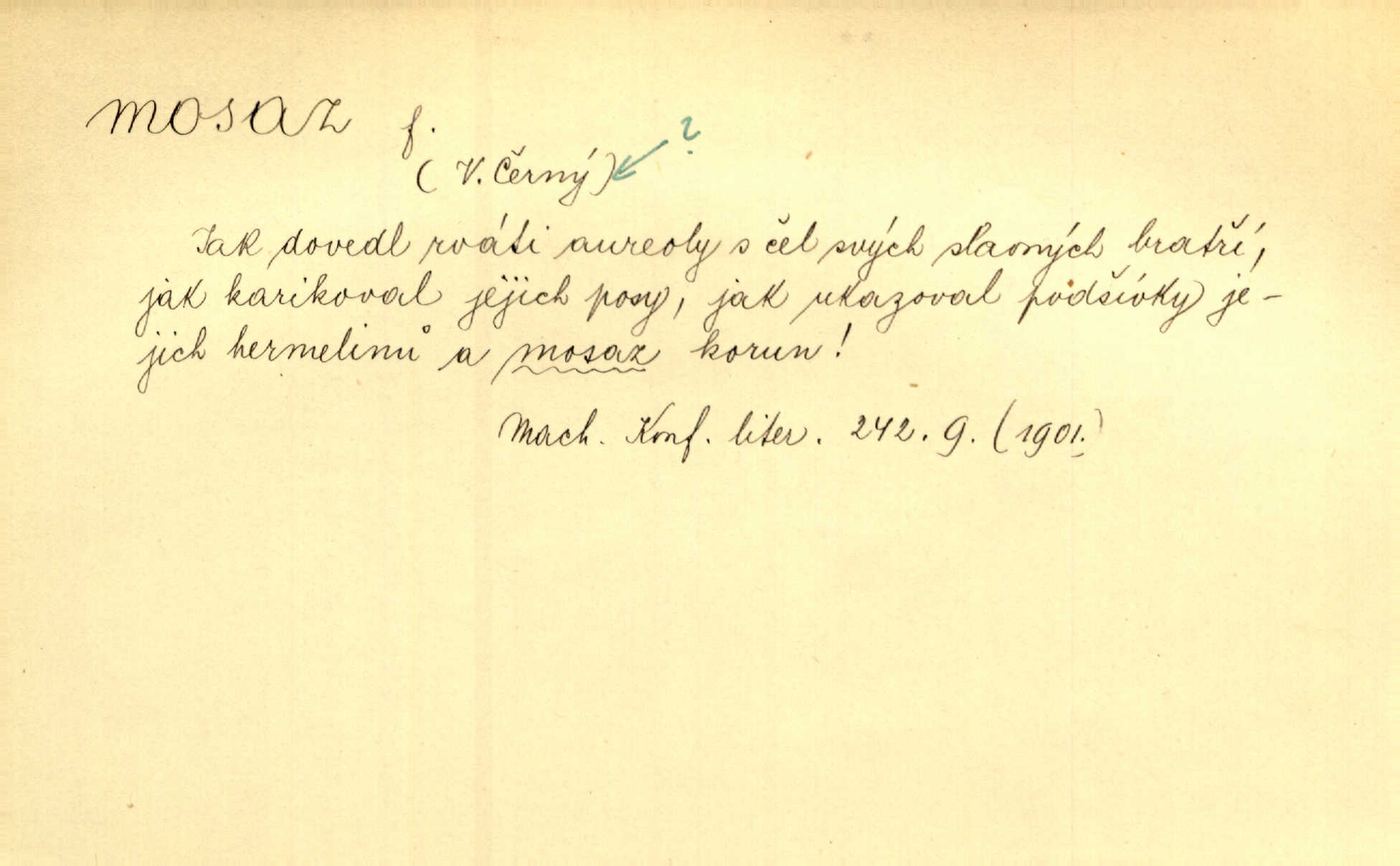 - mosaz, -i f., řidč. mosaz, -u m., slitina mědi se zinkem. Mosazem se blýská řemení. Krás. Výčepní stůl v baru zářil křišťálovým sklem, niklem a mosazí. Maj. Řemení formanských koní bylo až těžké svými ozdobami, nejvíce z lesklé mosaze. Jir. Dívčina s velkými, tenkými kruhy z mosazi v uších. Čech. D mosaz, -u m. předmět vyrobený z mosazi. Muzikanti foukali do dřeva a do mosazu až k ohlušení hudebních nástrojů z mosazi. Ehrenb. Páni hudebníci foukají za stříbro do mosazu. Rub.