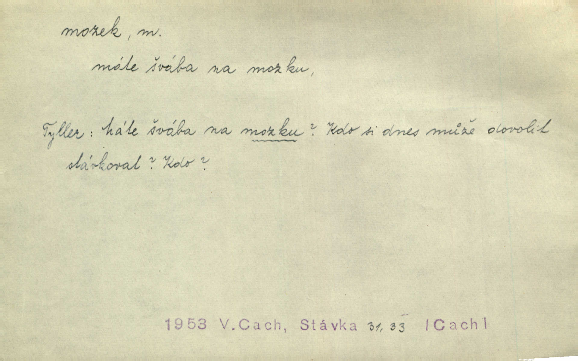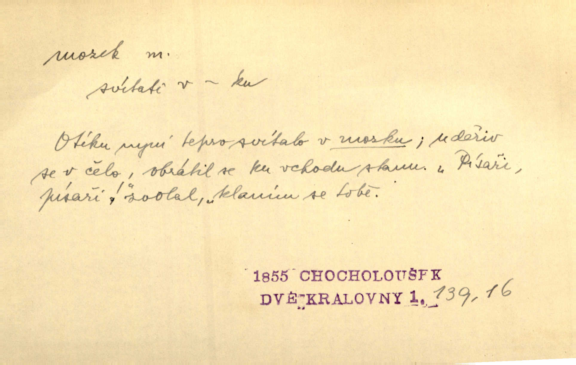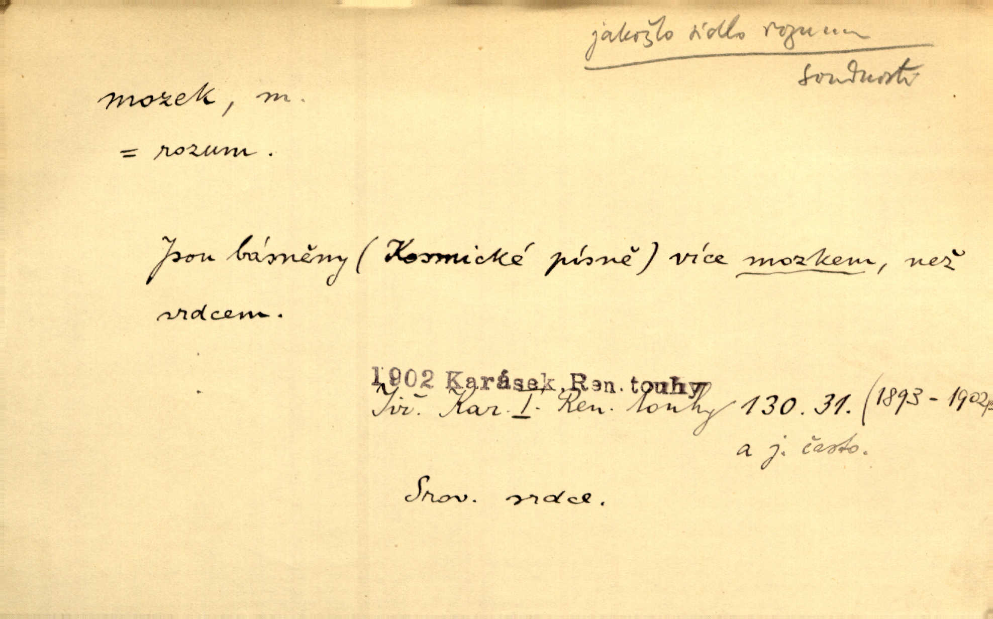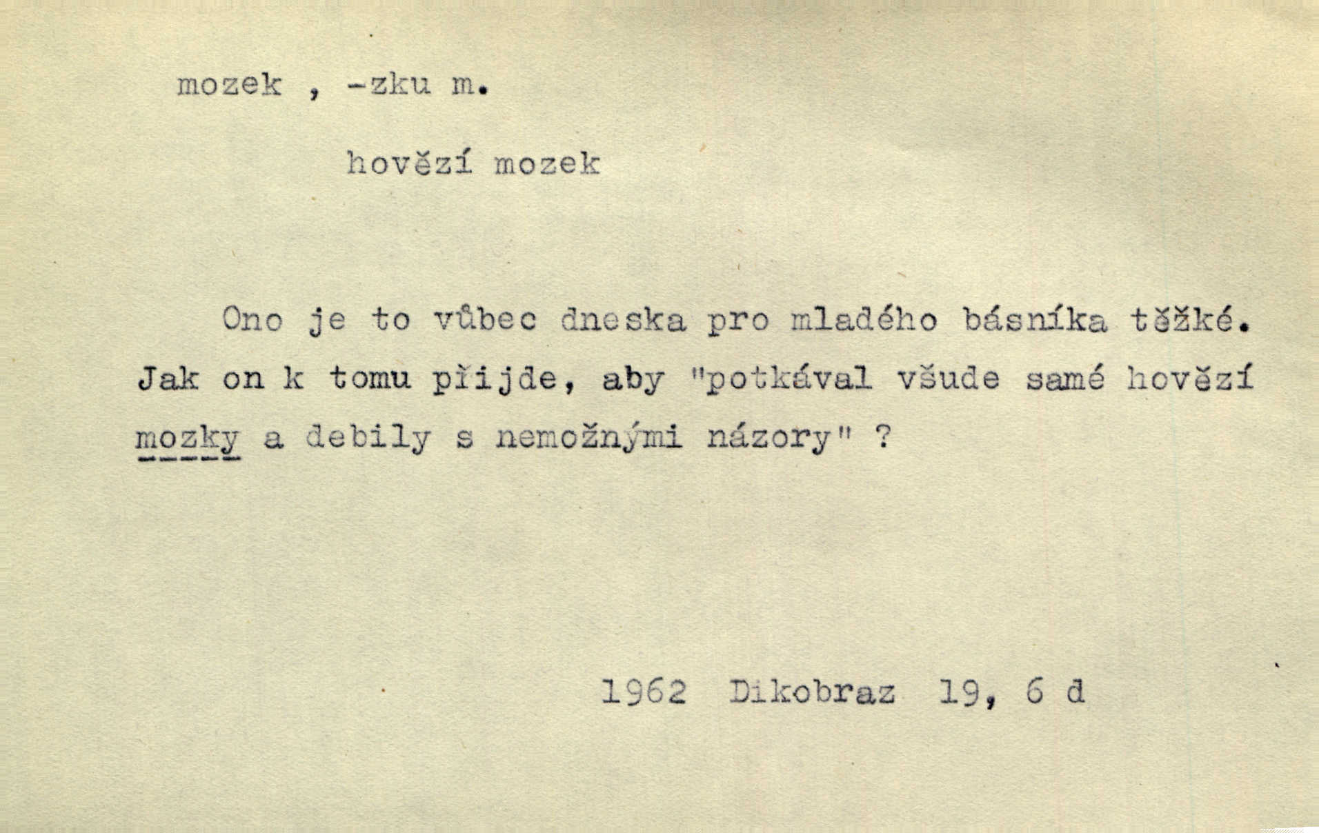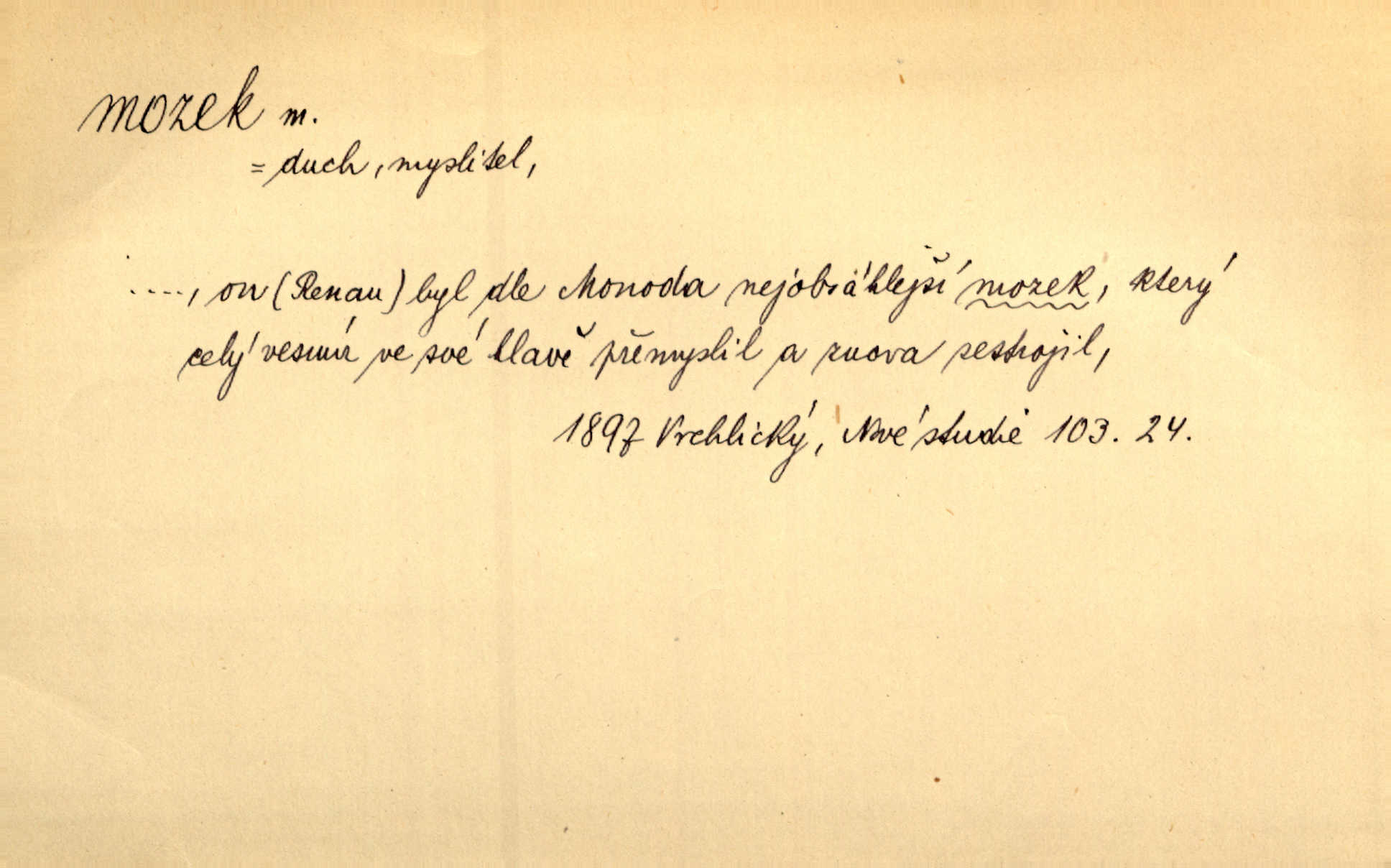 - mozek, -zku m. ústřední orgán nervové soustavy uložený v lebeční dutině, sídlo myšlení a činnosti volní. Jeho oči byly úkrytem všeho, co viděly, a mozek-pracovník všechny zjevy třídil a uvažoval o všem. Maj. Počal zdlouha líčit svou nemoc, následek otřesení mozku. R. Svob. Věru, mozek ti měkne! Stydím se za tebe, jak jsi hloupá! hloupneš. Klost. Ustál. sp. Mihlo mu mozkem cosi o zradě, jíž se dopustil na Kačence napadlo ho. Klost. Což se ti medovina ještě nevykouřila z mozku, že mě nepoznáváš jsi ještě opilý. Choch. Pomyšlení, že Fanny chce odejíti, nemálo mu vrtalo mozkem působilo starosti, znepokojení. Klost. To ten Amerikán nasadil mu červa do mozku, který tam teď ustavičně vrtal. Baar. Inu — co s tebou, máš holt — švába na mozku! jsi tupý, nechápavý. Čap. Ch. Co pak máš mozol na mozku, že neustále ještě nechápeš? jsi hloupý. Klost. Mně šaty nikda nelezly na mozek nedělaly starosti. Mah. Nějak mu to [že nežije s ženou manželsky] leze na mozek nejde na rozum. K. Čap. Žvastal, že by druhým voličům uměl otevříti mozky a dokázati pravdu. Prav. Otíku nyní teprv svítalo v mozku začínal chápat. Choch. Lék. vodnatelnost mozku, zánět mozku. D zvl. jako sídlo rozumu a soudnosti. Chceme, aby [umělecké dílo] bylo prací nejen autorova mozku a intellektu, ale předem jeho srdce a krve. Šal. Jsou básněny [Nerudovy Písně kosmické] více mozkem než srdcem. Kar. Svoboda vůle? Víte, že to je jeden z největších nesmyslů a omylů lidského mozku? Čap. Ch. Člověk jako skála, a ani tolik mozku, ani tolik vtipu, aby si vymyslil pěknou malou lest! Zey. Člověk silný s mozkem, s intelligencí bude žít nad lež zákonů. Hlad. [Provdávající se] krasavice s blešími mozky. Švan. Přen. Velký mozek! A pohledy má znamenité! nadaný spisovatel. Svob. [Generál] byl strategickým mozkem tohoto podniku vypracoval plán bitvy. Přít. [Renan] byl dle Monoda nejobsáhlejší mozek, který celý vesmír ve své hlavě přemyslil a znova sestrojil. Vrch. Pět dní a pět nocí pracoval mozek Habrůvky. Slavné představenstvo připravovalo své účty. A. Mrš. D jídlo připravené ze zvířecího mozku, mozeček. Při tabuli nejlepší bral jídla [opat]‚ stehýnka husí, prsíčka a mozky. Mach. Pište — mám [host] telecí hlavičku, prasečí uši a mozek. Hajn.