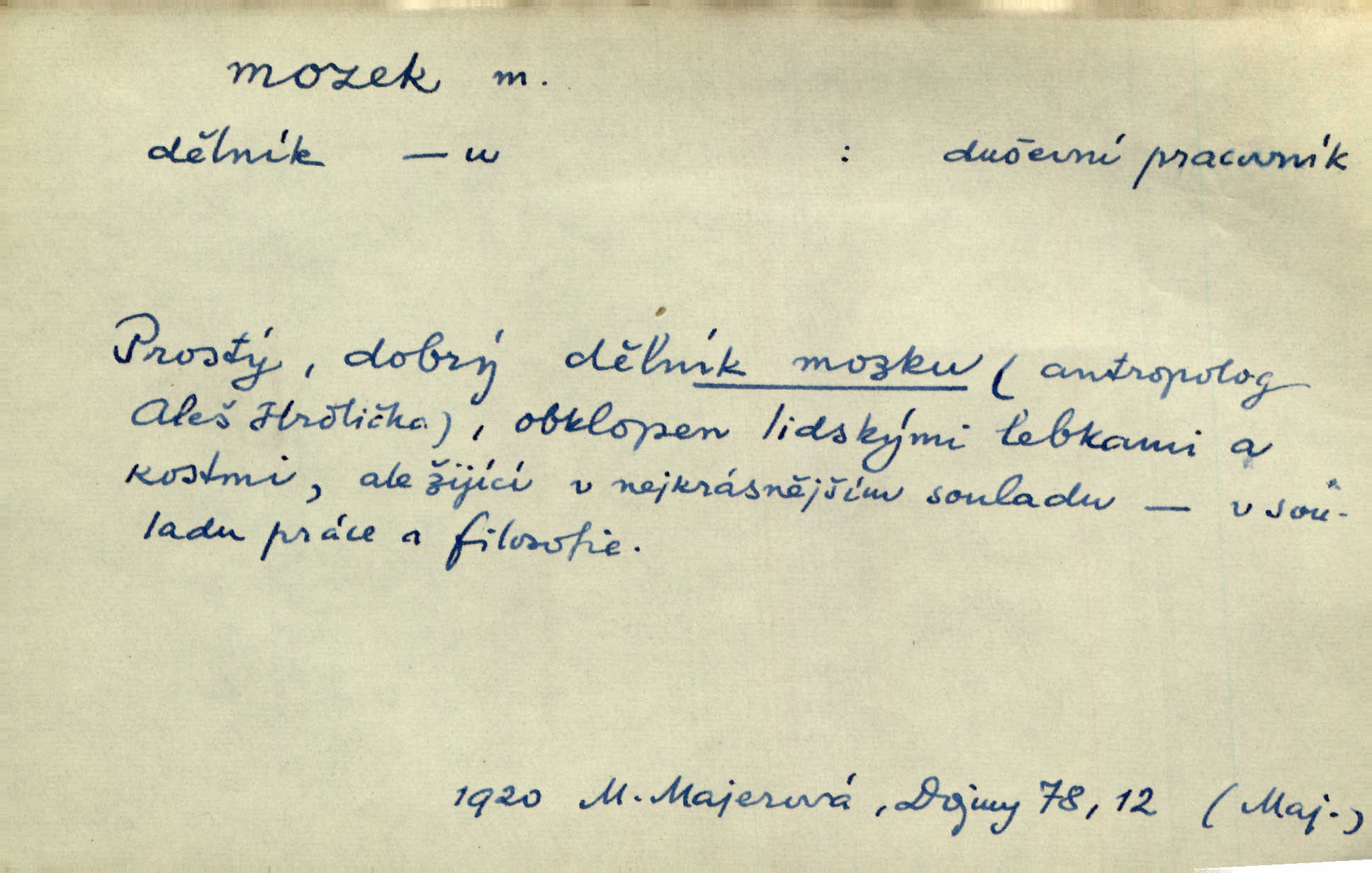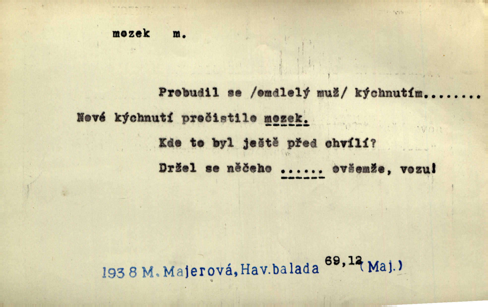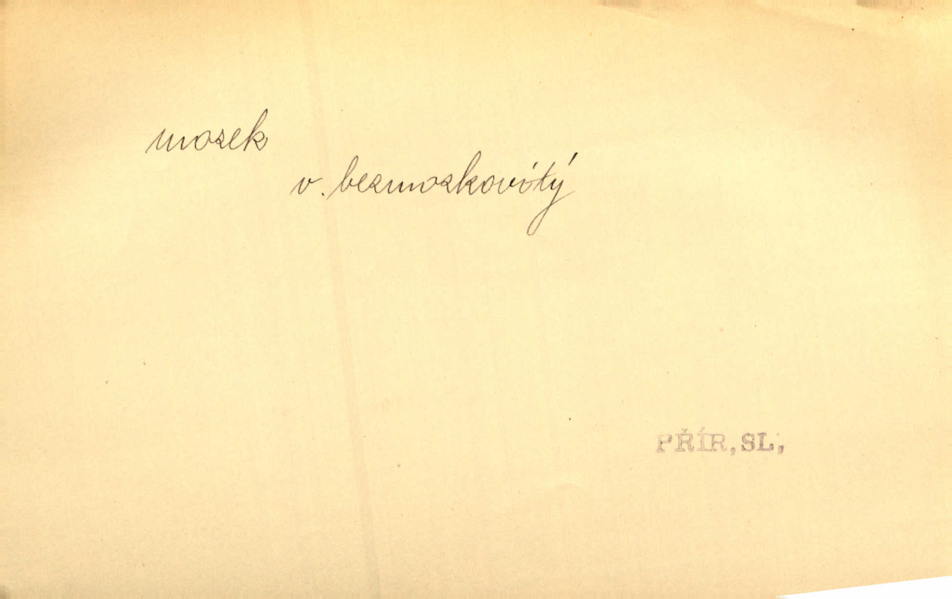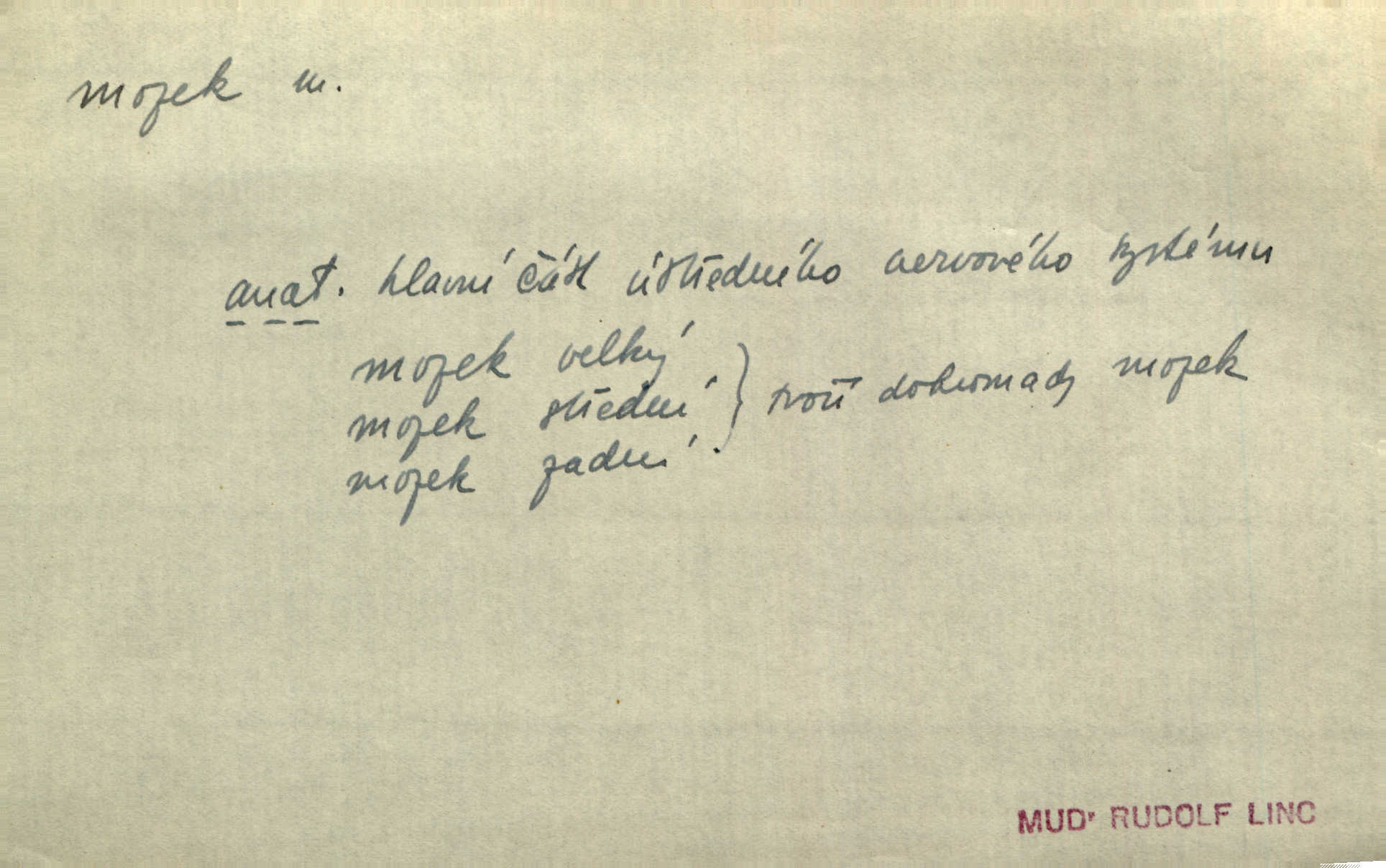 - mozek, -zku m. ústřední orgán nervové soustavy uložený v lebeční dutině, sídlo myšlení a činnosti volní. Jeho oči byly úkrytem všeho, co viděly, a mozek-pracovník všechny zjevy třídil a uvažoval o všem. Maj. Počal zdlouha líčit svou nemoc, následek otřesení mozku. R. Svob. Věru, mozek ti měkne! Stydím se za tebe, jak jsi hloupá! hloupneš. Klost. Ustál. sp. Mihlo mu mozkem cosi o zradě, jíž se dopustil na Kačence napadlo ho. Klost. Což se ti medovina ještě nevykouřila z mozku, že mě nepoznáváš jsi ještě opilý. Choch. Pomyšlení, že Fanny chce odejíti, nemálo mu vrtalo mozkem působilo starosti, znepokojení. Klost. To ten Amerikán nasadil mu červa do mozku, který tam teď ustavičně vrtal. Baar. Inu — co s tebou, máš holt — švába na mozku! jsi tupý, nechápavý. Čap. Ch. Co pak máš mozol na mozku, že neustále ještě nechápeš? jsi hloupý. Klost. Mně šaty nikda nelezly na mozek nedělaly starosti. Mah. Nějak mu to [že nežije s ženou manželsky] leze na mozek nejde na rozum. K. Čap. Žvastal, že by druhým voličům uměl otevříti mozky a dokázati pravdu. Prav. Otíku nyní teprv svítalo v mozku začínal chápat. Choch. Lék. vodnatelnost mozku, zánět mozku. D zvl. jako sídlo rozumu a soudnosti. Chceme, aby [umělecké dílo] bylo prací nejen autorova mozku a intellektu, ale předem jeho srdce a krve. Šal. Jsou básněny [Nerudovy Písně kosmické] více mozkem než srdcem. Kar. Svoboda vůle? Víte, že to je jeden z největších nesmyslů a omylů lidského mozku? Čap. Ch. Člověk jako skála, a ani tolik mozku, ani tolik vtipu, aby si vymyslil pěknou malou lest! Zey. Člověk silný s mozkem, s intelligencí bude žít nad lež zákonů. Hlad. [Provdávající se] krasavice s blešími mozky. Švan. Přen. Velký mozek! A pohledy má znamenité! nadaný spisovatel. Svob. [Generál] byl strategickým mozkem tohoto podniku vypracoval plán bitvy. Přít. [Renan] byl dle Monoda nejobsáhlejší mozek, který celý vesmír ve své hlavě přemyslil a znova sestrojil. Vrch. Pět dní a pět nocí pracoval mozek Habrůvky. Slavné představenstvo připravovalo své účty. A. Mrš. D jídlo připravené ze zvířecího mozku, mozeček. Při tabuli nejlepší bral jídla [opat]‚ stehýnka husí, prsíčka a mozky. Mach. Pište — mám [host] telecí hlavičku, prasečí uši a mozek. Hajn.