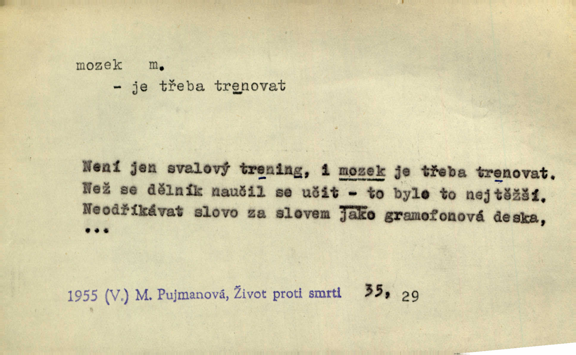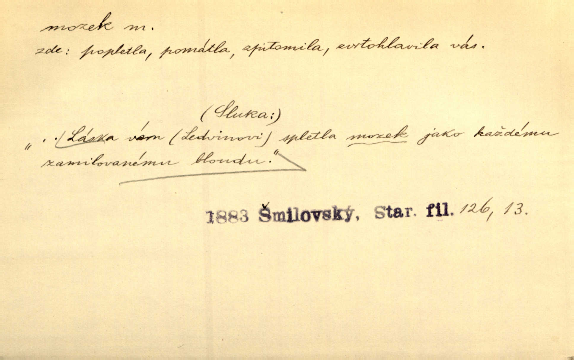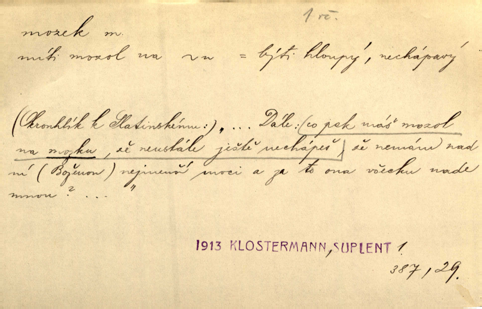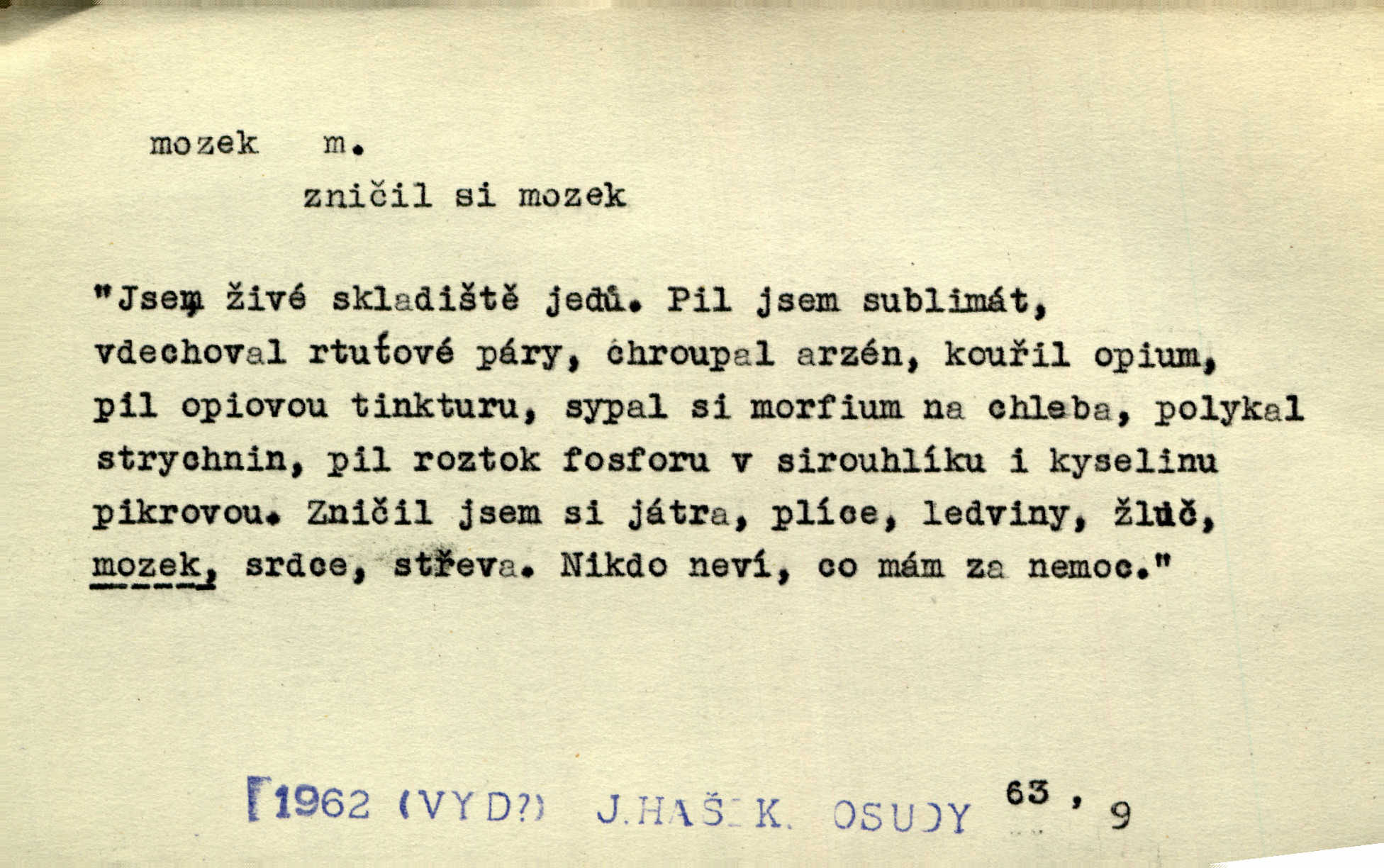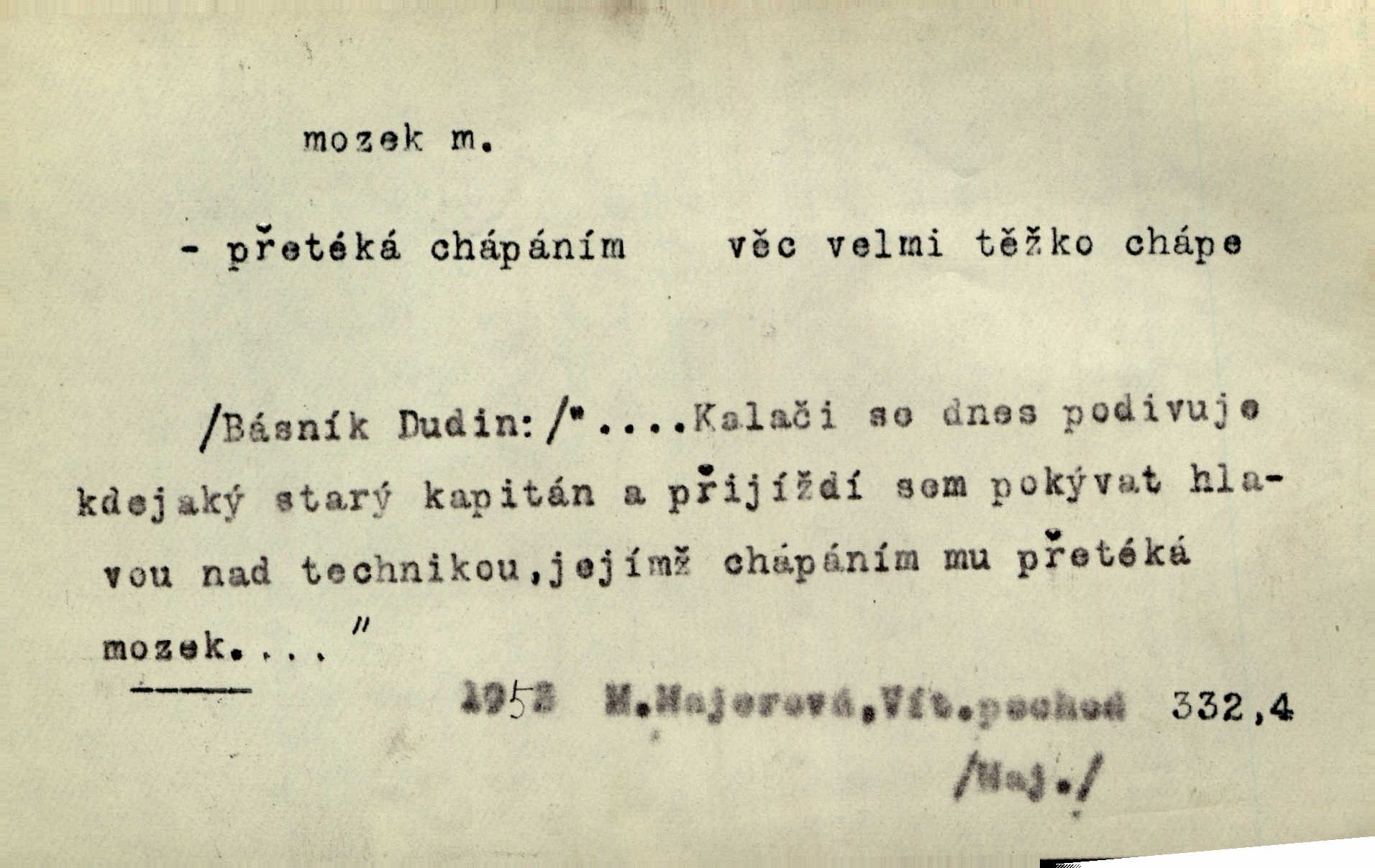 - mozek, -zku m. ústřední orgán nervové soustavy uložený v lebeční dutině, sídlo myšlení a činnosti volní. Jeho oči byly úkrytem všeho, co viděly, a mozek-pracovník všechny zjevy třídil a uvažoval o všem. Maj. Počal zdlouha líčit svou nemoc, následek otřesení mozku. R. Svob. Věru, mozek ti měkne! Stydím se za tebe, jak jsi hloupá! hloupneš. Klost. Ustál. sp. Mihlo mu mozkem cosi o zradě, jíž se dopustil na Kačence napadlo ho. Klost. Což se ti medovina ještě nevykouřila z mozku, že mě nepoznáváš jsi ještě opilý. Choch. Pomyšlení, že Fanny chce odejíti, nemálo mu vrtalo mozkem působilo starosti, znepokojení. Klost. To ten Amerikán nasadil mu červa do mozku, který tam teď ustavičně vrtal. Baar. Inu — co s tebou, máš holt — švába na mozku! jsi tupý, nechápavý. Čap. Ch. Co pak máš mozol na mozku, že neustále ještě nechápeš? jsi hloupý. Klost. Mně šaty nikda nelezly na mozek nedělaly starosti. Mah. Nějak mu to [že nežije s ženou manželsky] leze na mozek nejde na rozum. K. Čap. Žvastal, že by druhým voličům uměl otevříti mozky a dokázati pravdu. Prav. Otíku nyní teprv svítalo v mozku začínal chápat. Choch. Lék. vodnatelnost mozku, zánět mozku. D zvl. jako sídlo rozumu a soudnosti. Chceme, aby [umělecké dílo] bylo prací nejen autorova mozku a intellektu, ale předem jeho srdce a krve. Šal. Jsou básněny [Nerudovy Písně kosmické] více mozkem než srdcem. Kar. Svoboda vůle? Víte, že to je jeden z největších nesmyslů a omylů lidského mozku? Čap. Ch. Člověk jako skála, a ani tolik mozku, ani tolik vtipu, aby si vymyslil pěknou malou lest! Zey. Člověk silný s mozkem, s intelligencí bude žít nad lež zákonů. Hlad. [Provdávající se] krasavice s blešími mozky. Švan. Přen. Velký mozek! A pohledy má znamenité! nadaný spisovatel. Svob. [Generál] byl strategickým mozkem tohoto podniku vypracoval plán bitvy. Přít. [Renan] byl dle Monoda nejobsáhlejší mozek, který celý vesmír ve své hlavě přemyslil a znova sestrojil. Vrch. Pět dní a pět nocí pracoval mozek Habrůvky. Slavné představenstvo připravovalo své účty. A. Mrš. D jídlo připravené ze zvířecího mozku, mozeček. Při tabuli nejlepší bral jídla [opat]‚ stehýnka husí, prsíčka a mozky. Mach. Pište — mám [host] telecí hlavičku, prasečí uši a mozek. Hajn.