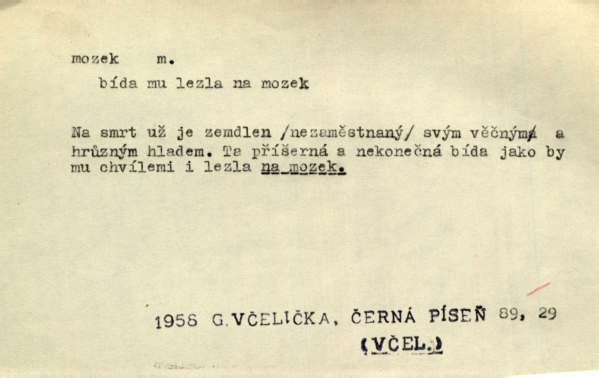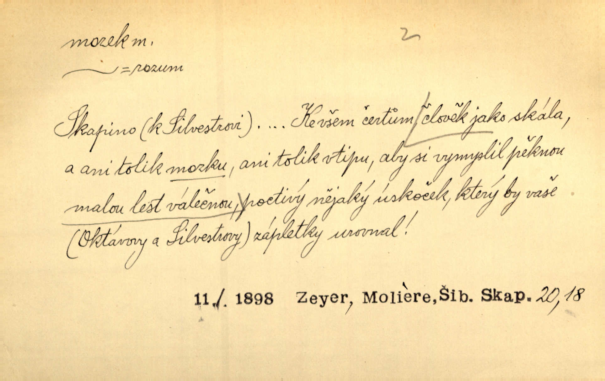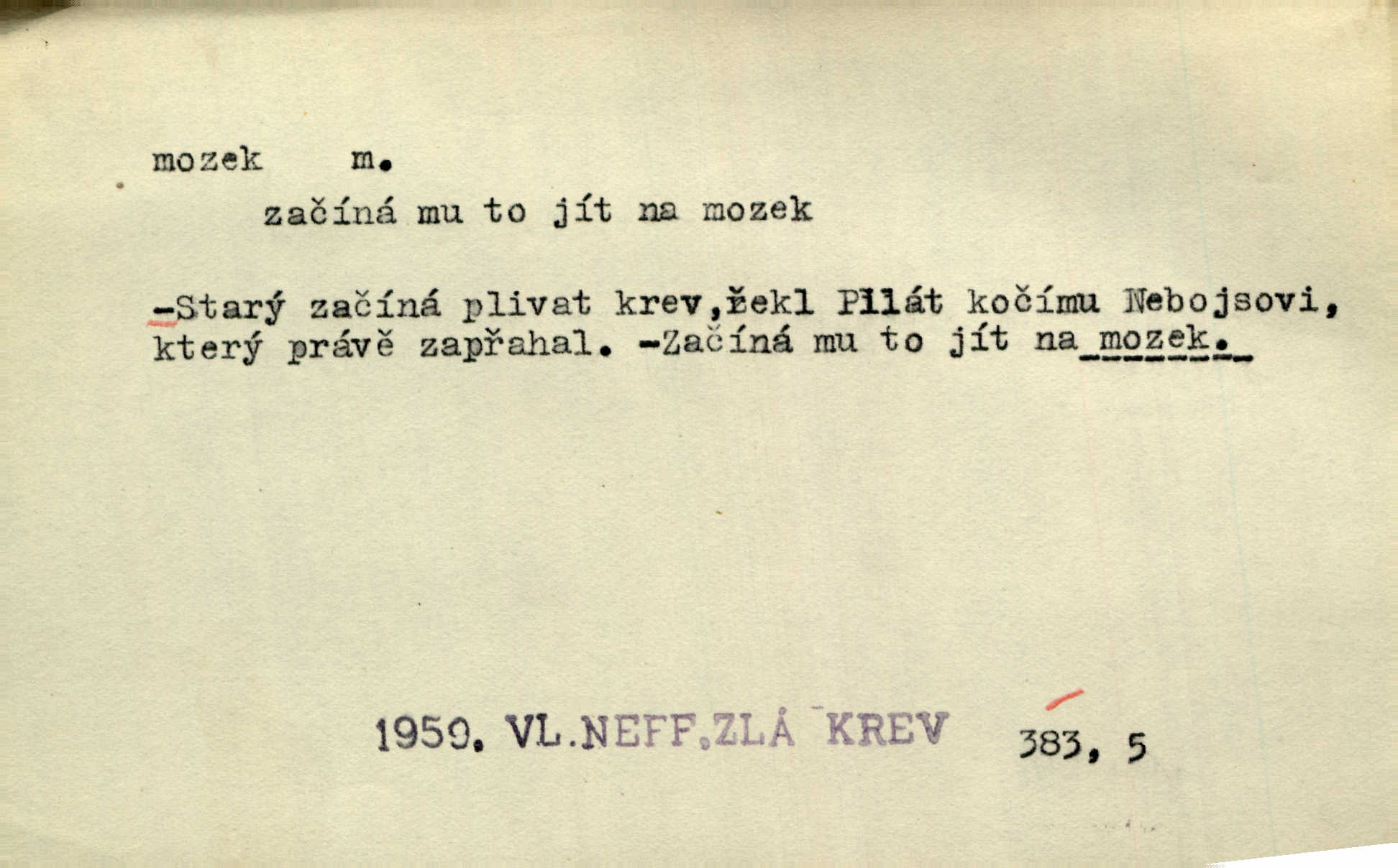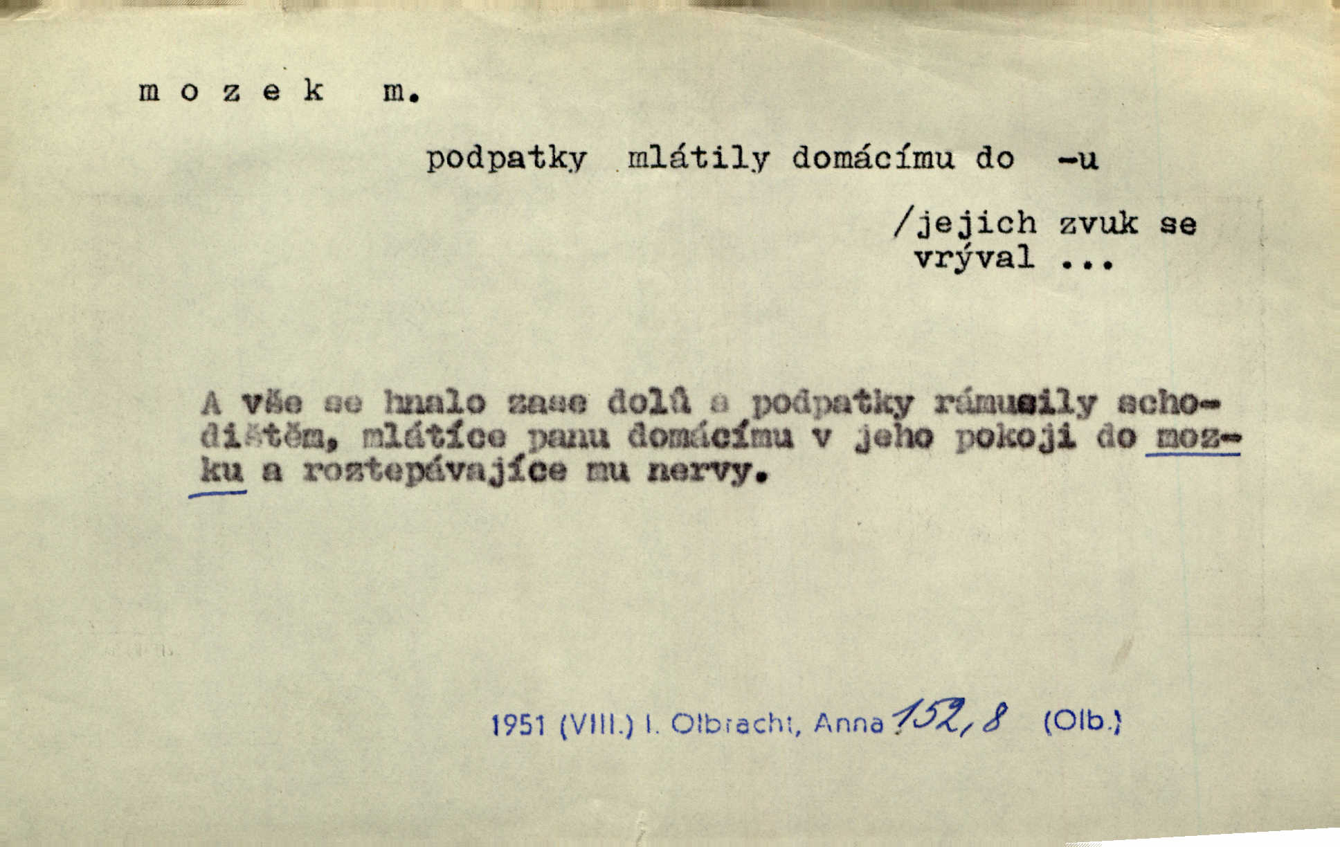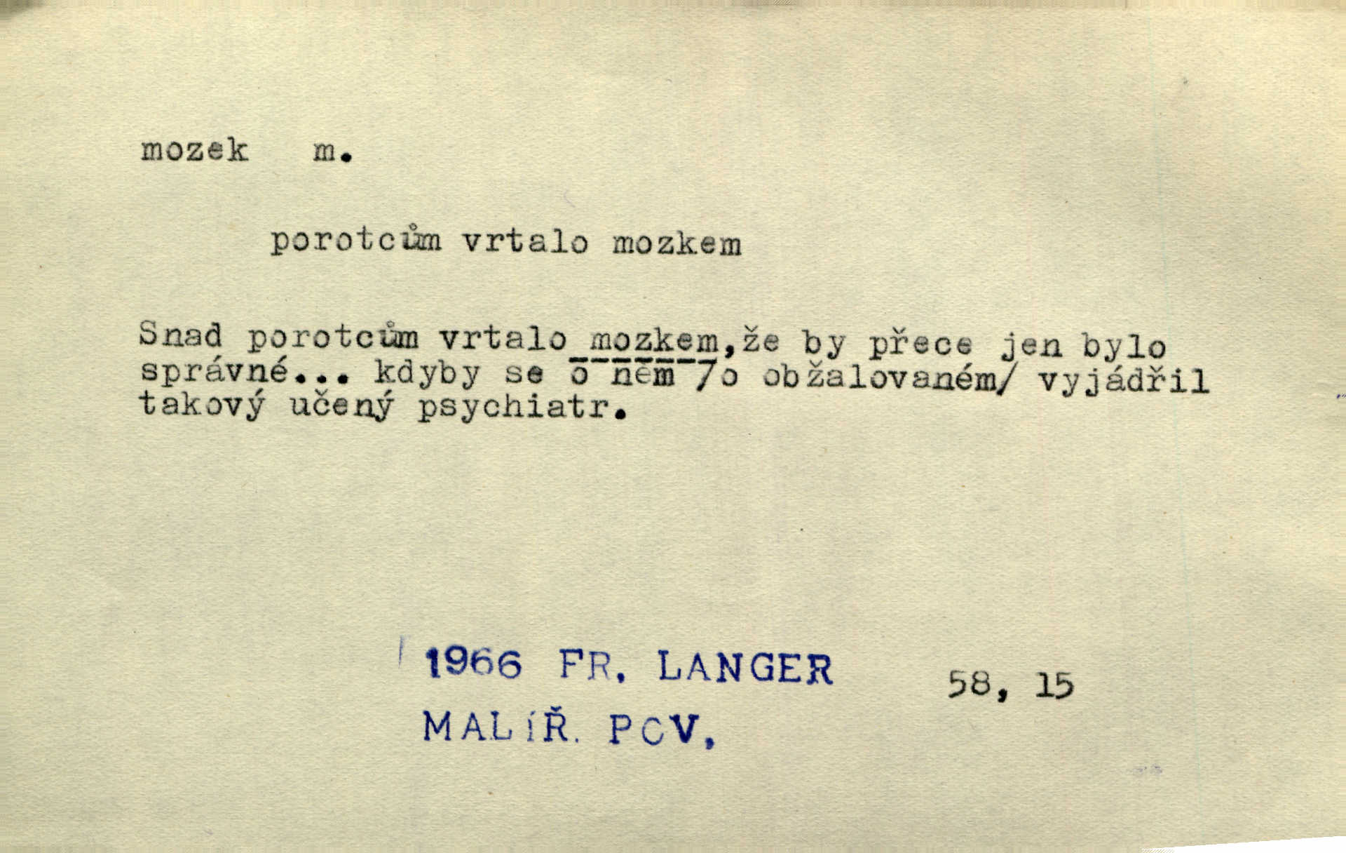 - mozek, -zku m. ústřední orgán nervové soustavy uložený v lebeční dutině, sídlo myšlení a činnosti volní. Jeho oči byly úkrytem všeho, co viděly, a mozek-pracovník všechny zjevy třídil a uvažoval o všem. Maj. Počal zdlouha líčit svou nemoc, následek otřesení mozku. R. Svob. Věru, mozek ti měkne! Stydím se za tebe, jak jsi hloupá! hloupneš. Klost. Ustál. sp. Mihlo mu mozkem cosi o zradě, jíž se dopustil na Kačence napadlo ho. Klost. Což se ti medovina ještě nevykouřila z mozku, že mě nepoznáváš jsi ještě opilý. Choch. Pomyšlení, že Fanny chce odejíti, nemálo mu vrtalo mozkem působilo starosti, znepokojení. Klost. To ten Amerikán nasadil mu červa do mozku, který tam teď ustavičně vrtal. Baar. Inu — co s tebou, máš holt — švába na mozku! jsi tupý, nechápavý. Čap. Ch. Co pak máš mozol na mozku, že neustále ještě nechápeš? jsi hloupý. Klost. Mně šaty nikda nelezly na mozek nedělaly starosti. Mah. Nějak mu to [že nežije s ženou manželsky] leze na mozek nejde na rozum. K. Čap. Žvastal, že by druhým voličům uměl otevříti mozky a dokázati pravdu. Prav. Otíku nyní teprv svítalo v mozku začínal chápat. Choch. Lék. vodnatelnost mozku, zánět mozku. D zvl. jako sídlo rozumu a soudnosti. Chceme, aby [umělecké dílo] bylo prací nejen autorova mozku a intellektu, ale předem jeho srdce a krve. Šal. Jsou básněny [Nerudovy Písně kosmické] více mozkem než srdcem. Kar. Svoboda vůle? Víte, že to je jeden z největších nesmyslů a omylů lidského mozku? Čap. Ch. Člověk jako skála, a ani tolik mozku, ani tolik vtipu, aby si vymyslil pěknou malou lest! Zey. Člověk silný s mozkem, s intelligencí bude žít nad lež zákonů. Hlad. [Provdávající se] krasavice s blešími mozky. Švan. Přen. Velký mozek! A pohledy má znamenité! nadaný spisovatel. Svob. [Generál] byl strategickým mozkem tohoto podniku vypracoval plán bitvy. Přít. [Renan] byl dle Monoda nejobsáhlejší mozek, který celý vesmír ve své hlavě přemyslil a znova sestrojil. Vrch. Pět dní a pět nocí pracoval mozek Habrůvky. Slavné představenstvo připravovalo své účty. A. Mrš. D jídlo připravené ze zvířecího mozku, mozeček. Při tabuli nejlepší bral jídla [opat]‚ stehýnka husí, prsíčka a mozky. Mach. Pište — mám [host] telecí hlavičku, prasečí uši a mozek. Hajn.