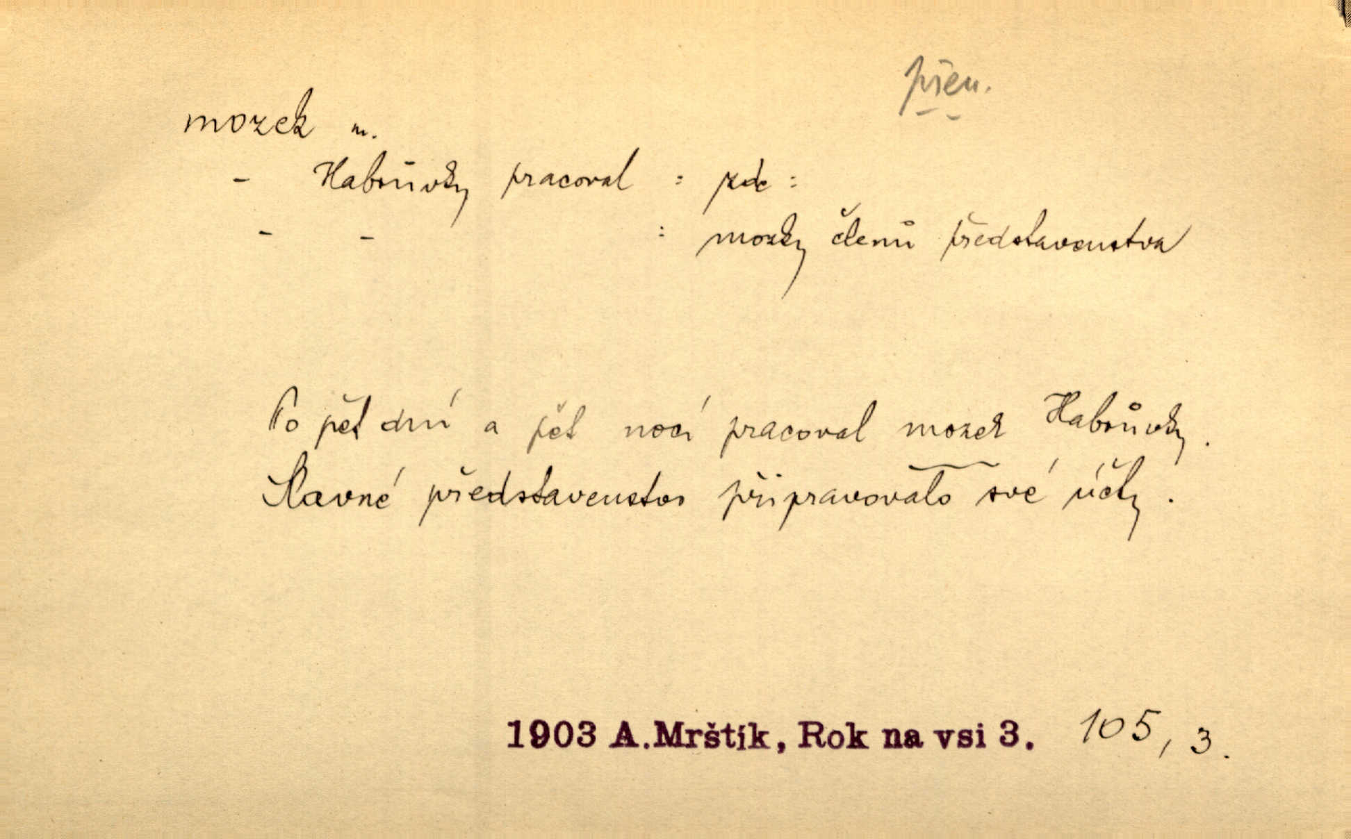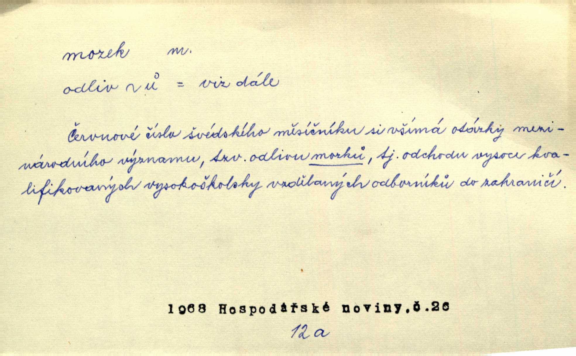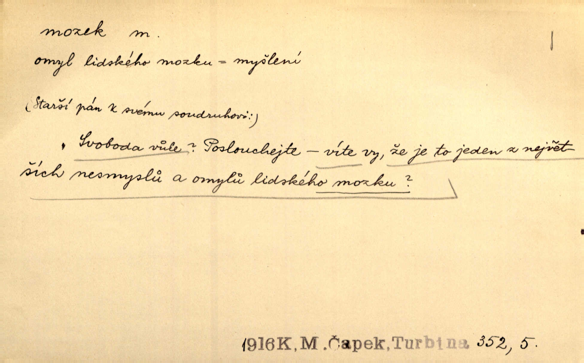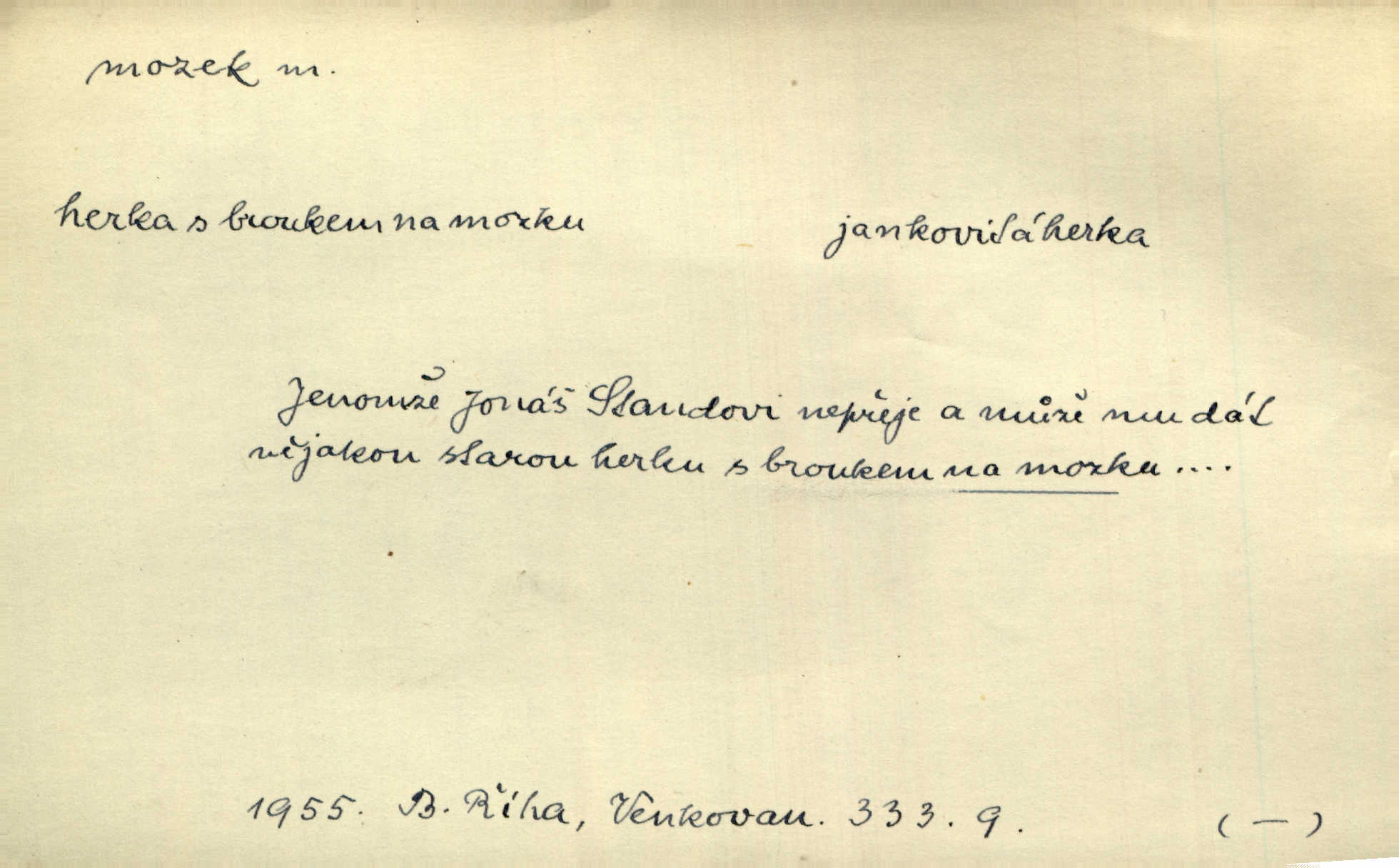 - mozek, -zku m. ústřední orgán nervové soustavy uložený v lebeční dutině, sídlo myšlení a činnosti volní. Jeho oči byly úkrytem všeho, co viděly, a mozek-pracovník všechny zjevy třídil a uvažoval o všem. Maj. Počal zdlouha líčit svou nemoc, následek otřesení mozku. R. Svob. Věru, mozek ti měkne! Stydím se za tebe, jak jsi hloupá! hloupneš. Klost. Ustál. sp. Mihlo mu mozkem cosi o zradě, jíž se dopustil na Kačence napadlo ho. Klost. Což se ti medovina ještě nevykouřila z mozku, že mě nepoznáváš jsi ještě opilý. Choch. Pomyšlení, že Fanny chce odejíti, nemálo mu vrtalo mozkem působilo starosti, znepokojení. Klost. To ten Amerikán nasadil mu červa do mozku, který tam teď ustavičně vrtal. Baar. Inu — co s tebou, máš holt — švába na mozku! jsi tupý, nechápavý. Čap. Ch. Co pak máš mozol na mozku, že neustále ještě nechápeš? jsi hloupý. Klost. Mně šaty nikda nelezly na mozek nedělaly starosti. Mah. Nějak mu to [že nežije s ženou manželsky] leze na mozek nejde na rozum. K. Čap. Žvastal, že by druhým voličům uměl otevříti mozky a dokázati pravdu. Prav. Otíku nyní teprv svítalo v mozku začínal chápat. Choch. Lék. vodnatelnost mozku, zánět mozku. D zvl. jako sídlo rozumu a soudnosti. Chceme, aby [umělecké dílo] bylo prací nejen autorova mozku a intellektu, ale předem jeho srdce a krve. Šal. Jsou básněny [Nerudovy Písně kosmické] více mozkem než srdcem. Kar. Svoboda vůle? Víte, že to je jeden z největších nesmyslů a omylů lidského mozku? Čap. Ch. Člověk jako skála, a ani tolik mozku, ani tolik vtipu, aby si vymyslil pěknou malou lest! Zey. Člověk silný s mozkem, s intelligencí bude žít nad lež zákonů. Hlad. [Provdávající se] krasavice s blešími mozky. Švan. Přen. Velký mozek! A pohledy má znamenité! nadaný spisovatel. Svob. [Generál] byl strategickým mozkem tohoto podniku vypracoval plán bitvy. Přít. [Renan] byl dle Monoda nejobsáhlejší mozek, který celý vesmír ve své hlavě přemyslil a znova sestrojil. Vrch. Pět dní a pět nocí pracoval mozek Habrůvky. Slavné představenstvo připravovalo své účty. A. Mrš. D jídlo připravené ze zvířecího mozku, mozeček. Při tabuli nejlepší bral jídla [opat]‚ stehýnka husí, prsíčka a mozky. Mach. Pište — mám [host] telecí hlavičku, prasečí uši a mozek. Hajn.