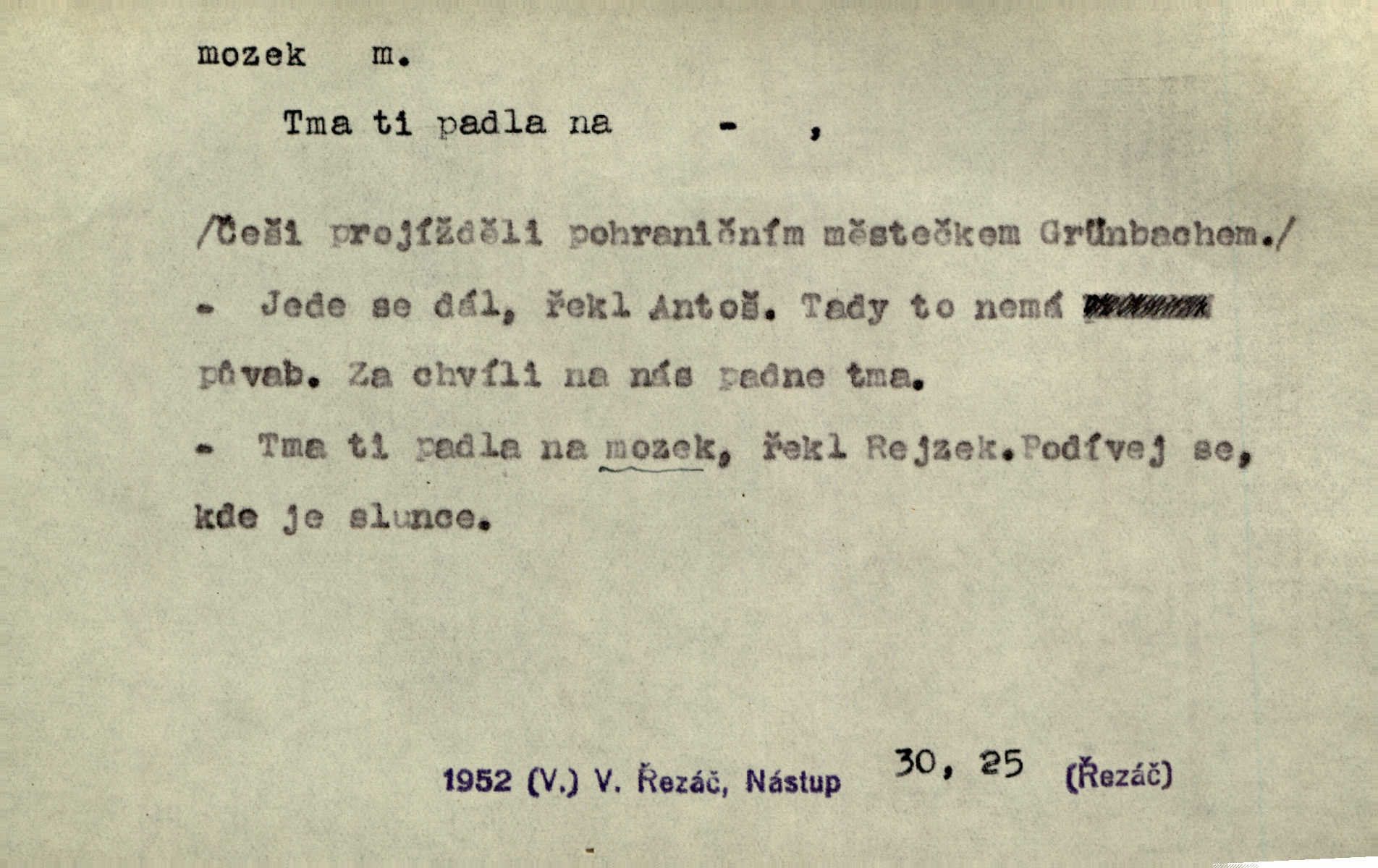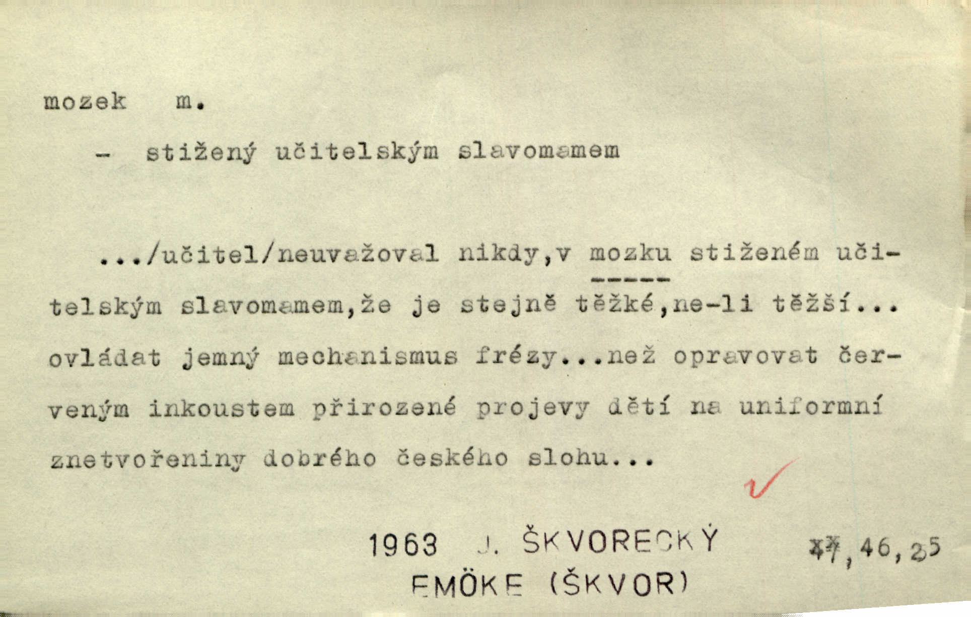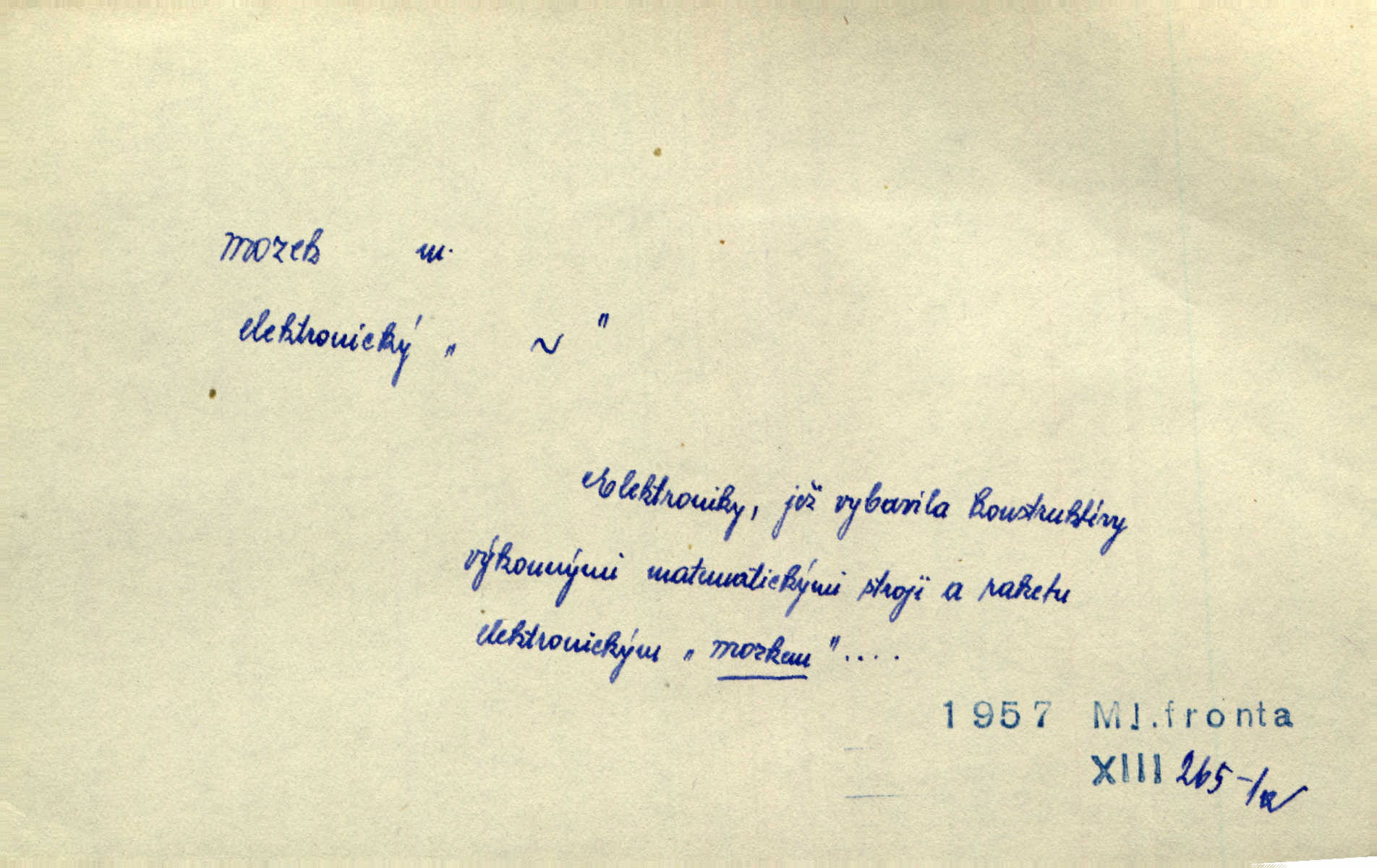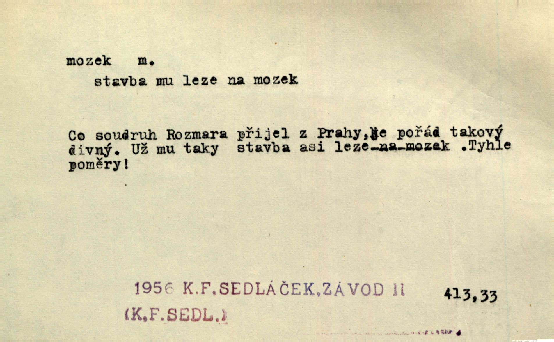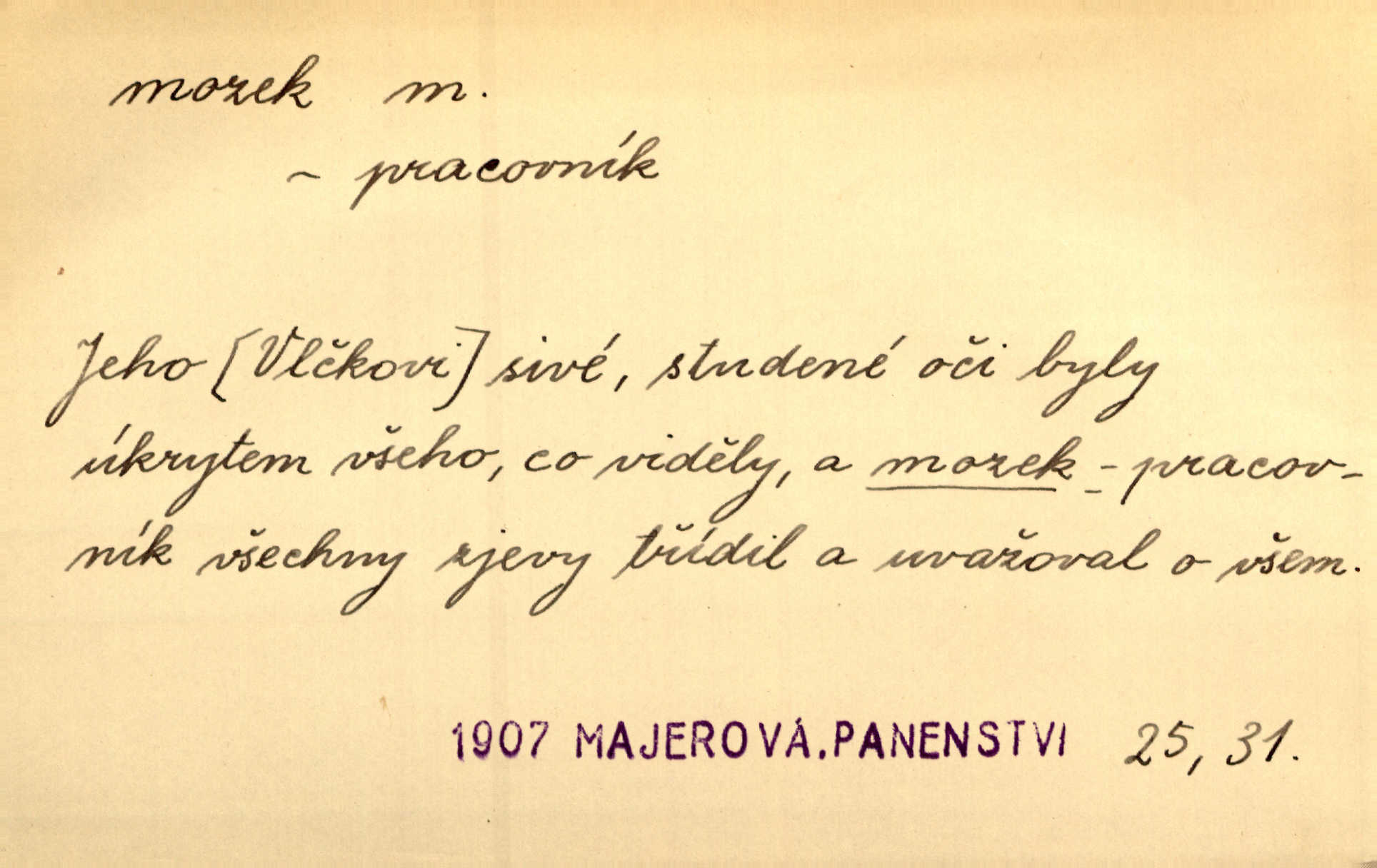 - mozek, -zku m. ústřední orgán nervové soustavy uložený v lebeční dutině, sídlo myšlení a činnosti volní. Jeho oči byly úkrytem všeho, co viděly, a mozek-pracovník všechny zjevy třídil a uvažoval o všem. Maj. Počal zdlouha líčit svou nemoc, následek otřesení mozku. R. Svob. Věru, mozek ti měkne! Stydím se za tebe, jak jsi hloupá! hloupneš. Klost. Ustál. sp. Mihlo mu mozkem cosi o zradě, jíž se dopustil na Kačence napadlo ho. Klost. Což se ti medovina ještě nevykouřila z mozku, že mě nepoznáváš jsi ještě opilý. Choch. Pomyšlení, že Fanny chce odejíti, nemálo mu vrtalo mozkem působilo starosti, znepokojení. Klost. To ten Amerikán nasadil mu červa do mozku, který tam teď ustavičně vrtal. Baar. Inu — co s tebou, máš holt — švába na mozku! jsi tupý, nechápavý. Čap. Ch. Co pak máš mozol na mozku, že neustále ještě nechápeš? jsi hloupý. Klost. Mně šaty nikda nelezly na mozek nedělaly starosti. Mah. Nějak mu to [že nežije s ženou manželsky] leze na mozek nejde na rozum. K. Čap. Žvastal, že by druhým voličům uměl otevříti mozky a dokázati pravdu. Prav. Otíku nyní teprv svítalo v mozku začínal chápat. Choch. Lék. vodnatelnost mozku, zánět mozku. D zvl. jako sídlo rozumu a soudnosti. Chceme, aby [umělecké dílo] bylo prací nejen autorova mozku a intellektu, ale předem jeho srdce a krve. Šal. Jsou básněny [Nerudovy Písně kosmické] více mozkem než srdcem. Kar. Svoboda vůle? Víte, že to je jeden z největších nesmyslů a omylů lidského mozku? Čap. Ch. Člověk jako skála, a ani tolik mozku, ani tolik vtipu, aby si vymyslil pěknou malou lest! Zey. Člověk silný s mozkem, s intelligencí bude žít nad lež zákonů. Hlad. [Provdávající se] krasavice s blešími mozky. Švan. Přen. Velký mozek! A pohledy má znamenité! nadaný spisovatel. Svob. [Generál] byl strategickým mozkem tohoto podniku vypracoval plán bitvy. Přít. [Renan] byl dle Monoda nejobsáhlejší mozek, který celý vesmír ve své hlavě přemyslil a znova sestrojil. Vrch. Pět dní a pět nocí pracoval mozek Habrůvky. Slavné představenstvo připravovalo své účty. A. Mrš. D jídlo připravené ze zvířecího mozku, mozeček. Při tabuli nejlepší bral jídla [opat]‚ stehýnka husí, prsíčka a mozky. Mach. Pište — mám [host] telecí hlavičku, prasečí uši a mozek. Hajn.