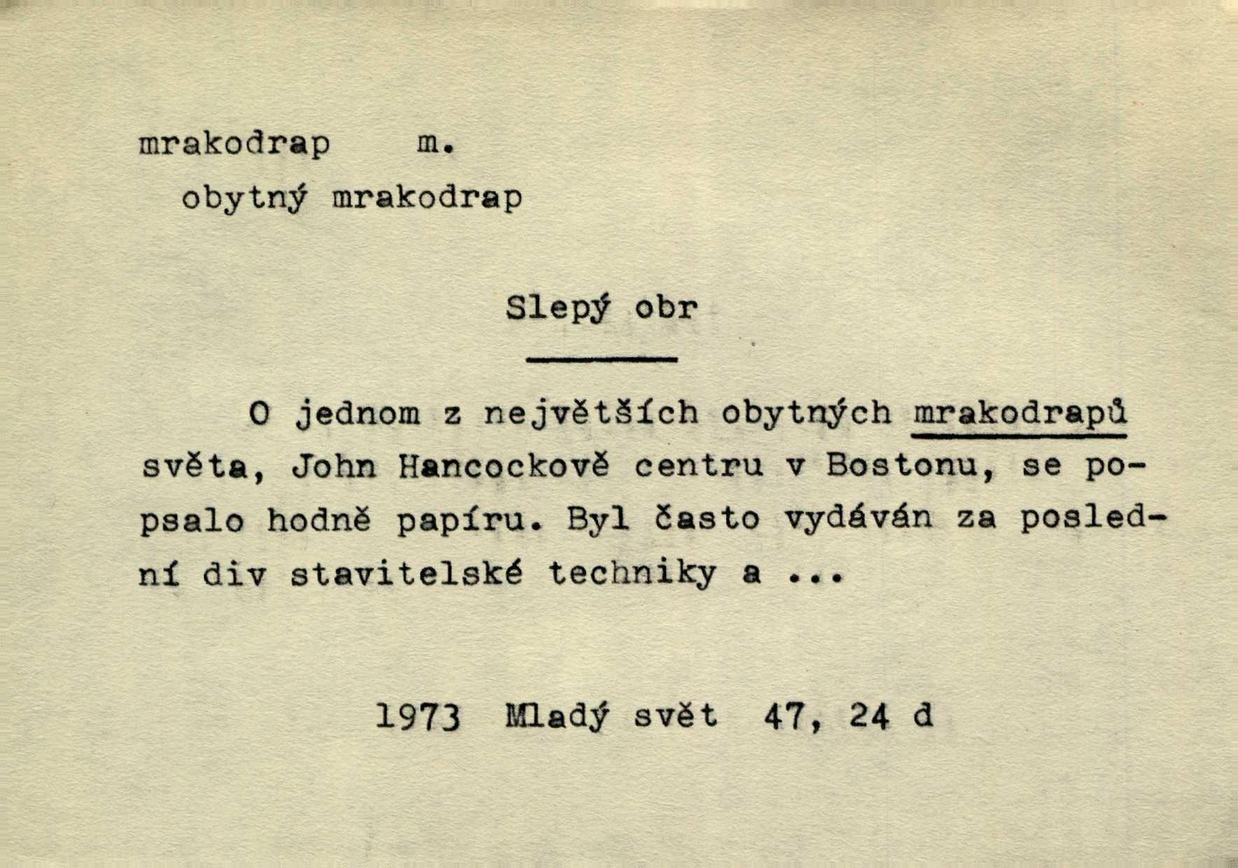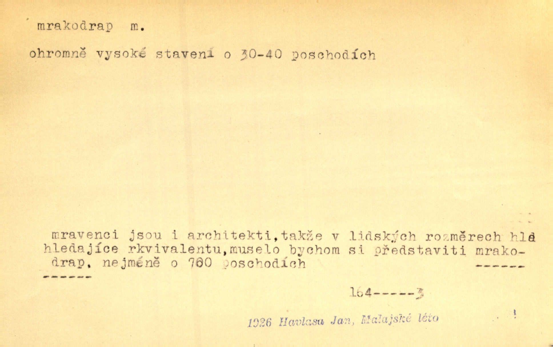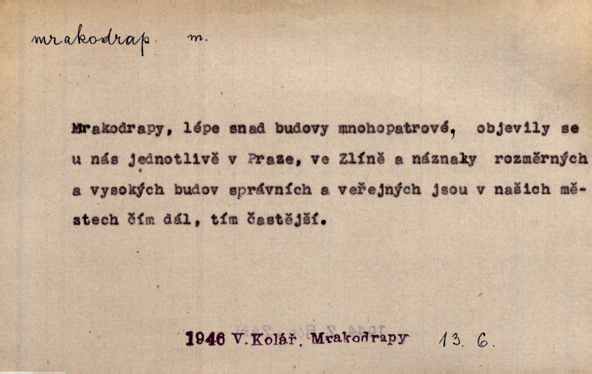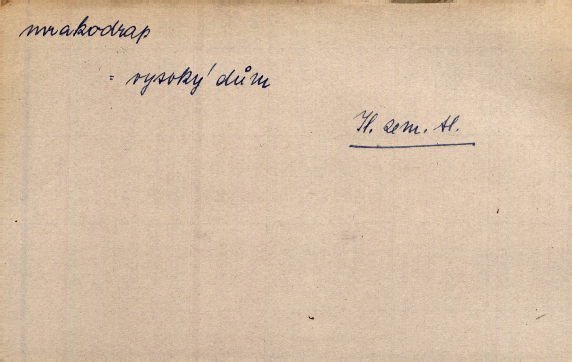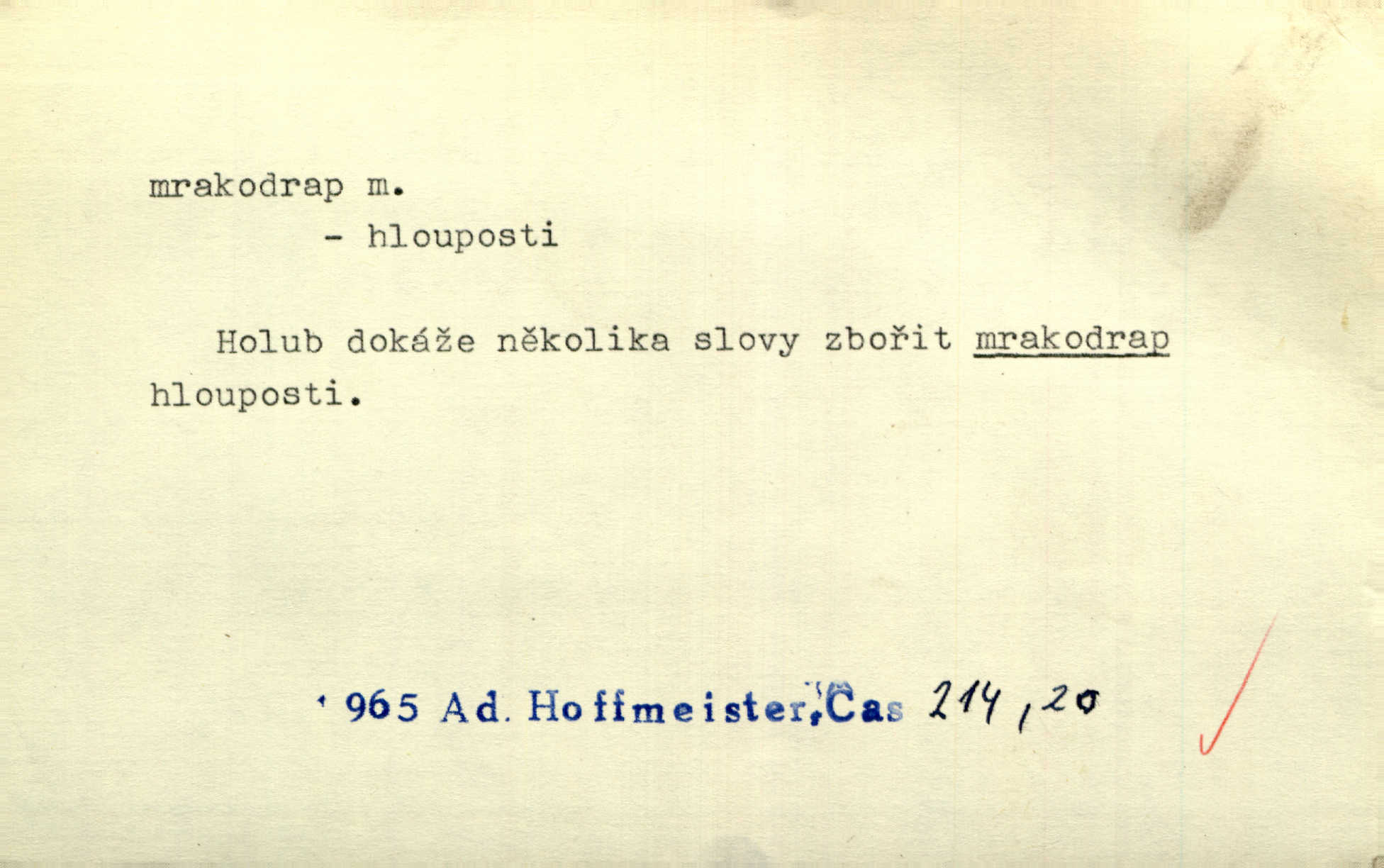 - mrakodrap, -u m. vysoká budova s neobyčejně velkým počtem poschodí. Mravenci jsou i architekti, takže v lidských rozměrech hledajíce ekvivalentu, museli bychom si představiti mrakodrap nejméně o 700 poschodích. J. Havlasa. Mrakodrap o 65 poschodích. Přít.