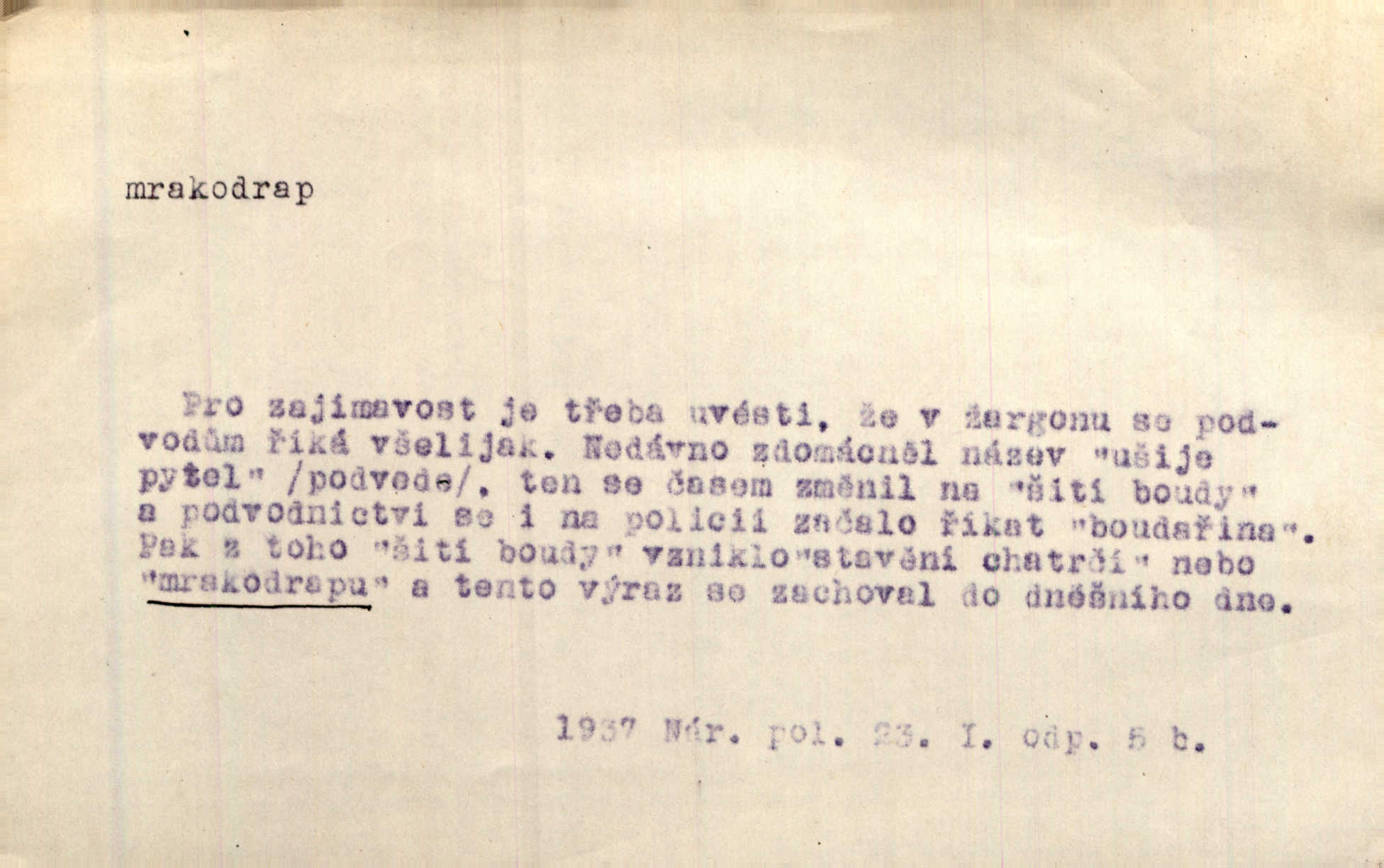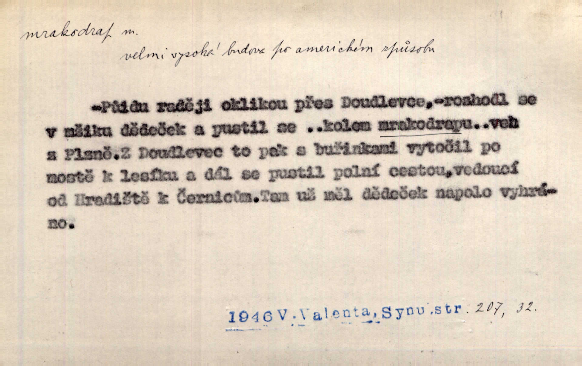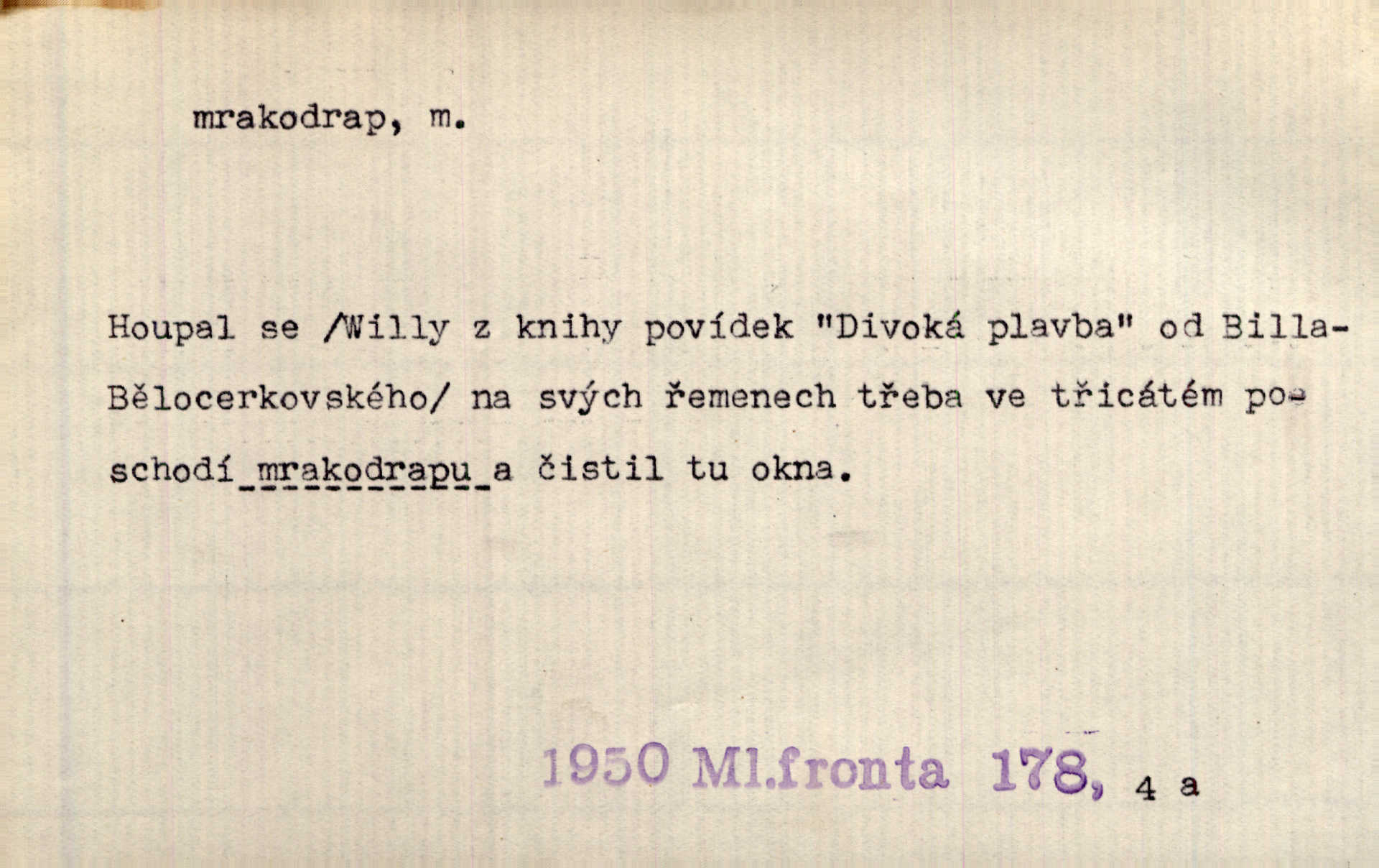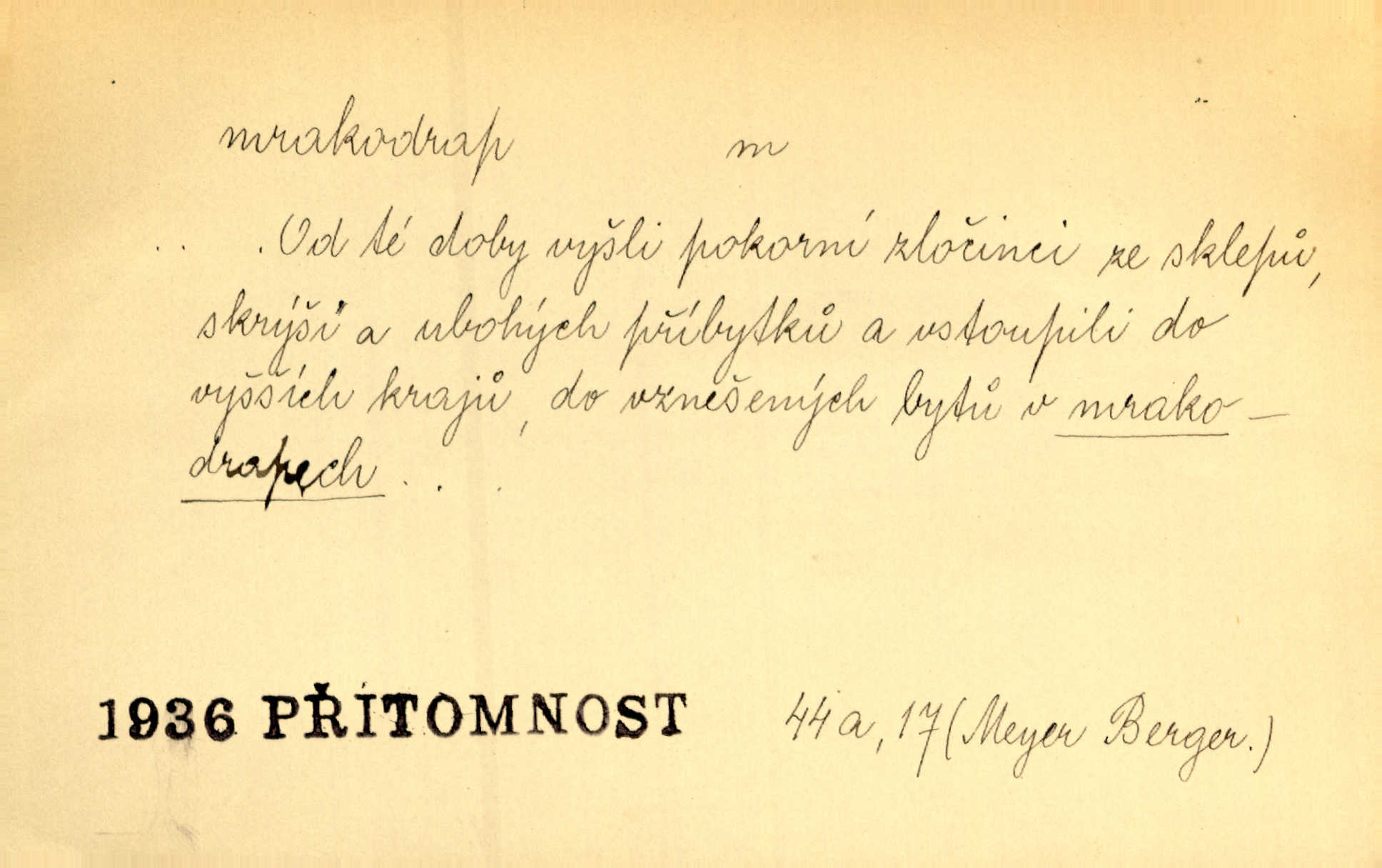 - mrakodrap, -u m. vysoká budova s neobyčejně velkým počtem poschodí. Mravenci jsou i architekti, takže v lidských rozměrech hledajíce ekvivalentu, museli bychom si představiti mrakodrap nejméně o 700 poschodích. J. Havlasa. Mrakodrap o 65 poschodích. Přít.