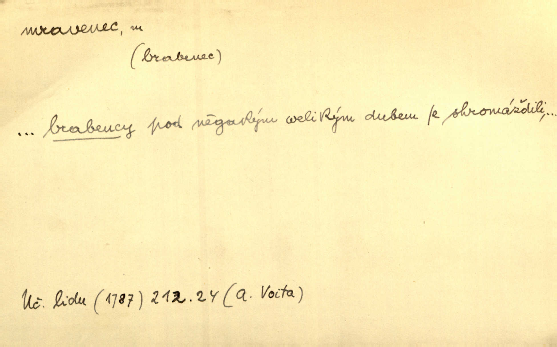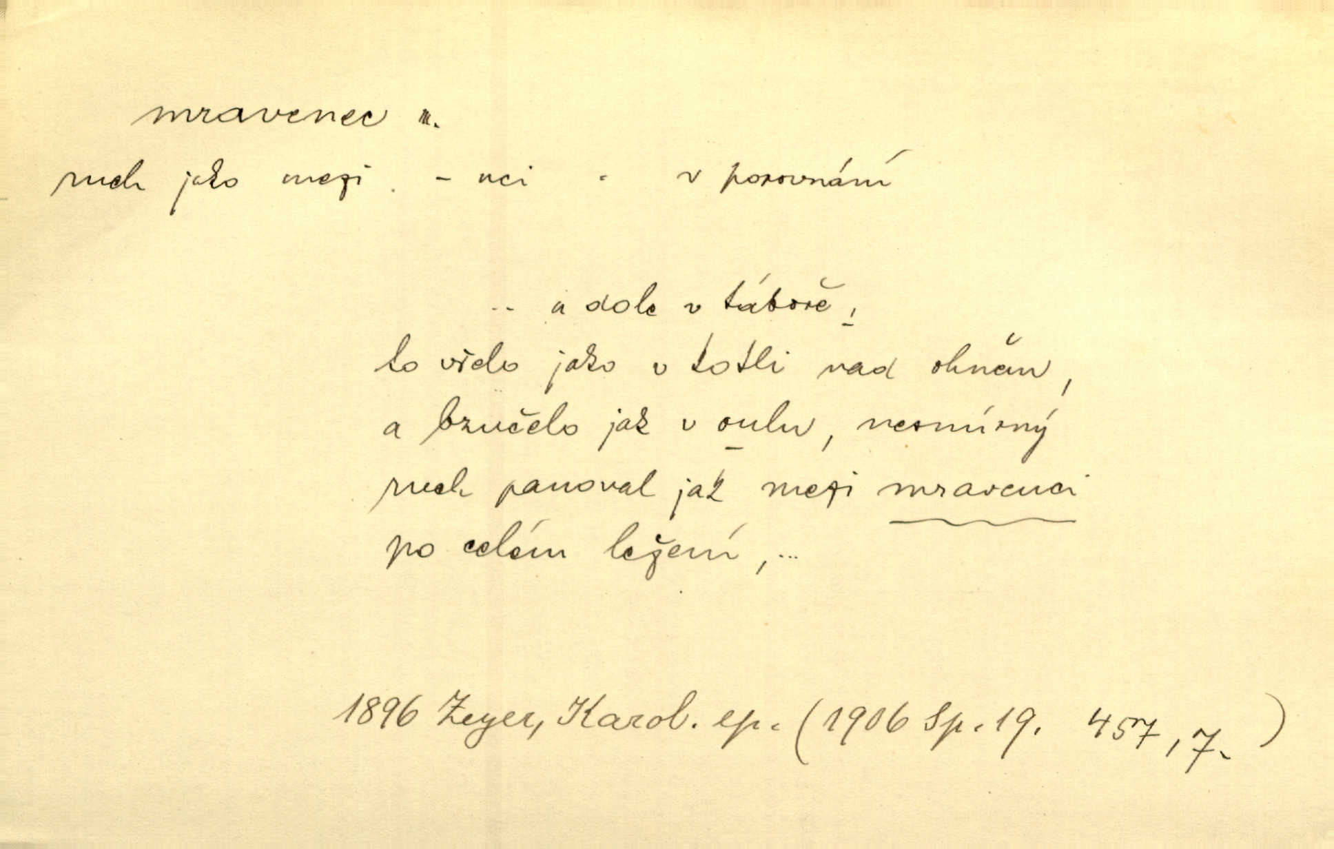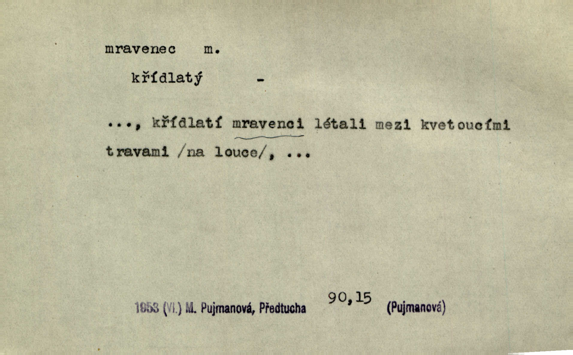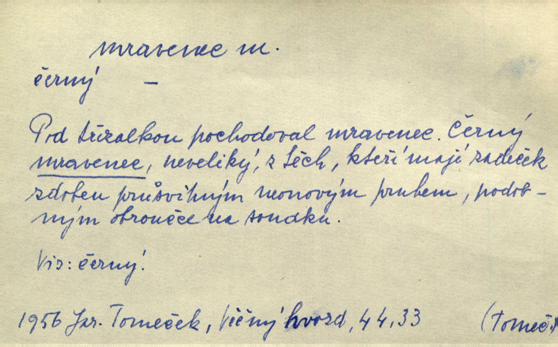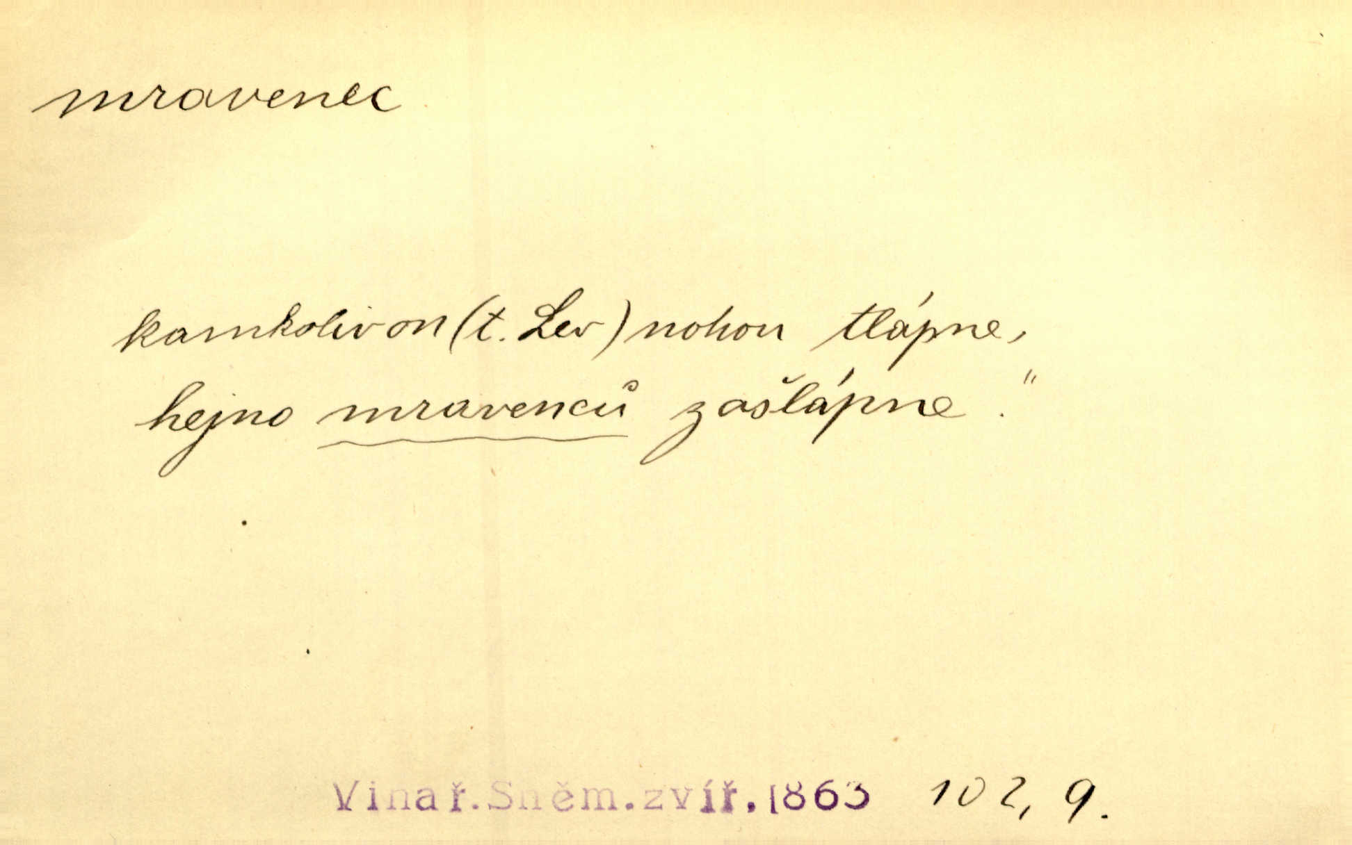 - mravenec, -nce m. drobný blanokřídlý hmyz hromadně žijící. Zool. mravenci Formicidae. Mravenci se svými bílými vajíčky sem tam utíkali. Erb. Nesmírný ruch panoval jak mezi mravenci po celém ležení. Zey. Už není [nadporučík] tak červený jako mravenec. Jir. Hemžili se [lidé] mezi koly na bělidle jako mravenci. Rais. D o někom malém, nepatrném, bezvýznamném. Řím velký jest a to ví každý z nás [židů]‚ my [jsme] mravenci. Vrch. D Přen. o brnivém n. mrazivém pocitu. V nohách mu [pantátovi] zase projížděli mravenci. Rais. Hochovi mravenci pobíhali po zádech, když slyšel, kterak ženky napadnou člověka samotného v lese. Sez. V koleně mně to vrtalo a ještě tam mám ty mravence. Jir.